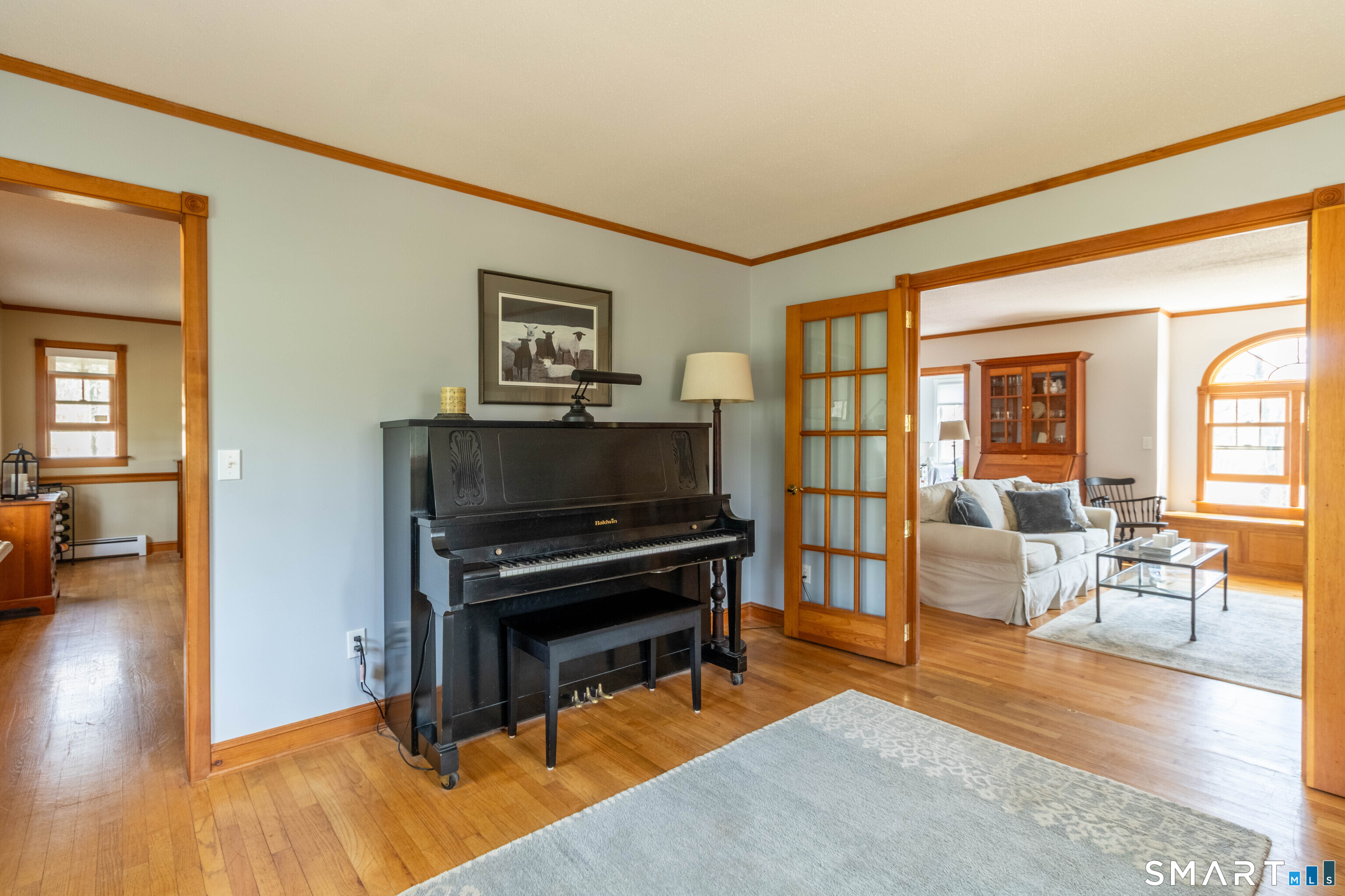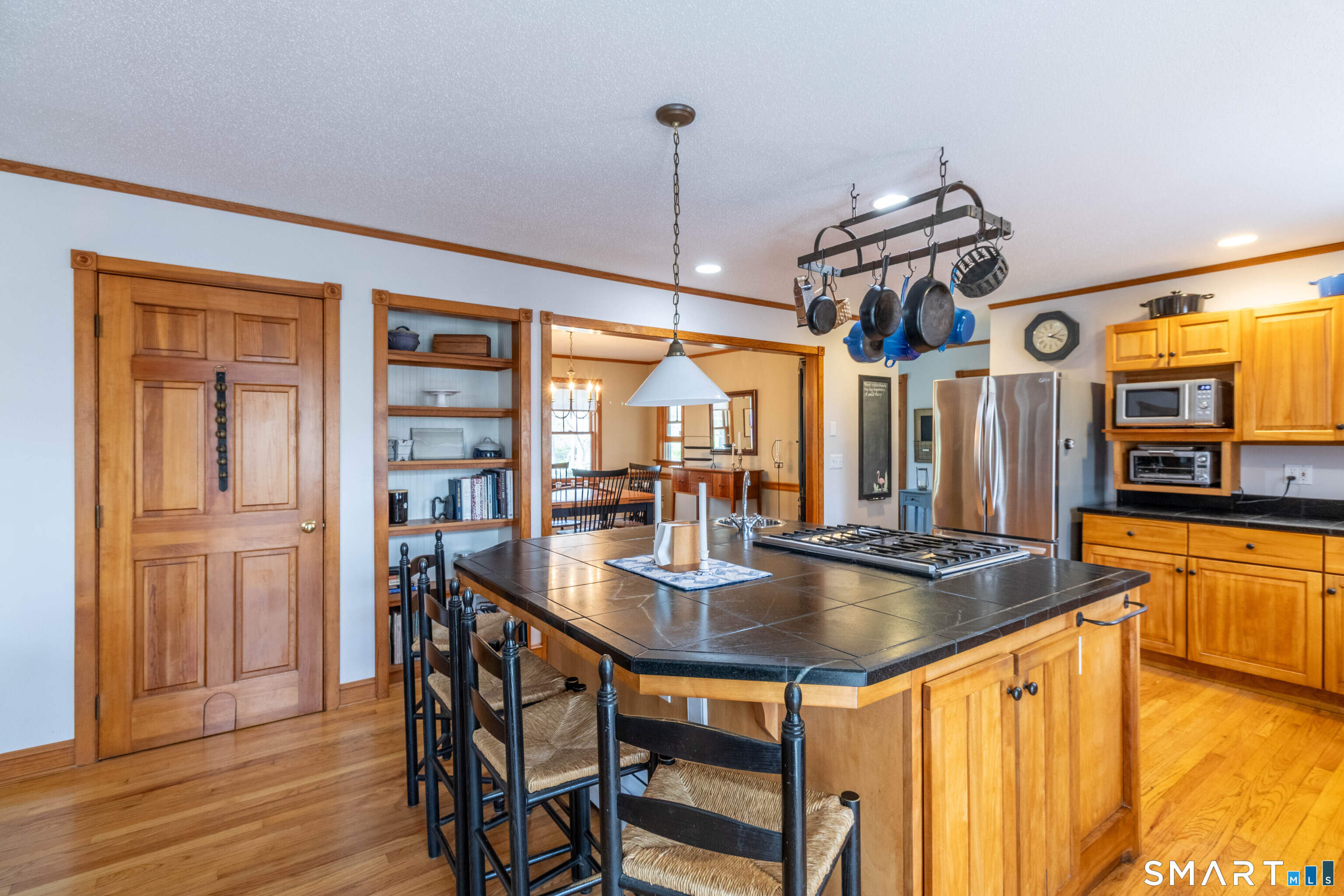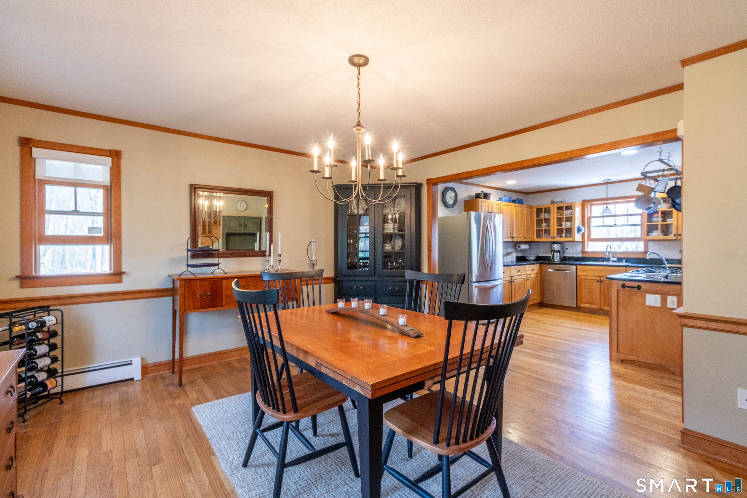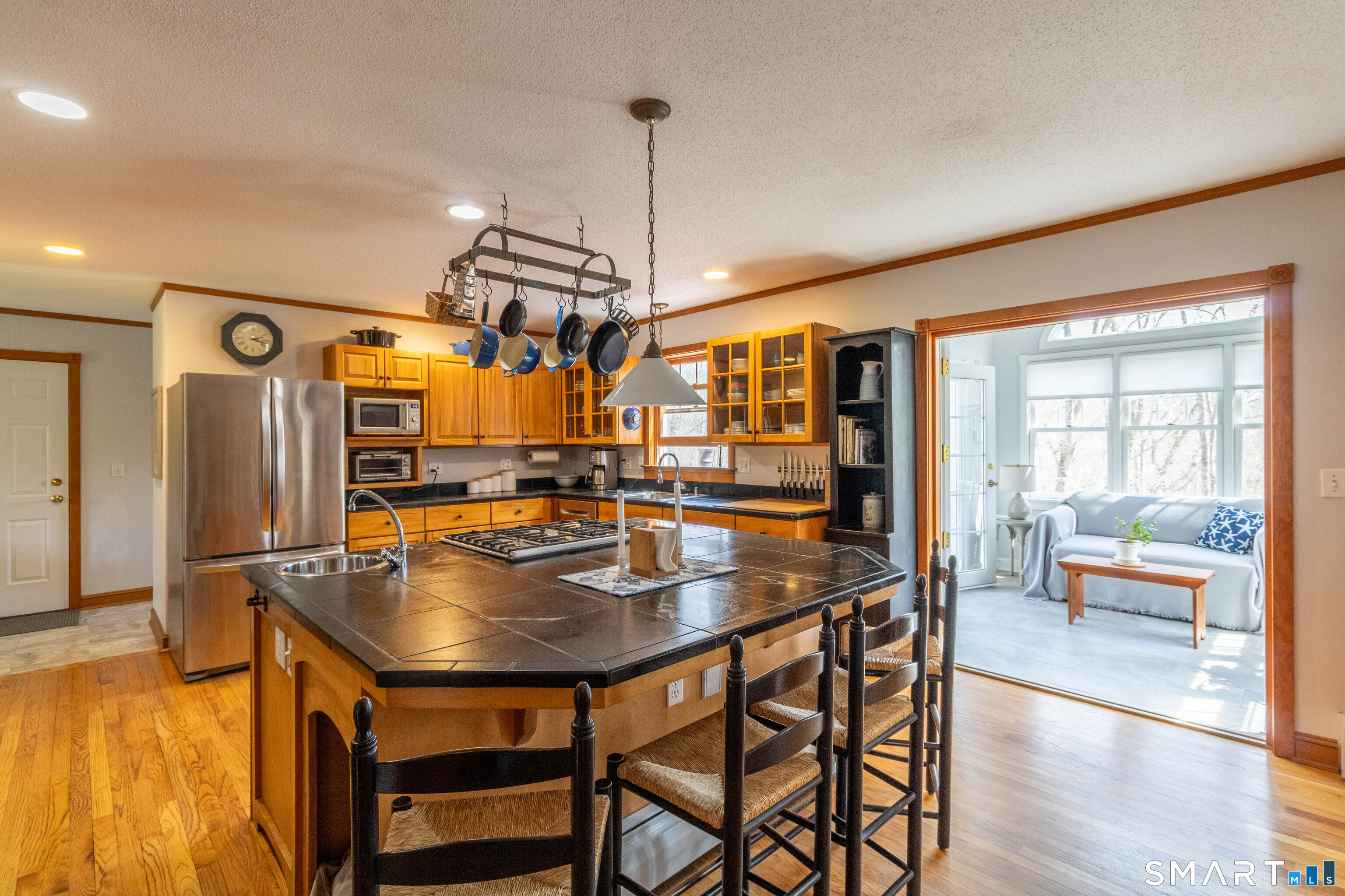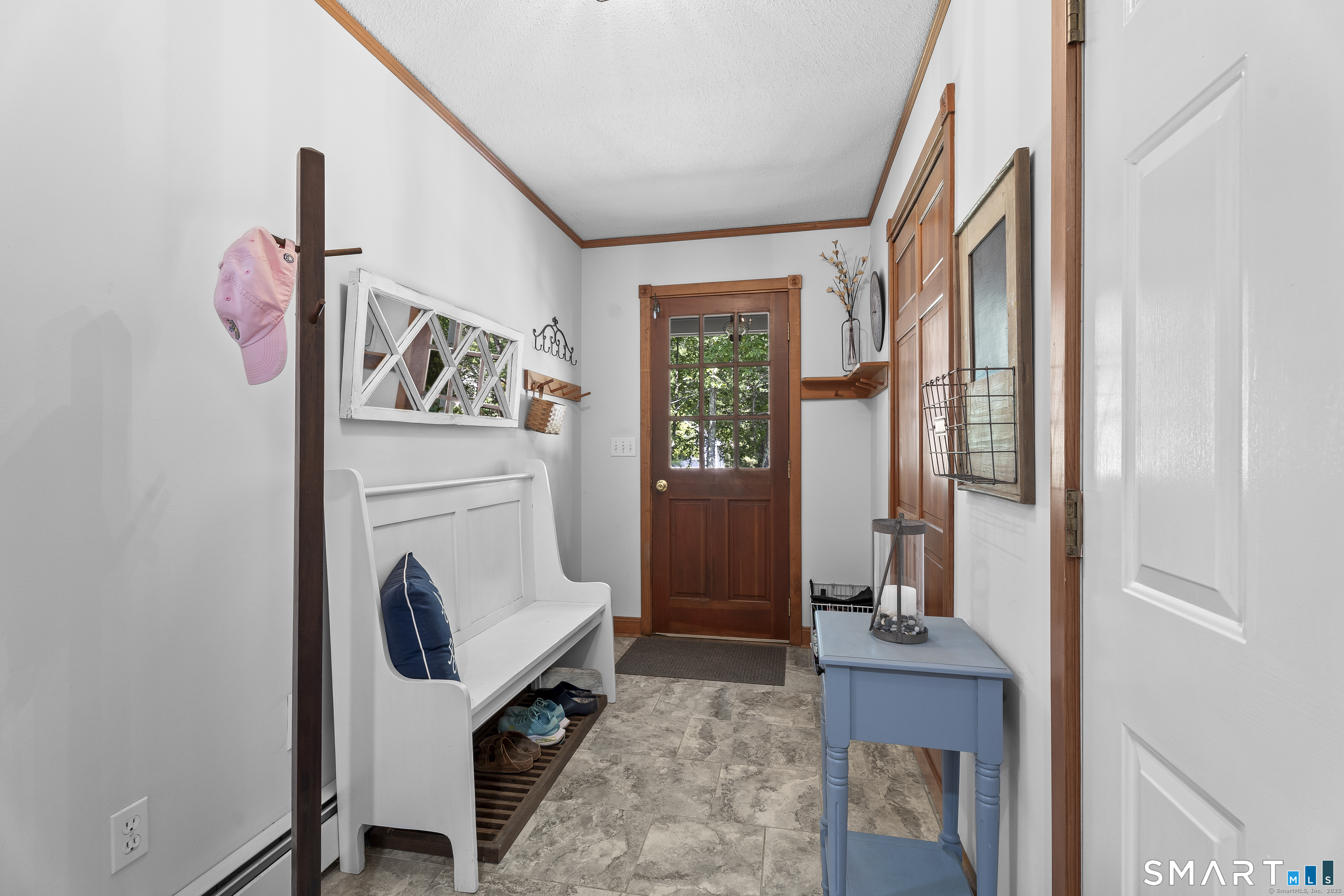 Nestled near the start of a quiet cul-de-sac, framed by mature trees and New England stone walls, this beautifully maintained custom Colonial offers privacy and timeless appeal on nearly 2 acres. This exceptional home was thoughtfully designed and built by its original owners with a focus on long-term family living, comfort and quality craftsmanship. The spacious kitchen showcases soapstone countertops, a large center island with a built-in dog cubby and French doors leading to a bright sunroom overlooking the serene, landscaped backyard. Flowing seamlessly from the kitchen, the family room offers a warm and welcoming gathering space with a Vermont Castings wood stove insert, hand-crafted wood accent wall and a cozy window seat beneath a striking Palladian window. Upstairs you'll find 3 generously sized bedrooms, a convenient second-floor laundry room with utility sink and a flexible space ideal for a home office. Also on this floor, a large walk-in attic provides excellent storage and exciting expansion potential for a future fourth bedroom or private retreat. The walkout lower level includes a home gym, rock climbing wall, workshop and ample storage. This one-of-a-kind home is enhanced by a full-property invisible pet fence and numerous recent updates, including a new roof (2024), new well pump, water heater, and bedroom carpeting (2026).