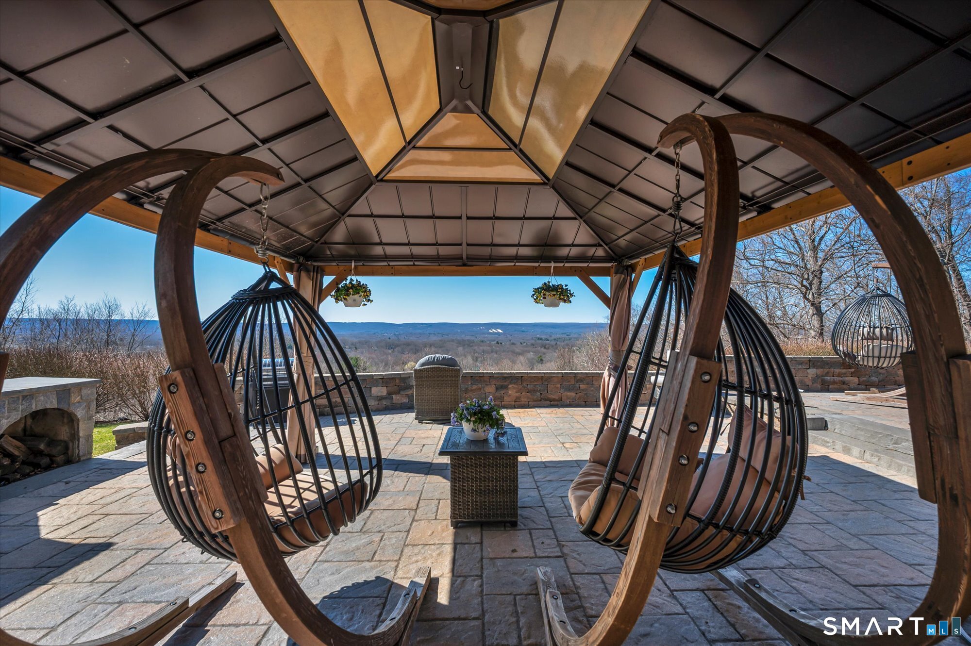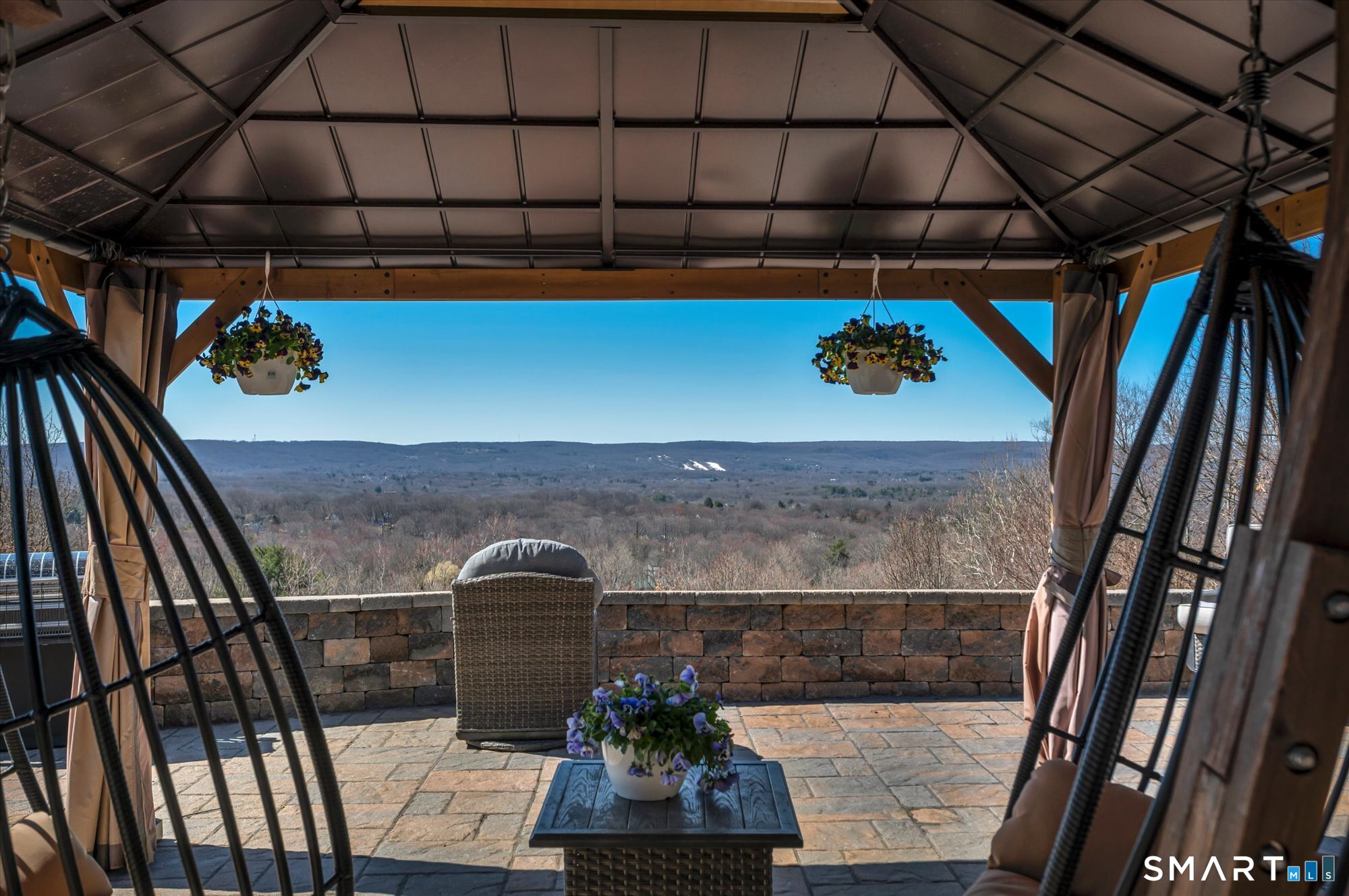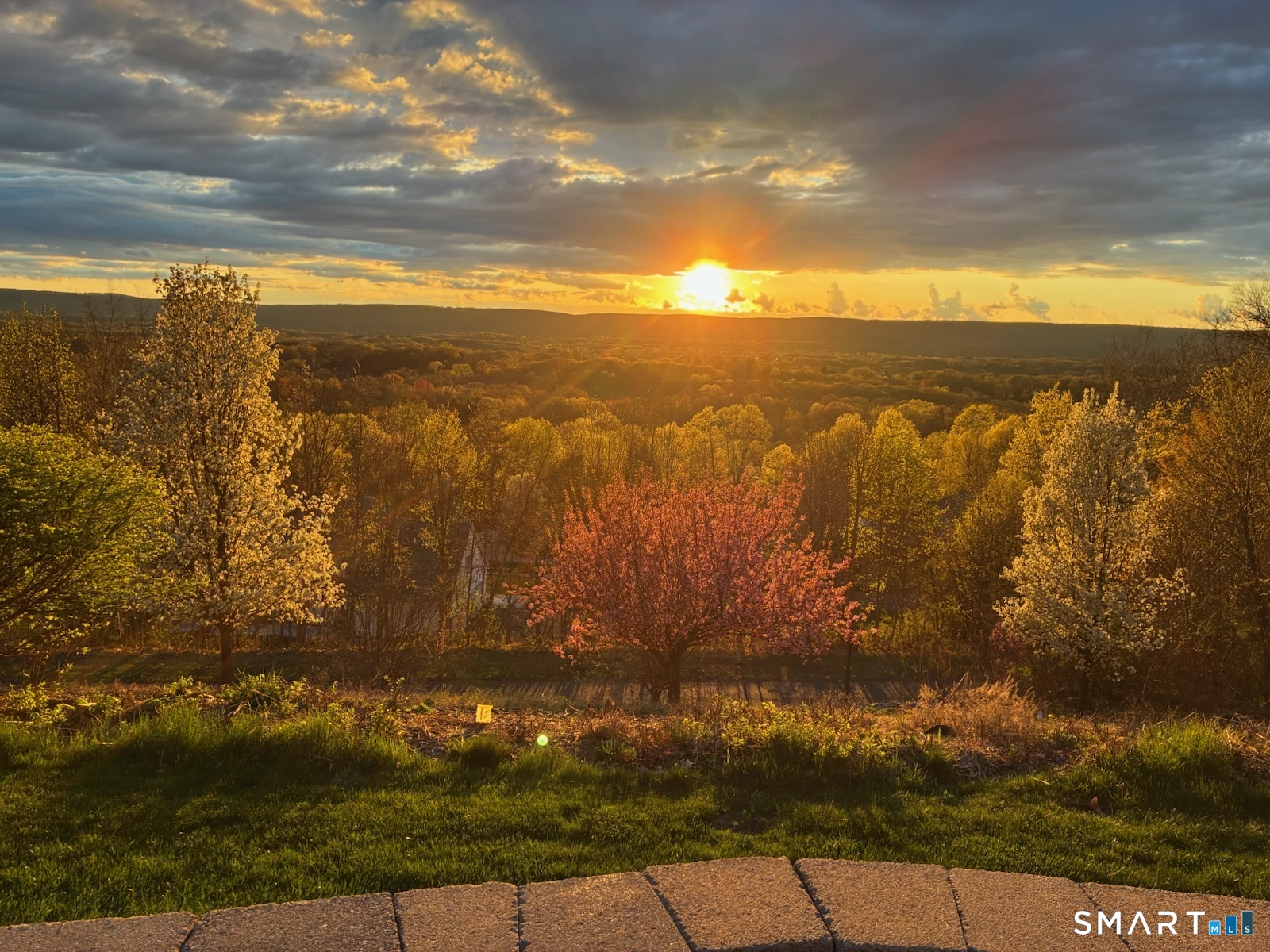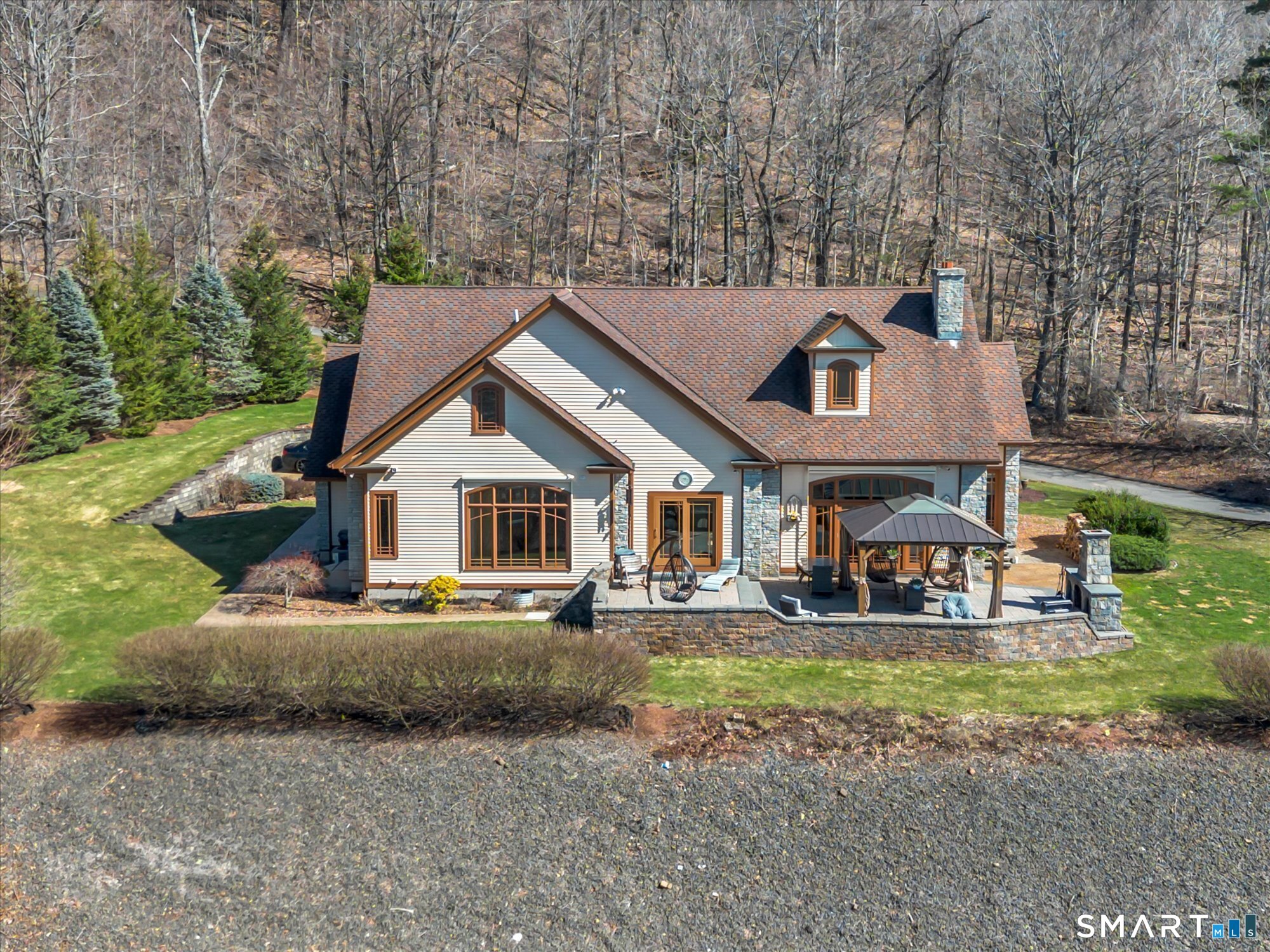 Perched high above Southington on over 2 private acres, this Custom built Cape Style home offers more than 3200 sq ft of thoughtfully designed living space, a 5 car garage and some of the most breathtaking views in town! From the moment you step inside, the home immediately makes an impression w/soaring spaces, floor-to-ceiling windows that fill the home with natural light, and a beautiful floor-to-ceiling Belgian Block corner stone fireplace that serves as the centerpiece of the living area. The main level features rich cherry hardwood floors, a beautifully appointed granite kitchen with high-end Wolf appliances, and custom cherry cabinetry--perfect for both everyday living and entertaining. Every detail of this home was thoughtfully designed to create a space that feels both elegant and comfortable. The flexible floor plan offers 3-4 bedrooms and 2.5 baths, including a 1st floor primary suite ideal for multi-generational living. This private retreat features a spacious walk-in closet and a primary bath complete w/a curved tile shower and soaking tub. Upstairs, you'll find 3 additional bedrooms, including one ideal for a game room or bonus space, all finished with warm hickory flooring and a full bath. But what truly sets this home apart is the view! Step outside to your own private retreat--a stunning paver patio with a built-in fireplace, where you can enjoy sweeping views of Southington and surrounding towns.