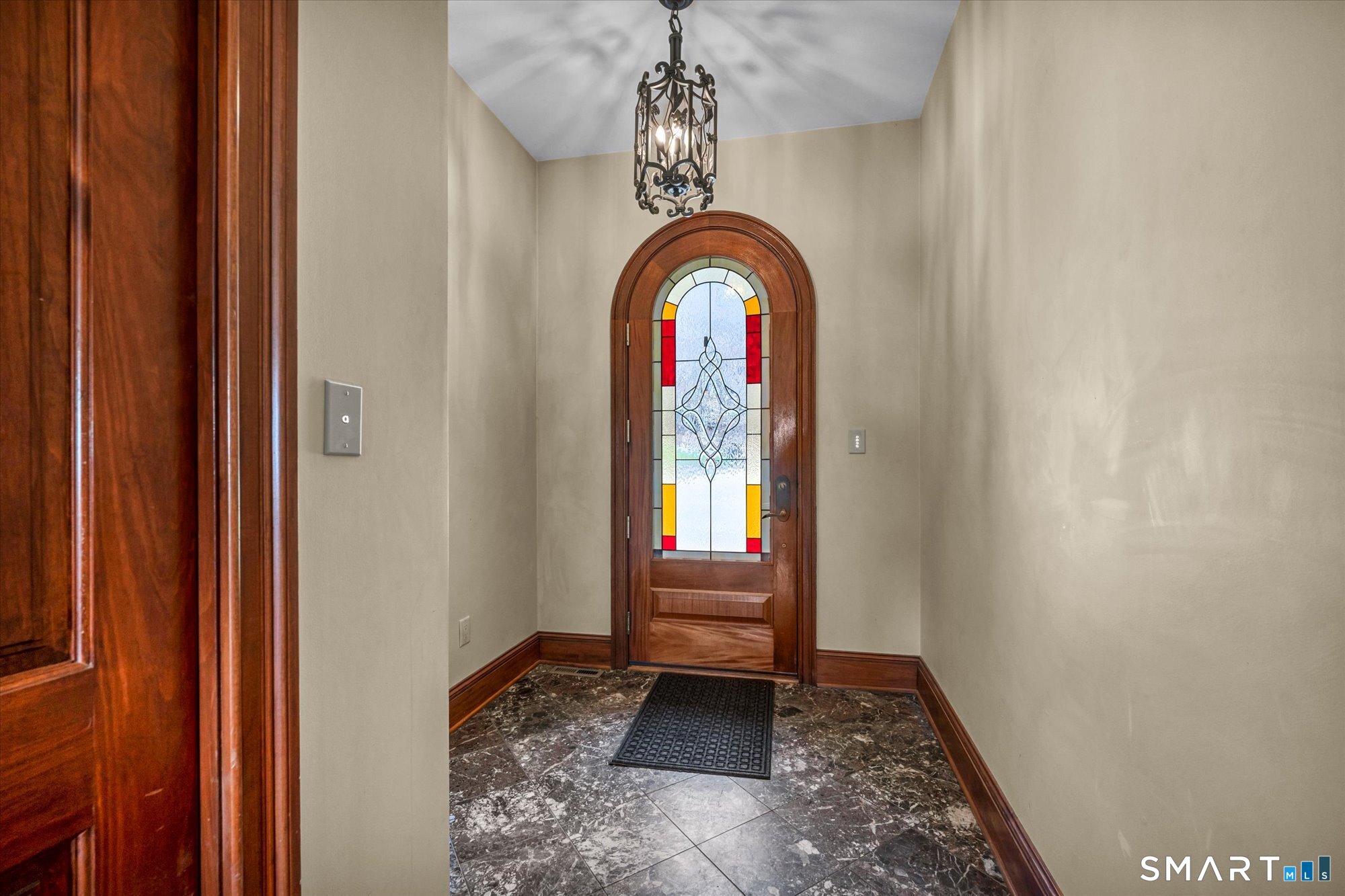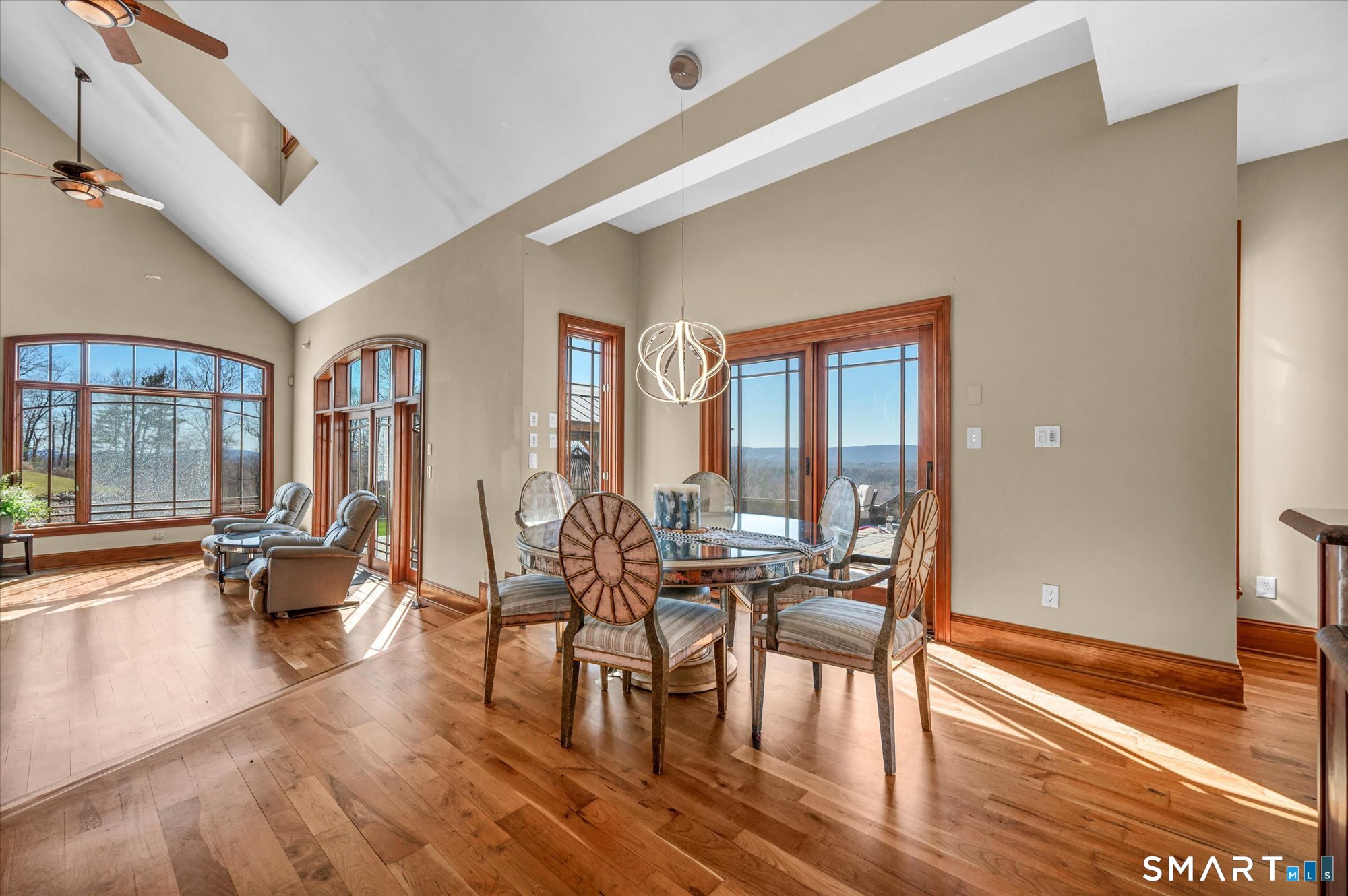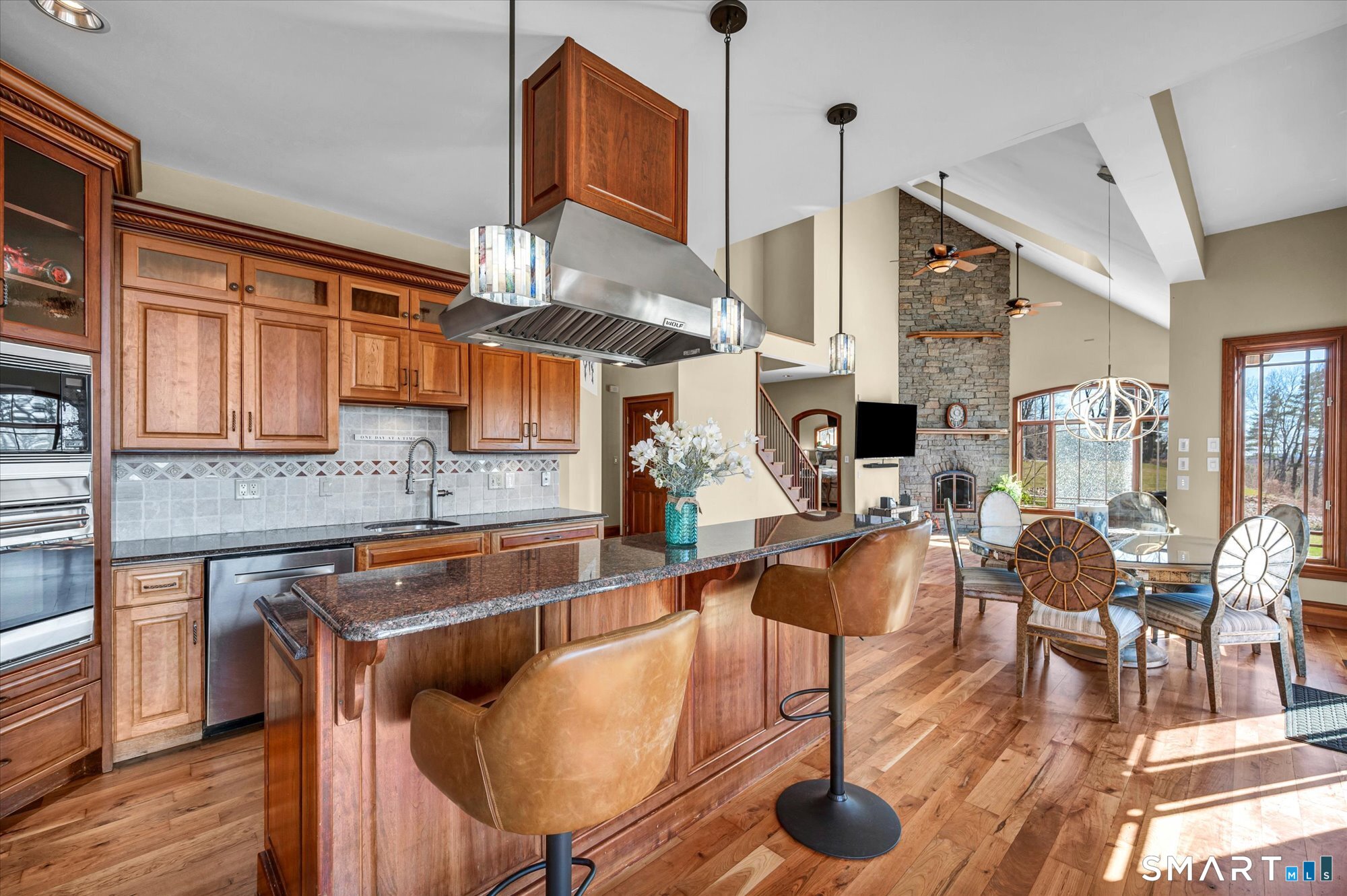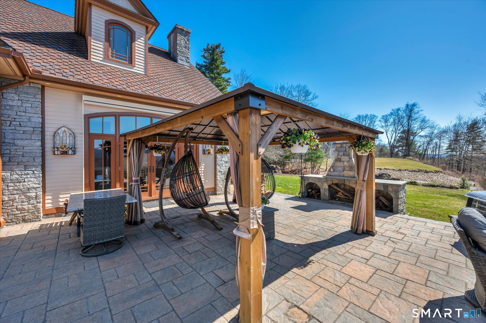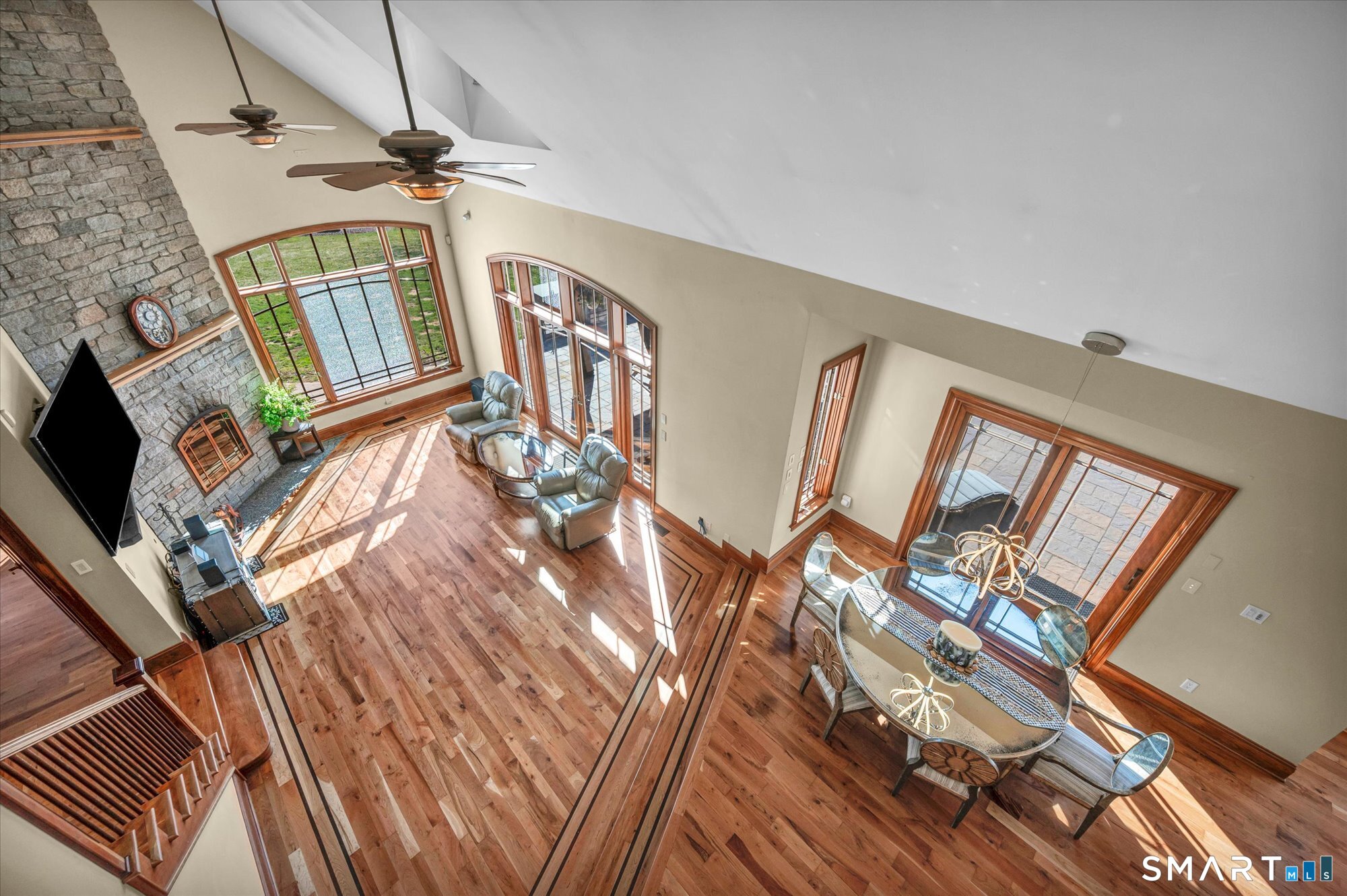 Perched high above Southington on over 2 private acres, this Custom built Cape Style home offers more than 3200 sq ft of thoughtfully designed living space, a 5 car garage and some of the most breathtaking views in town! From the moment you step inside, the home immediately makes an impression w/soaring spaces, floor-to-ceiling windows that fill the home with natural light, and a beautiful floor-to-ceiling Belgian Block corner stone fireplace that serves as the centerpiece of the living area. The main level features rich cherry hardwood floors, a beautifully appointed granite kitchen with high-end Wolf appliances, and custom cherry cabinetry--perfect for both everyday living and entertaining. Every detail of this home was thoughtfully designed to create a space that feels both elegant and comfortable. The flexible floor plan offers 3-4 bedrooms and 2.5 baths, including a 1st floor primary suite ideal for multi-generational living. This private retreat features a spacious walk-in closet and a primary bath complete w/a curved tile shower and soaking tub. Upstairs, you'll find 3 additional bedrooms, including one ideal for a game room or bonus space, all finished with warm hickory flooring and a full bath. But what truly sets this home apart is the view! Step outside to your own private retreat--a stunning paver patio with a built-in fireplace, where you can enjoy sweeping views of Southington and surrounding towns.