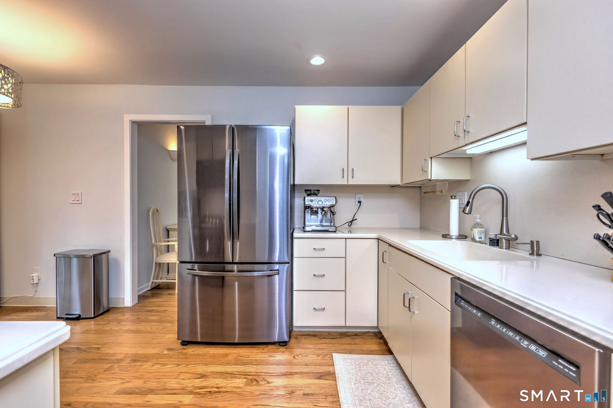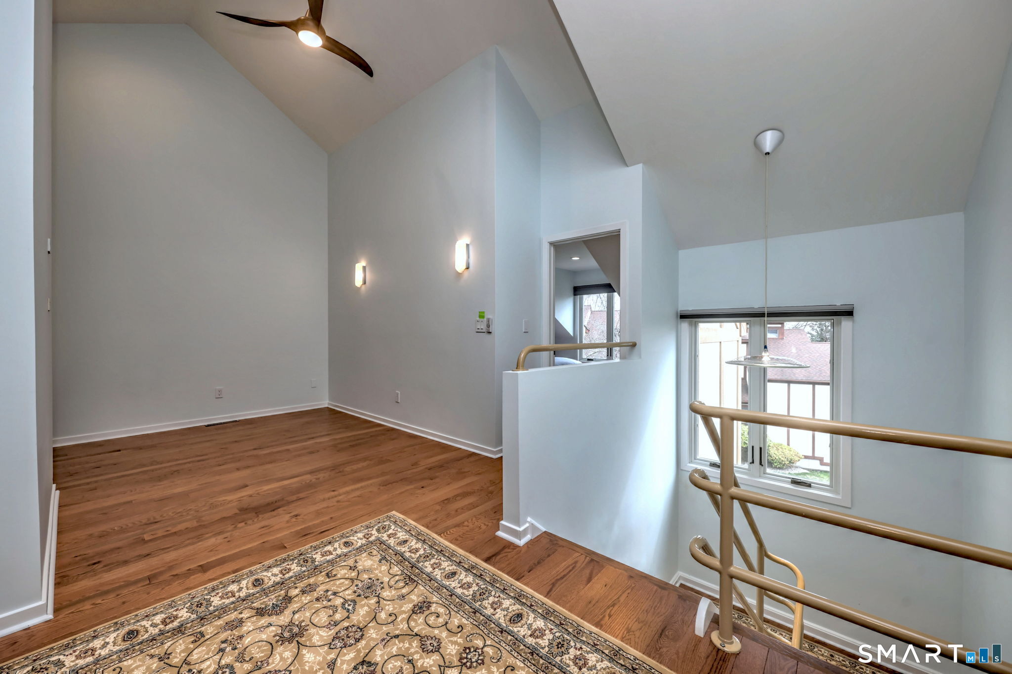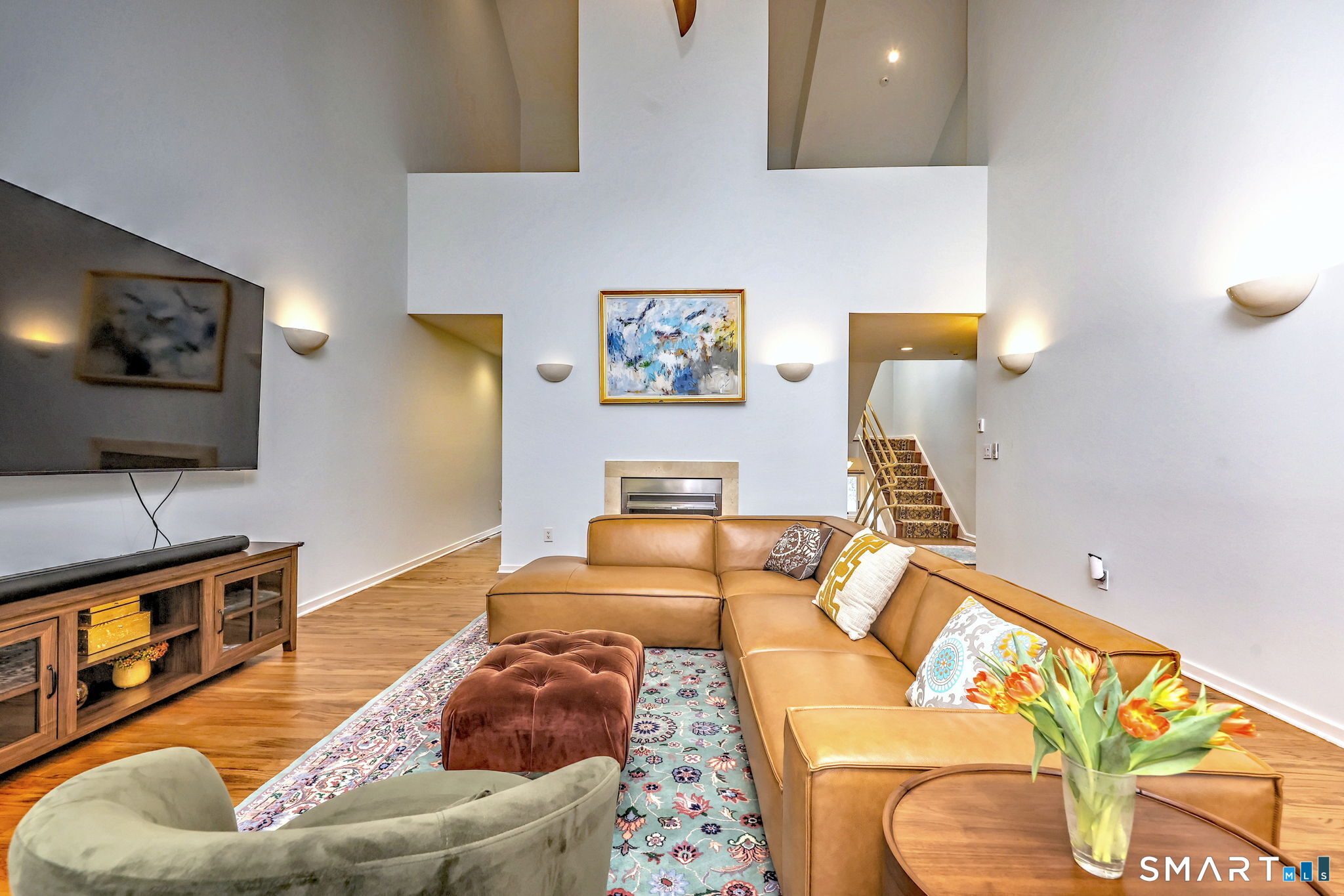 Oronoque Forest Complex. Step into this exquisite 3-level townhouse, end unit, featuring soaring cathedral ceilings and a dramatic fireplace wall that creates an impressive focal point. The open concept layout offers a seamless flow, highlighted by a spacious living room with sliders leading to a large deck. The main level also includes the dining room and remodeled eat in kitchen with newer stainless-steel appliances. Additional sliders open to a second deck with stairs. A versatile den or home office along with a wet bar complete with wine cooler adds to the home's functionality. The primary bedroom suite boasts a private updated bath with heated floor, and generous his & hers closets. Upstairs the interior loft overlooks the main living space and leads to two additional bedrooms and bath. Enjoy wood floors throughout and a lower-level family/media room with another full updated bath. Additional highlights include awnings on both decks, blinds with remotes, recessed lights, and generator. All windows except for few were replaced from Renewal by Anderson in September of 2022. The two-car garage has an epoxy floor and well-organized storage space with plenty of cabinets in lower level.. A perfect blend of comfort, smart upgrades & move in ready. This is a beautiful unit. Cul-de-sac location. Complex has pool, tennis, pickle ball & clubhouse and parklike grounds. Located next to Hopkins School, minutes to Yale, hospitals, universities & train station.