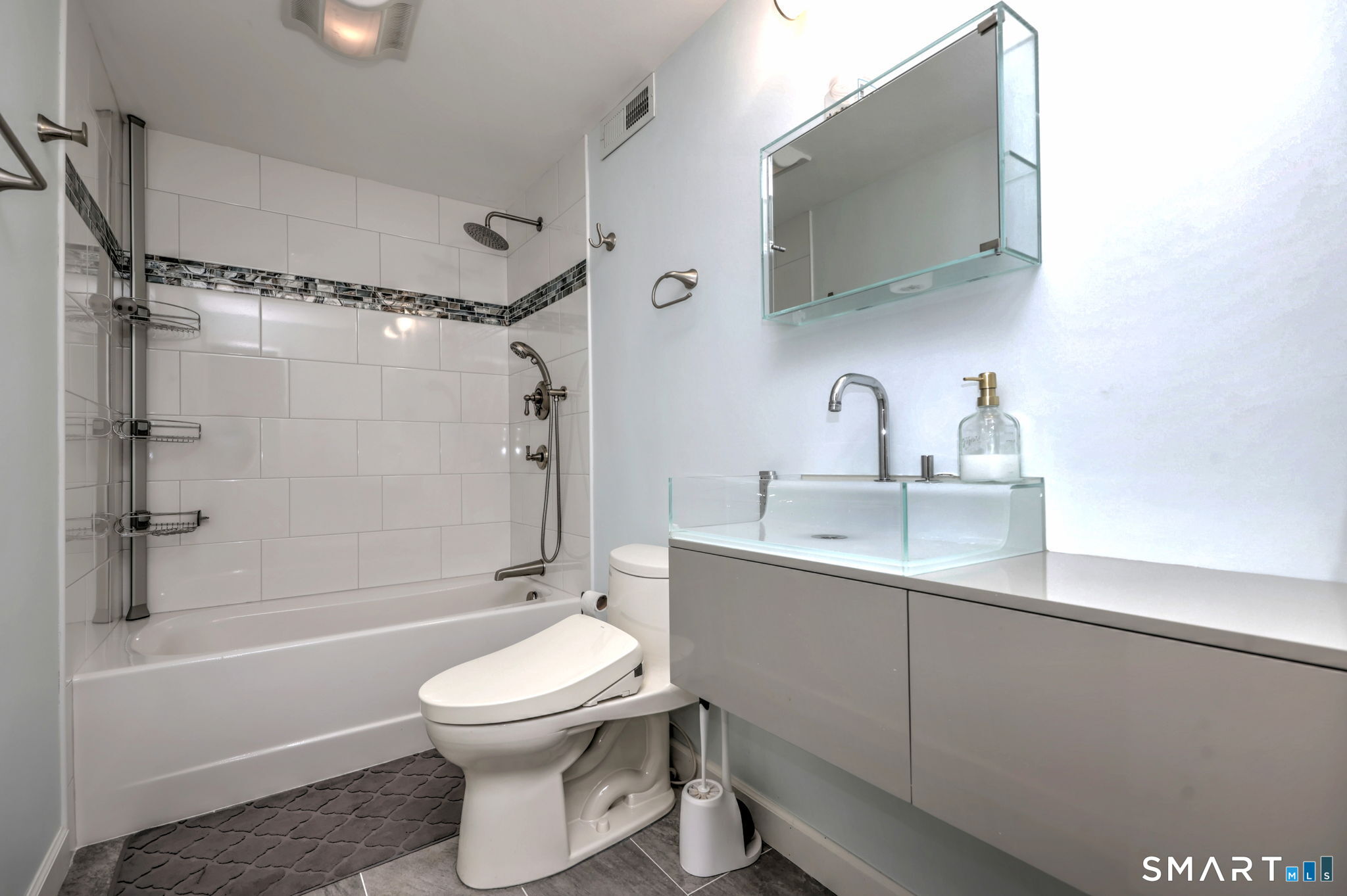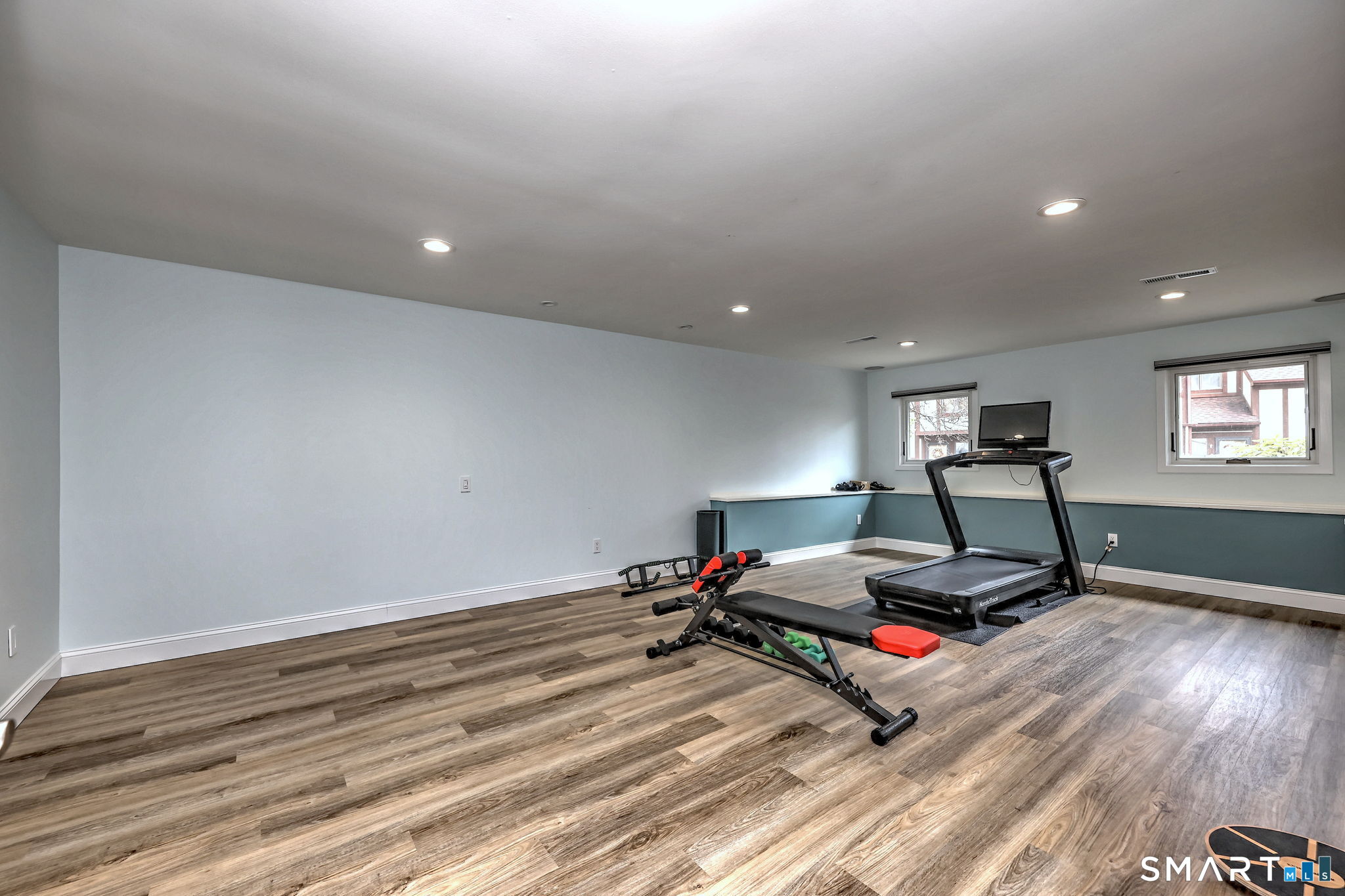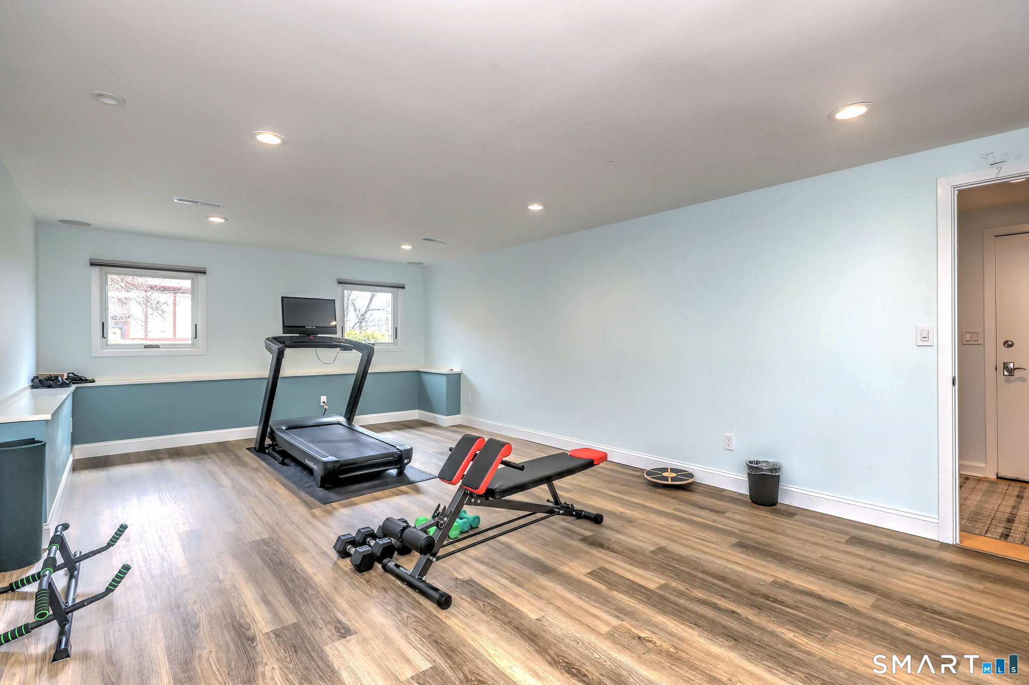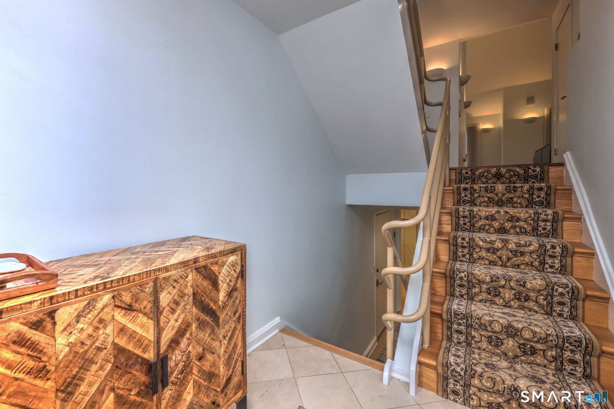 Oronoque Forest Complex. Step into this exquisite 3-level townhouse, end unit, featuring soaring cathedral ceilings and a dramatic fireplace wall that creates an impressive focal point. The open concept layout offers a seamless flow, highlighted by a spacious living room with sliders leading to a large deck. The main level also includes the dining room and remodeled eat in kitchen with newer stainless-steel appliances. Additional sliders open to a second deck with stairs. A versatile den or home office along with a wet bar complete with wine cooler adds to the home's functionality. The primary bedroom suite boasts a private updated bath with heated floor, and generous his & hers closets. Upstairs the interior loft overlooks the main living space and leads to two additional bedrooms and bath. Enjoy wood floors throughout and a lower-level family/media room with another full updated bath. Additional highlights include awnings on both decks, blinds with remotes, recessed lights, and generator. All windows except for few were replaced from Renewal by Anderson in September of 2022. The two-car garage has an epoxy floor and well-organized storage space with plenty of cabinets in lower level.. A perfect blend of comfort, smart upgrades & move in ready. This is a beautiful unit. Cul-de-sac location. Complex has pool, tennis, pickle ball & clubhouse and parklike grounds. Located next to Hopkins School, minutes to Yale, hospitals, universities & train station.
