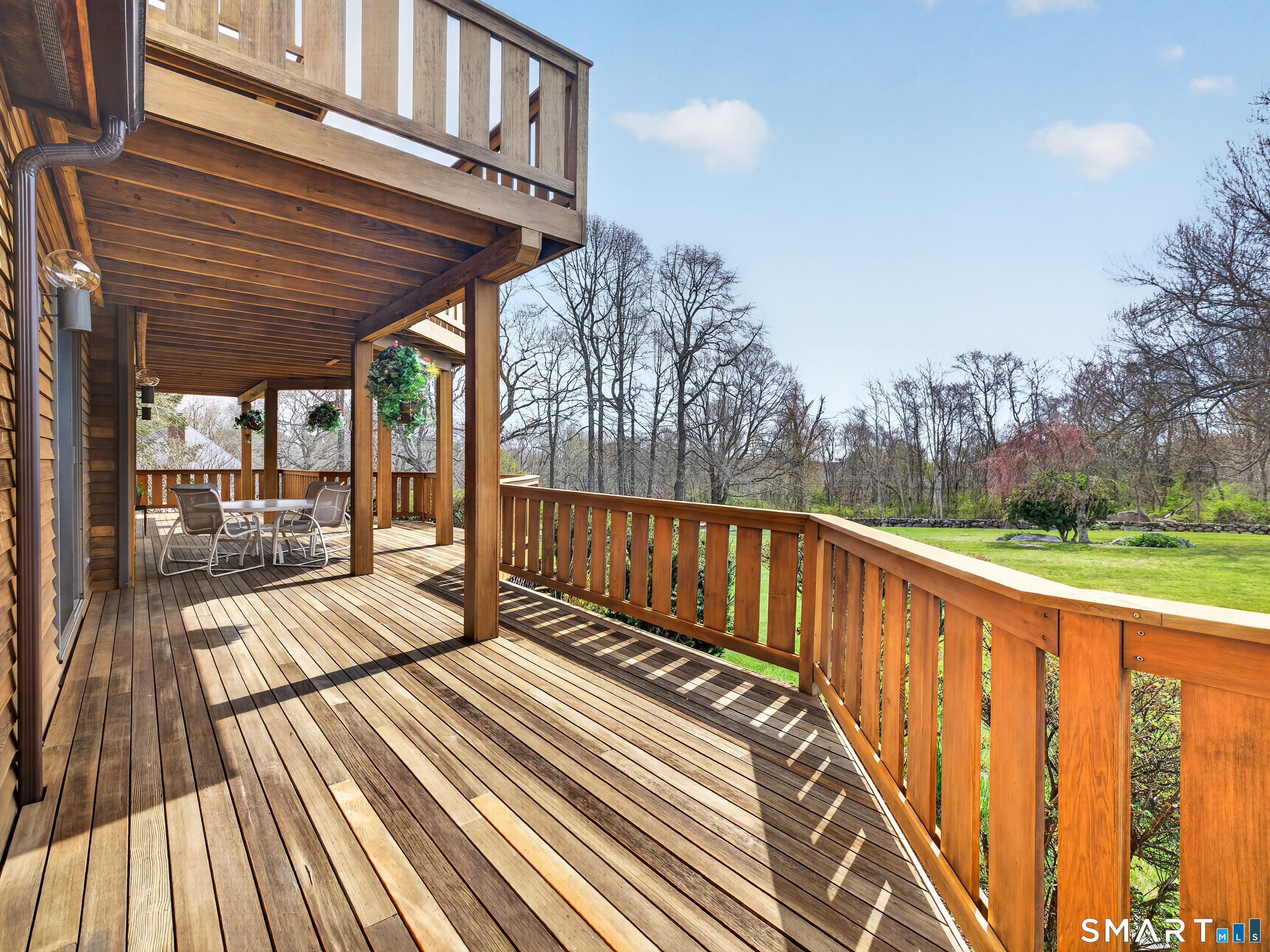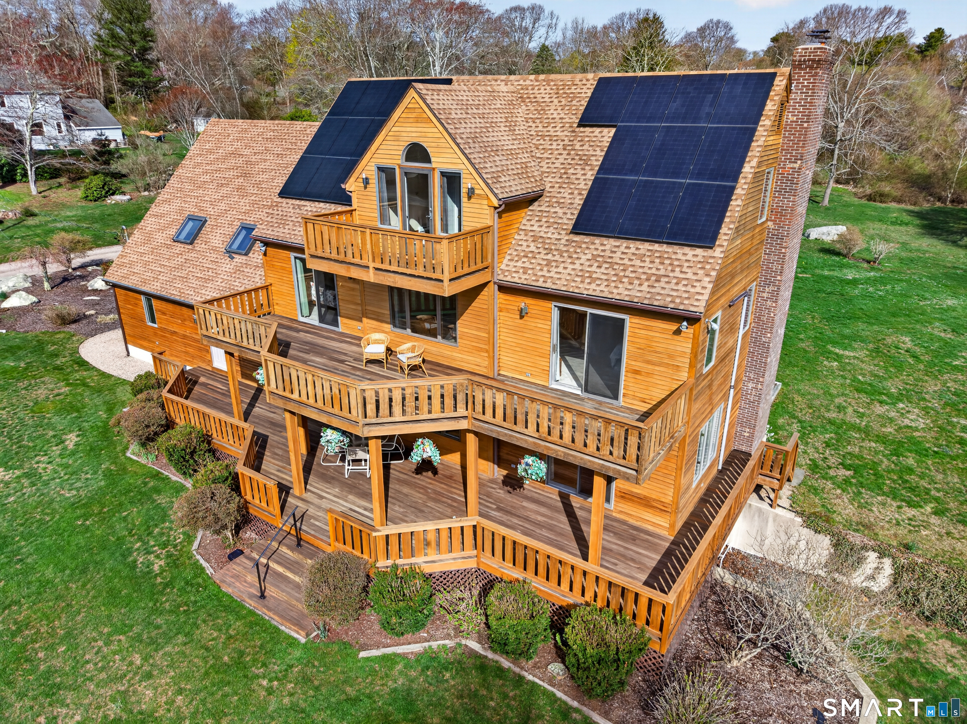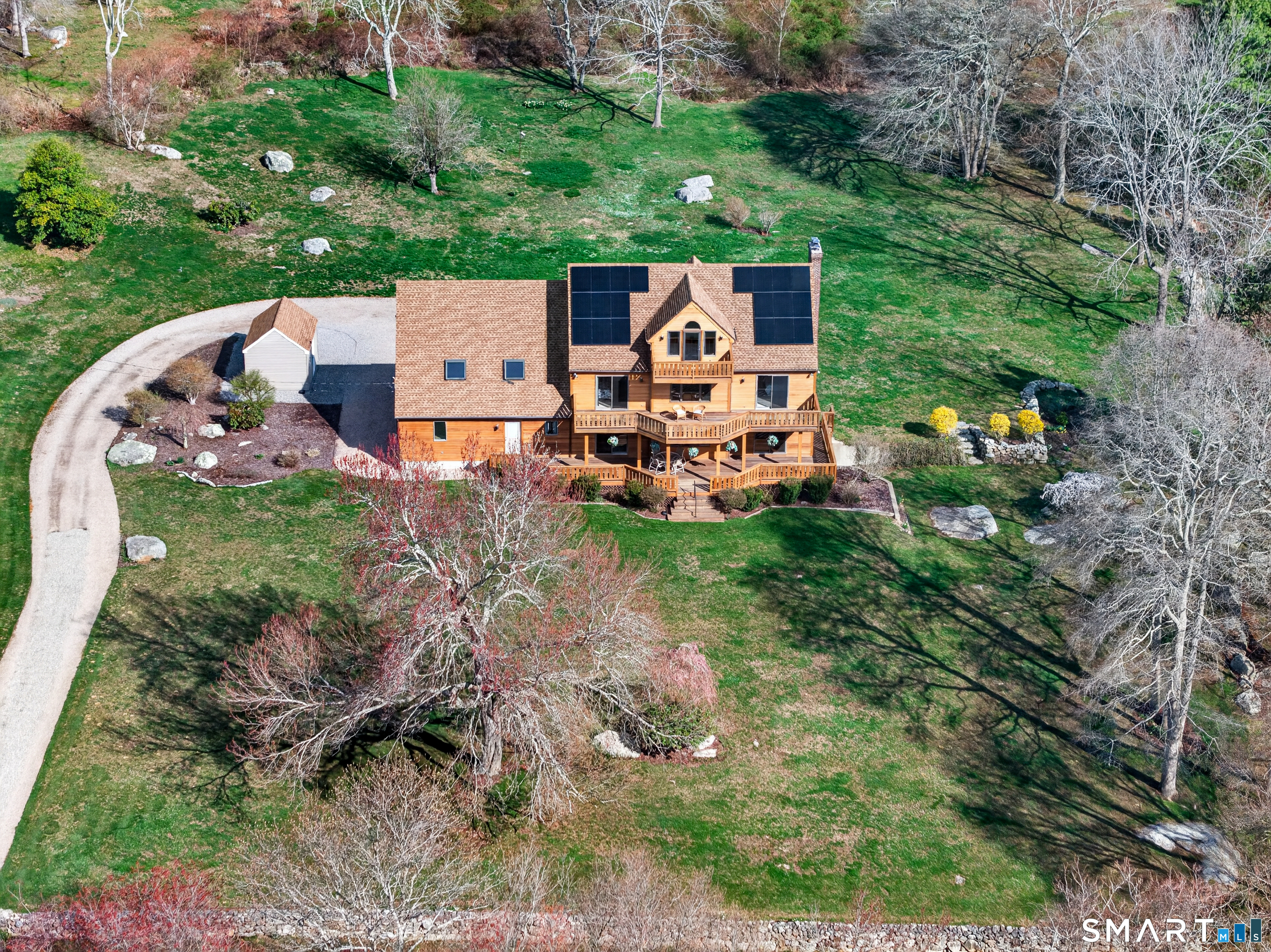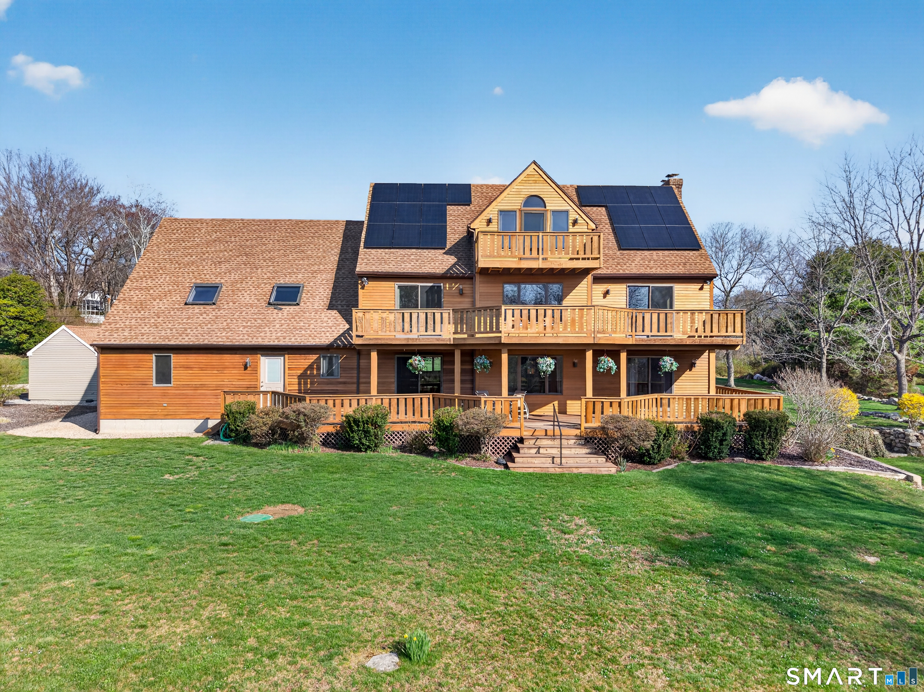 3-bedroom Colonial home with 2.5 baths on 1.84 acres featuring seller owned solar panels! This impressive property offers over 3,000 sf of living space, complemented by a 3-car tandem attached garage and striking California Redwood clapboard exterior finish. Triple-tiered decks on all three levels face south, creating exceptional outdoor living spaces with beautiful Redwood railings and abundant natural light. A welcoming foyer introduces an oak staircase connecting all three levels and an easy floor plan with a comfortable flow throughout the home. The main level features a spacious eat-in kitchen with ample cabinetry, a breakfast bar, and a dining area for everyday casual meals, along with direct access to the first-tier deck through a sliding glass door. A formal dining room with a large picture window captures natural sunlight, while the generously sized living room showcases a stunning stone wood-burning fireplace and opens to the deck for effortless indoor-outdoor living. This level also includes a convenient laundry room, a half bath, and hardwood flooring throughout most of the space. The second floor offers 3 bedrooms along with a huge bonus room of approximately 837 sf with skylights, and resides above the garage, ideal for a variety of uses including possible in-law/caregiver space, recreation, or family room.