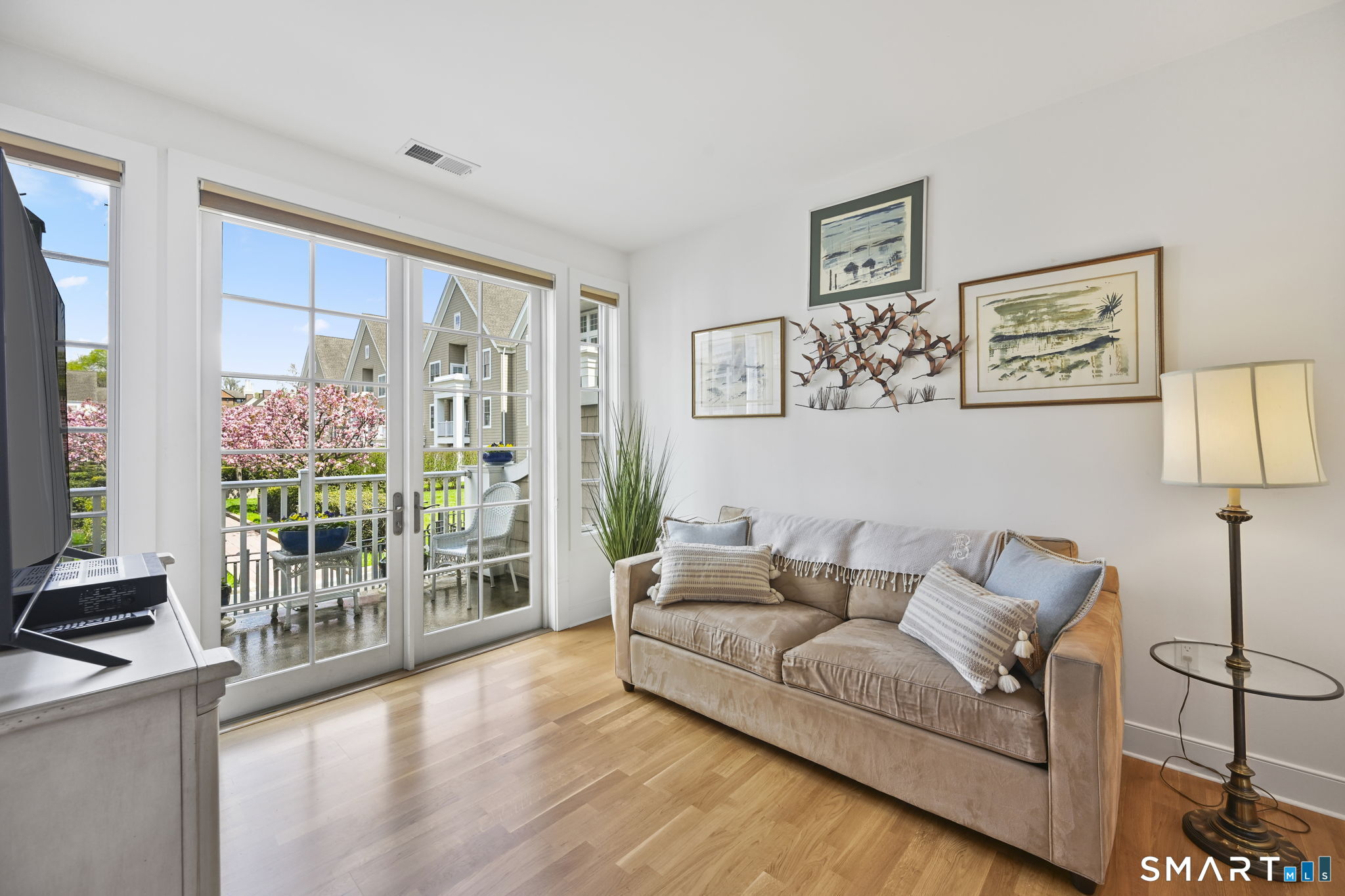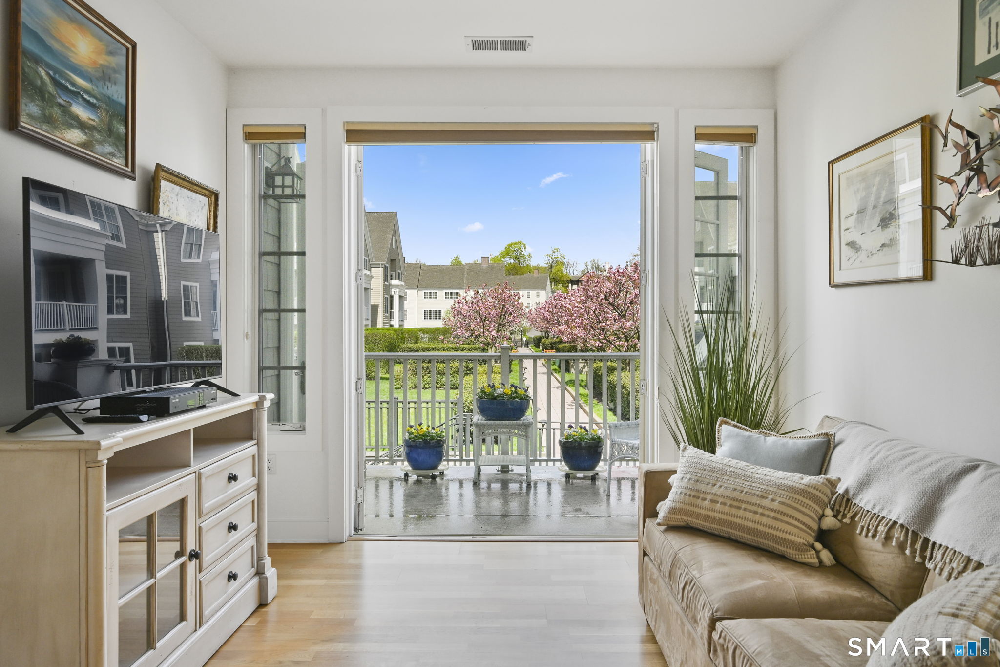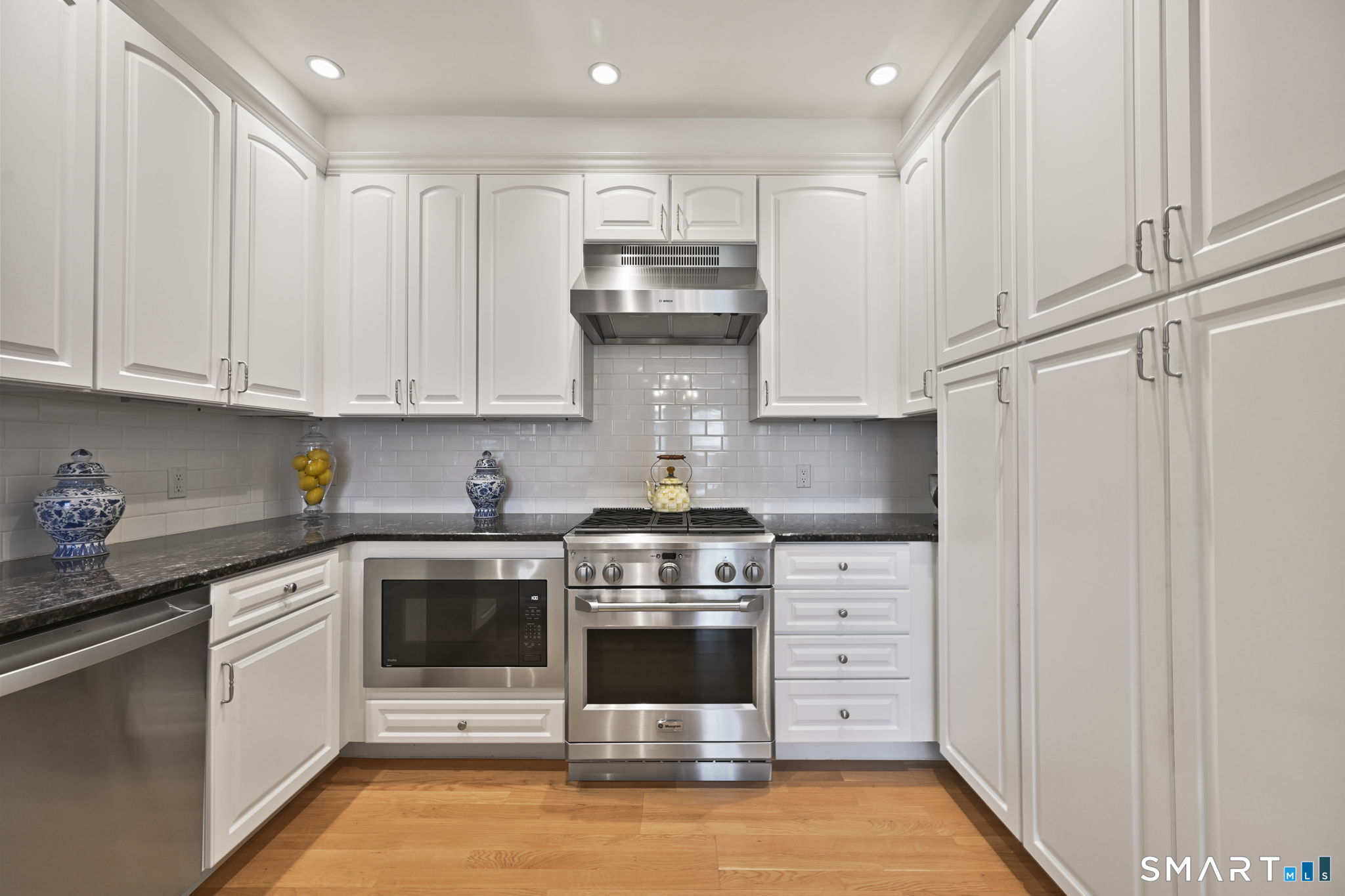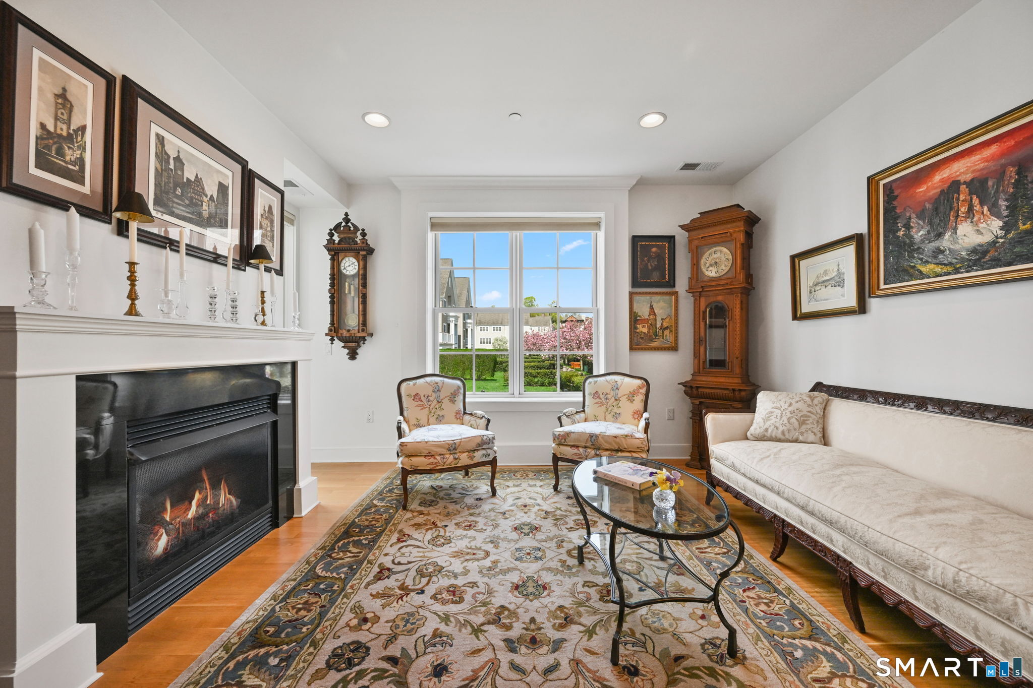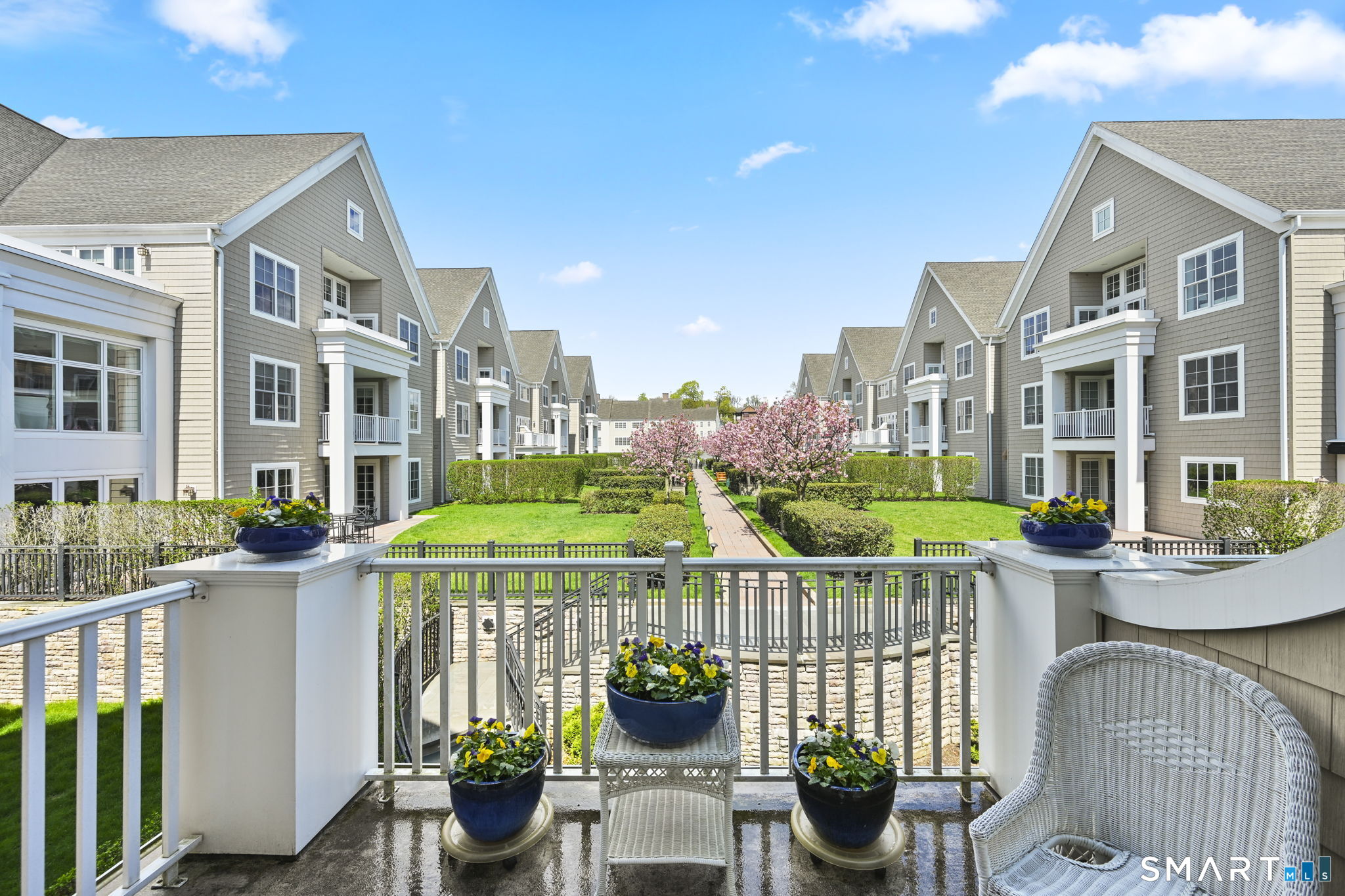 Palmer Hill! The Luxury Gated Community on the Old Greenwich/Stamford Border. Rarely on market, Fantastic and Highly Desirable 3 Bedrooms or 2 Bedroom + Den/2 Bath midrise condo with 2 terraces. 1 Floor Living. All wood floors, New HVAC, Water Heater, and AC Compressor. Lots of light, great courtyard views, custom window treatments, custom lighting! Open plan living/dining room with large windows, gas fireplace, and French door to a terrace. Gourmet kitchen with breakfast bar, many cabinets, SS appliances, New Dishwasher, Microwave, and Washing Machine. Spacious en-suite primary bedroom suite has ceiling moldings, custom walk in closet, French door to a terrace and a full, en-suite marble bath with 2 sinks. 2nd Bedroom has a custom closet, 3rd bedroom/den has French doors to a 2nd terrace and custom walk-in closet. This home comes with 2 indoor parking spaces, a storage unit, and a bike room. Amenities include a newly remodeled clubhouse, pool, hot tub, fire pit, gym, yoga room, and business center. Dog Friendly! Minutes to I95 and Metro North. Don't Miss this one!