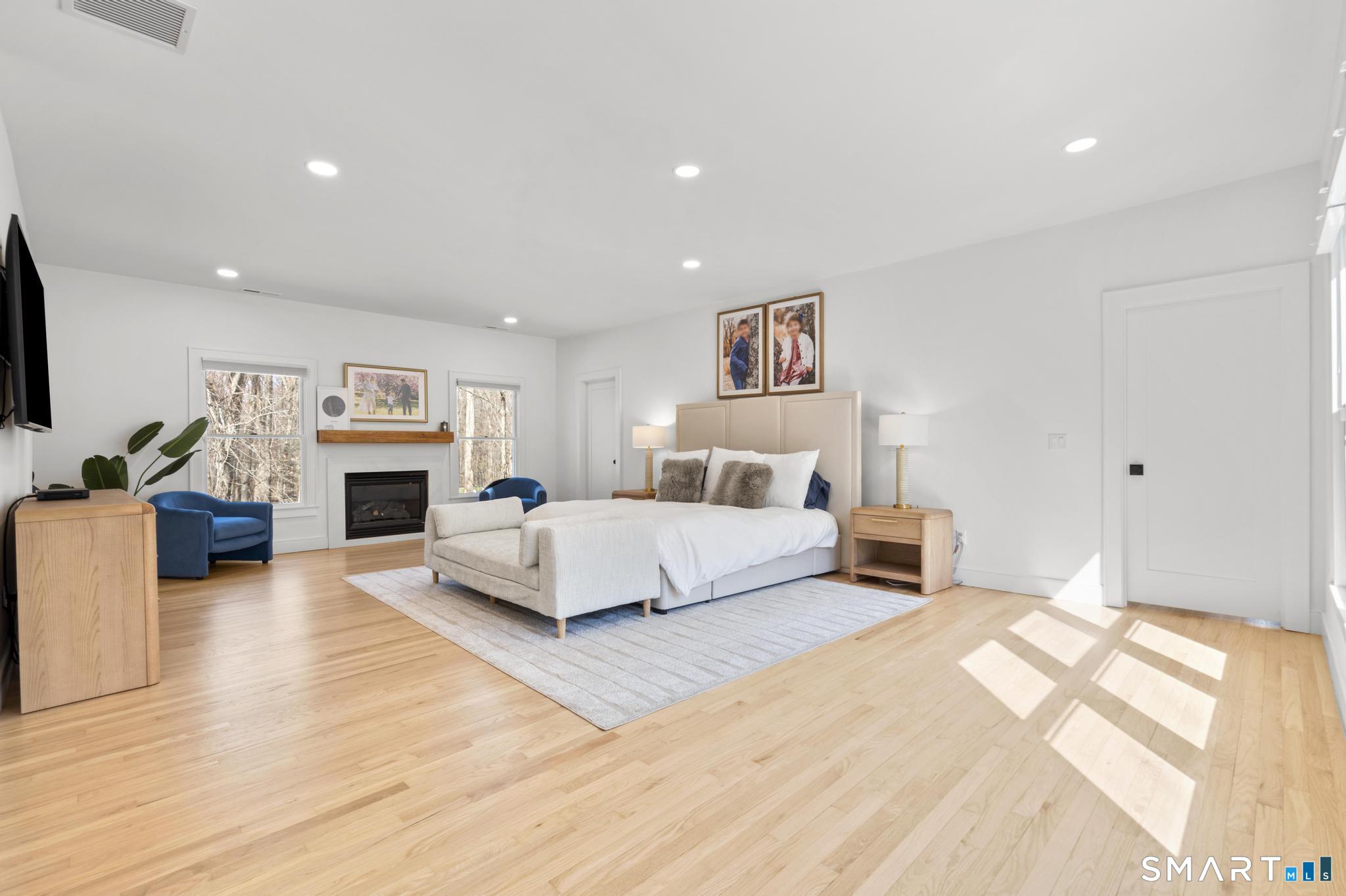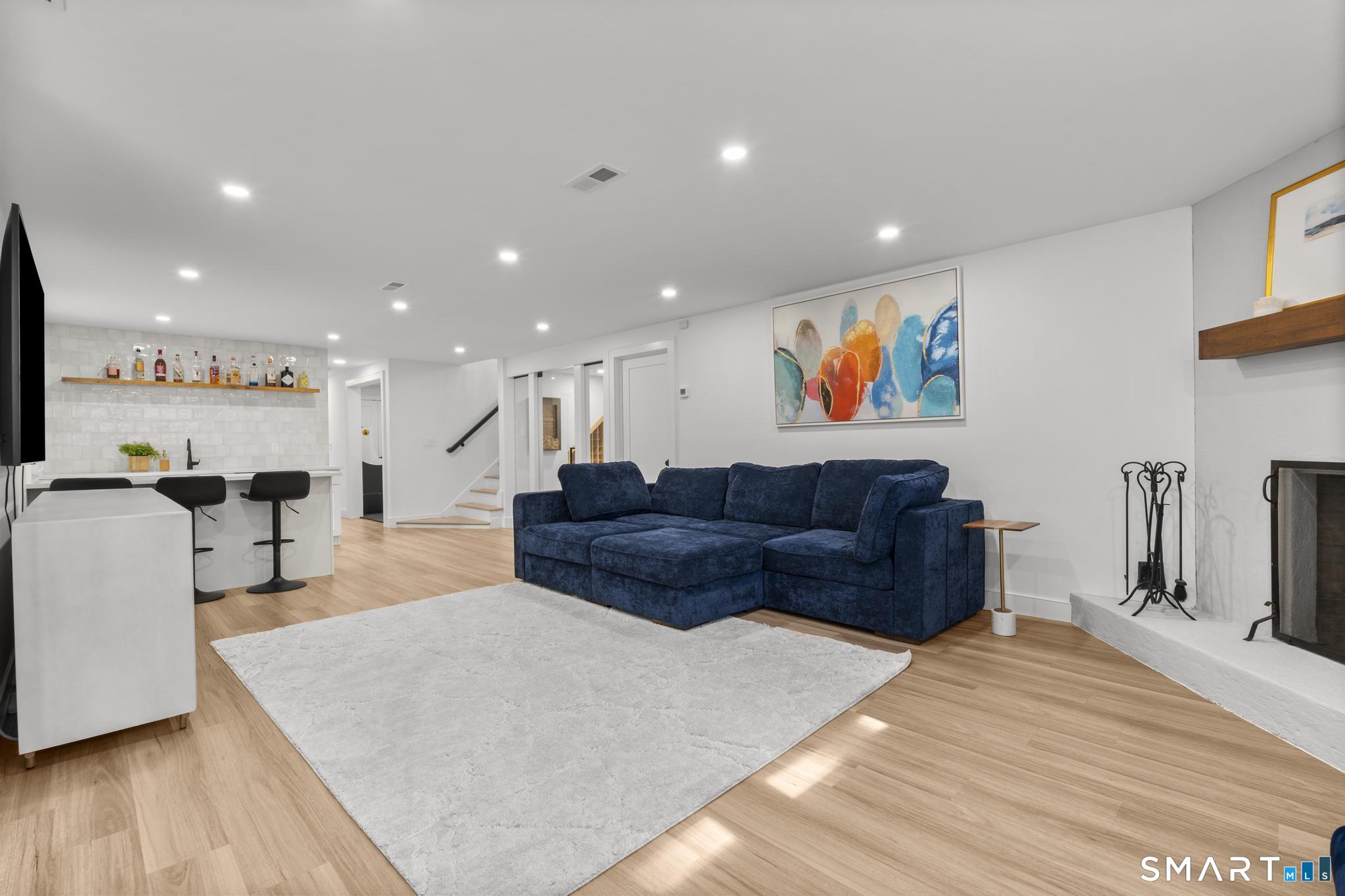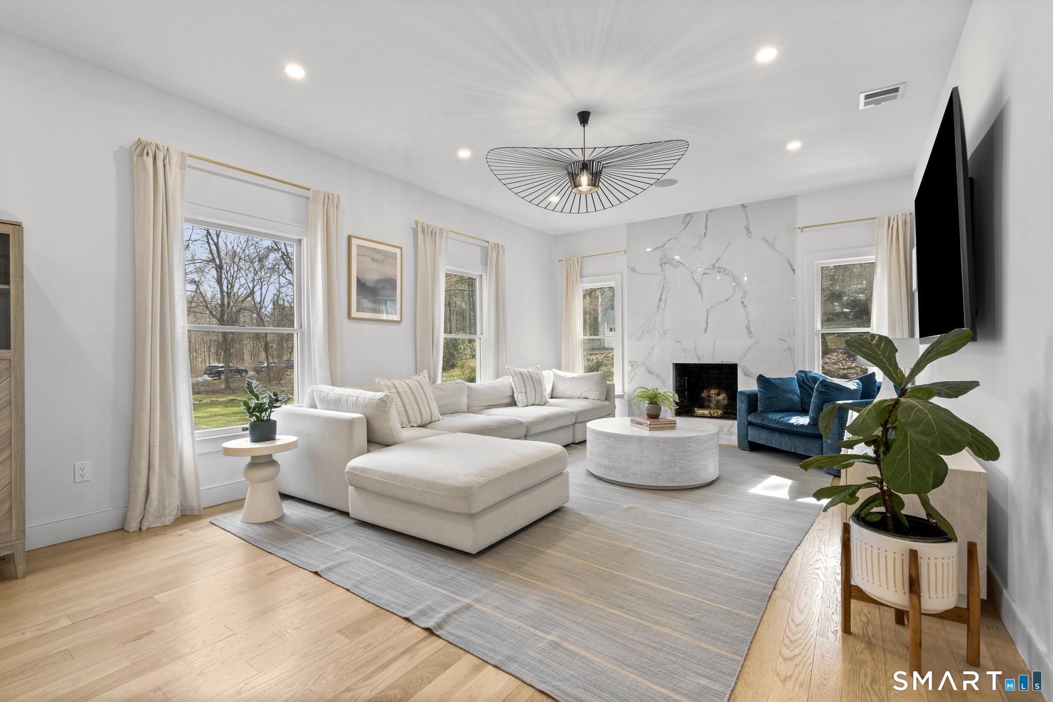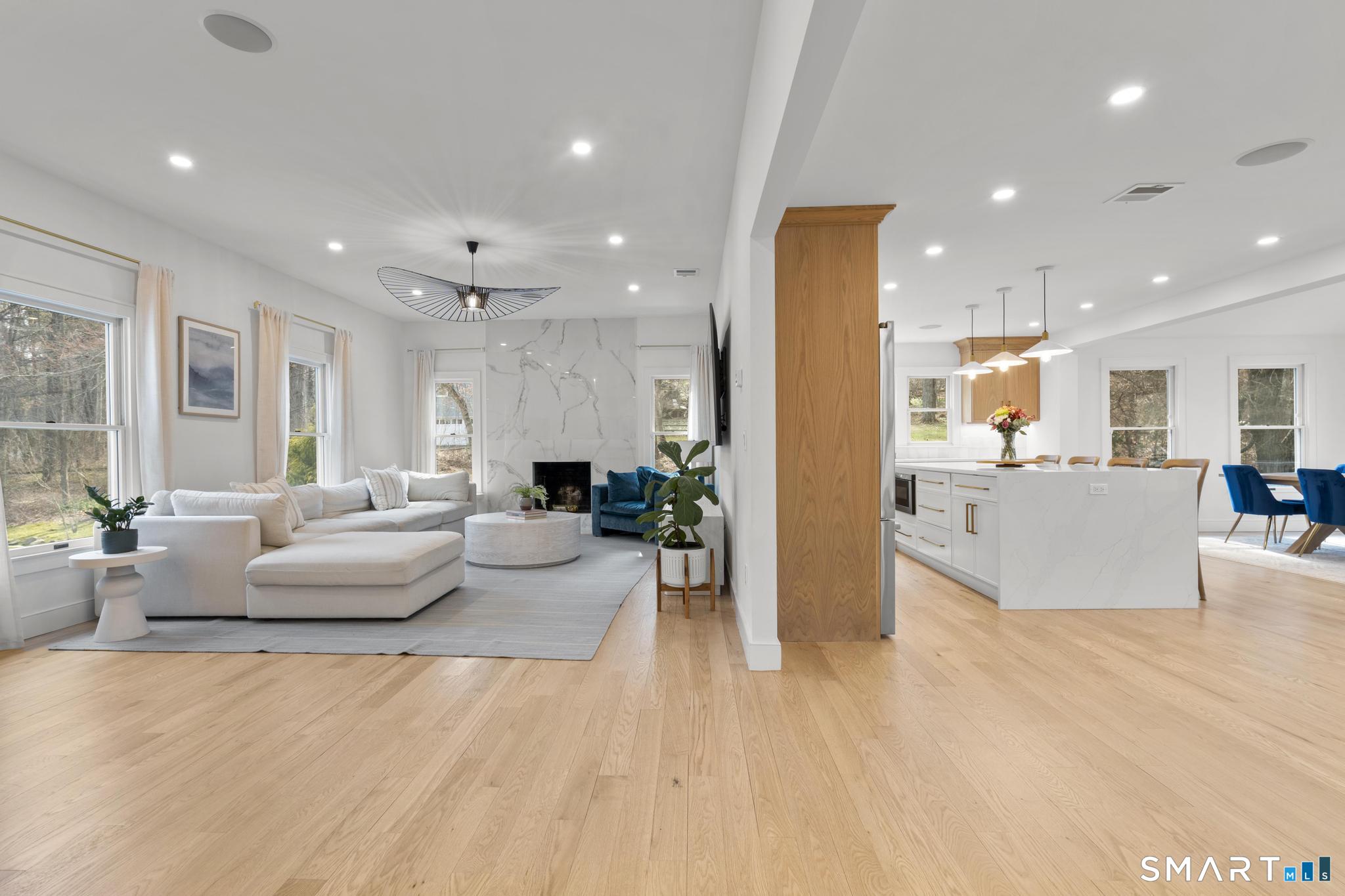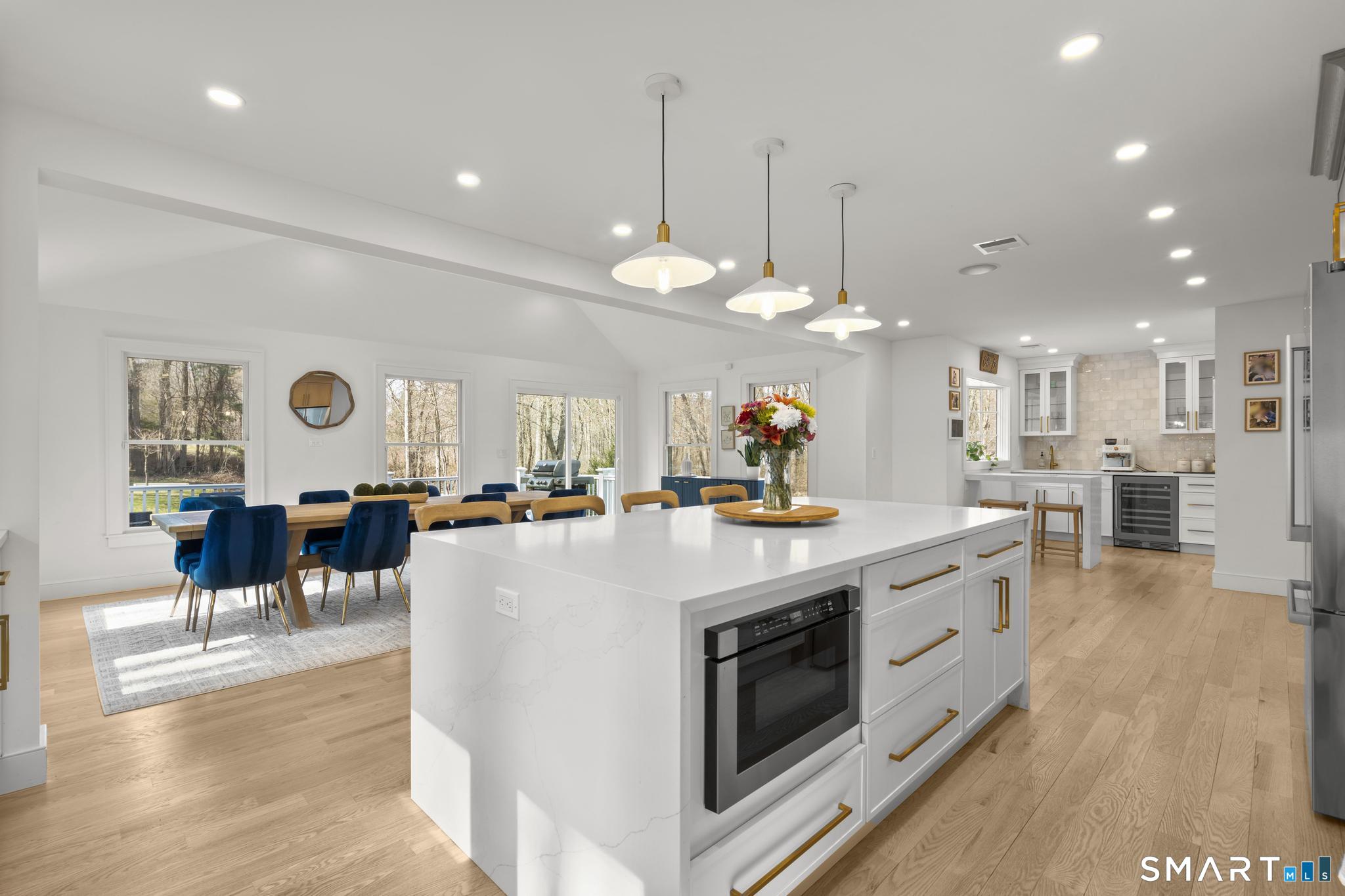This stunning fully renovated 5-bedroom, 4 full bath home offers the perfect blend of modern design and comfortable living, set on a private 2.03-acre lot. Featuring an open concept layout with 9-foot ceilings, gleaming hardwood floors, central air, and fresh paint throughout, the home is both stylish and move-in ready. The inviting living room with a cozy fireplace flows seamlessly into the gourmet kitchen, complete with a large center island, Bosch refrigerator, gas range, dishwasher, and built-in microwave. Ample cabinetry is complemented by a wet bar/coffee station and a spacious walk-in pantry, ideal for both everyday living and entertaining. The expansive dining area overlooks a private deck and serene backyard, creating a perfect indoor-outdoor connection. The generous primary suite is a true retreat, featuring two walk-in closets, a gas fireplace, and a private office. Three additional bedrooms provide plenty of space, including one with its own ensuite bath. The fully finished lower level offers exceptional versatility with a mudroom, wine cellar, and a large recreation room complete with a fireplace and built-in bar with quartz countertops. A 3-car garage and beautifully landscaped grounds complete this exceptional property.