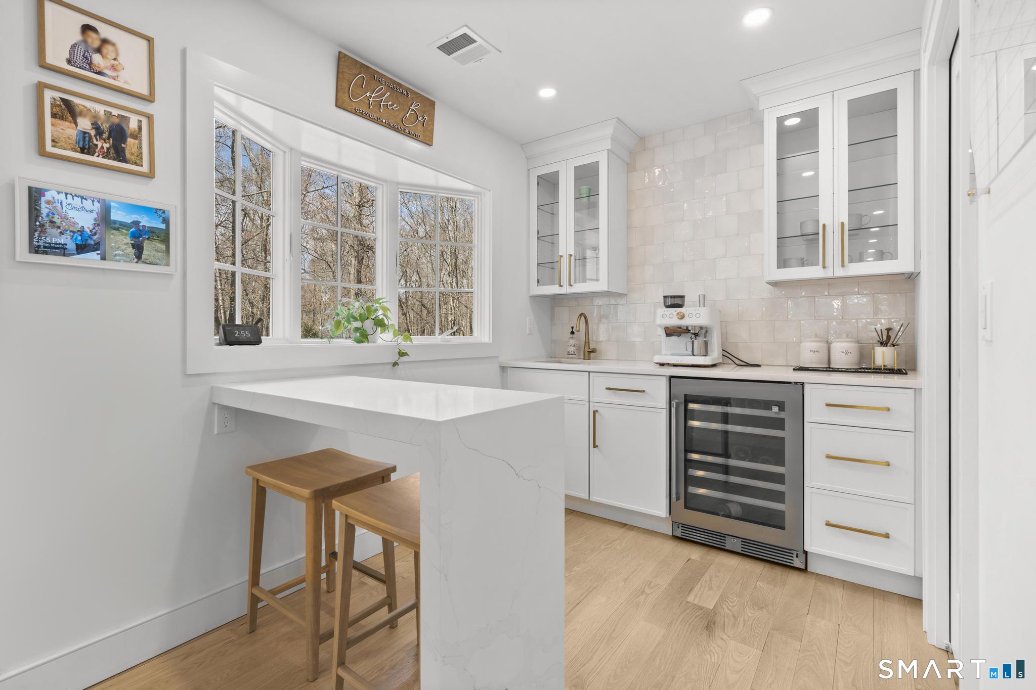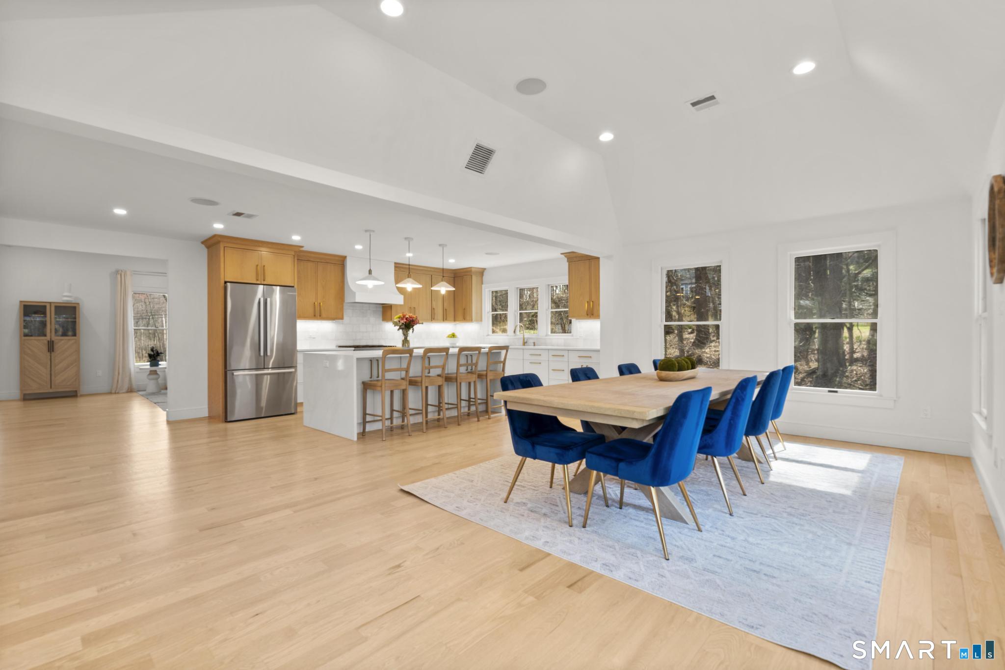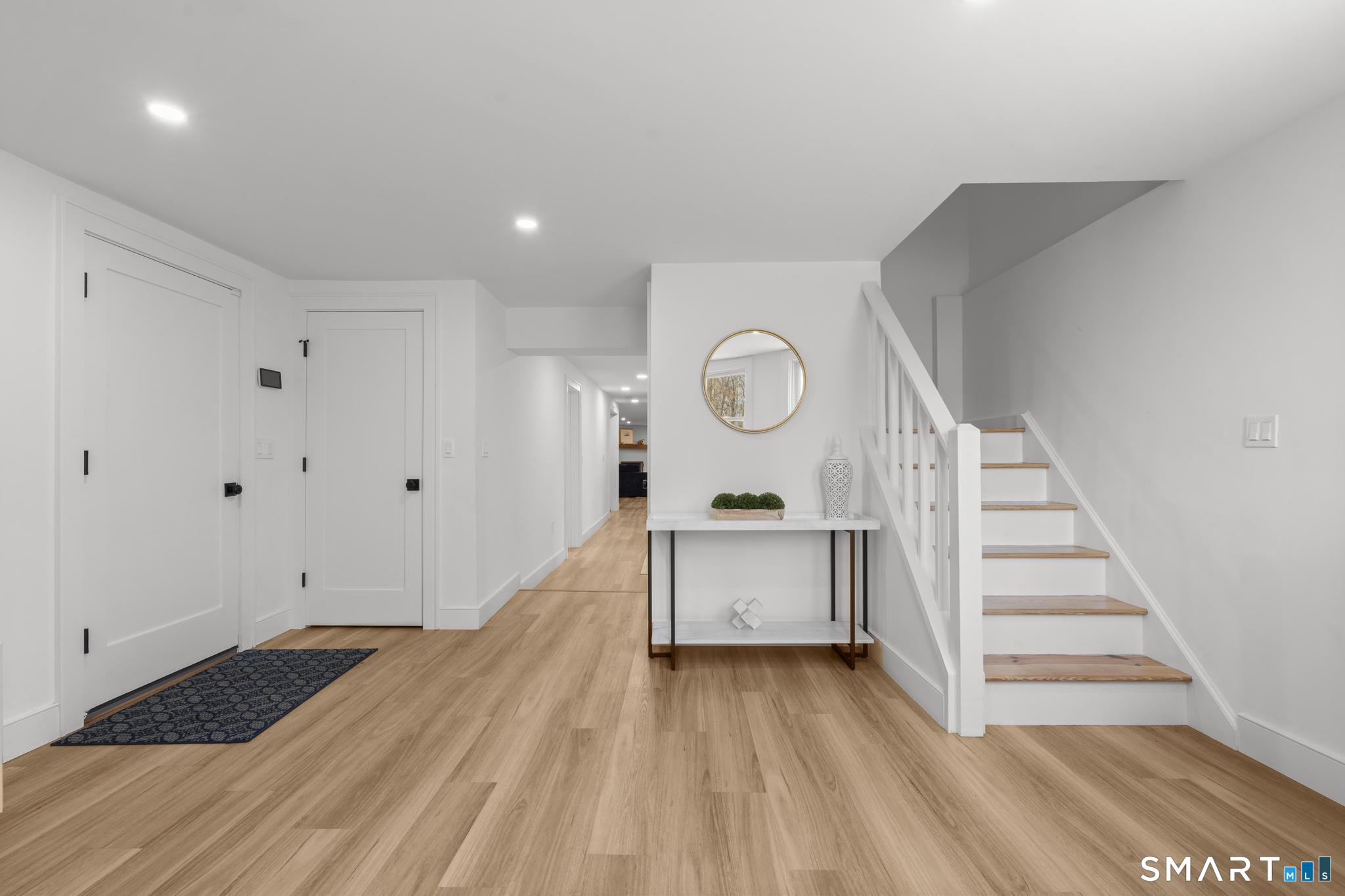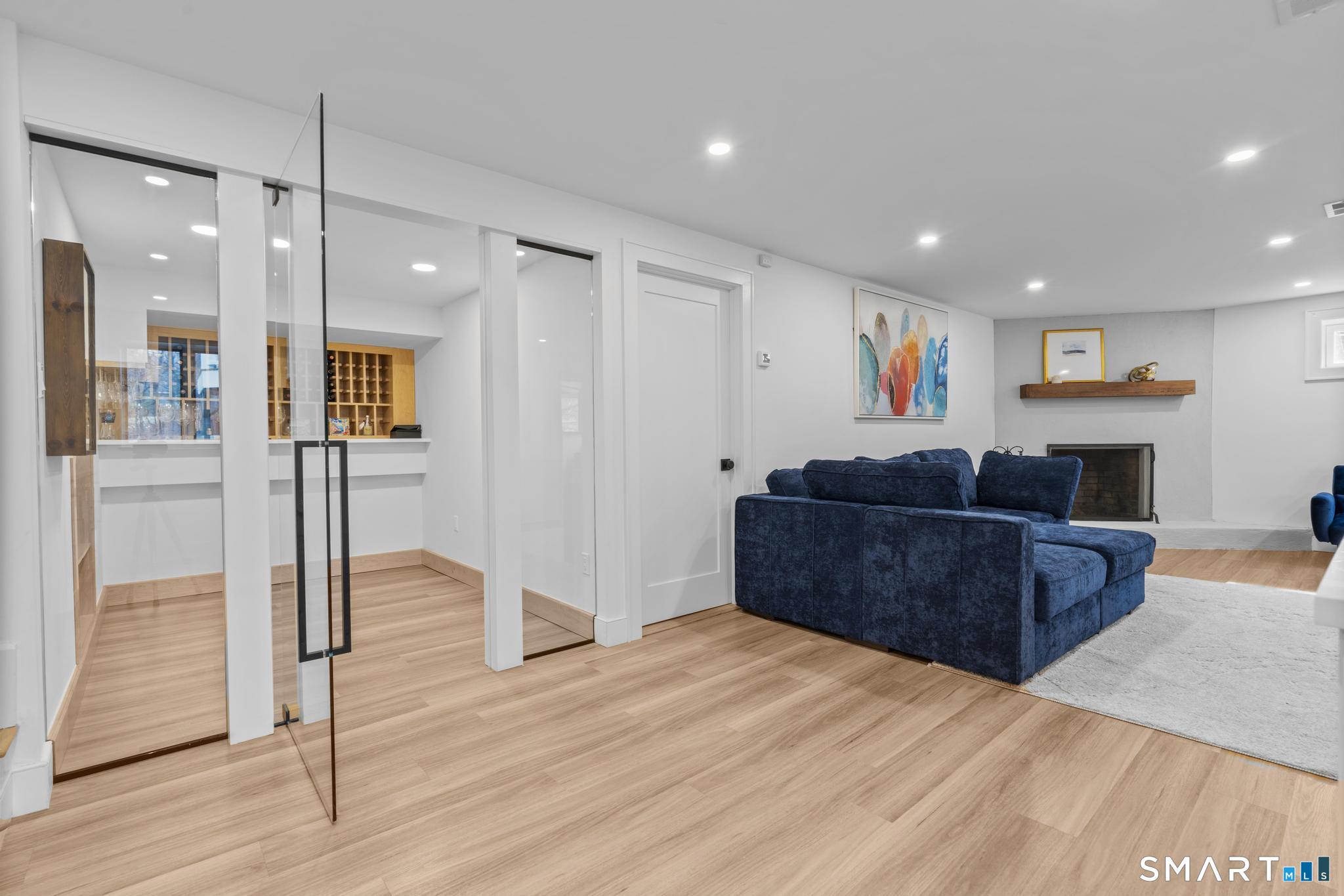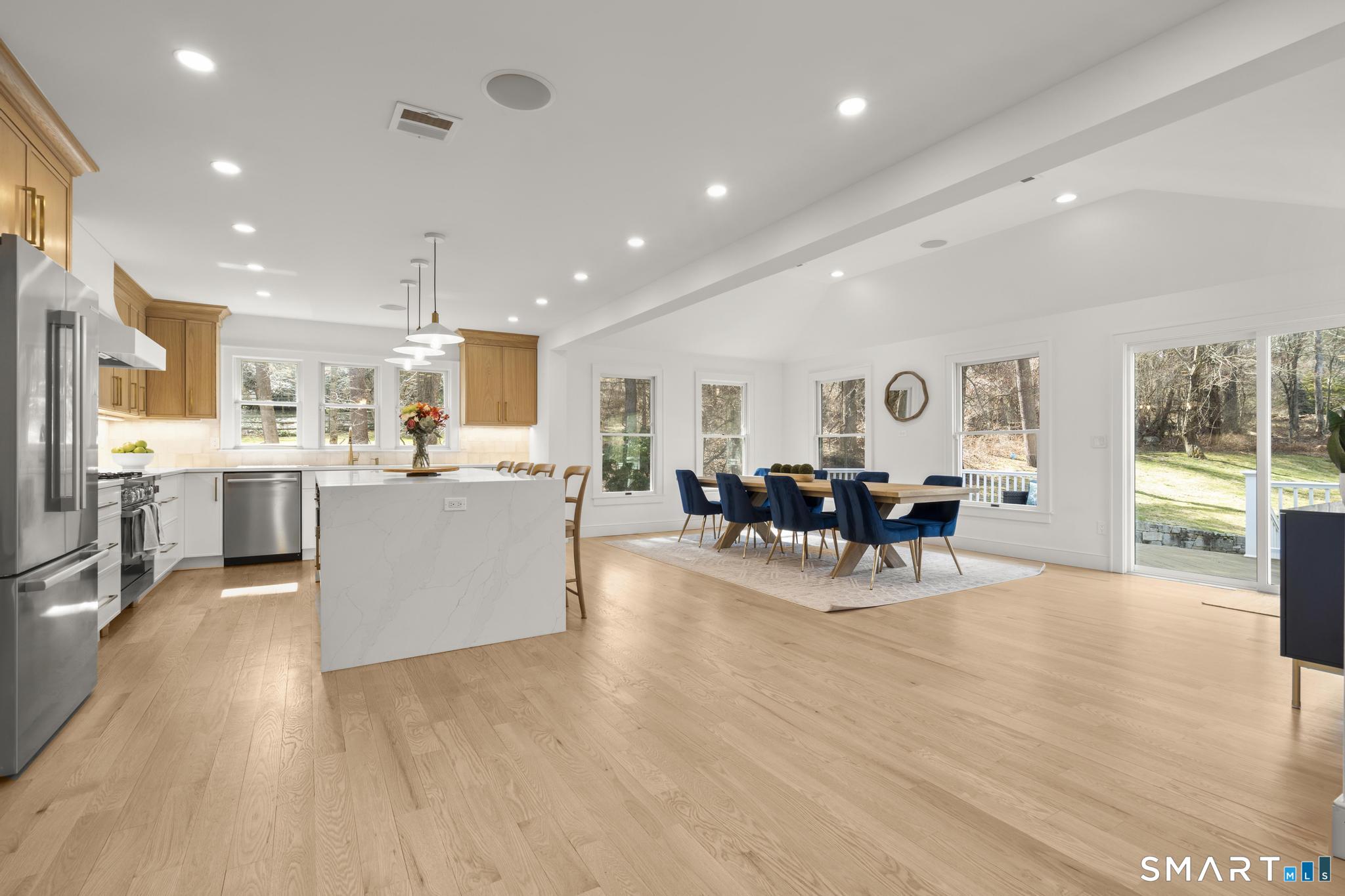 This stunning fully renovated 5-bedroom, 4 full bath home offers the perfect blend of modern design and comfortable living, set on a private 2.03-acre lot. Featuring an open concept layout with 9-foot ceilings, gleaming hardwood floors, central air, and fresh paint throughout, the home is both stylish and move-in ready. The inviting living room with a cozy fireplace flows seamlessly into the gourmet kitchen, complete with a large center island, Bosch refrigerator, gas range, dishwasher, and built-in microwave. Ample cabinetry is complemented by a wet bar/coffee station and a spacious walk-in pantry, ideal for both everyday living and entertaining. The expansive dining area overlooks a private deck and serene backyard, creating a perfect indoor-outdoor connection. The generous primary suite is a true retreat, featuring two walk-in closets, a gas fireplace, and a private office. Three additional bedrooms provide plenty of space, including one with its own ensuite bath. The fully finished lower level offers exceptional versatility with a mudroom, wine cellar, and a large recreation room complete with a fireplace and built-in bar with quartz countertops. A 3-car garage and beautifully landscaped grounds complete this exceptional property.