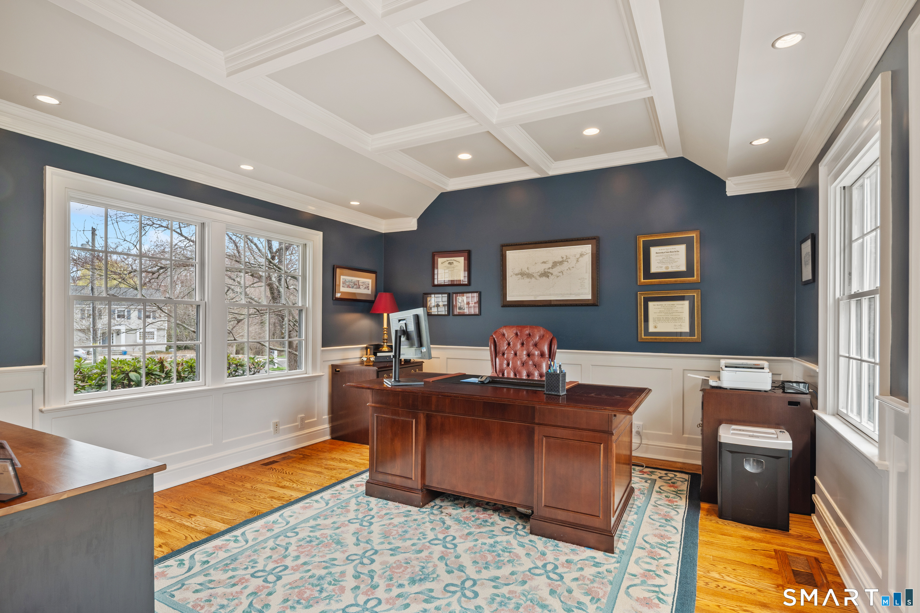 An exceptional opportunity to own in the desirable South of the YMCA neighborhood featuring four bedrooms & 4 1/2 baths, this home is a perfect mix of elegance and practicality. Taken down to the studs and rebuilt in 2006 - this home has it all. From the moment you step inside, you'll be captivated by the sophisticated details, including elegant moldings and wainscoting, rich hardwood floors and sunlit living spaces. The Living room boasts a wood burning fireplace and both LR and DR feature large bay windows. The library accessed off the LR has a trey coffered ceiling and a door to the terrace. Step through to the incredible oversized family room with gas fireplace which is wide open to an updated kitchen complete with top of the line stainless steel appliances, a walk-in pantry and a huge quartzite island. The breakfast nook opens to a charming terrace with a built-in gas grill and a large pergola with retractable shades. Upstairs an incredible primary suite is accented by another gas fireplace, a gorgeously updated bath and huge walk-in closet. There is a large bonus room with vaulted ceiling and three additional bedrooms, two with walk in closets and their own bath and one with access to a hall bath. The unfinished basement is 1784 square feet and is completely dry awaiting your finishing touches! But the piece de la resistance is the over 1 acre of beautifully landscaped level yard perfect for family gatherings, or peaceful relaxation!