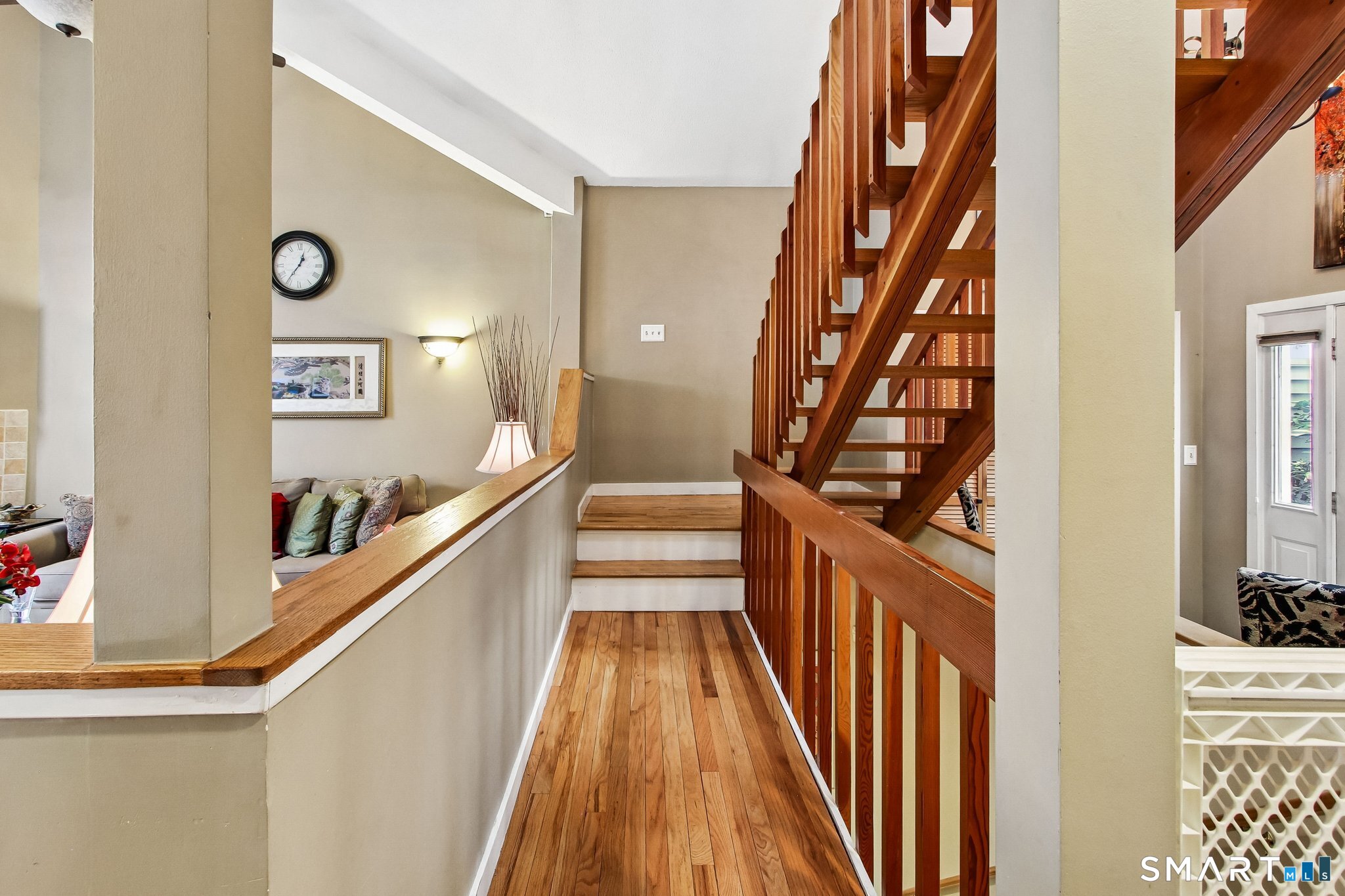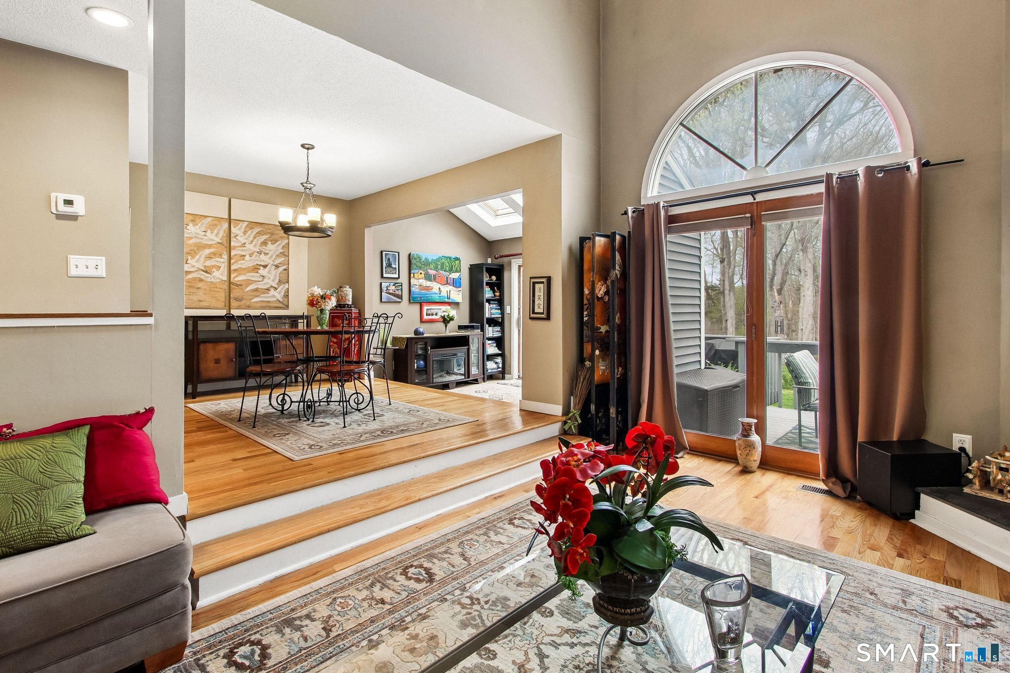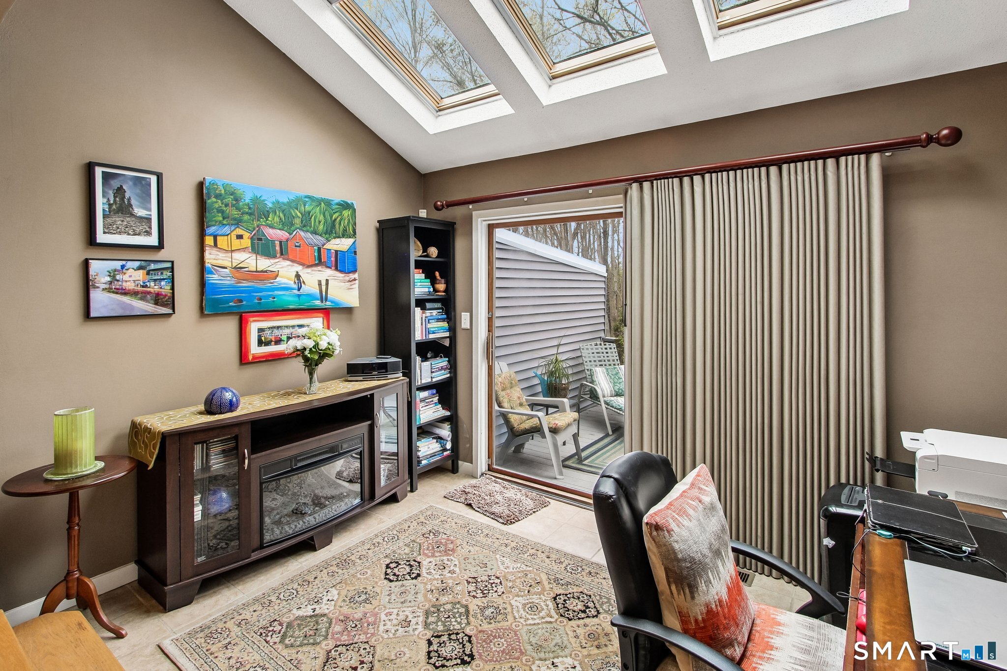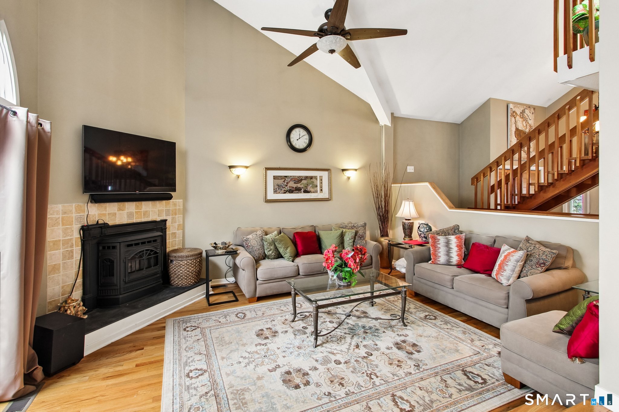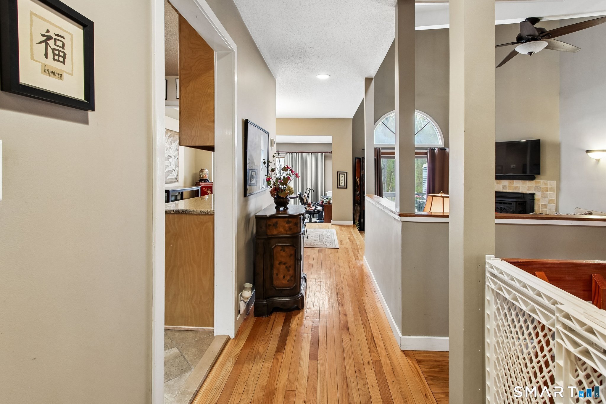 Northford Pond Village-Contemporary Townhouse in a private 13-unit complex. This well-maintained 2-bedroom, 2.5-bath home offers comfort, style, and natural surroundings with the convenience of an attached one-car garage. Hardwood floors run throughout the main living areas, complementing a galley kitchen equipped with maple cabinetry, granite countertops, and stainless steel appliances. The sunken living room features a cozy fireplace with a pellet stove, perfect for relaxing evenings. A bright sunroom with sliders opens to a private deck overlooking the woods, providing a peaceful retreat. This main level includes a half bath with full size laundry. The upper level features two bright bedrooms with ample closet space and a remodeled bathroom. The finished lower level offers a family room and a full bath with shower-ideal for guests or additional living space. A wonderful opportunity for low-maintenance living in a serene setting.