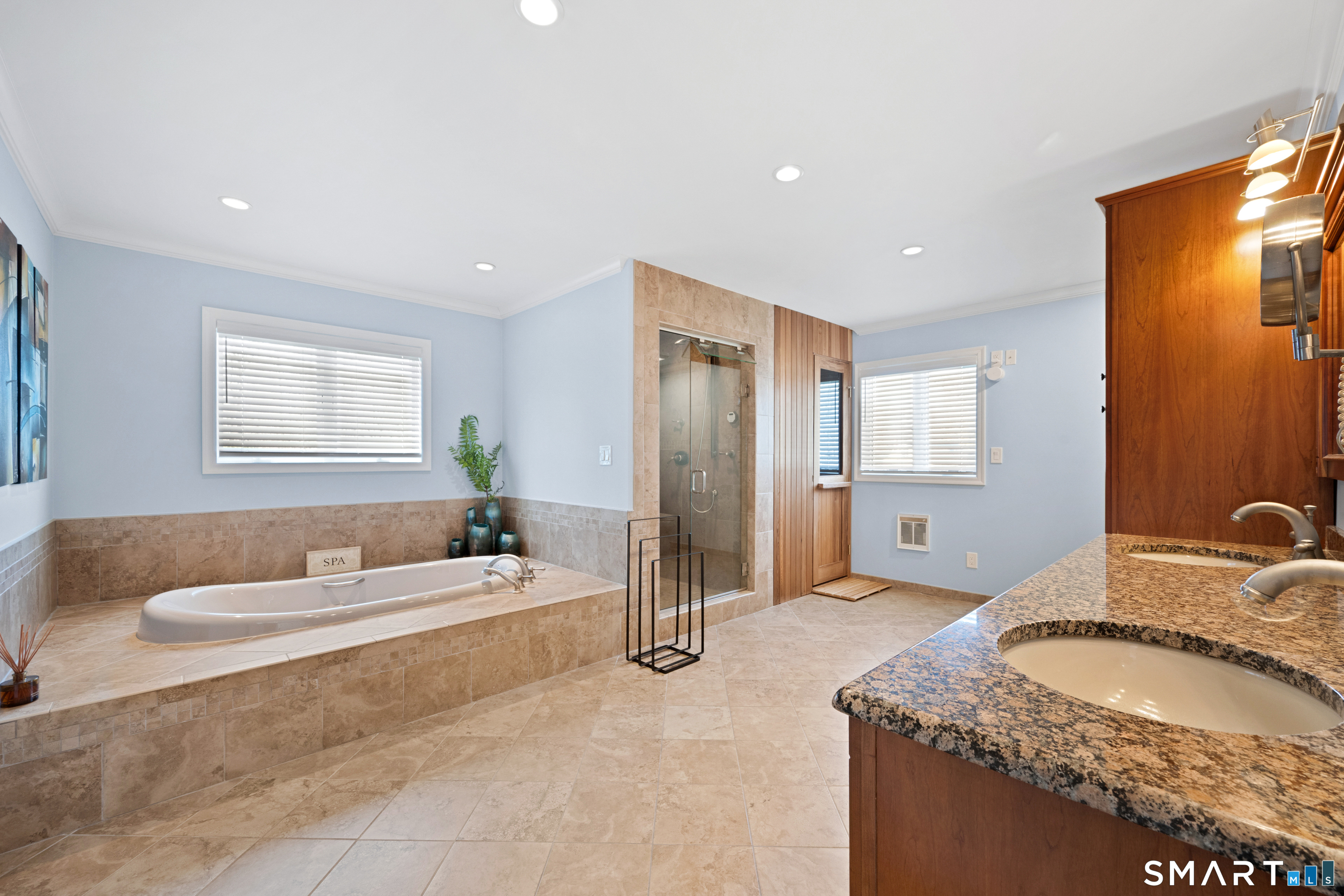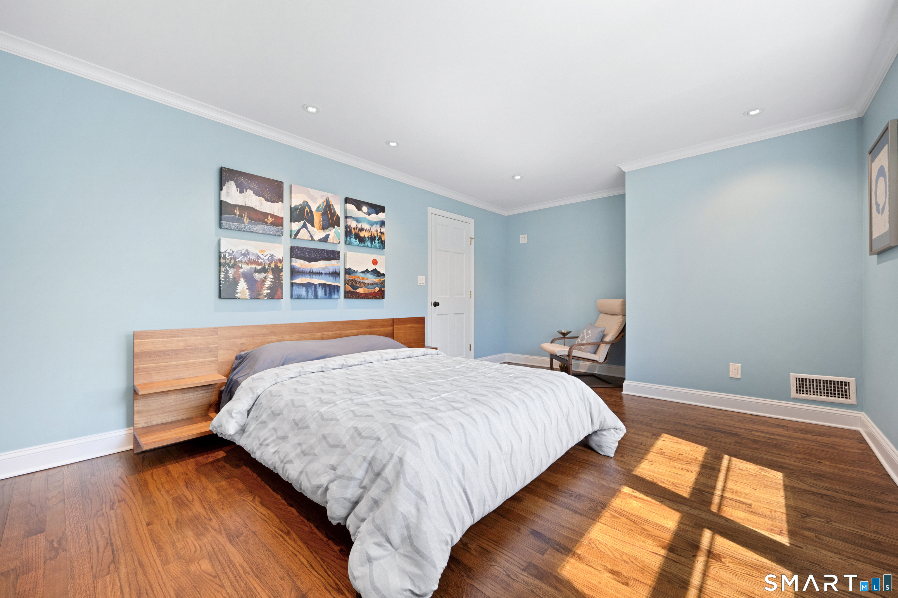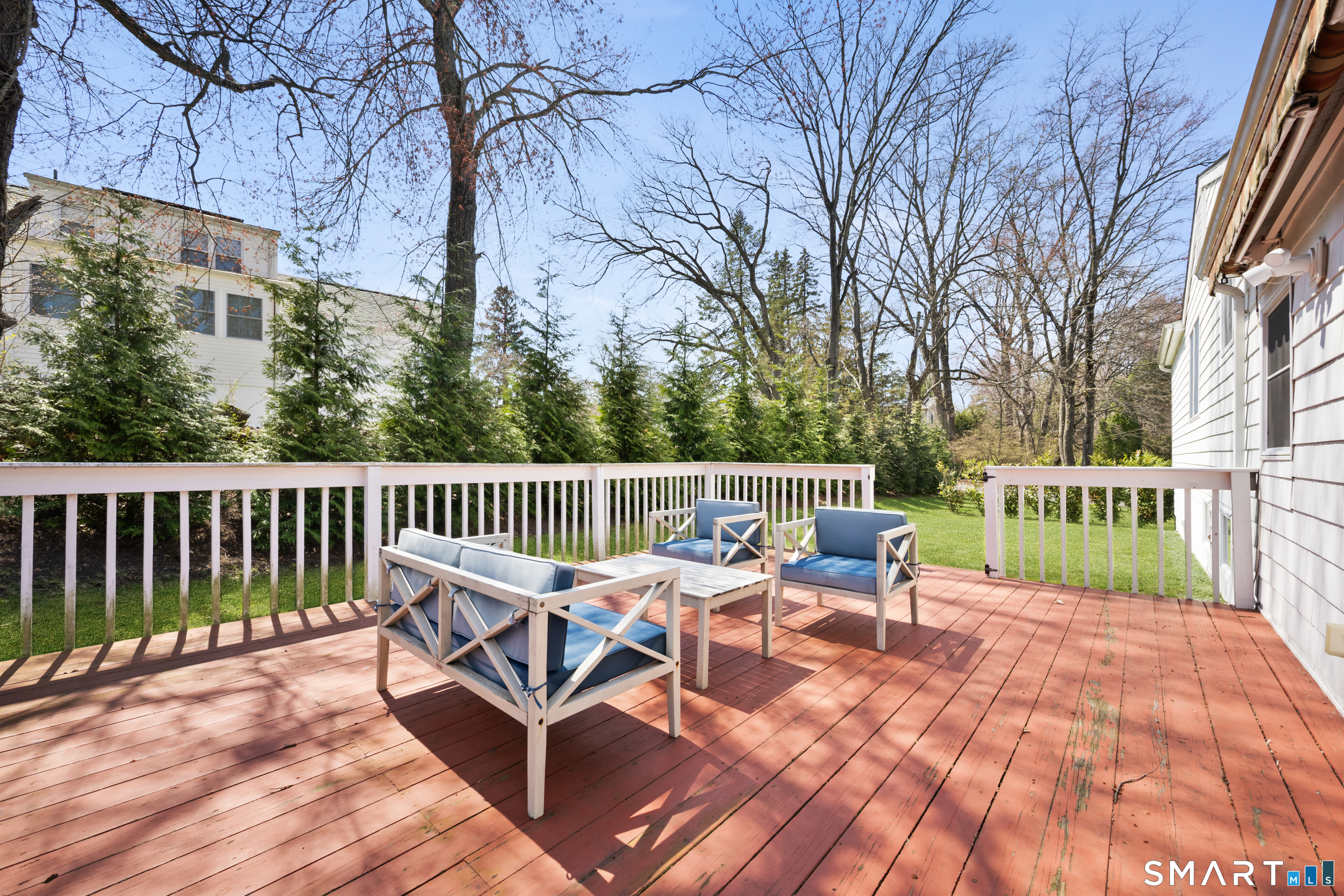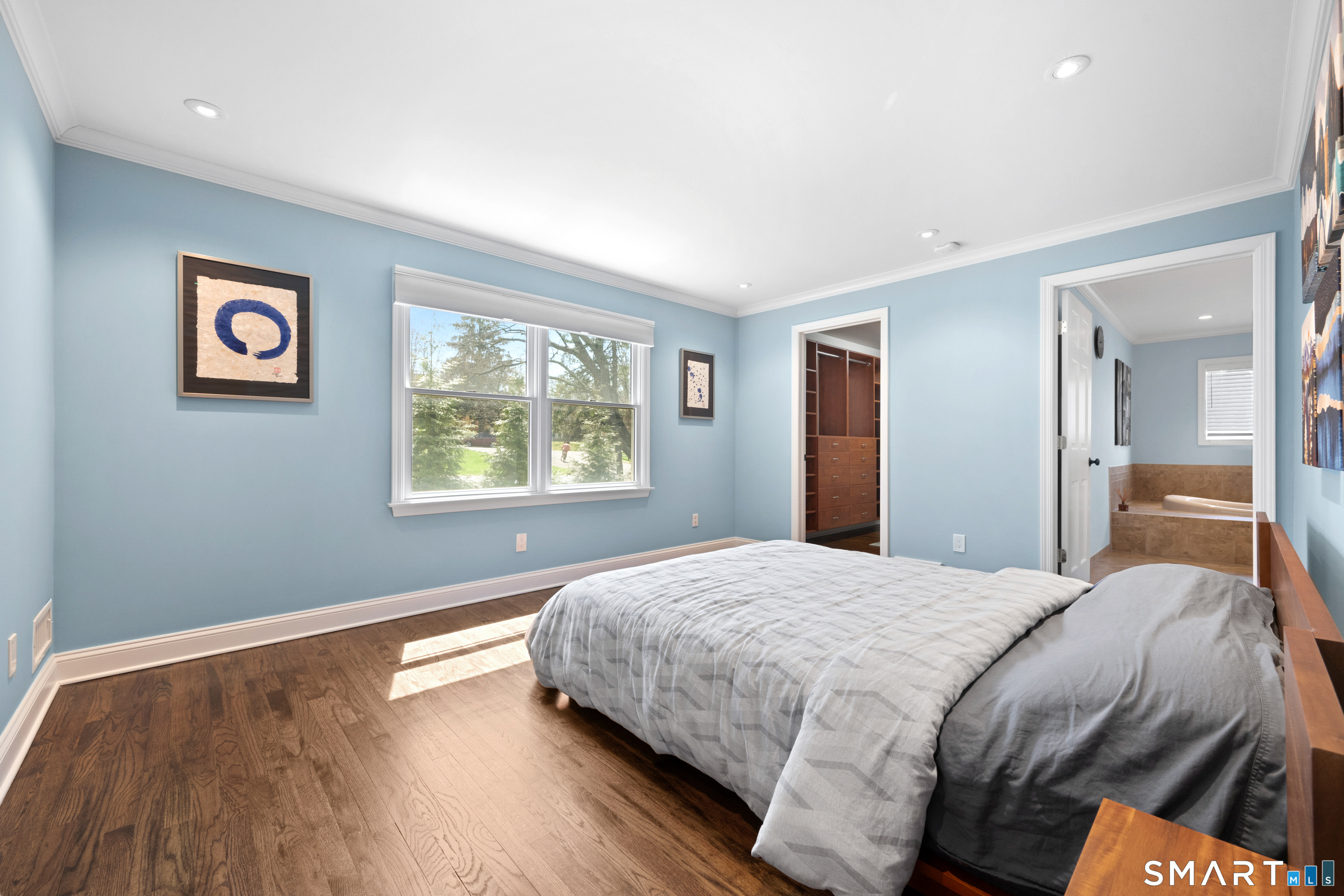 Centrally located on a quiet triple cul de sac, this inviting home offers an open floor plan, abundant natural light, and thoughtful updates throughout. It features 3 bedrooms and 3 full bathrooms, with hardwood floors running throughout the home. The living room with fireplace flows into the dining room, where sliders open to a spacious deck with an awning. The updated kitchen features a skylight, granite countertops, and stainless steel appliances. The primary suite is a true retreat, complete with an oversized walk in closet outfitted with California Closets cabinetry and shelving, plus a private spa like bath with double sinks, radiant heated floors, a shower stall, jacuzzi tub, and sauna. The lower level family room offers flexible space and could serve as a 4th bedroom, with a full bath and an alcove ideal for a home office. The home underwent a major renovation and addition in 2005, including updated electrical, plumbing, windows, and roof, along with an 80 gallon water heater replaced in 2021, a furnace updated in 2013, and the roof was replaced in 2020.