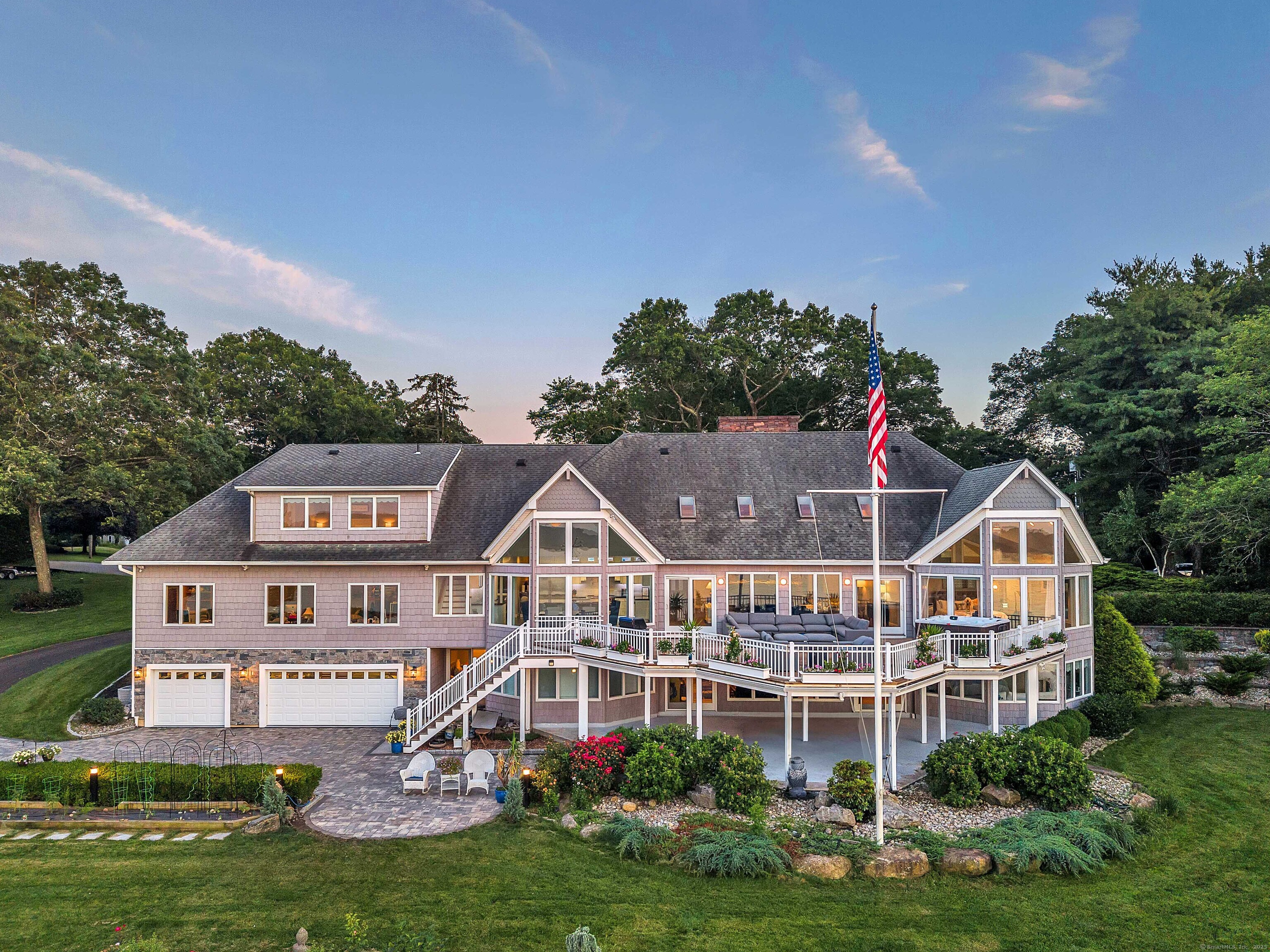 Welcome to your waterfront hidden gem! A once in a lifetime opportunity on the Connecticut River featuring 381 feet of direct waterfront, private two boat dock, private horseshoe bay and panoramic north facing views up the river. This modern Contemporary private estate features 5,600+ square feet of living space! Open floor plan, stunning water views from every room! The living room features cozy fireplace, floor to ceiling windows and opens to a 750 square foot inviting deck ideal for relaxing, entertaining, soaking in the hot tub, peaceful sunsets or simply taking in the ever-changing river views. A lower level 750 square foot patio overlooks landscaped grounds, gardens and new stone fire pit area. The chef's kitchen is a dream featuring an oversized granite island, high-end stainless-steel appliances, custom cabinetry, wet bar, wine chiller that invites both gourmet cooking and effortless hosting. Designed for comfort, the home offers multiple luxurious bedroom suites each with sweeping views, spa like bathrooms, walk in closets, hardwood floors and high ceilings. It is perfect for an in-law bedroom or an au pair suite. Spacious additional bedrooms with views, entertainment room, private office with views, a loft, 4.5 bathrooms. A 5-car garage provides ample space for cars, outdoor lawn equipment or storage. A luxury lifestyle experience unlike any other on the Connecticut shoreline.