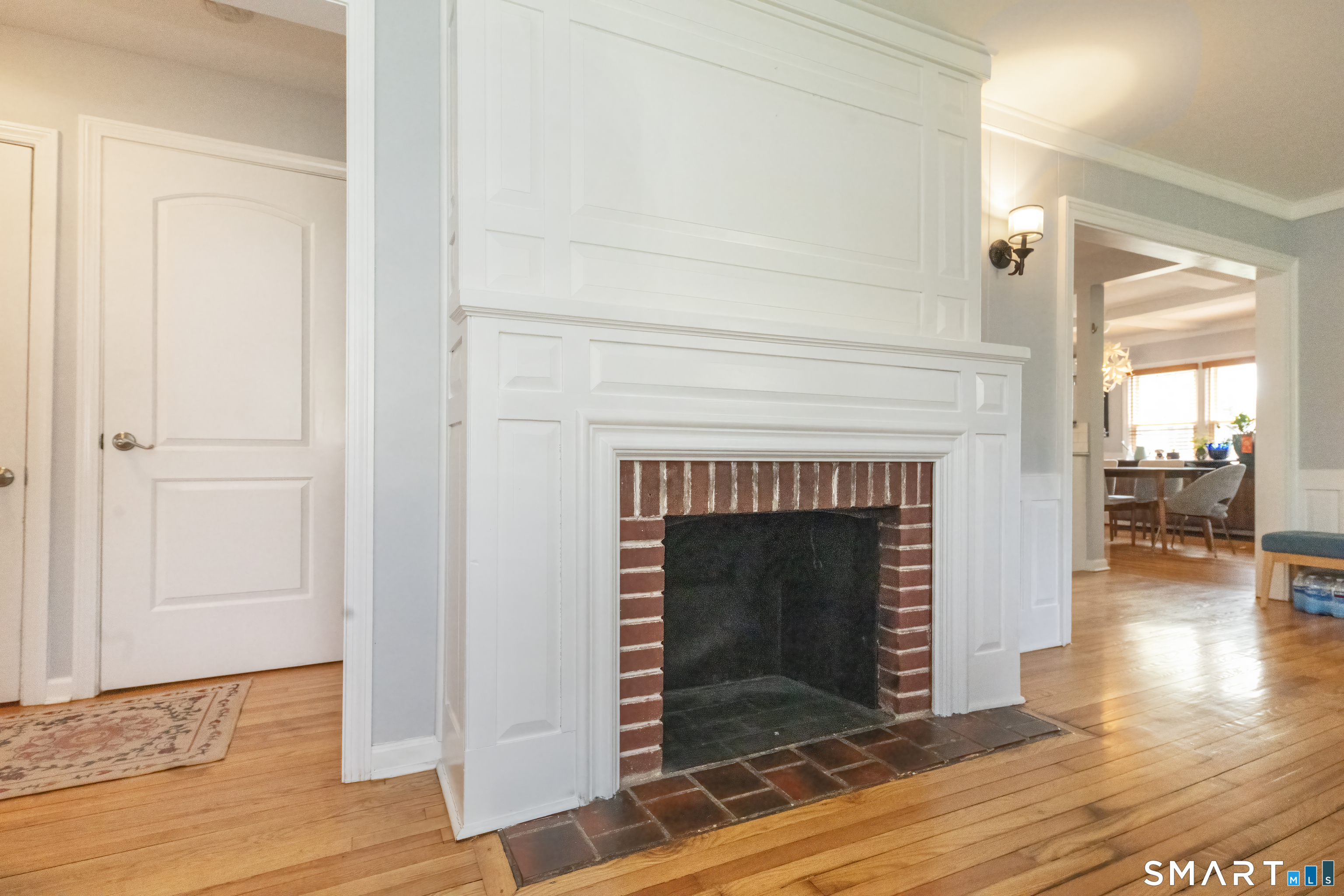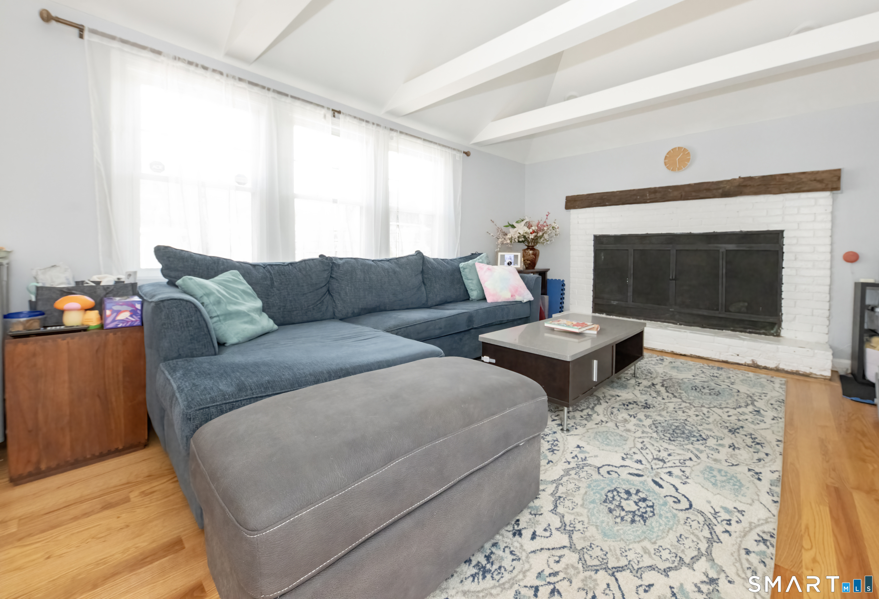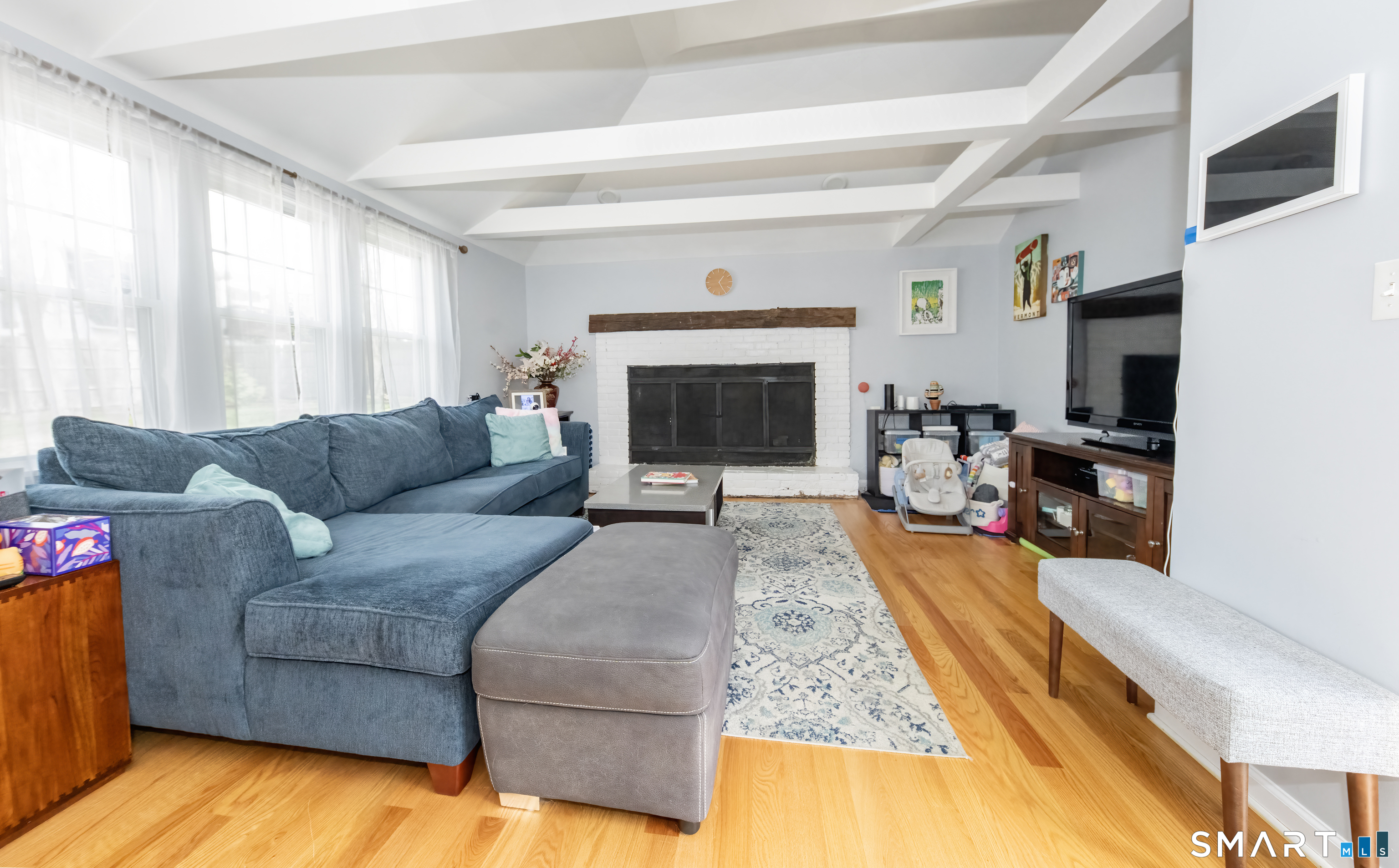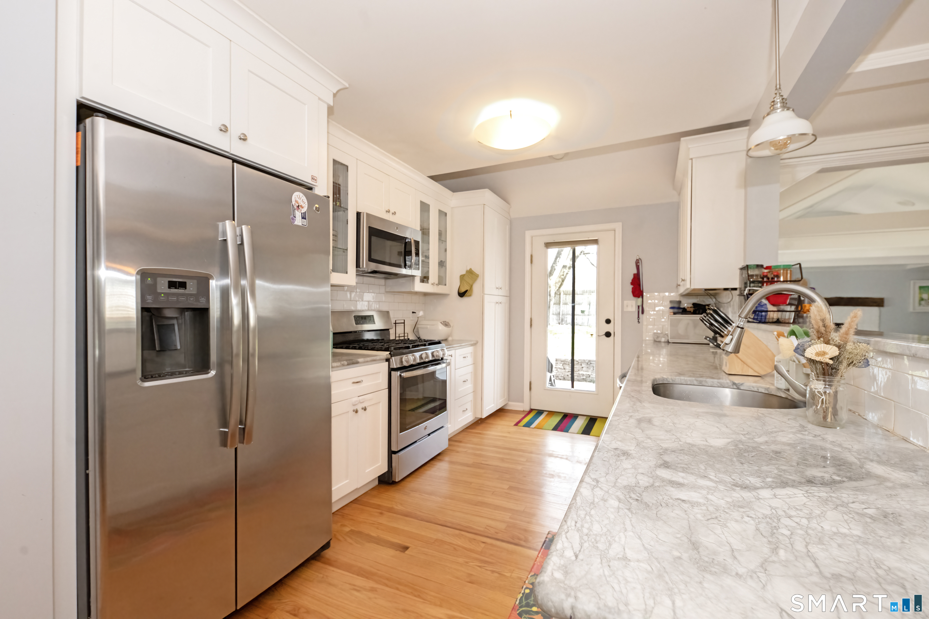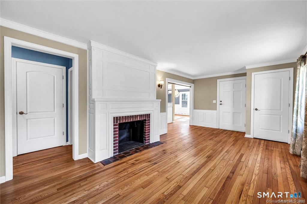 Welcome to 338 South Elm St. Just a few blocks from Wallingford's Center, you'll find this charming, spacious, updated Cape that is designed to impress! Seamless hardwood floors extend throughout the home. The thoughtful floorplan lends itself to single-level living if needed, starting with the large, formal living room (currently being used as an office) with multiple windows, raised-panel wainscoting and a cozy fireplace. The open-concept kitchen, dining room and den is perfect for entertaining. Stylish white kitchen cabinetry, stainless appliances and expansive granite counters are a chef's dream with direct access to a dining area that leads to a light-filled family room accented with a vaulted, beamed ceiling and a huge fireplace. The home's main level also has a separate wing with the primary bedroom, attached bath and walk-in closet. A second bedroom with a full, hall bath completes the first floor. A staircase leads to the third bedroom on the second floor. The long hallway has exposed brick walls and lots of closets under the eaves. This upper level also has a bonus space for a playroom or additional storage. The home is sited on a level lot with a tandem garage, stone patio and a fenced yard. Enjoy the great location with proximity to parks, restaurants, shopping and major highways. This inviting Cape will be a great place to call home!