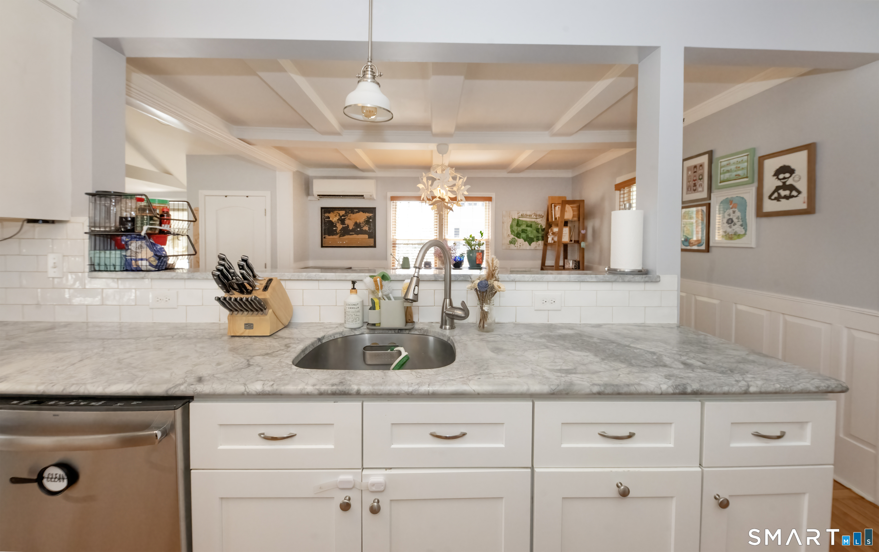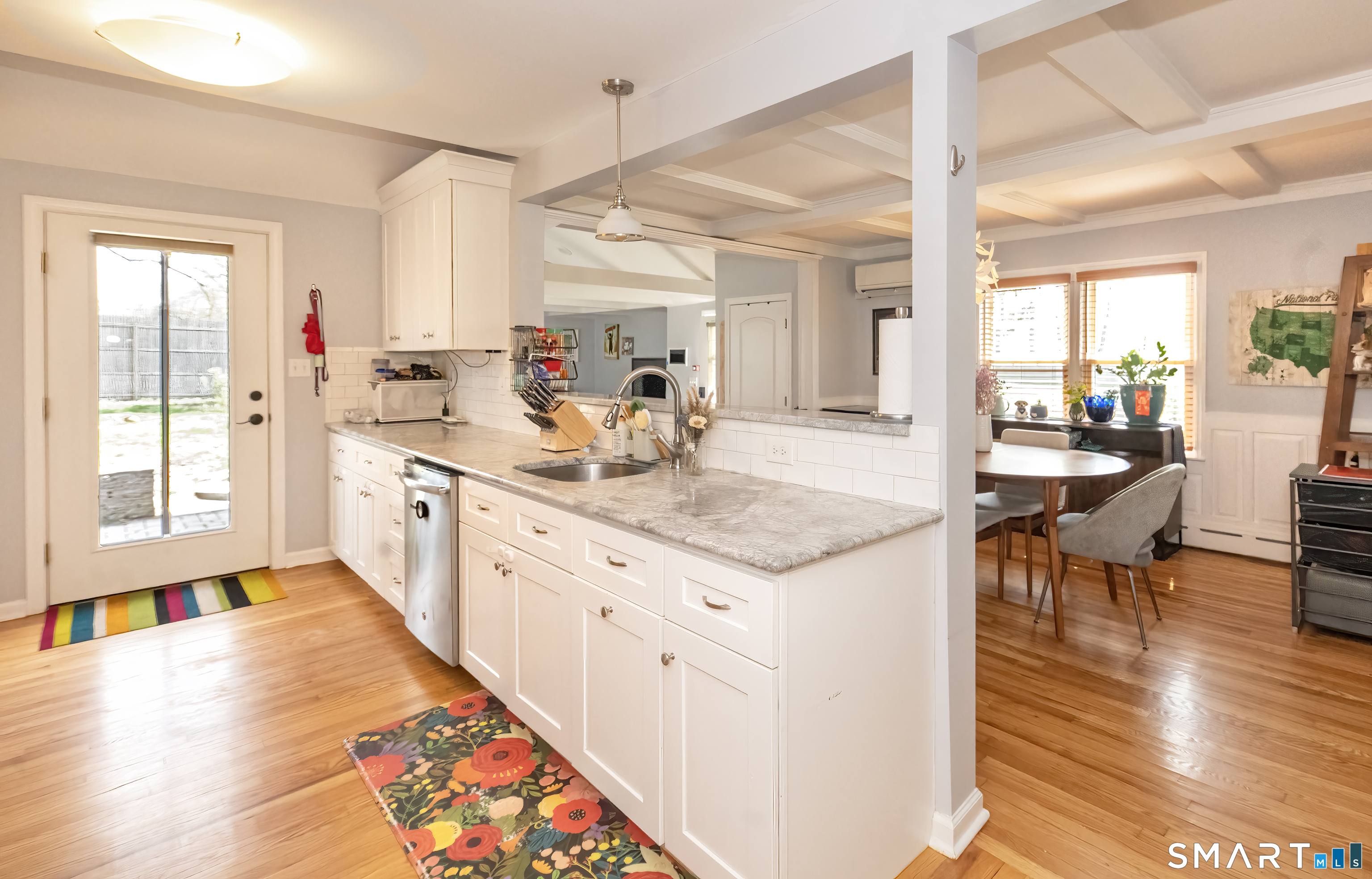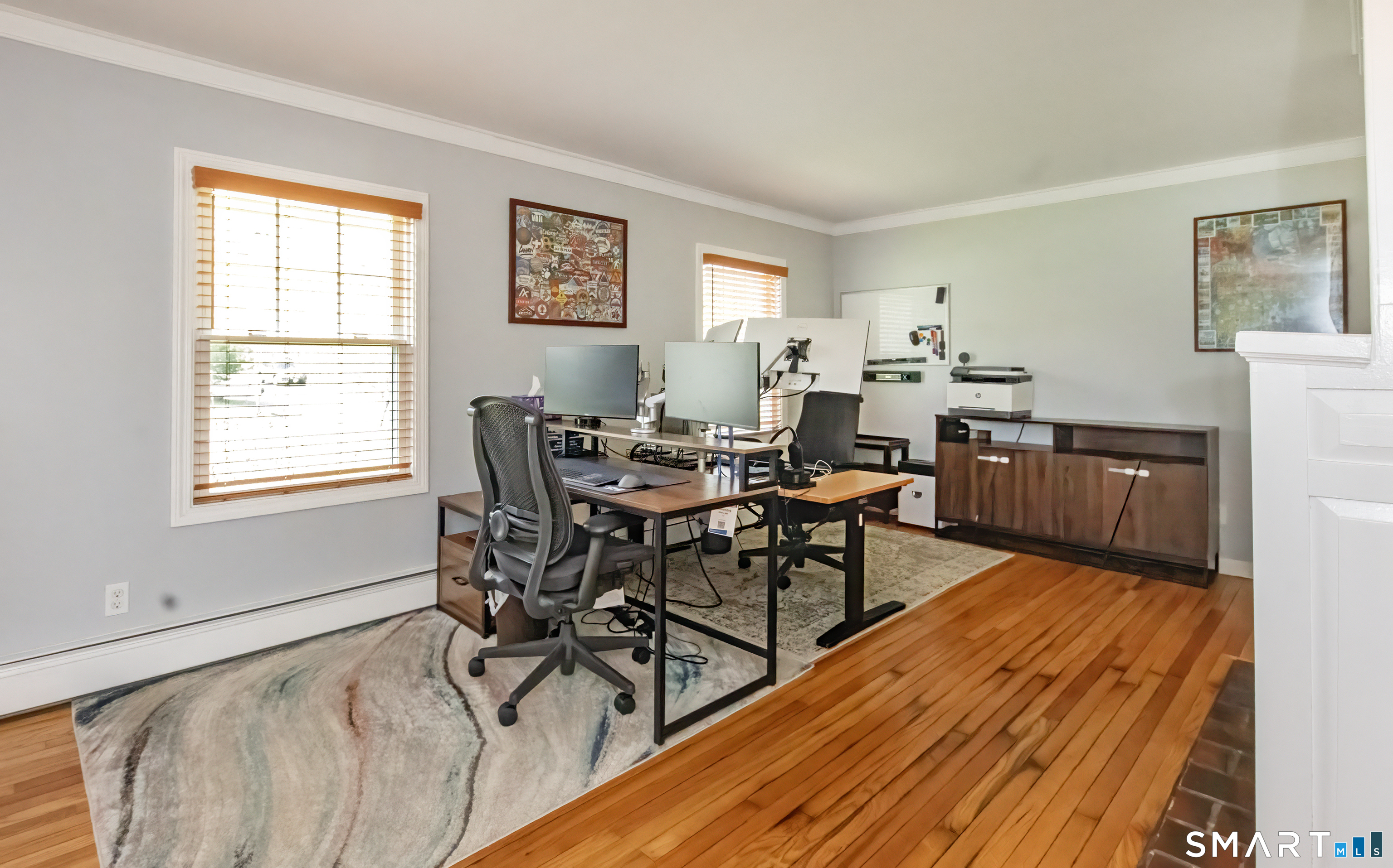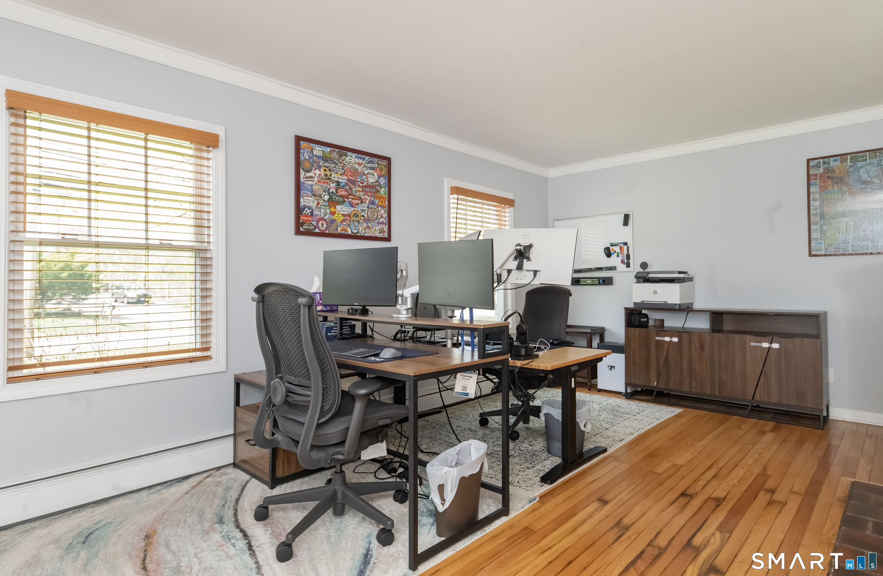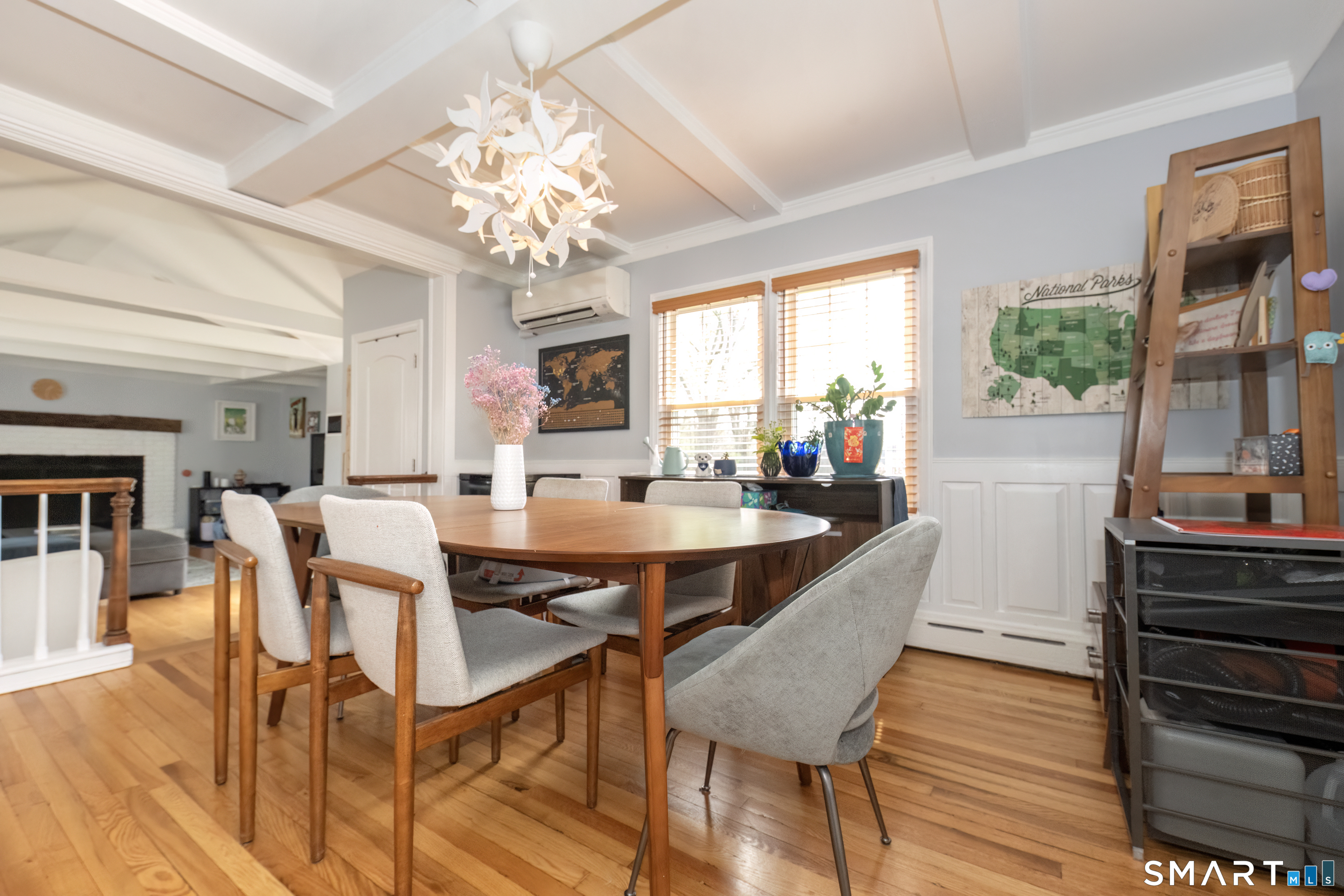 Welcome to 338 South Elm St. Just a few blocks from Wallingford's Center, you'll find this charming, spacious, updated Cape that is designed to impress! Seamless hardwood floors extend throughout the home. The thoughtful floorplan lends itself to single-level living if needed, starting with the large, formal living room (currently being used as an office) with multiple windows, raised-panel wainscoting and a cozy fireplace. The open-concept kitchen, dining room and den is perfect for entertaining. Stylish white kitchen cabinetry, stainless appliances and expansive granite counters are a chef's dream with direct access to a dining area that leads to a light-filled family room accented with a vaulted, beamed ceiling and a huge fireplace. The home's main level also has a separate wing with the primary bedroom, attached bath and walk-in closet. A second bedroom with a full, hall bath completes the first floor. A staircase leads to the third bedroom on the second floor. The long hallway has exposed brick walls and lots of closets under the eaves. This upper level also has a bonus space for a playroom or additional storage. The home is sited on a level lot with a tandem garage, stone patio and a fenced yard. Enjoy the great location with proximity to parks, restaurants, shopping and major highways. This inviting Cape will be a great place to call home!