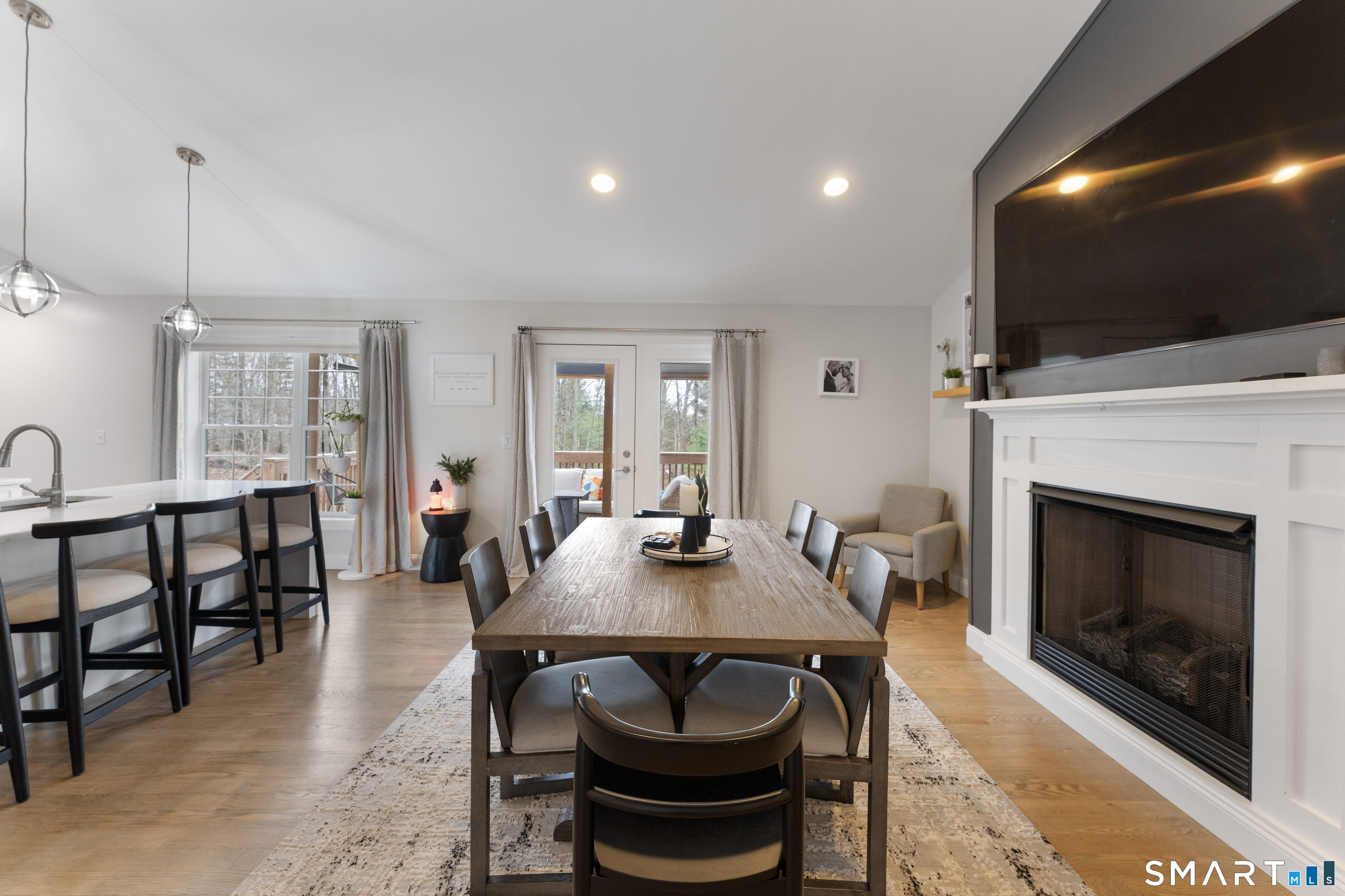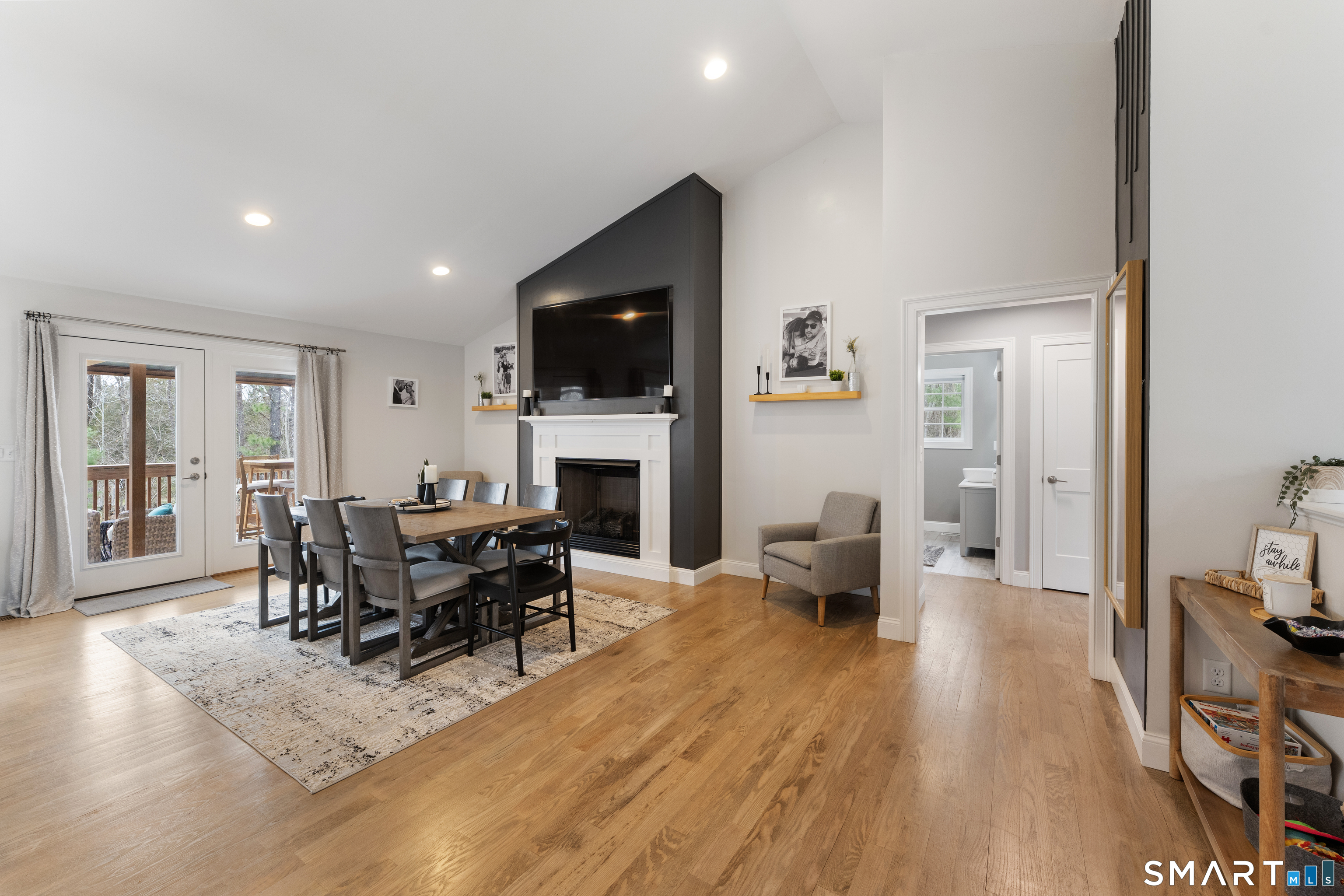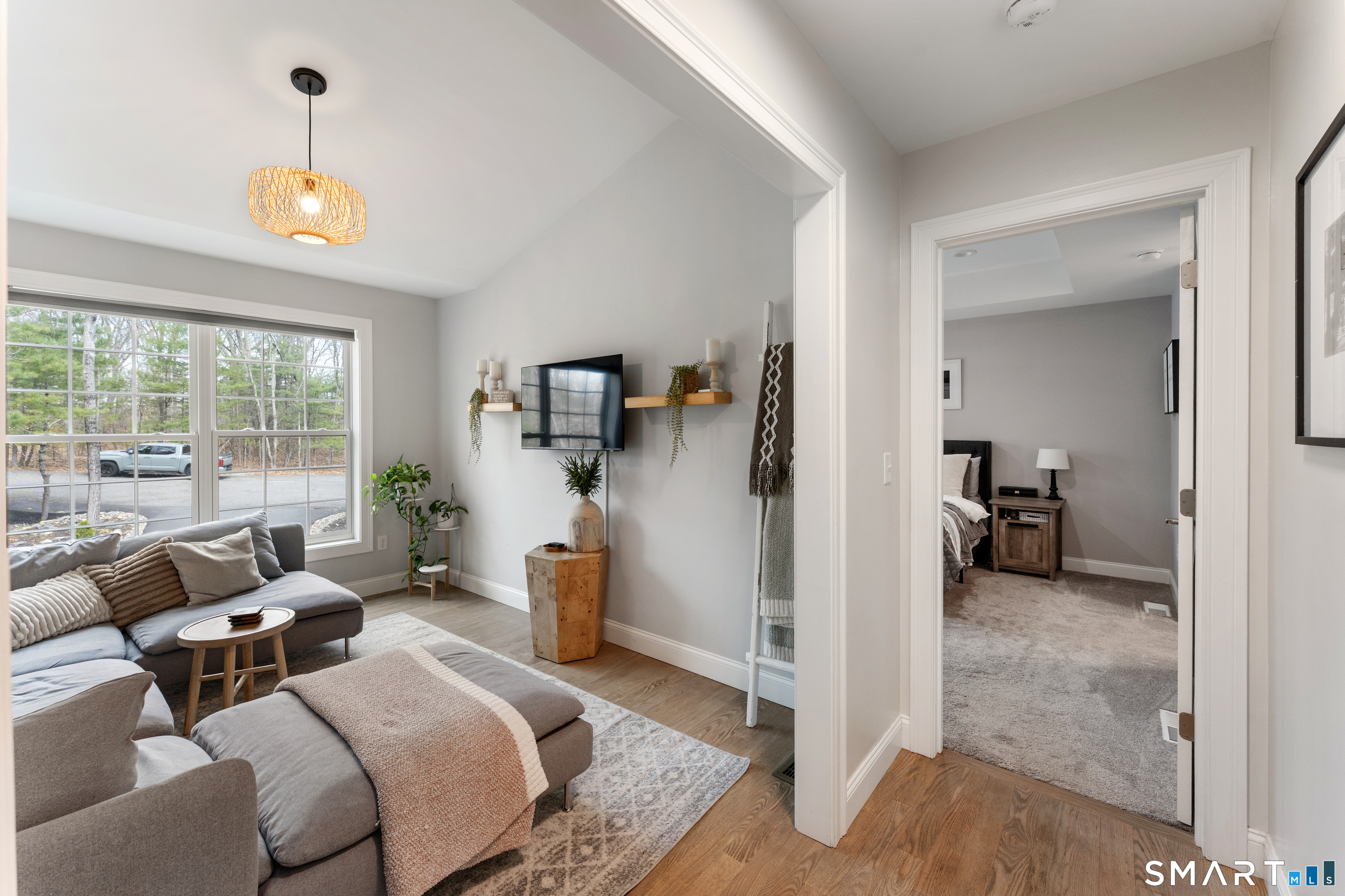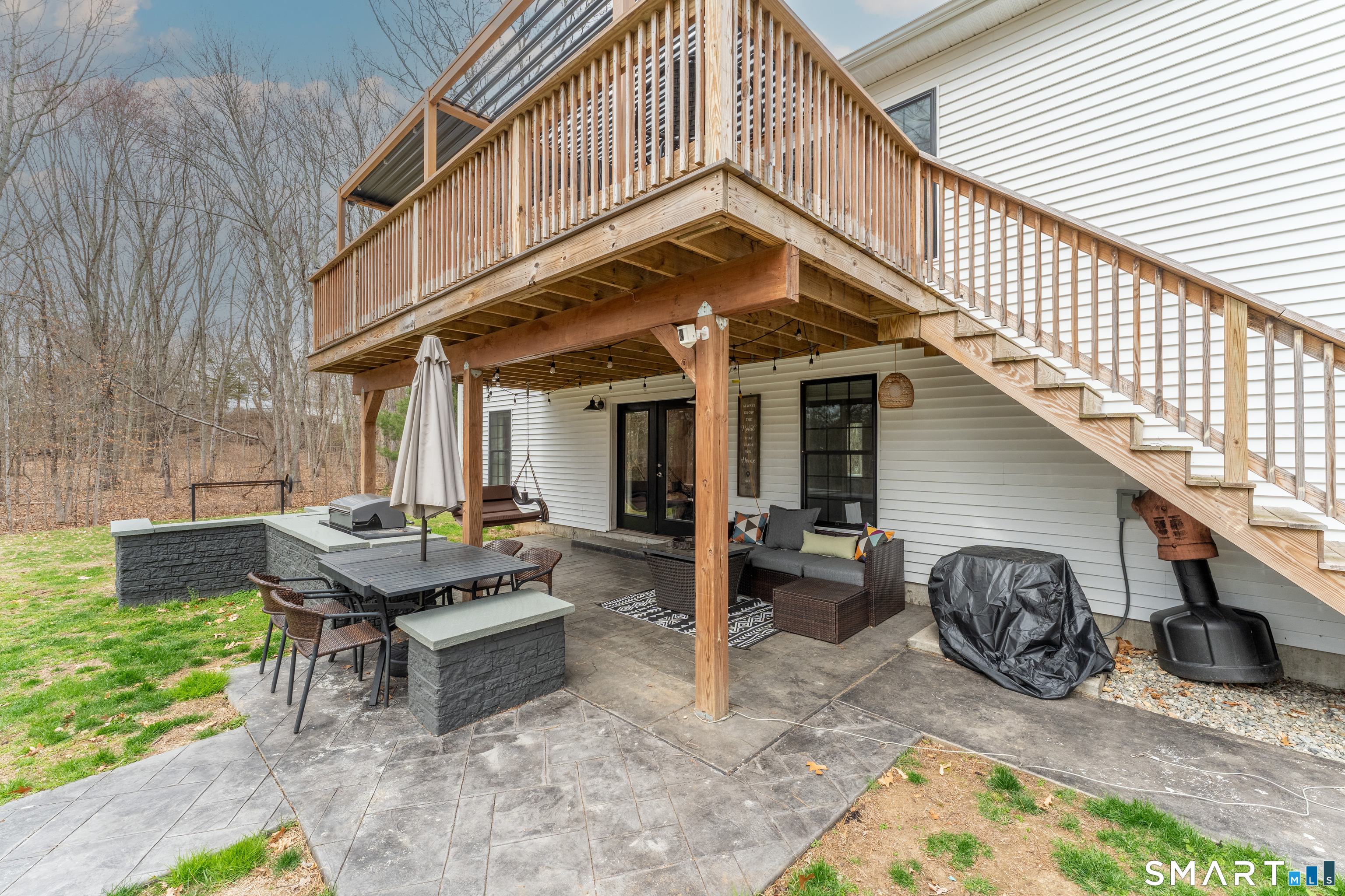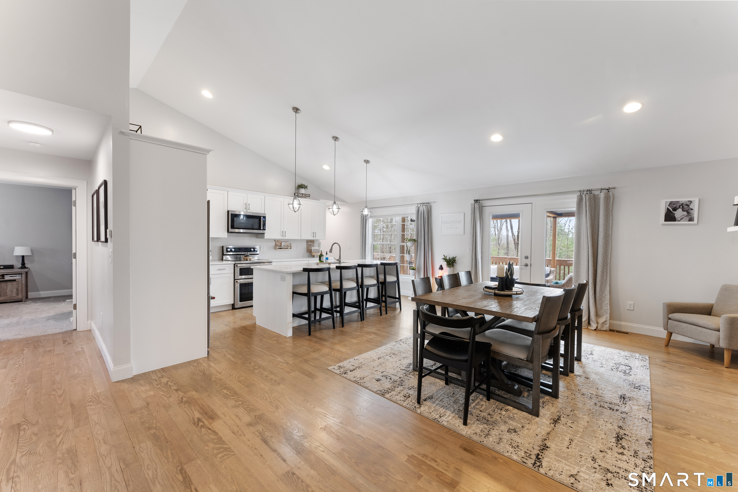 NESTLED back on a long PRIVATE driveway sits a PRISTINE 2021 CUSTOM built home on 3.1 ACRES! 2025 NEW PAVED driveway leads to 22 x 33 OVERSIZED 2 car garage with storage area. Spend your SUMMER/FALL days entertaining on the 11 x 23 DECK with NEWER $2600 WOOD LOUVERED PERGOLA (conveying) with adjustable SHADE Roof. LOWER level has NEW STAMPED CONCRETE PATIO that will INCLUDE STONE GRILL and FIRE PIT. GORGEOUS kitchen w/ WHITE SHAKER cabinets, STAINLESS appliances, QUARTZ counters and HUGE ISLAND, VAULTED CEILING open TO GAS FIREPLACE w/ TV above that you could use as a living room or dining room with HARDWOOD floors. Laundry room off of kitchen for convenience. FORMAL dining room and LARGE PRIMARY bedroom on one side with his/her closets and DOUBLE vanity w/ CUSTOM TILED SHOWER w/ DUAL shower heads. OPPOSITE side has 2 SPACIOUS bedrooms and a full bathroom. HARDWOOD STAIRS lead to ENORMOUS LOWER-level family room, a full bathroom and an extra room w/ barn door closet. CUSTOM black windows and garage doors forced hot air/central air (propane heat). SHED CONVEYS and there is a 10 x10 concrete pad for another shed.CLOSE to 395 and Casino for easy commute.