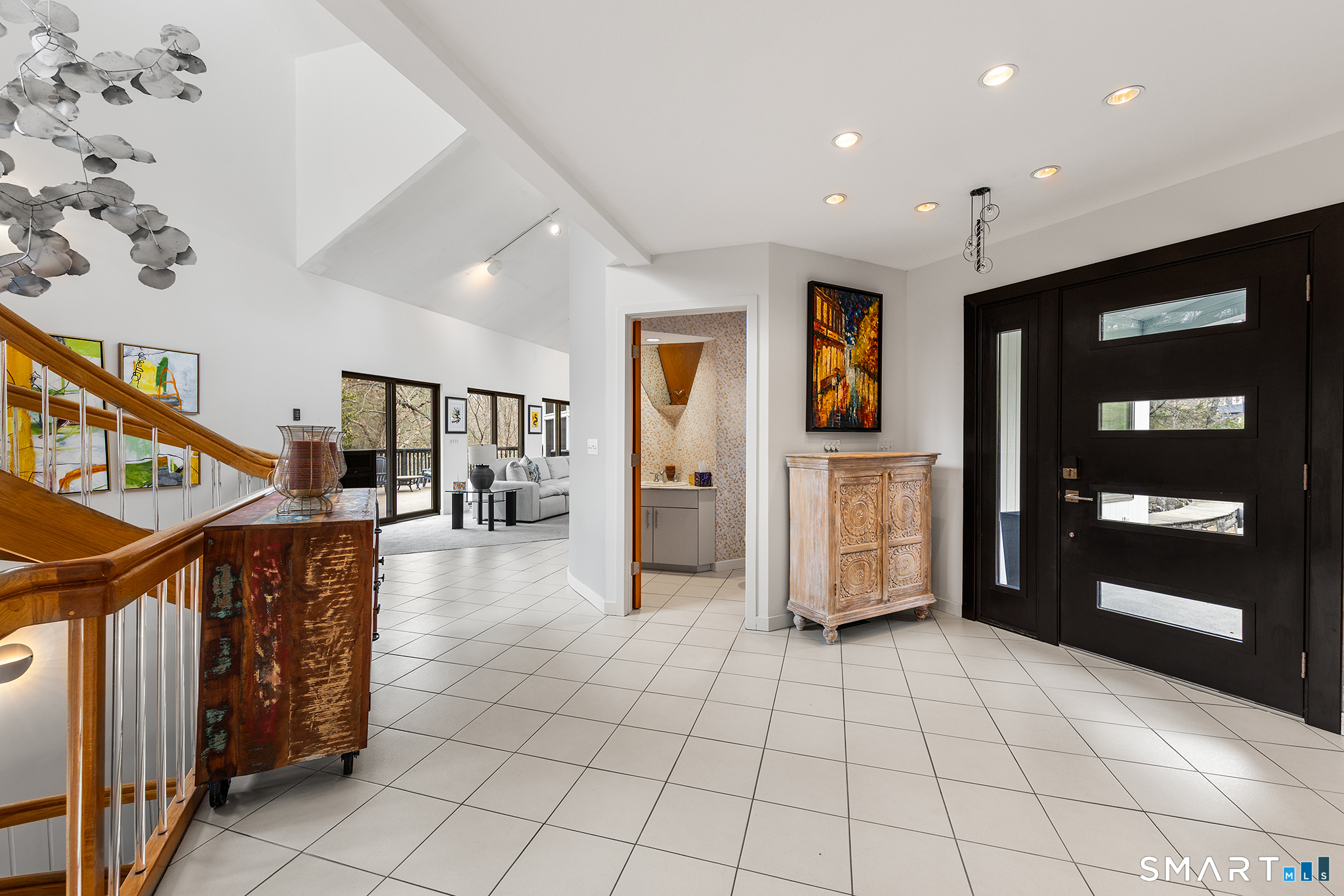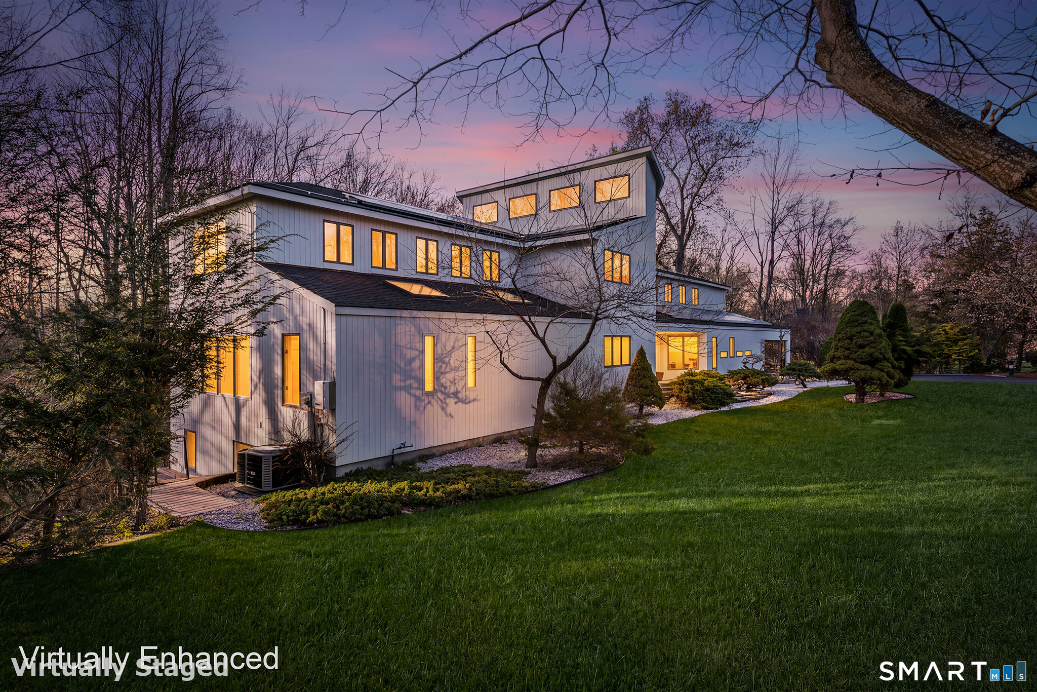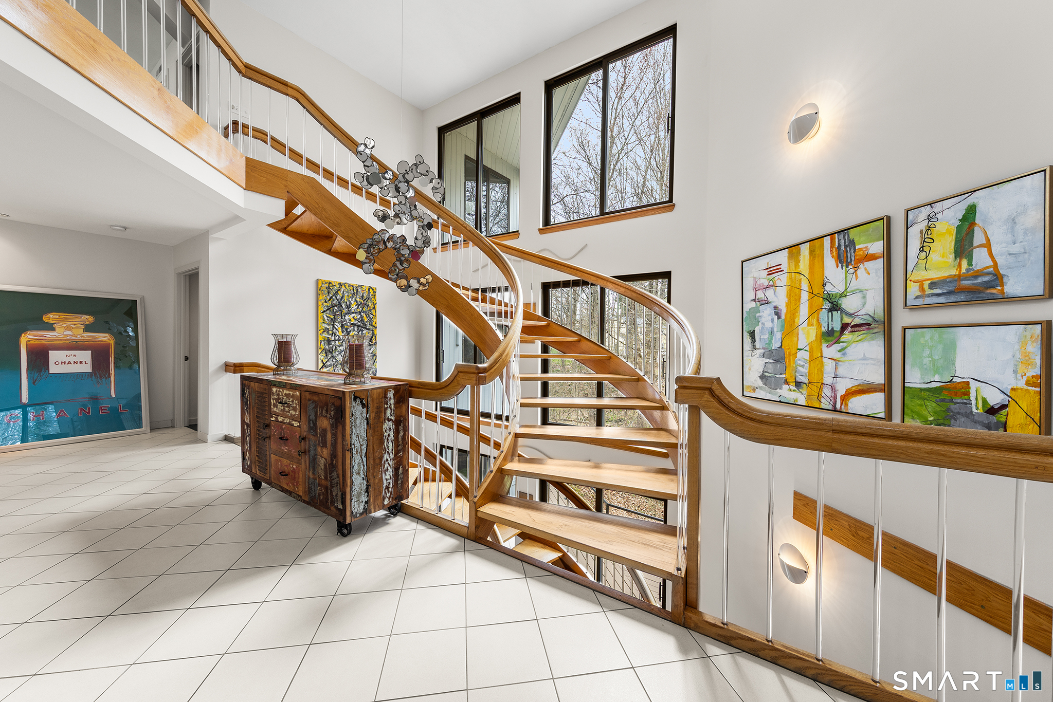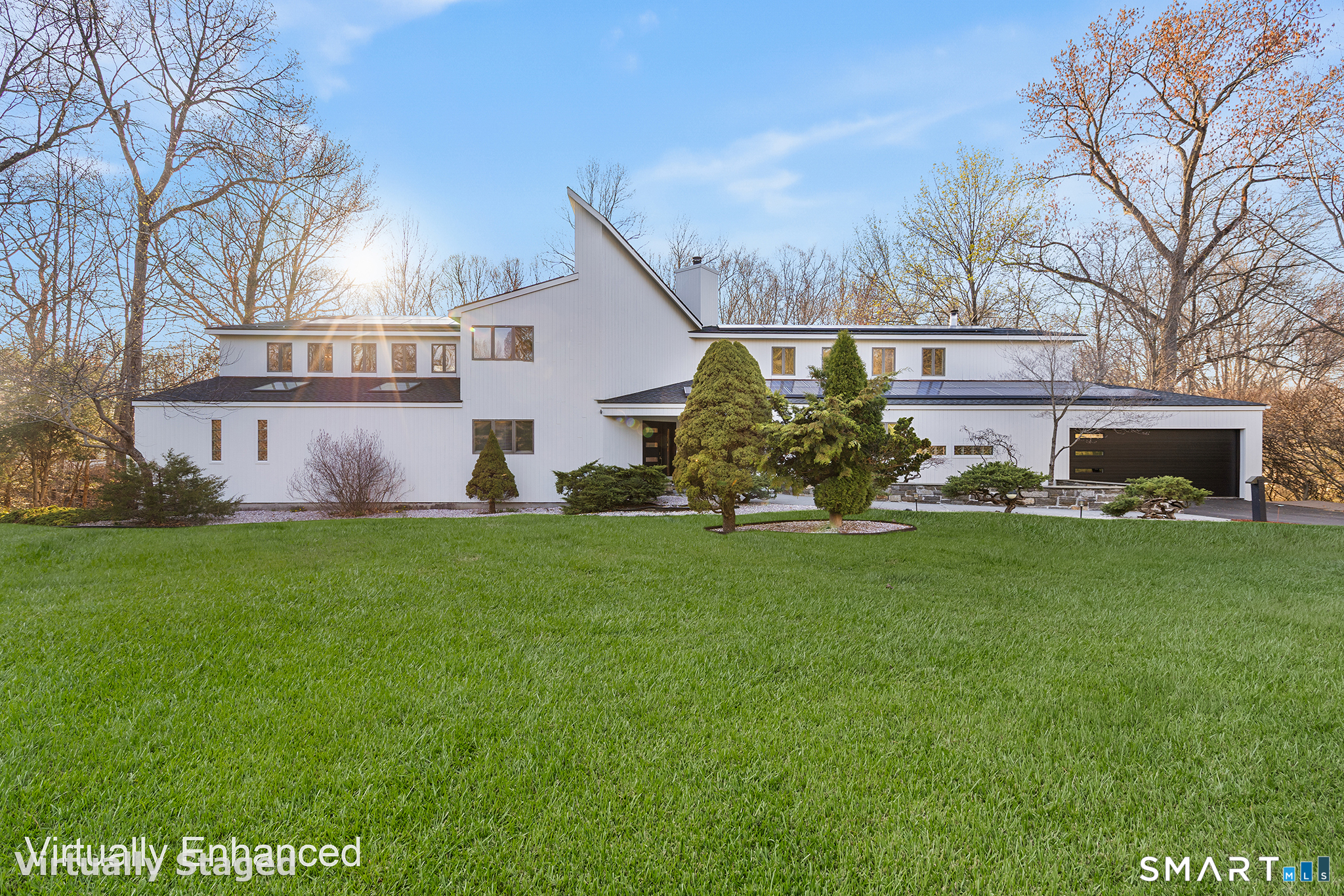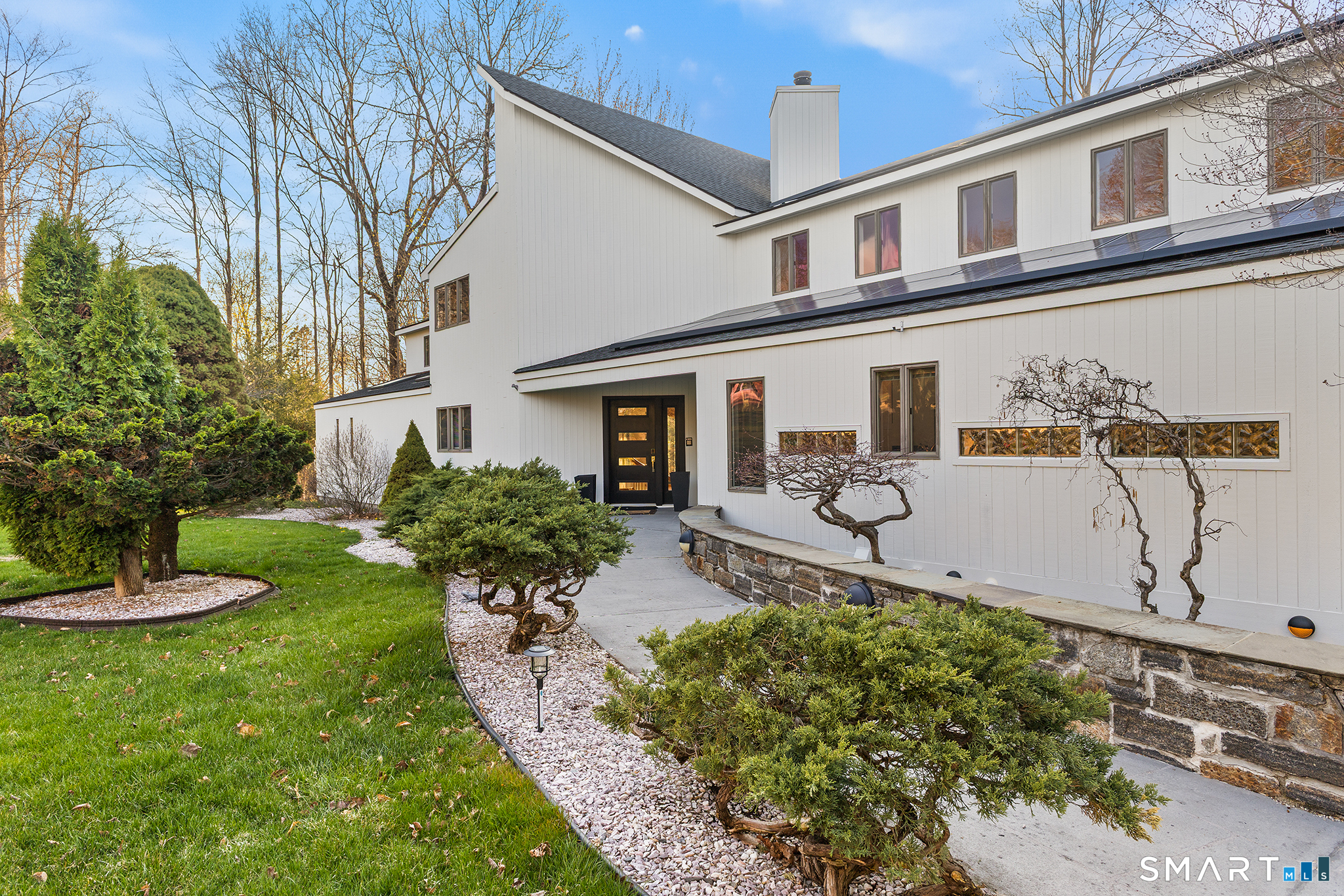 The spectacular awaits in Cheshire - welcome to 25 Surrey Drive! This one-of-a-kind bespoke architectural masterpiece perfectly blends cosmopolitan design with a tranquil brook-side setting, creating a truly livable work of art. Inside, the dramatic, sculptural staircase immediately commands your attention, spanning 3 levels of striking proportions & walls of glass. The main level features soaring ceilings & a grand open concept layout tailormade for hosting. The chic kitchen anchors the space with a large granite island, double oven, & tremendous storage including a double refrigerator set-up & beverage cooler. Seamless indoor outdoor flow with multiple sliders from the living/dining area to a massive entertaining deck & stunning vaulted ceiling screened sun room for quiet relaxation. Single level living is a breeze with a capacious first floor primary suite that is a continent unto itself. The palatial full marble bath features a soaking tub, XL shower, dual vanities, & a separate laundry room for convenience. The DREAM skylit walk-in closet challenges even the most dedicated fashionistas to fill its seemingly endless racks & soft-close drawers. A sunny office or dressing room rounds out the suite. Upstairs, there's a 2nd full suite w cedar WIC & double vanity ensuite. The sensational 50' loft is the ultimate gallery, library, studio or lounge space - a rare vibe-setting find!
