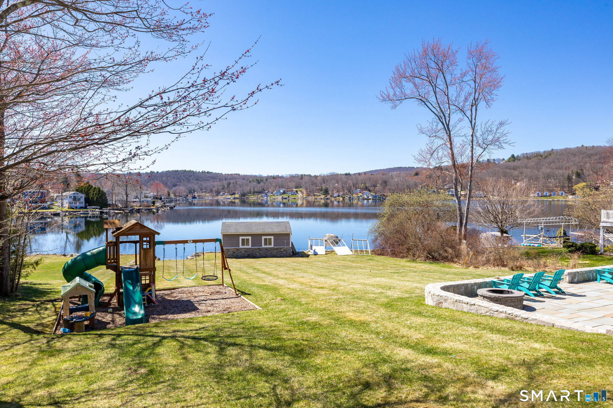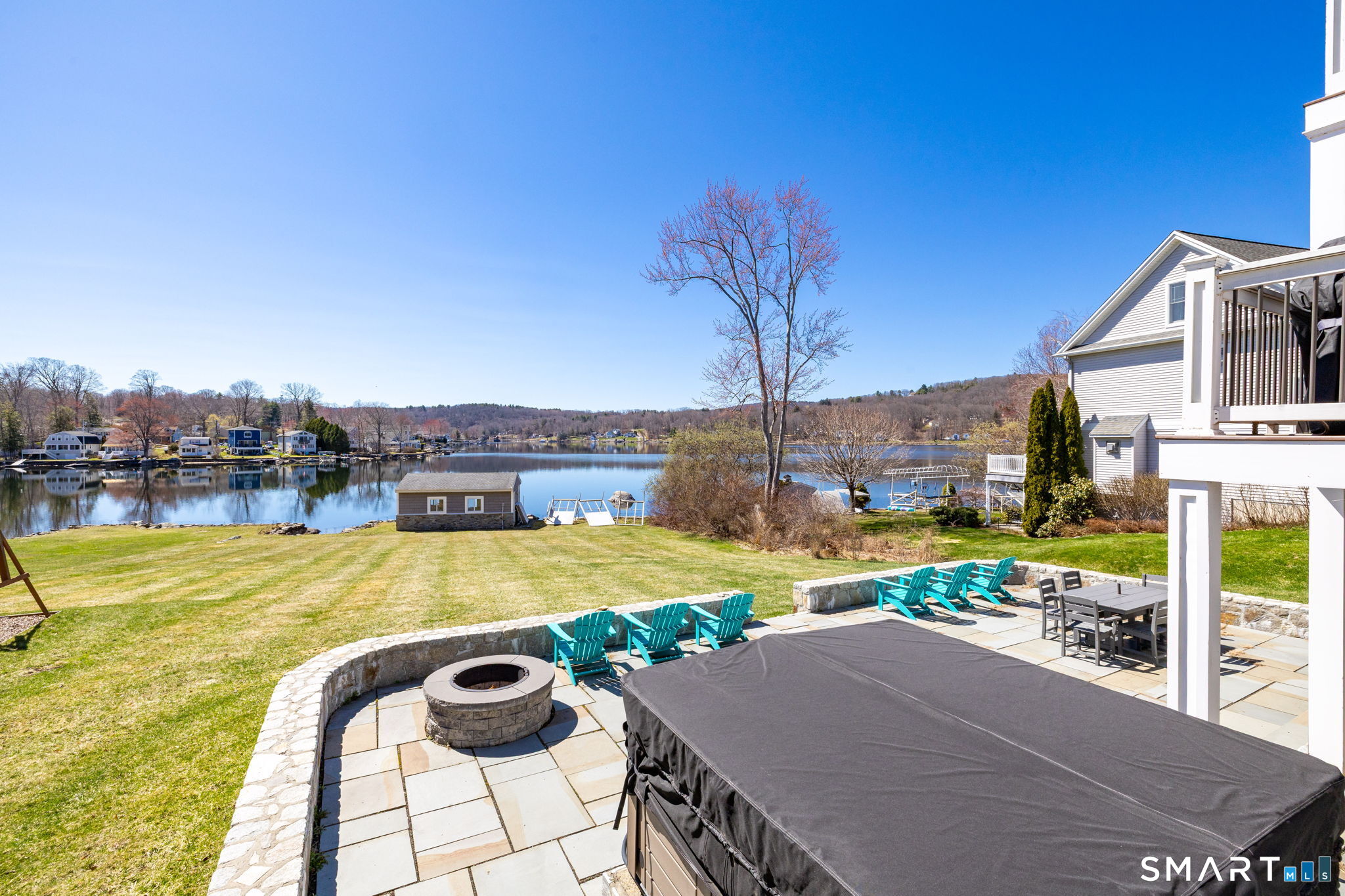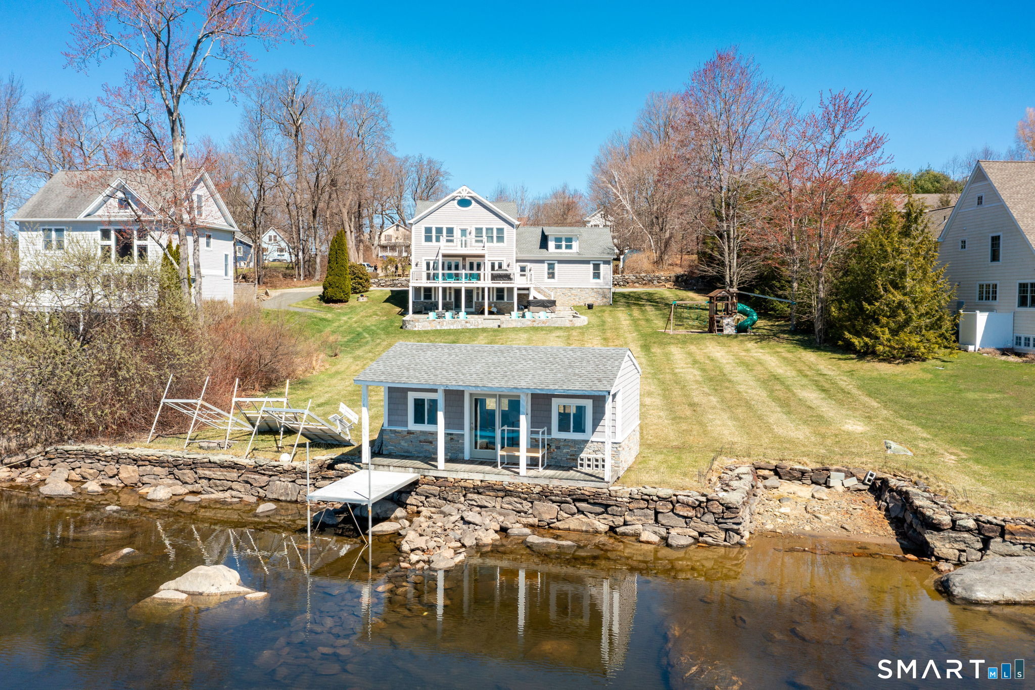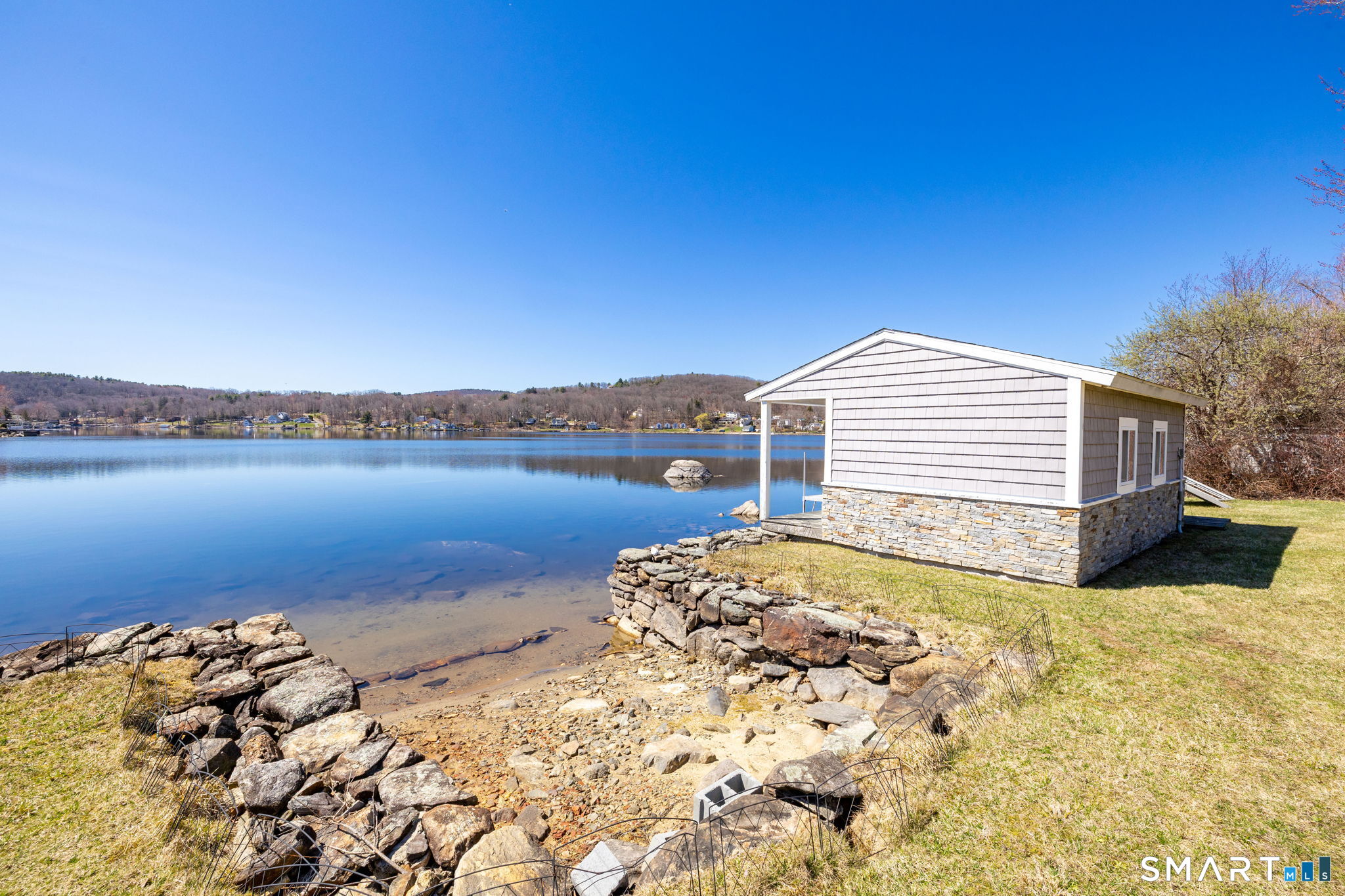 A true vacation retreat on the shore of Highland Lake! Rare offering in exceptional condition ready for summer enjoyment. Central AC/heat with an open floorplan offering spacious family and entertaining opportunity. Folding glass doors to large lakefront deck with panoramic views of the water. Original house completely renovated inside and out in 2016, with recent stone patio and fire pit added and lakefront hot tub. Boathouse with full size refrigerator, granite countertop and ample storage at the shore front as well as sandy inlet for swimming and launching. Finished lower level for guests with bath walks out to the lake. Attic level with additional finished private office / rec room. Tucked off a private drive with expansive paved parking / boat storage area, this is the epitome of lake house living.
