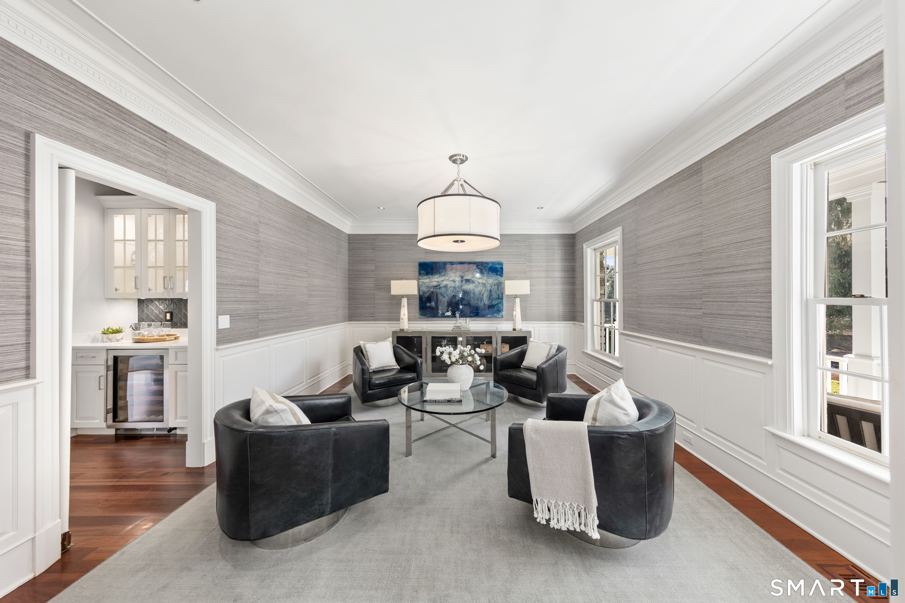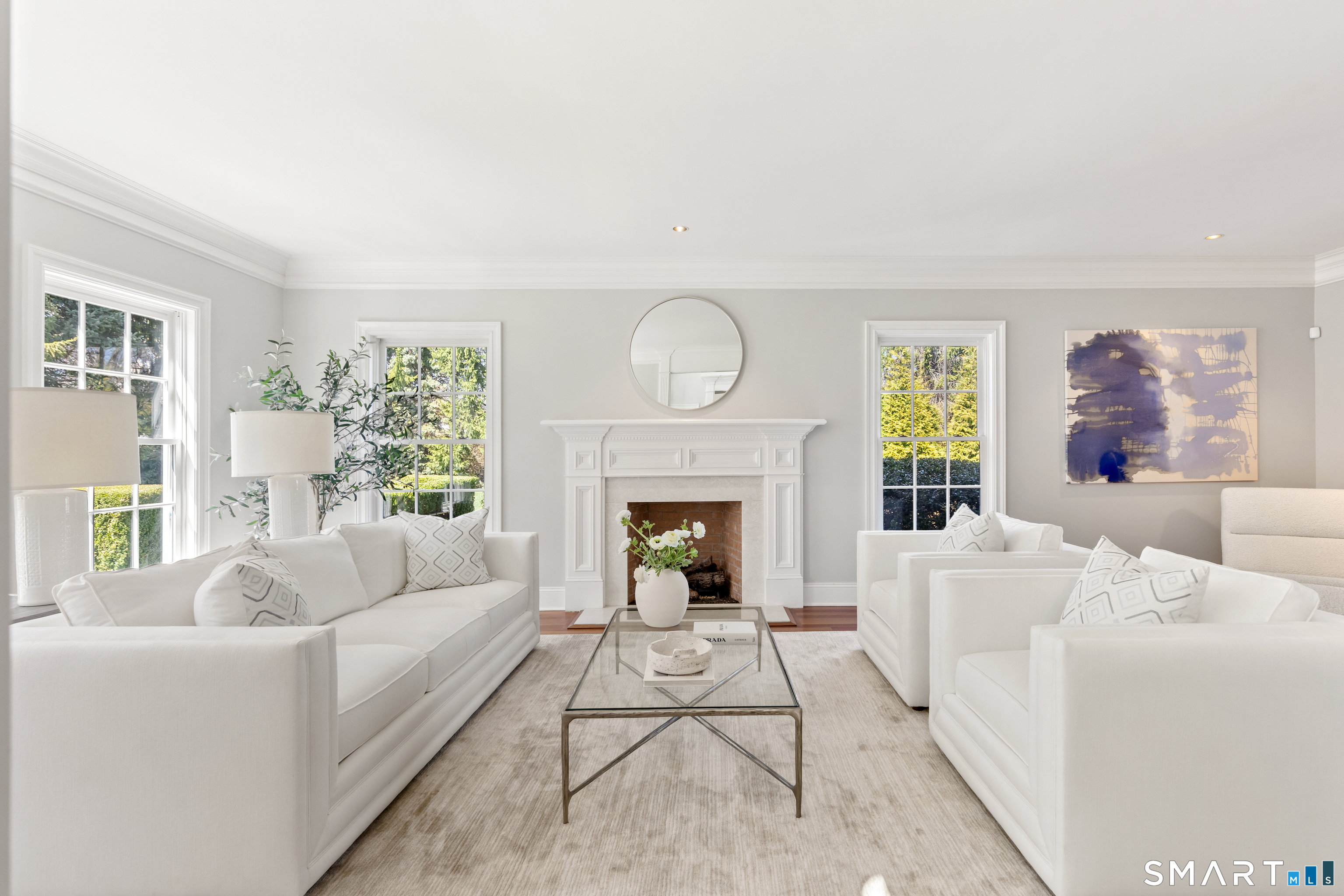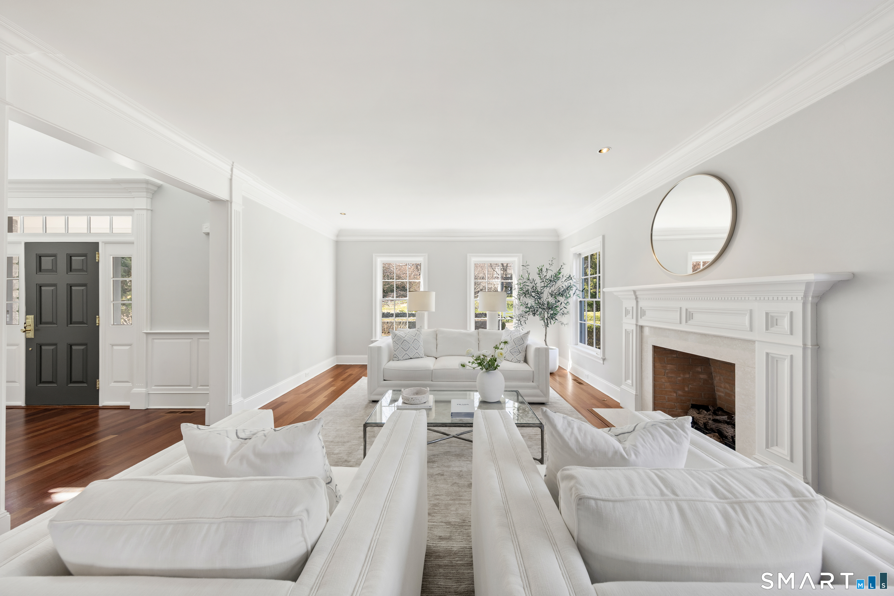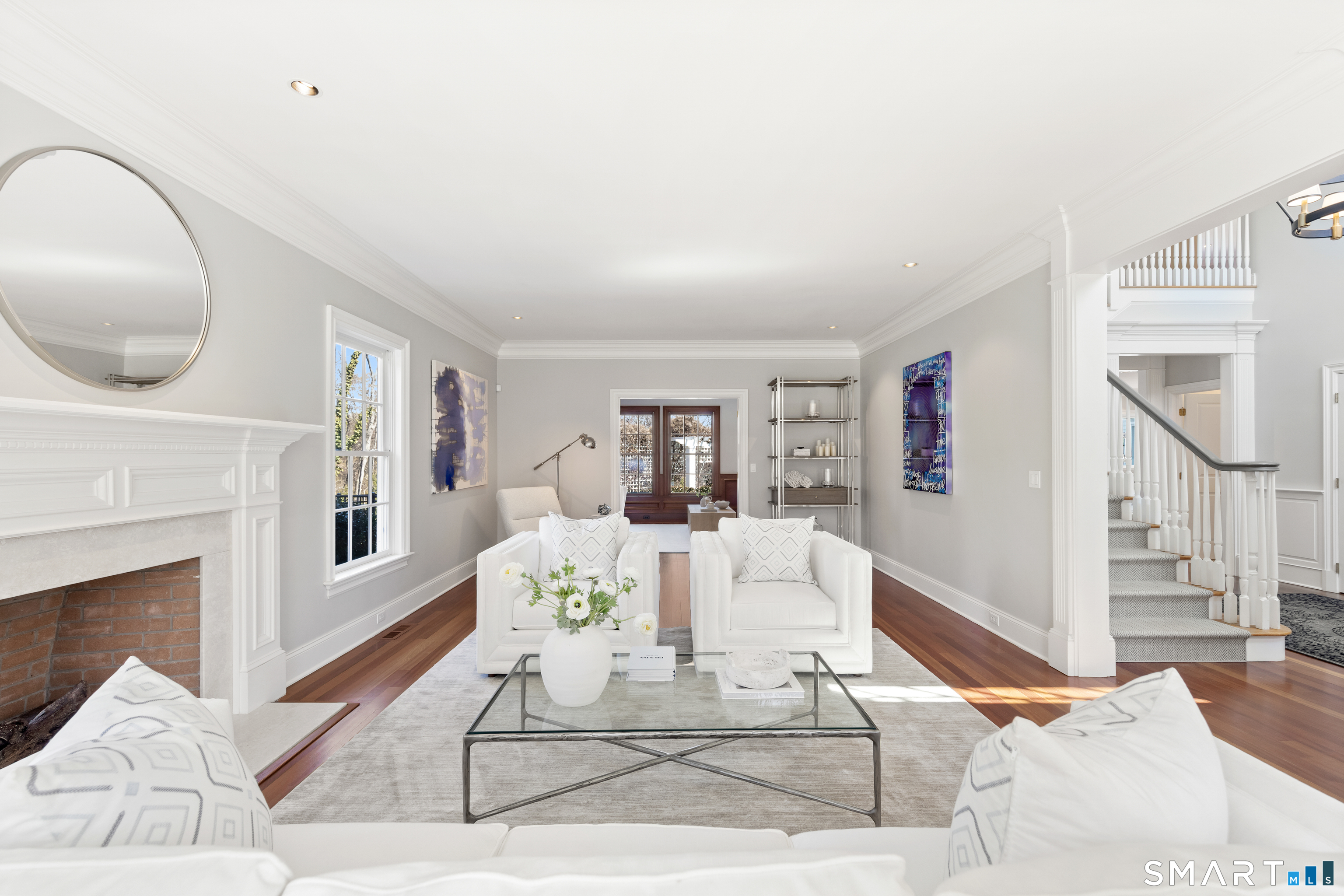 Beautifully sited in prestigious Greens Farms this timeless 5 BR, 6BA clapboard-and-stone Colonial offers stunning architecture & resort like privacy just moments from train, town & beaches. A gracious front porch & exquisite landscaping create an immediate sense of presence; classic, composed & quietly impressive. Inside, a soaring entry filled w/natural light introduces interiors defined by beautiful scale, 9-ft ceilings & gracious flow. Formal living room w/gas fireplace & dining room w/wet bar lend elegance to entertaining while a handsome office/den w/custom built-ins offers warmth & intimacy. The kitchen is refined & inviting w/quartz countertops, Sub-Zero appliances, walk-in pantry & breakfast/dining area opening to bluestone terrace. The expansive family room anchored by a substantial stone fireplace creates a natural gathering place & French doors open seamlessly to the outdoor living space. The main level also includes a secondary entry w/back staircase, laundry room, additional office & 2nd powder room. Upstairs the primary suite is a true retreat w/oversized walk-in closets, dressing area & spa-like marble bath. 4 additional generously proportioned bedrooms including two en-suite offer flexibility for family & guests. Finished 3rd fl ideal for playroom, gym, media room, 6th BR. Outside sprawling grounds, expansive bluestone terraces, exceptional masonry & stunning saltwater gunite pool & spa create a private oasis w/serene resort-like feel. Impeccably presented.