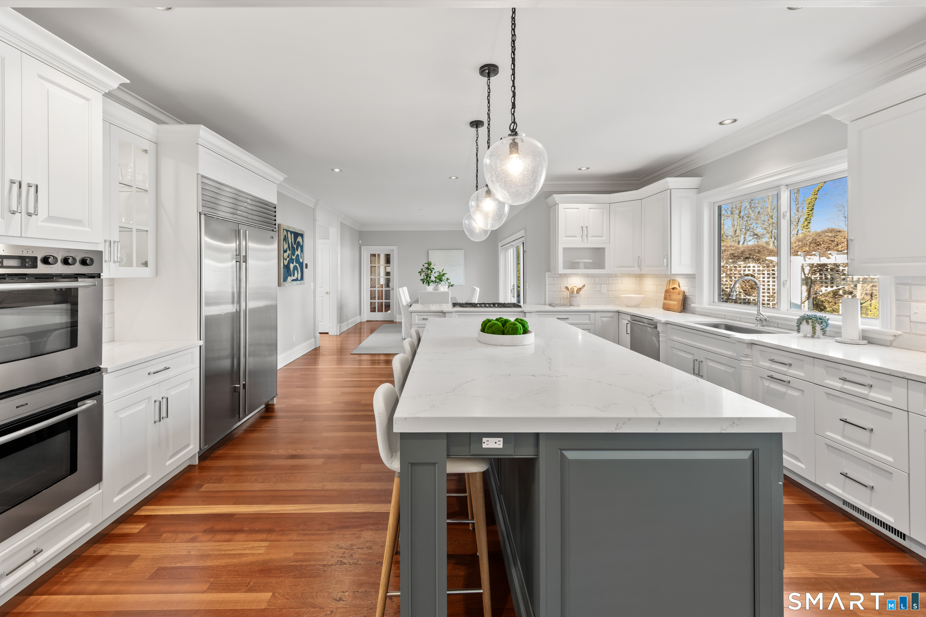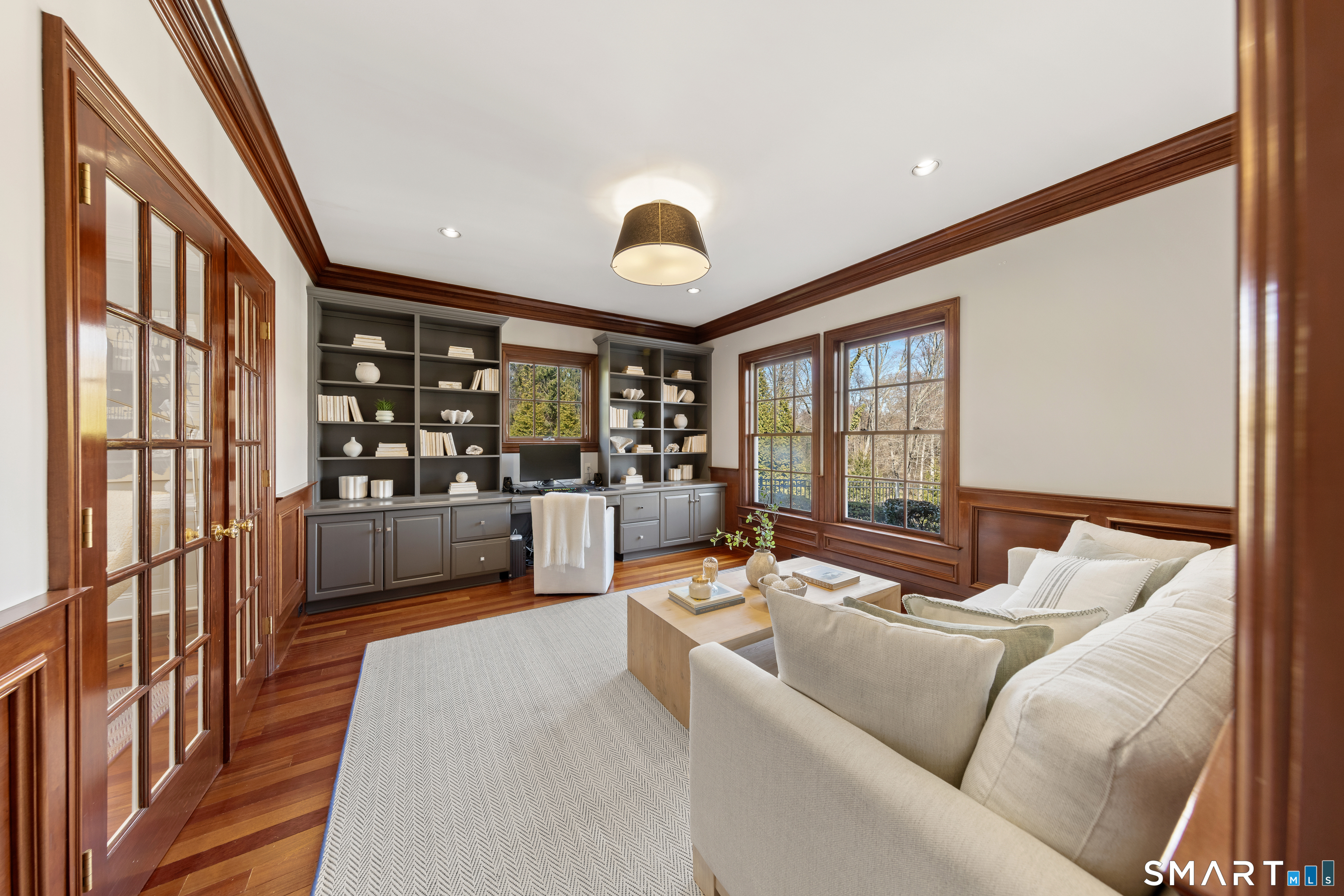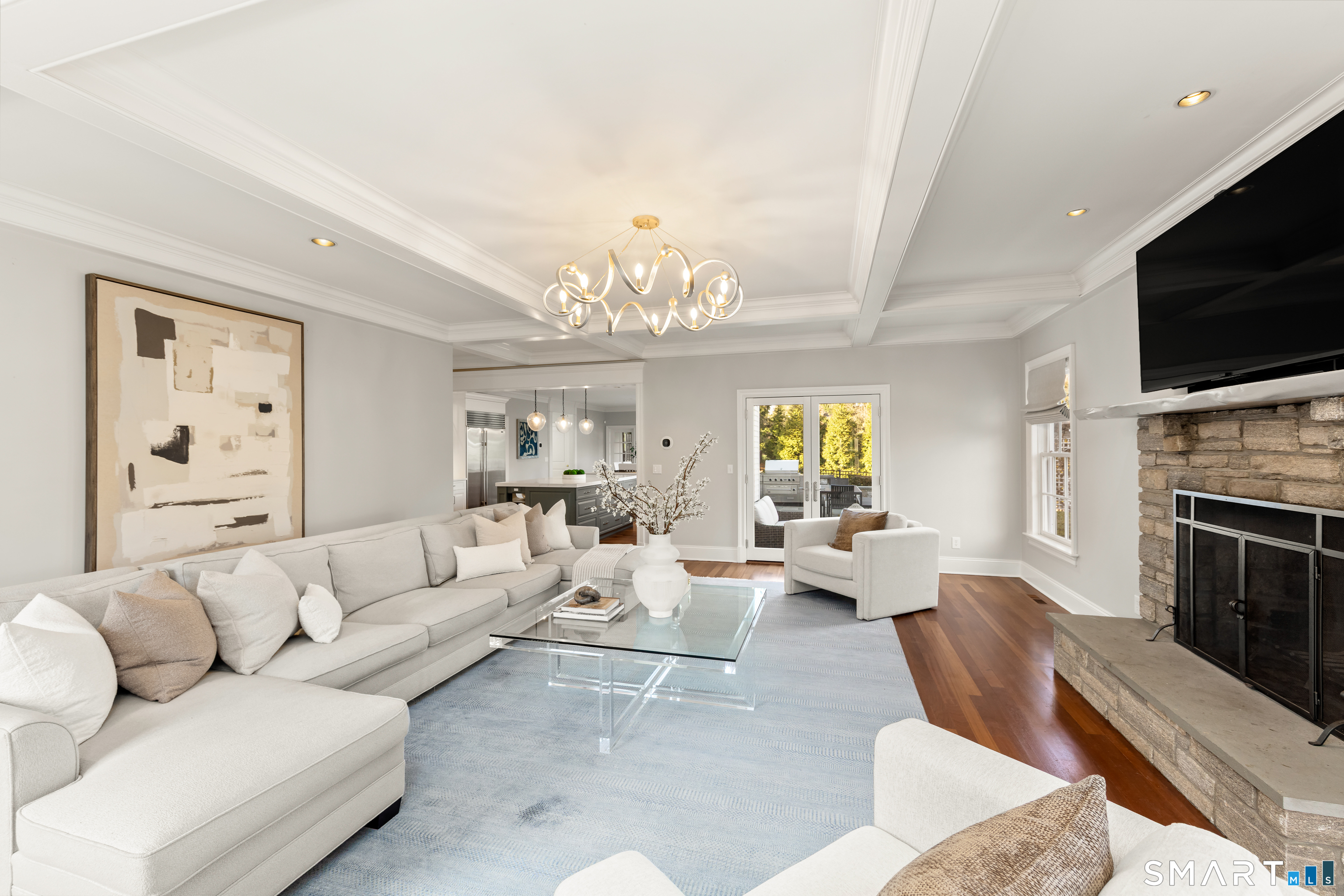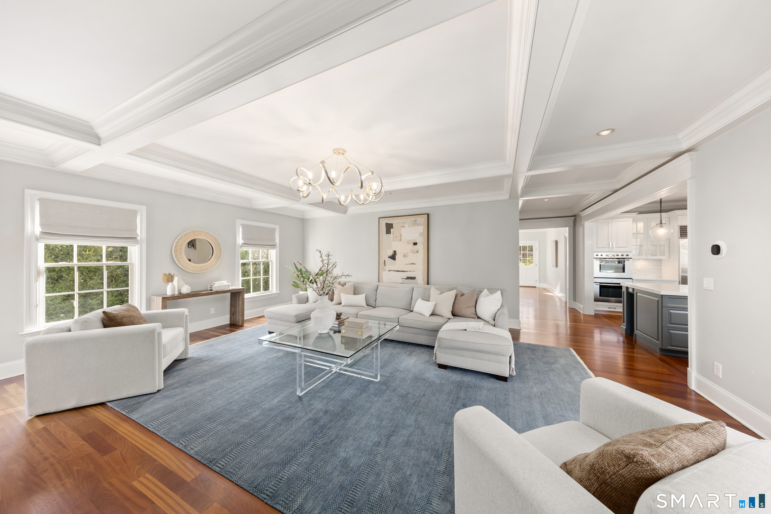 Beautifully sited in prestigious Greens Farms this timeless 5 BR, 6BA clapboard-and-stone Colonial offers stunning architecture & resort like privacy just moments from train, town & beaches. A gracious front porch & exquisite landscaping create an immediate sense of presence; classic, composed & quietly impressive. Inside, a soaring entry filled w/natural light introduces interiors defined by beautiful scale, 9-ft ceilings & gracious flow. Formal living room w/gas fireplace & dining room w/wet bar lend elegance to entertaining while a handsome office/den w/custom built-ins offers warmth & intimacy. The kitchen is refined & inviting w/quartz countertops, Sub-Zero appliances, walk-in pantry & breakfast/dining area opening to bluestone terrace. The expansive family room anchored by a substantial stone fireplace creates a natural gathering place & French doors open seamlessly to the outdoor living space. The main level also includes a secondary entry w/back staircase, laundry room, additional office & 2nd powder room. Upstairs the primary suite is a true retreat w/oversized walk-in closets, dressing area & spa-like marble bath. 4 additional generously proportioned bedrooms including two en-suite offer flexibility for family & guests. Finished 3rd fl ideal for playroom, gym, media room, 6th BR. Outside sprawling grounds, expansive bluestone terraces, exceptional masonry & stunning saltwater gunite pool & spa create a private oasis w/serene resort-like feel. Impeccably presented.