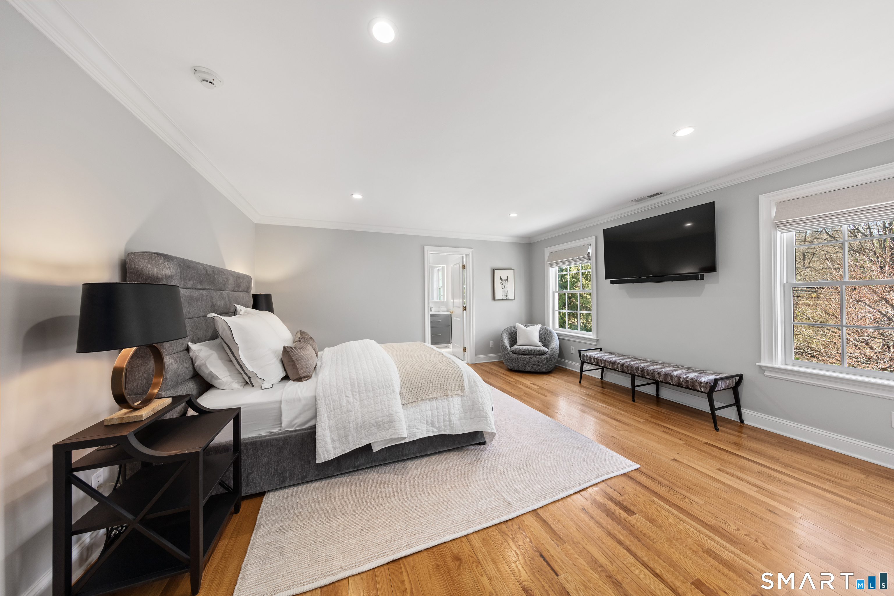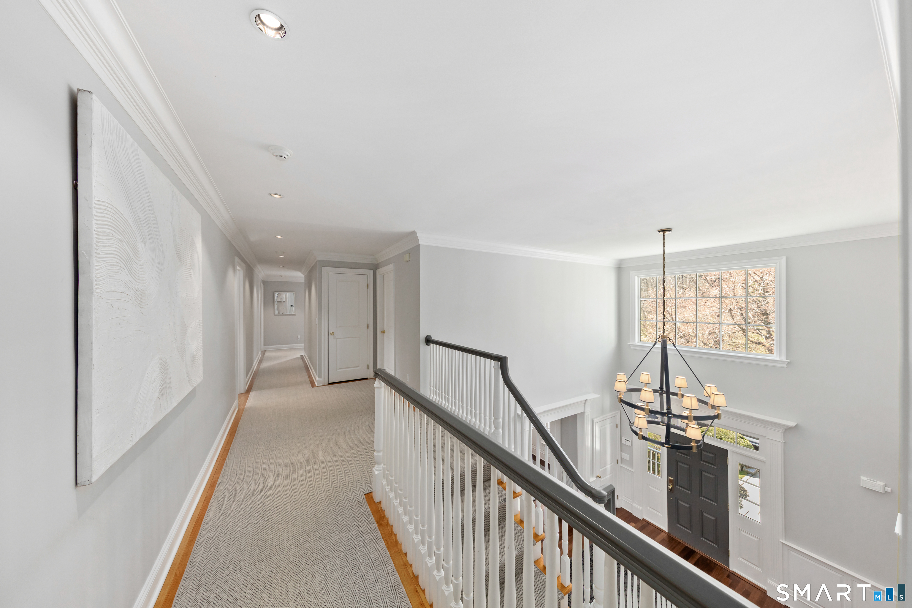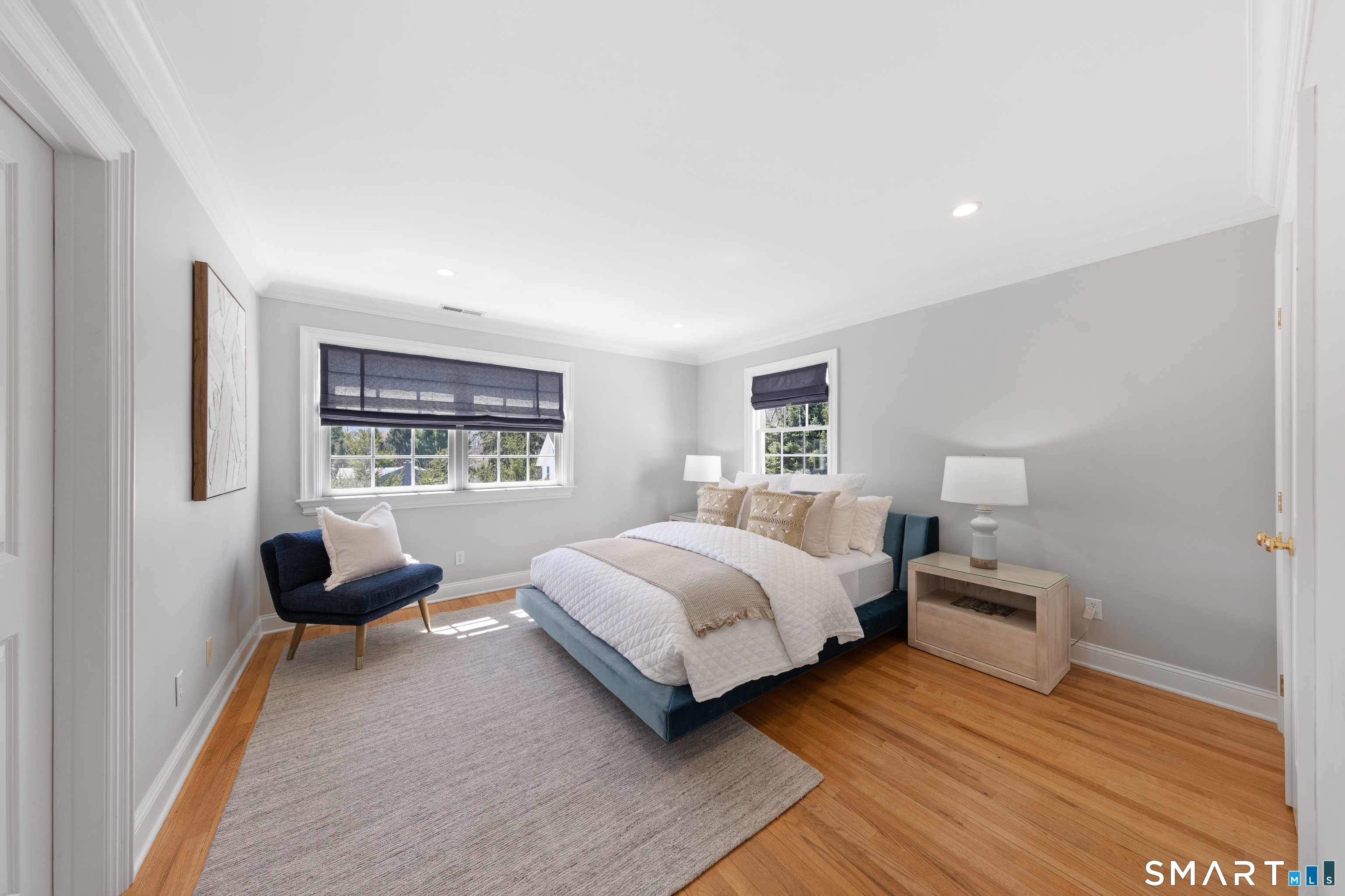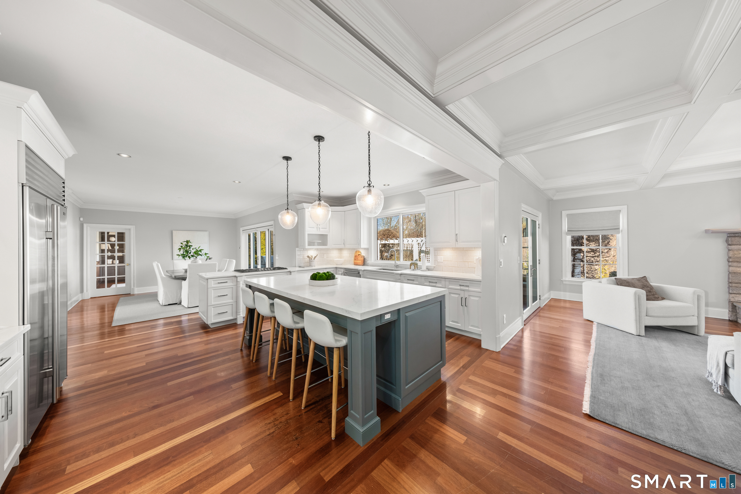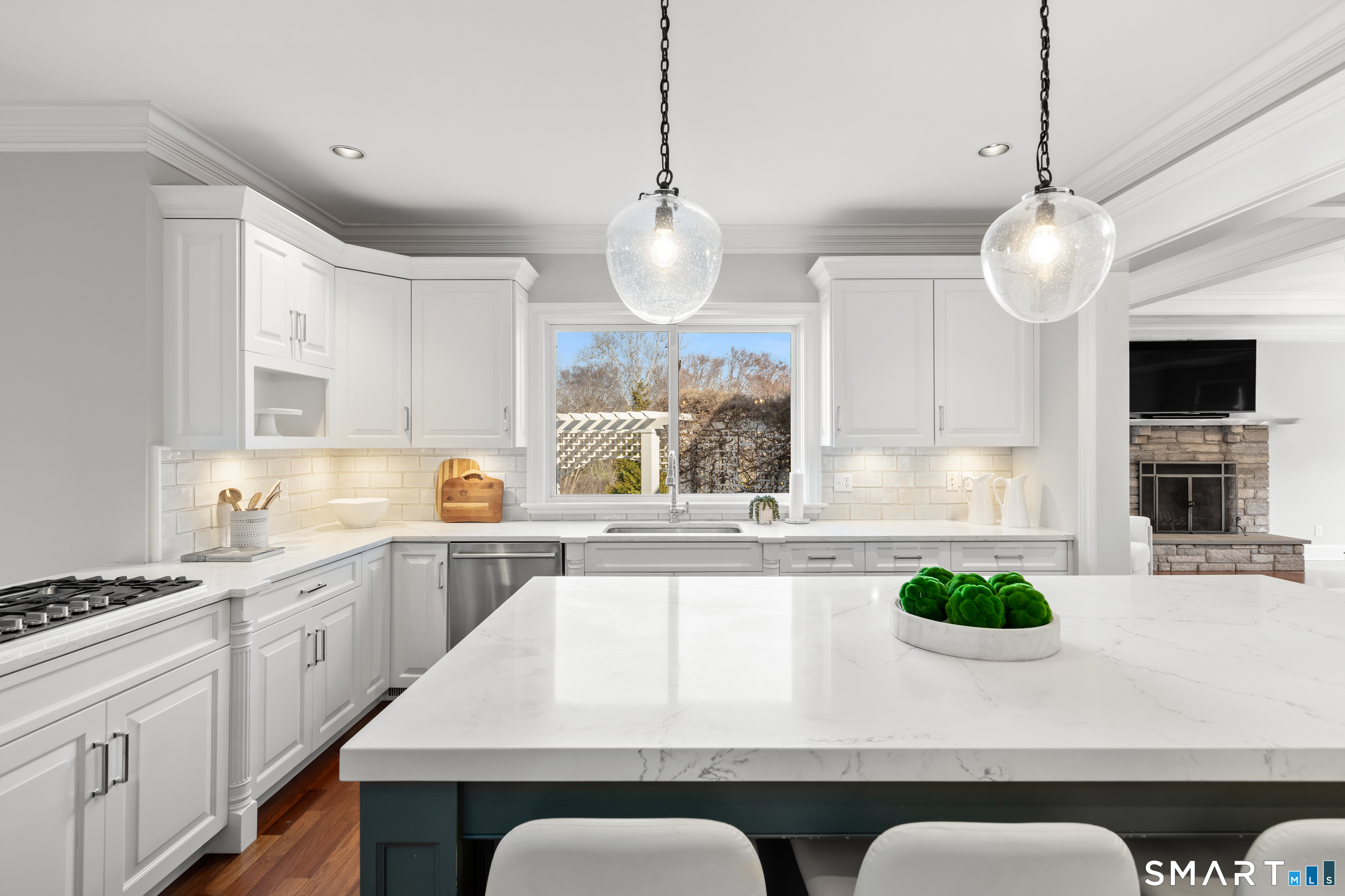 Beautifully sited in prestigious Greens Farms this timeless 5 BR, 6BA clapboard-and-stone Colonial offers stunning architecture & resort like privacy just moments from train, town & beaches. A gracious front porch & exquisite landscaping create an immediate sense of presence; classic, composed & quietly impressive. Inside, a soaring entry filled w/natural light introduces interiors defined by beautiful scale, 9-ft ceilings & gracious flow. Formal living room w/gas fireplace & dining room w/wet bar lend elegance to entertaining while a handsome office/den w/custom built-ins offers warmth & intimacy. The kitchen is refined & inviting w/quartz countertops, Sub-Zero appliances, walk-in pantry & breakfast/dining area opening to bluestone terrace. The expansive family room anchored by a substantial stone fireplace creates a natural gathering place & French doors open seamlessly to the outdoor living space. The main level also includes a secondary entry w/back staircase, laundry room, additional office & 2nd powder room. Upstairs the primary suite is a true retreat w/oversized walk-in closets, dressing area & spa-like marble bath. 4 additional generously proportioned bedrooms including two en-suite offer flexibility for family & guests. Finished 3rd fl ideal for playroom, gym, media room, 6th BR. Outside sprawling grounds, expansive bluestone terraces, exceptional masonry & stunning saltwater gunite pool & spa create a private oasis w/serene resort-like feel. Impeccably presented.