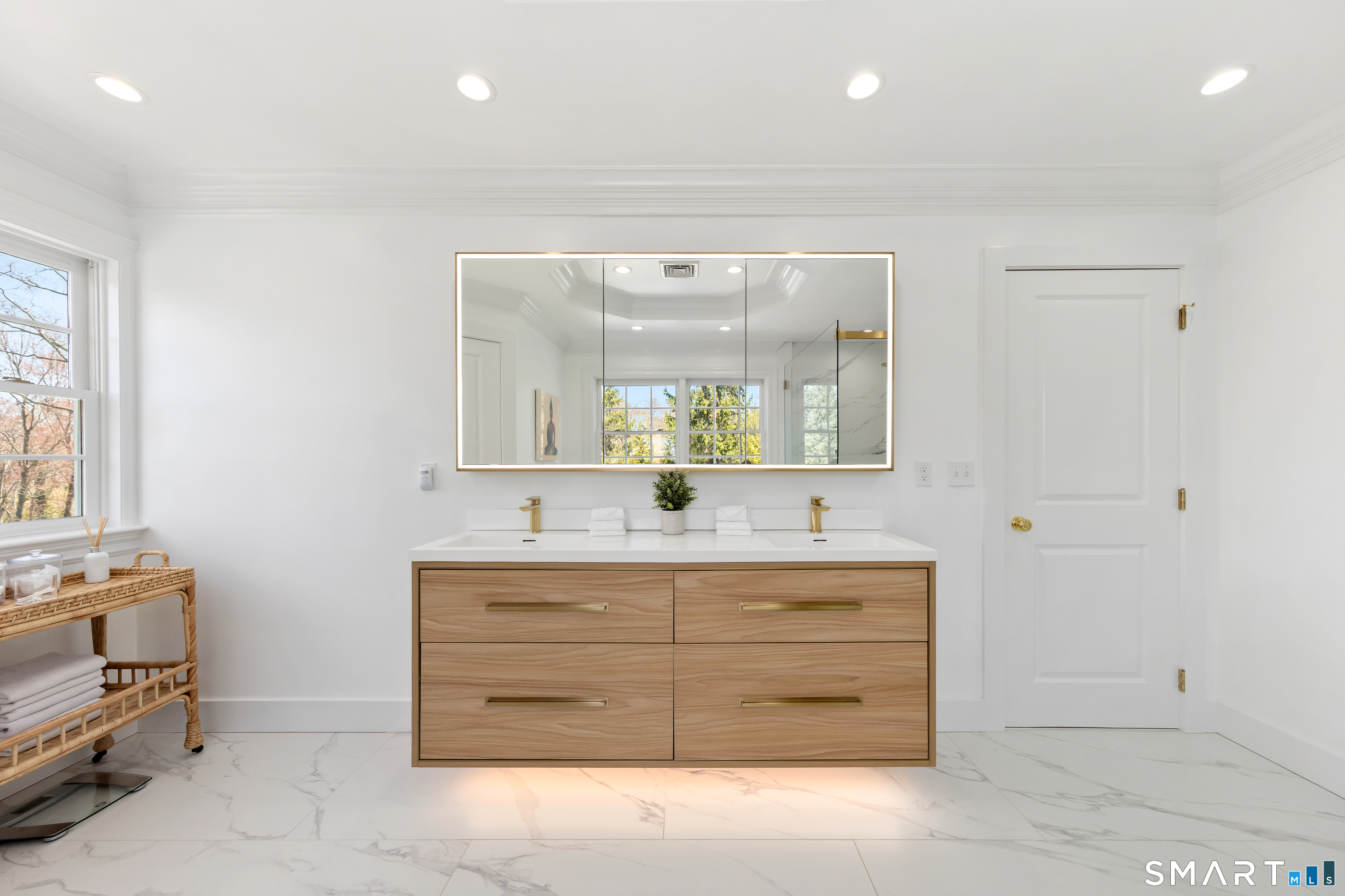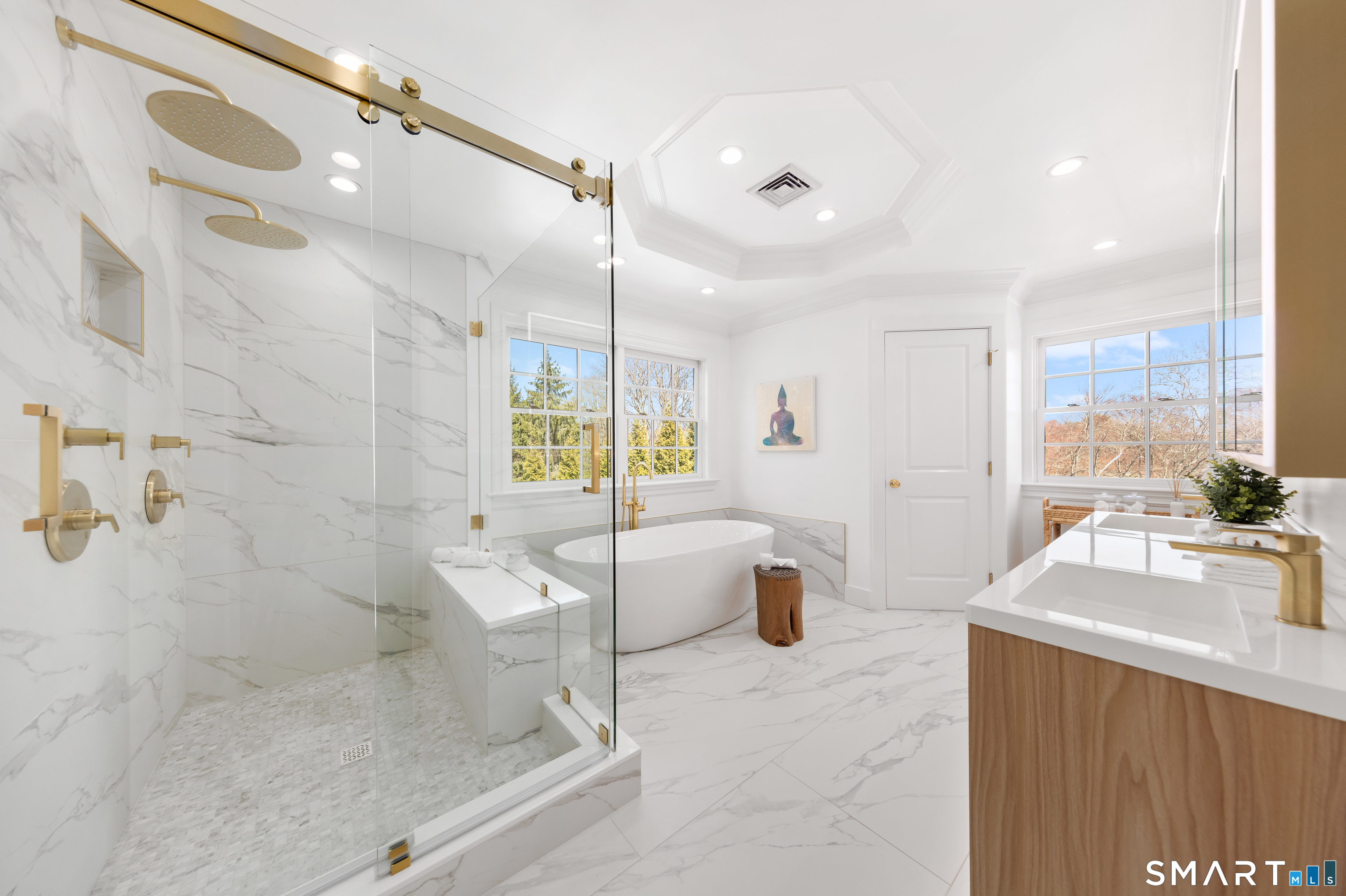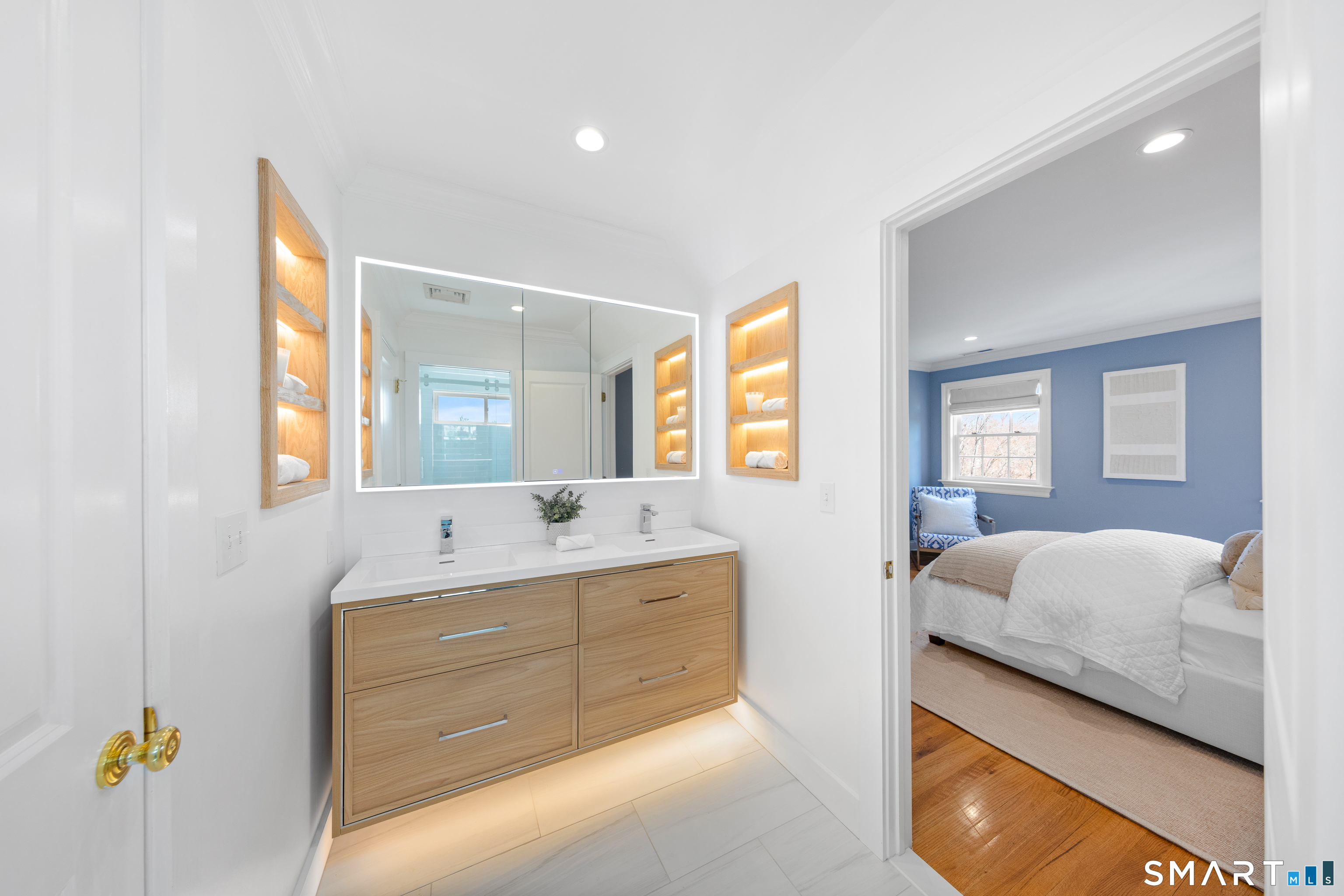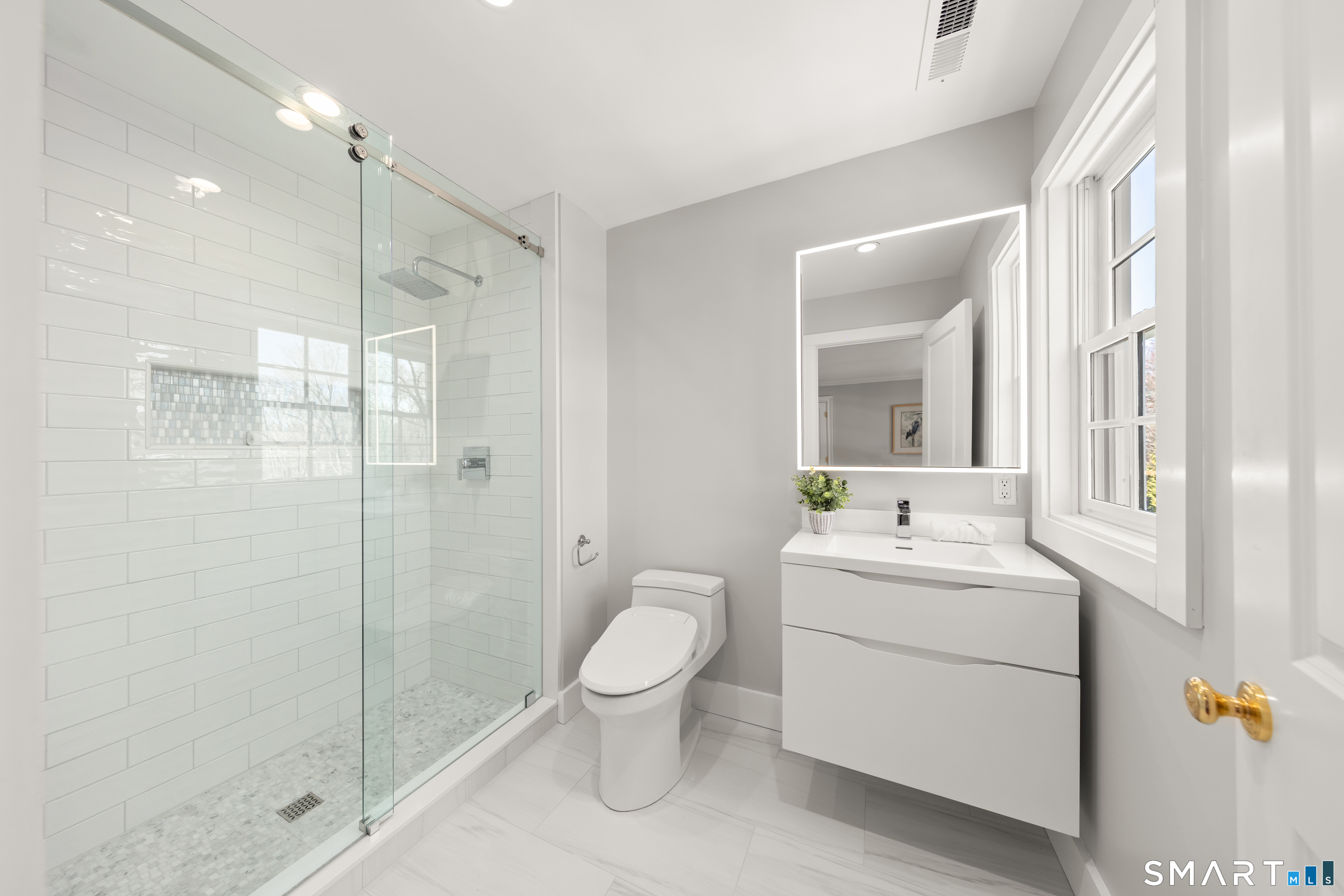 Beautifully sited in prestigious Greens Farms this timeless 5 BR, 6BA clapboard-and-stone Colonial offers stunning architecture & resort like privacy just moments from train, town & beaches. A gracious front porch & exquisite landscaping create an immediate sense of presence; classic, composed & quietly impressive. Inside, a soaring entry filled w/natural light introduces interiors defined by beautiful scale, 9-ft ceilings & gracious flow. Formal living room w/gas fireplace & dining room w/wet bar lend elegance to entertaining while a handsome office/den w/custom built-ins offers warmth & intimacy. The kitchen is refined & inviting w/quartz countertops, Sub-Zero appliances, walk-in pantry & breakfast/dining area opening to bluestone terrace. The expansive family room anchored by a substantial stone fireplace creates a natural gathering place & French doors open seamlessly to the outdoor living space. The main level also includes a secondary entry w/back staircase, laundry room, additional office & 2nd powder room. Upstairs the primary suite is a true retreat w/oversized walk-in closets, dressing area & spa-like marble bath. 4 additional generously proportioned bedrooms including two en-suite offer flexibility for family & guests. Finished 3rd fl ideal for playroom, gym, media room, 6th BR. Outside sprawling grounds, expansive bluestone terraces, exceptional masonry & stunning saltwater gunite pool & spa create a private oasis w/serene resort-like feel. Impeccably presented.