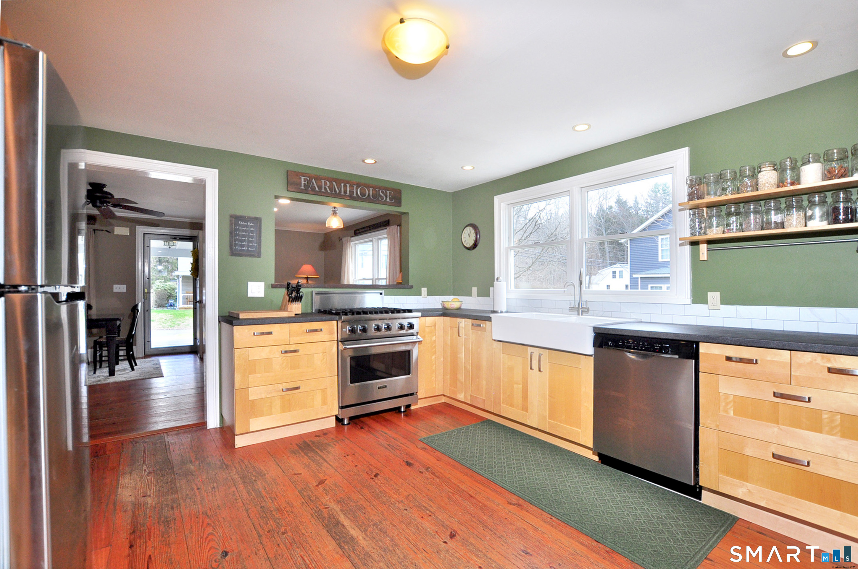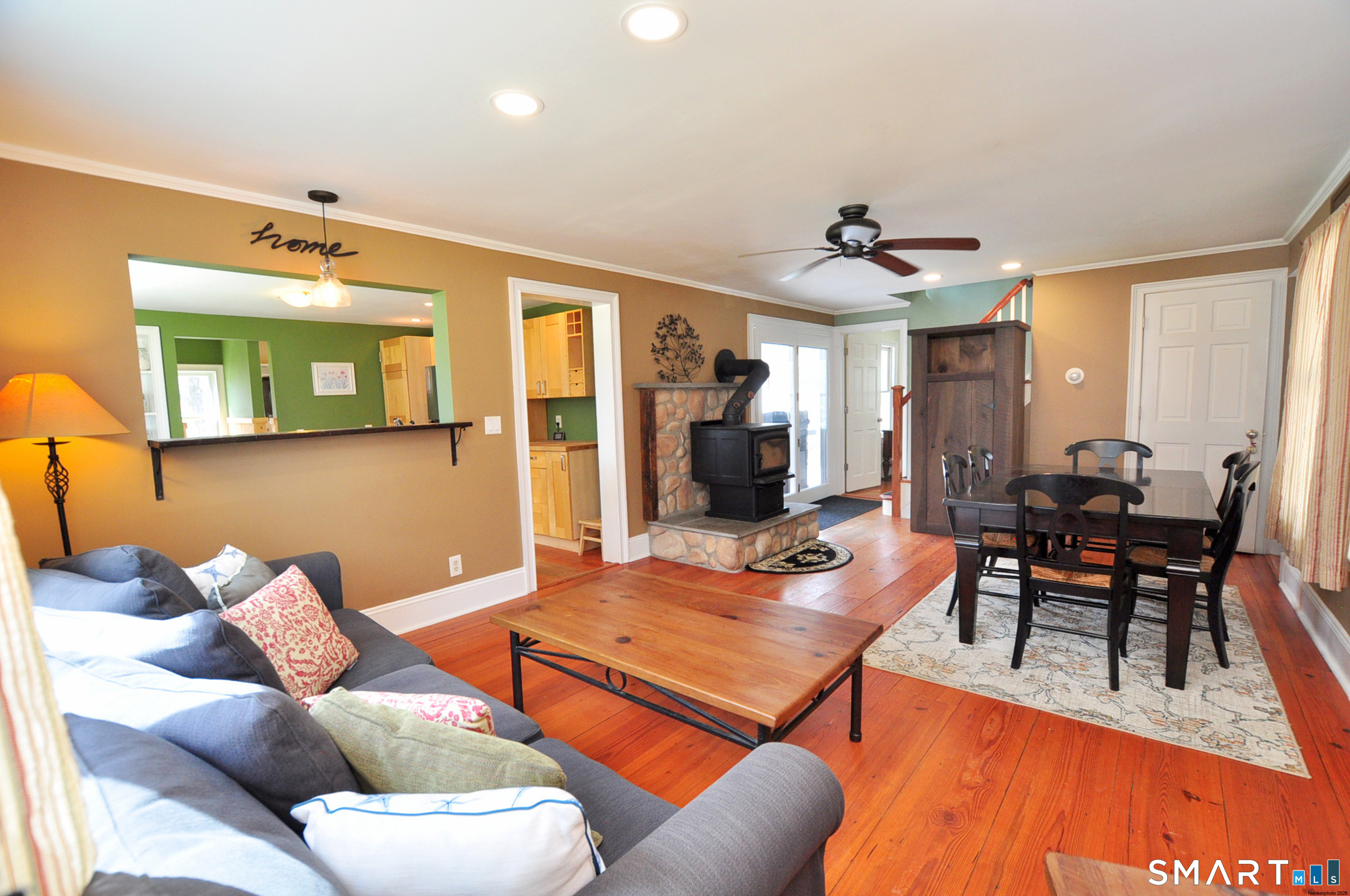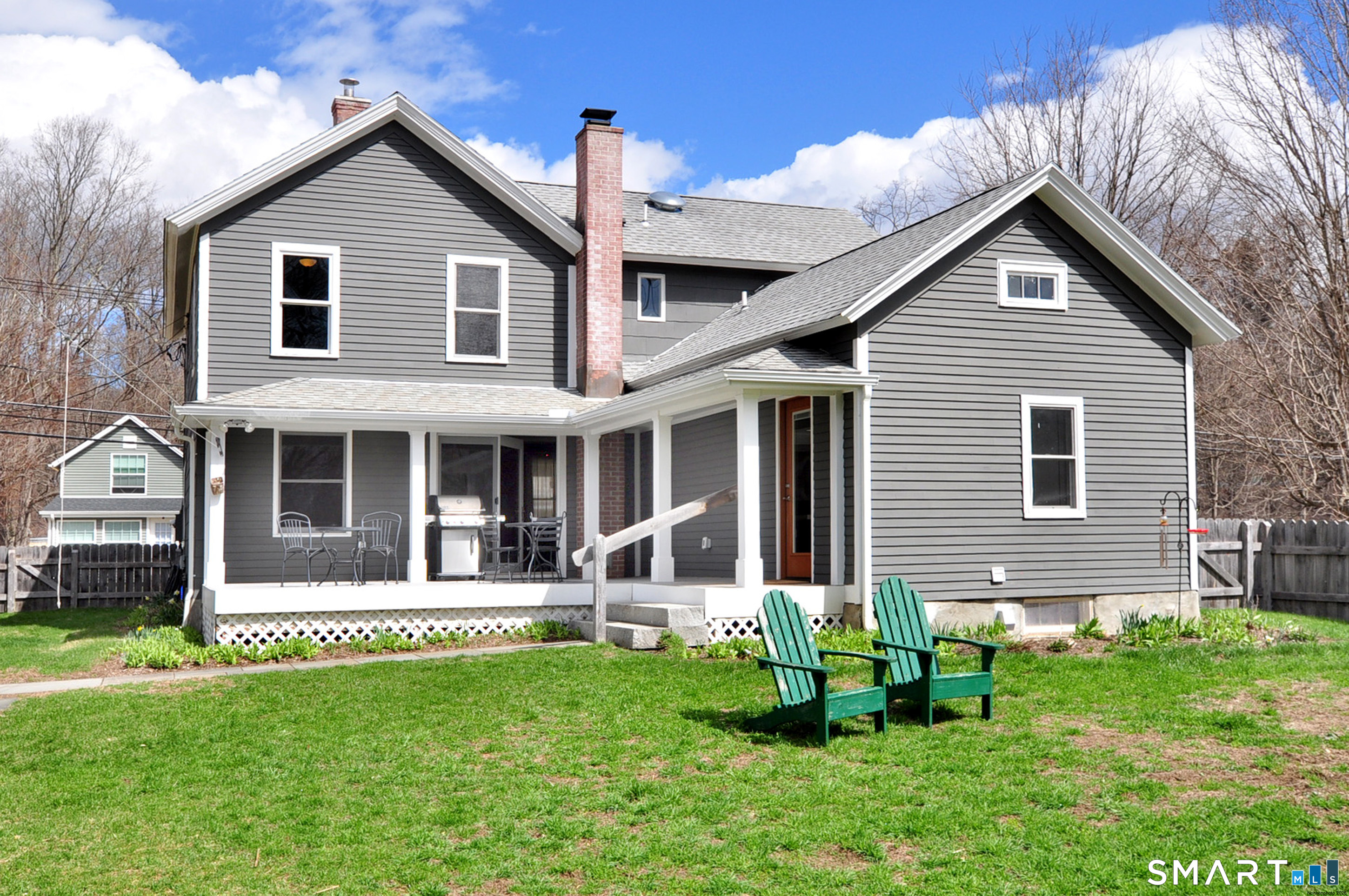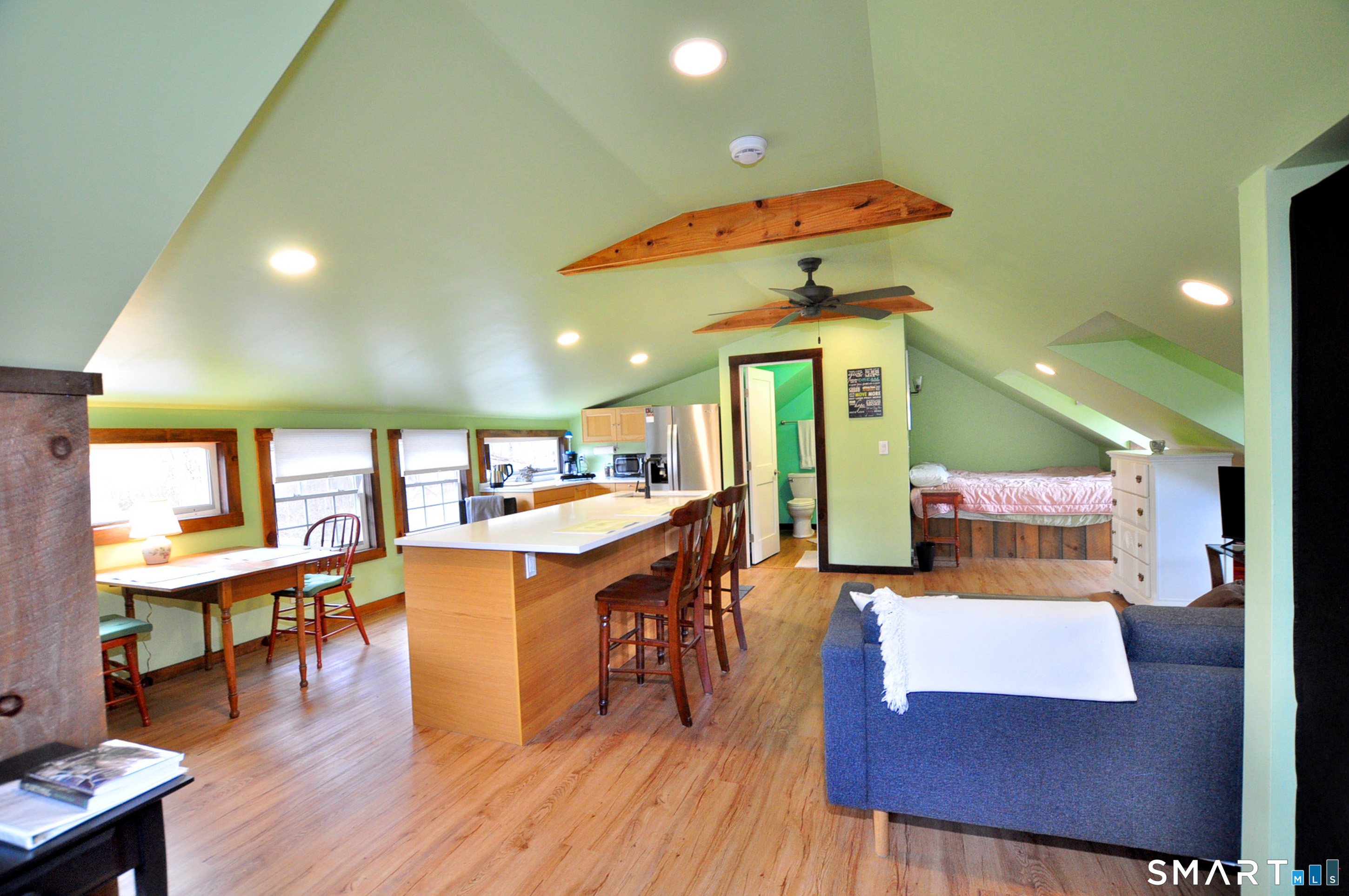 Welcome to 71 Cottage St! Offering a rare blend of charm and modern functionality, this well-maintained property features a single-family home complemented by a newer in-law studio apartment above an oversized detached 2-car garage. Set on .5 acres, this special home provides an elevated living experience with flexibility for extended family, multi-generational living, or income potential. The main home offers a warm and inviting layout with a living room equipped with wideboard flooring a wood burning stove, and open to the kitchen. The living room also provides access to a covered porch and your beautiful back yard. The kitchen features stainless steel appliances, a propane stove, porcelain farmhouse sink, new laminate countertops, built-ins, and plenty of storage. A convenient laundry room with exterior access and a storage bench is located just off the kitchen. The main level also includes a half bath with beadboard molding, a first-floor bedroom, and an additional flexible room currently used as a gym yet ideal for a family room, office, or formal living space. Upstairs, you will find three additional rooms for your choice of bedroom space, and a full bathroom remodeled in 2019 with an updated vanity. Additional improvements and features include a new septic tank (2023), roof (2017), boiler (2016), replacement windows, and a 200-amp electrical panel. The detached 2-car garage features high ceilings, oversized doors, and a stainless steel sink. Above the garage,