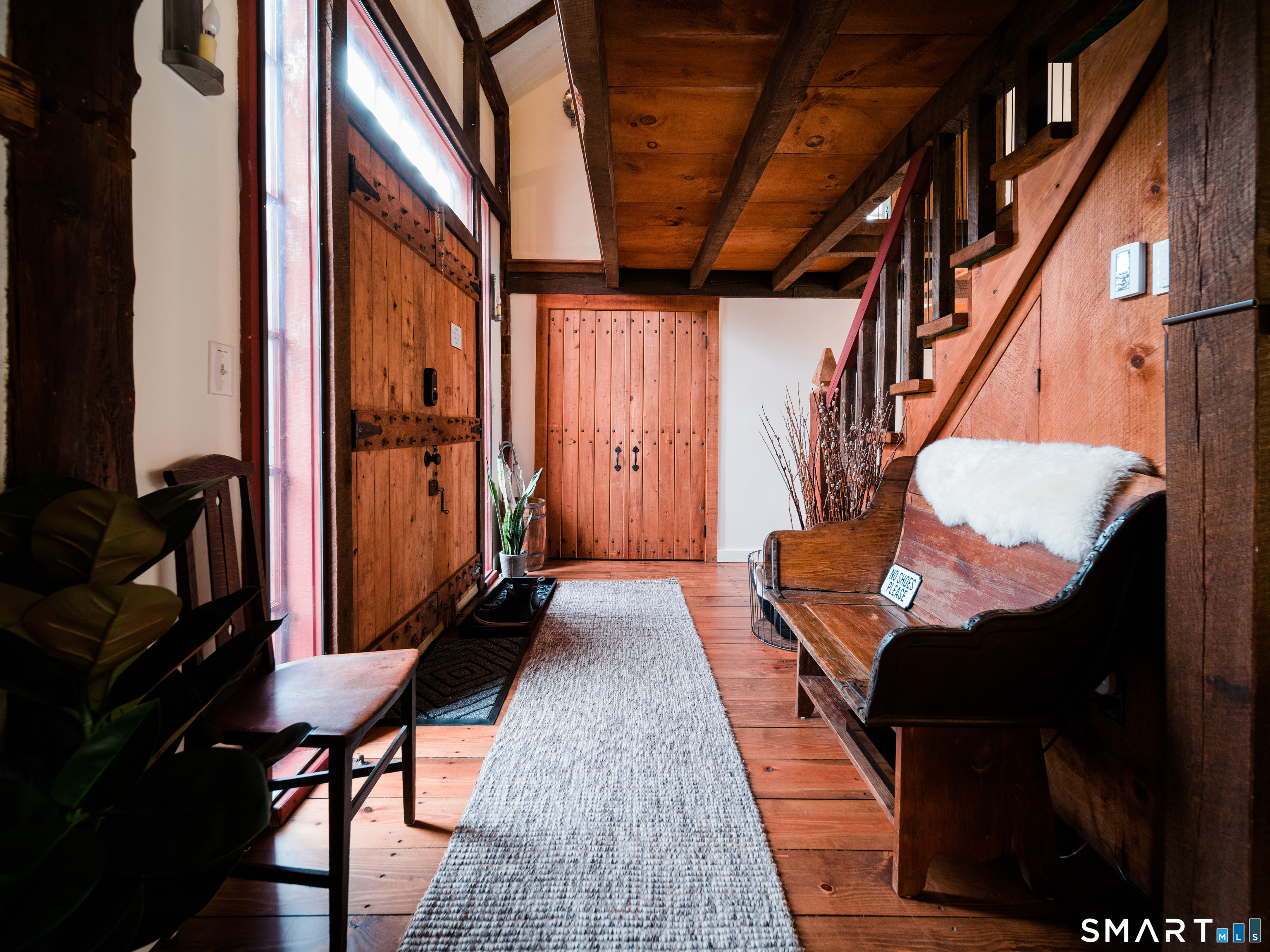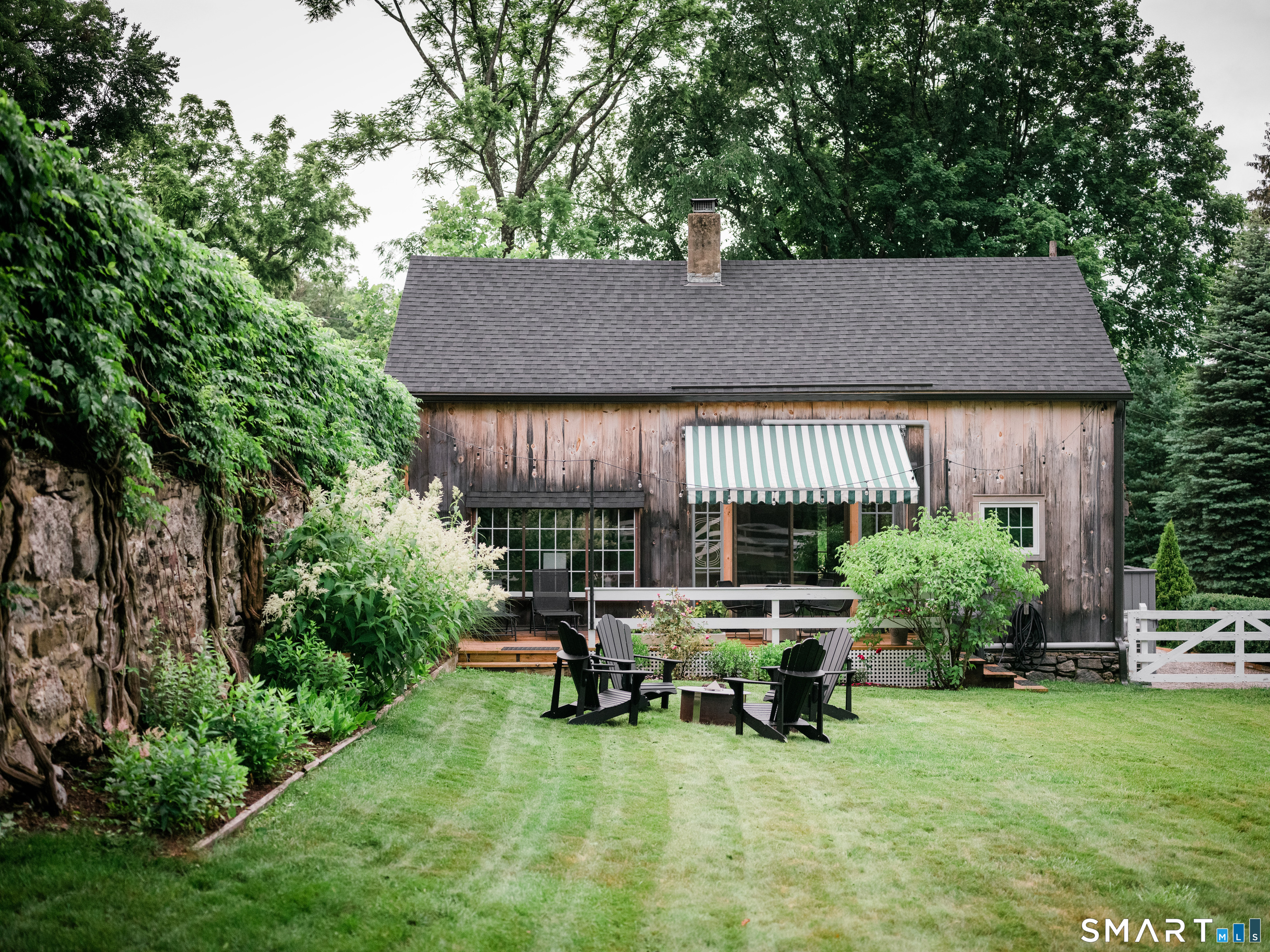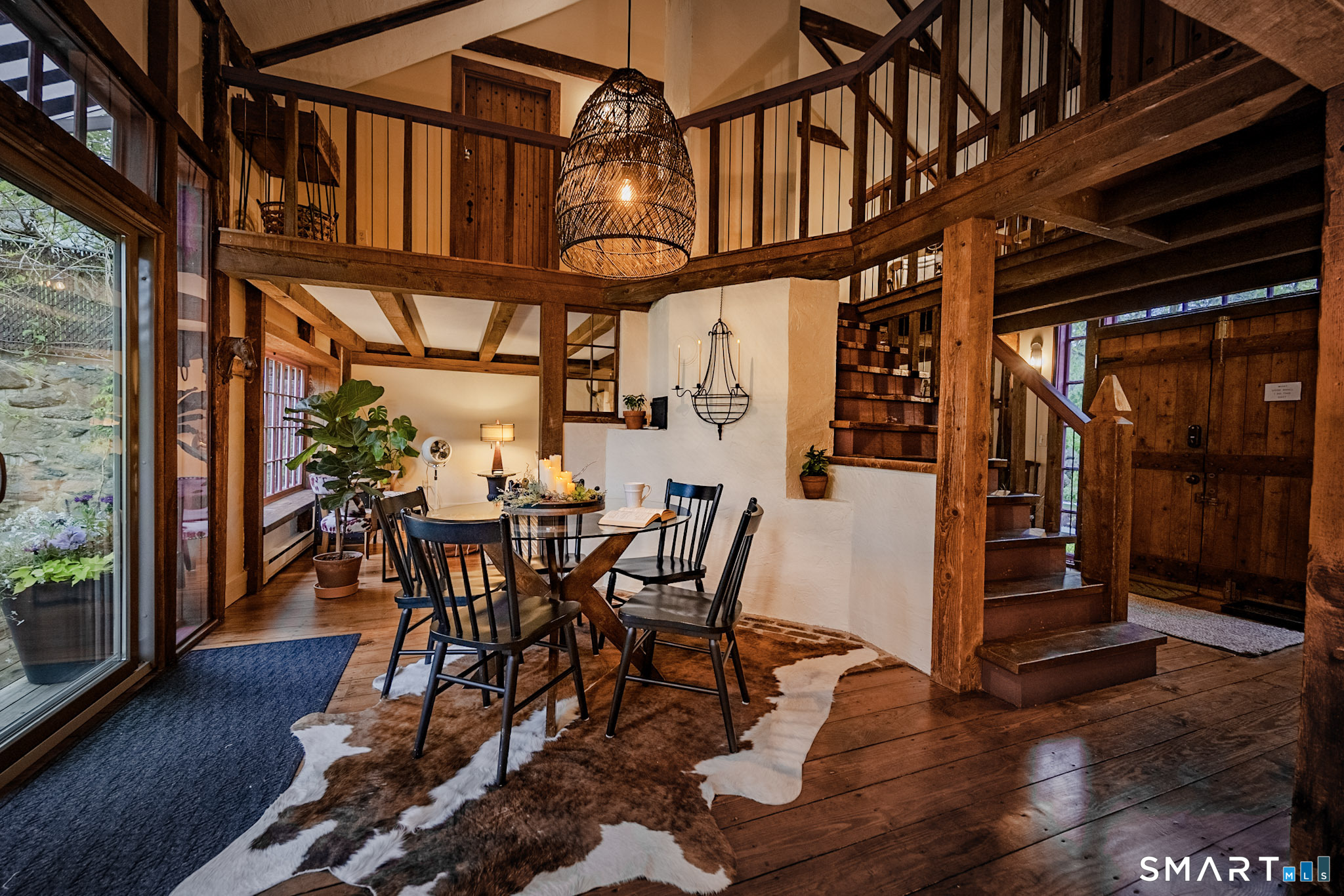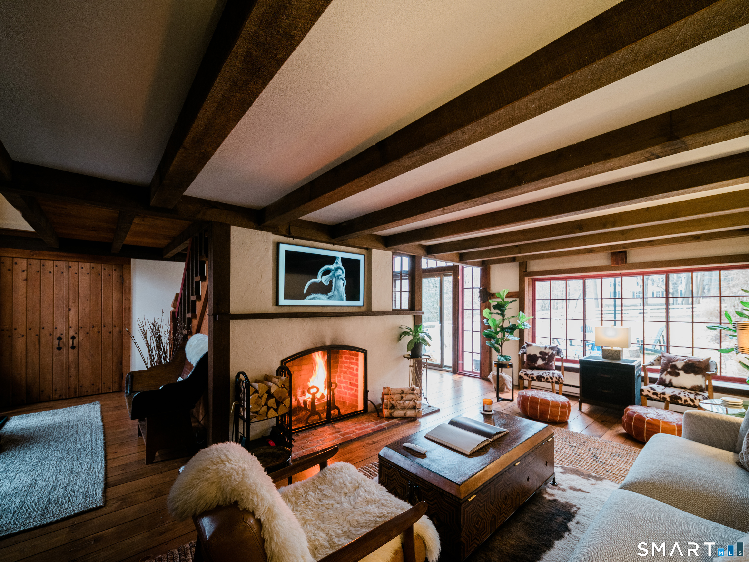 Meticulously maintained and thoughtfully curated, this one-of-a-kind post-and-beam barn in the Essex Village district offers a rare blend of historic character and modern comfort. Showcasing wide plank floors, rich natural textures, and awe-inspiring architectural details throughout, this home delivers warmth and style in every space. The open-concept main living area is anchored by a striking stucco wood-burning fireplace. The home features two bedrooms and two full baths, including a primary suite with ensuite bath. Bay-style windows wrap around the lower level, filling the home with an abundance of warm natural light. The eat-in kitchen flows seamlessly to the outdoors. Step onto the newly finished deck, complete with an awning, creating the perfect covered outdoor dining and entertaining space. The private, level yard is fully fenced and complemented by professionally maintained gardens, offering a peaceful and picturesque setting. Located on a corner lot, where Saybrook Road meets Benson Lane.