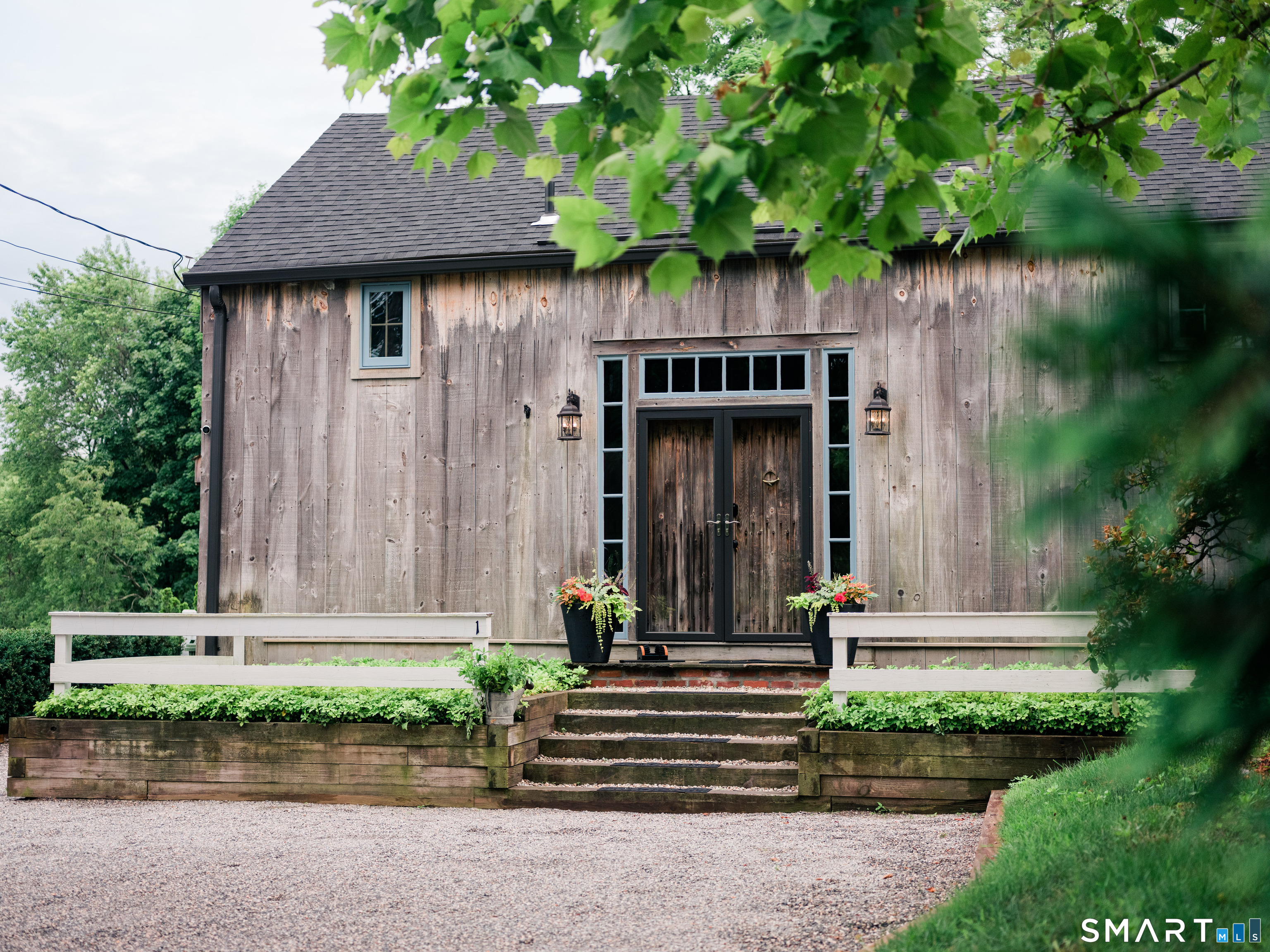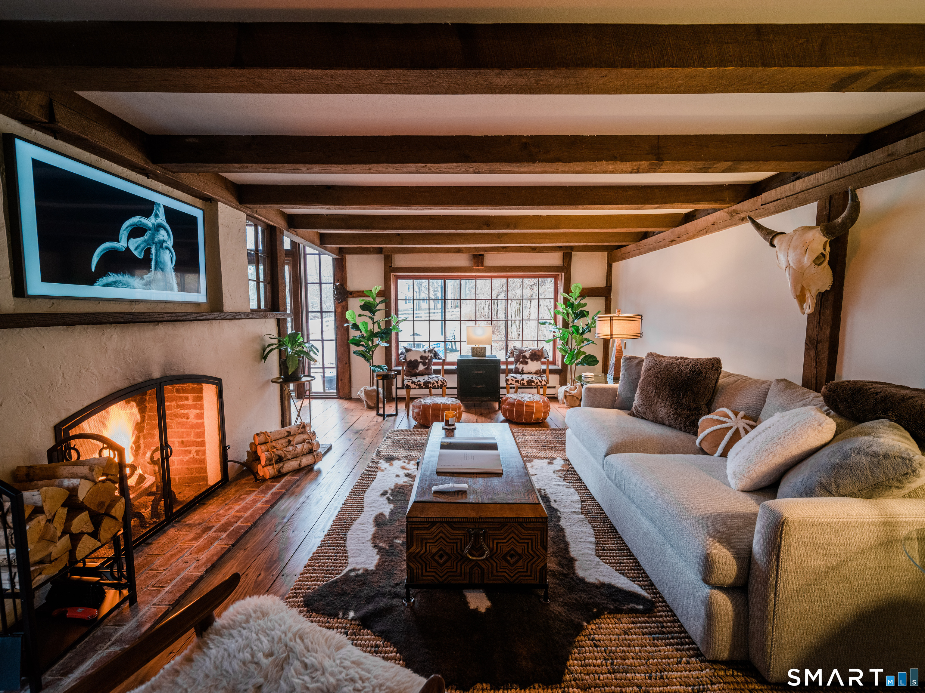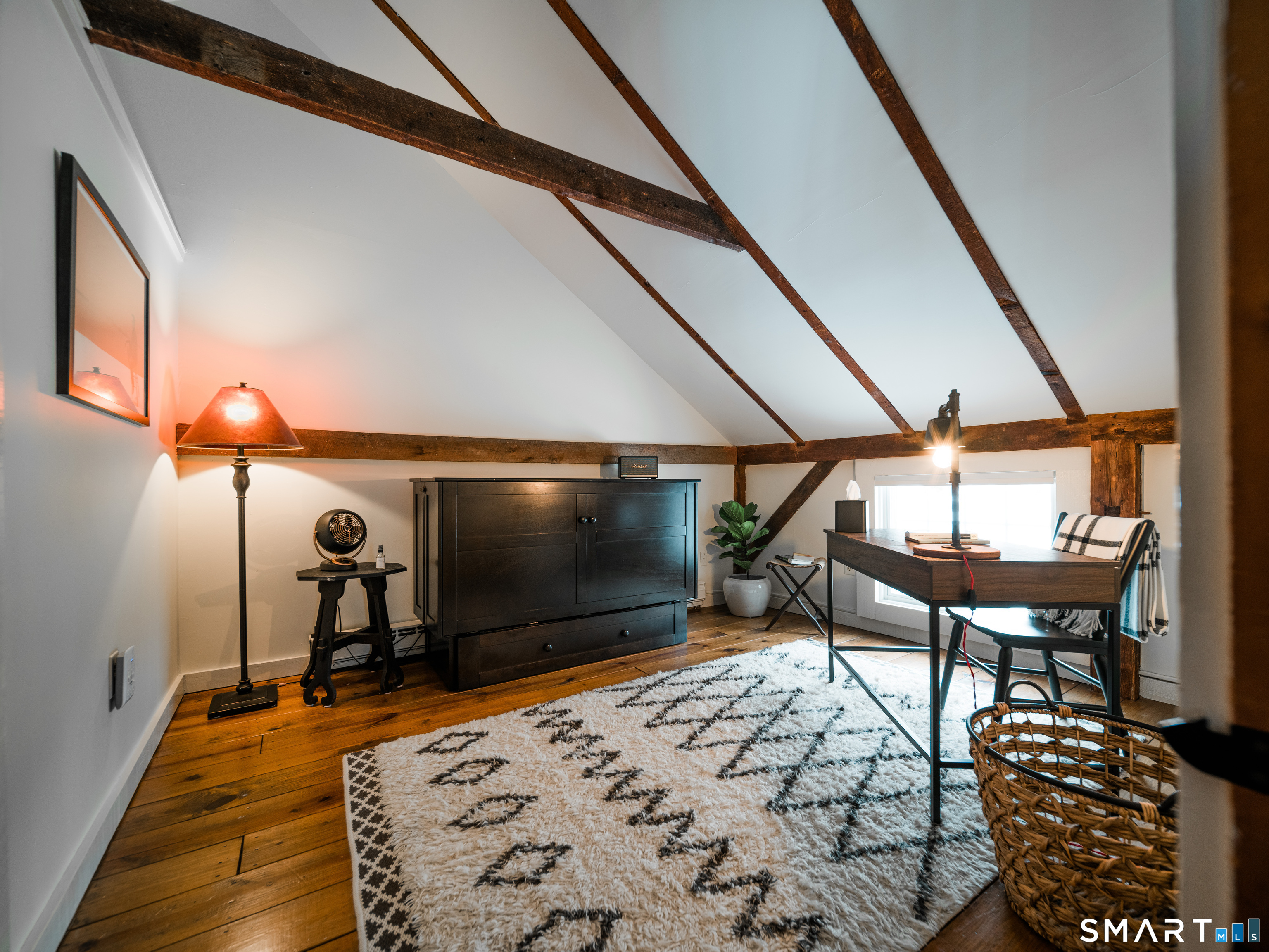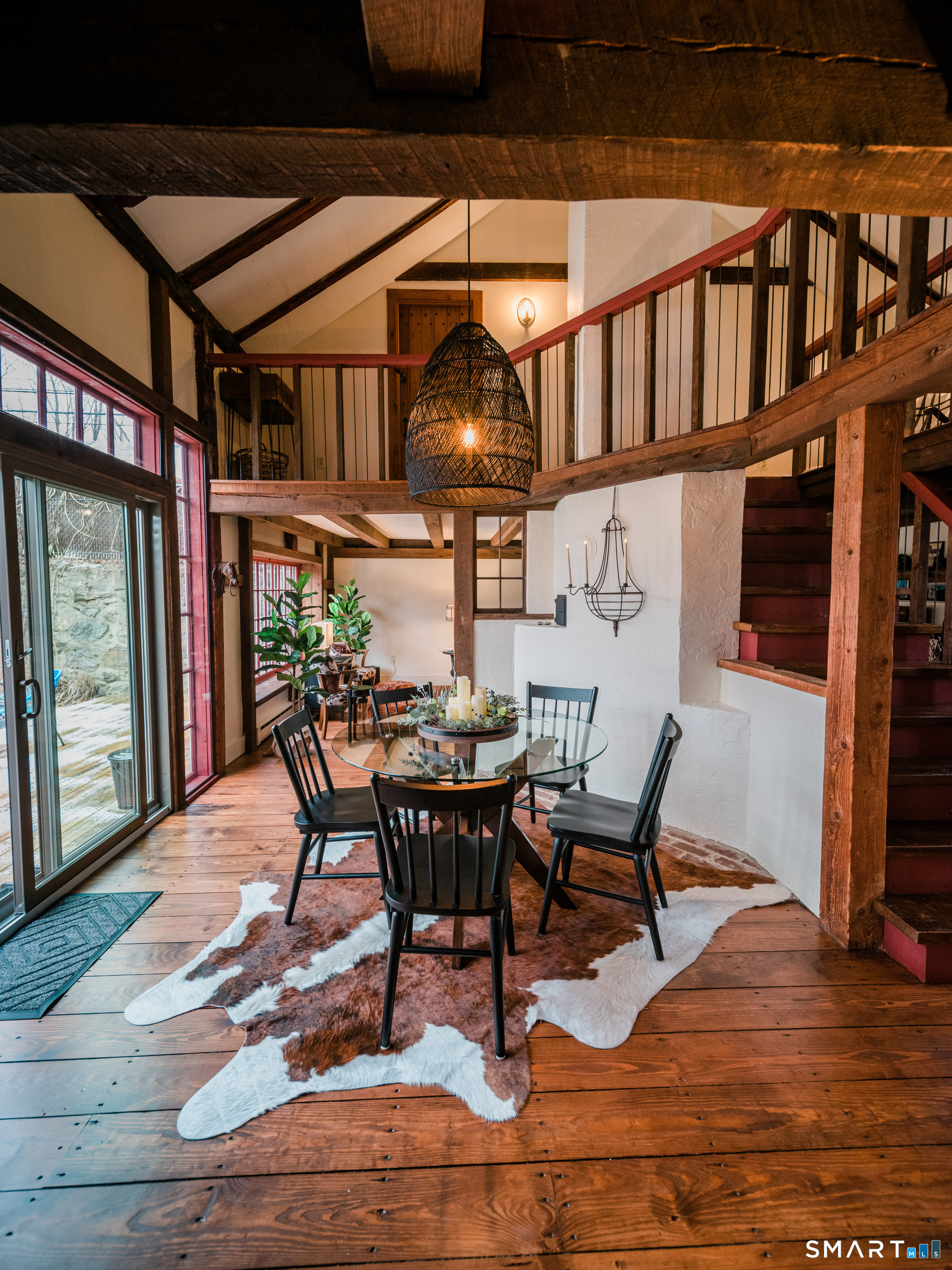 Meticulously maintained and thoughtfully curated, this one-of-a-kind post-and-beam barn in the Essex Village district offers a rare blend of historic character and modern comfort. Showcasing wide plank floors, rich natural textures, and awe-inspiring architectural details throughout, this home delivers warmth and style in every space. The open-concept main living area is anchored by a striking stucco wood-burning fireplace. The home features two bedrooms and two full baths, including a primary suite with ensuite bath. Bay-style windows wrap around the lower level, filling the home with an abundance of warm natural light. The eat-in kitchen flows seamlessly to the outdoors. Step onto the newly finished deck, complete with an awning, creating the perfect covered outdoor dining and entertaining space. The private, level yard is fully fenced and complemented by professionally maintained gardens, offering a peaceful and picturesque setting. Located on a corner lot, where Saybrook Road meets Benson Lane.