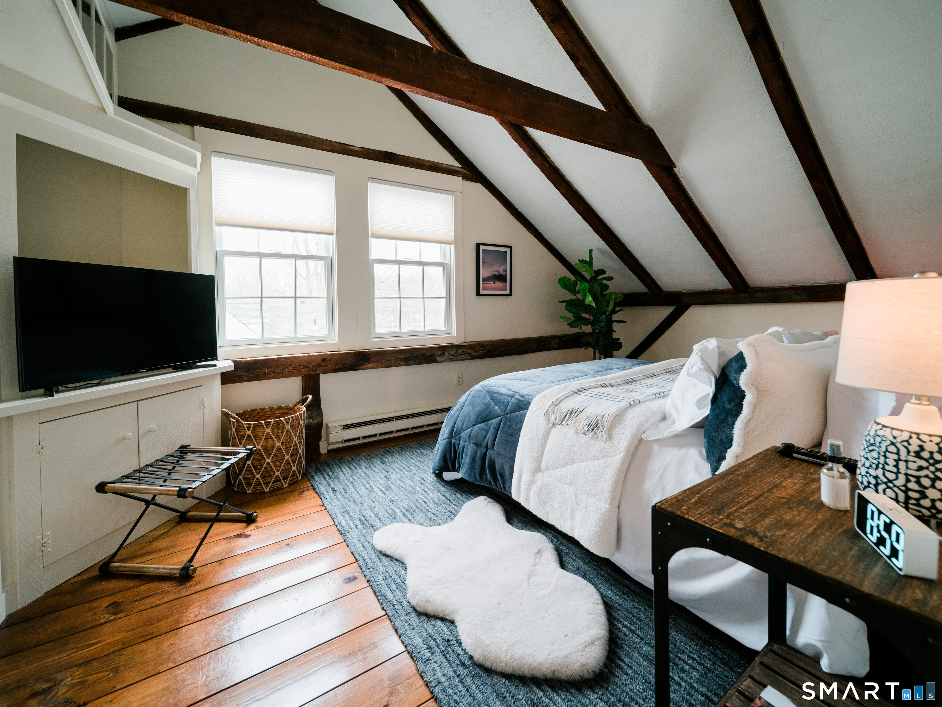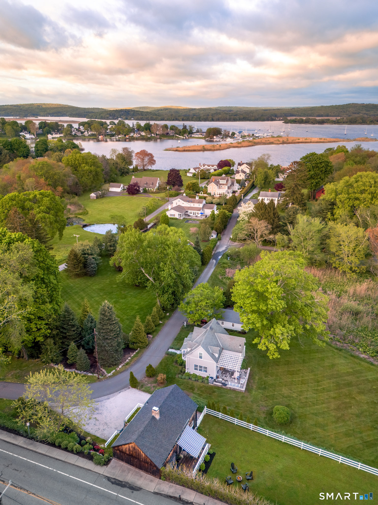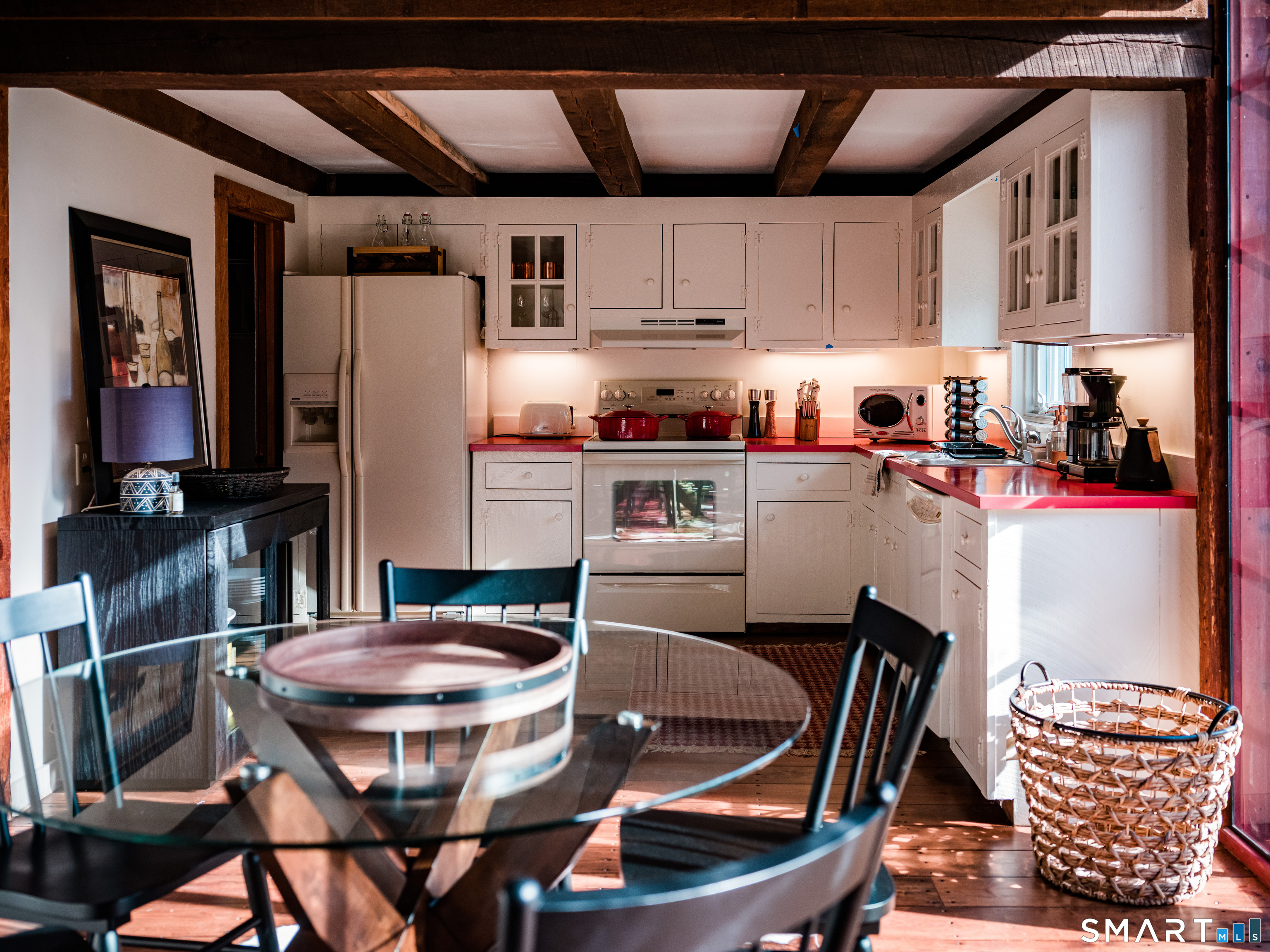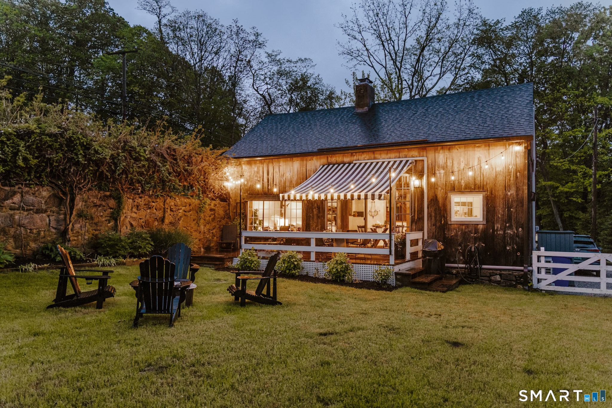 Meticulously maintained and thoughtfully curated, this one-of-a-kind post-and-beam barn in the Essex Village district offers a rare blend of historic character and modern comfort. Showcasing wide plank floors, rich natural textures, and awe-inspiring architectural details throughout, this home delivers warmth and style in every space. The open-concept main living area is anchored by a striking stucco wood-burning fireplace. The home features two bedrooms and two full baths, including a primary suite with ensuite bath. Bay-style windows wrap around the lower level, filling the home with an abundance of warm natural light. The eat-in kitchen flows seamlessly to the outdoors. Step onto the newly finished deck, complete with an awning, creating the perfect covered outdoor dining and entertaining space. The private, level yard is fully fenced and complemented by professionally maintained gardens, offering a peaceful and picturesque setting. Located on a corner lot, where Saybrook Road meets Benson Lane.
