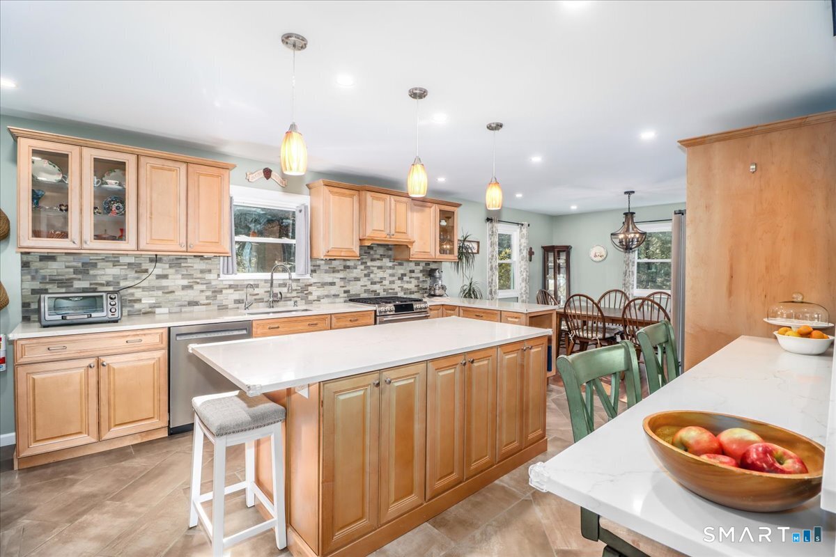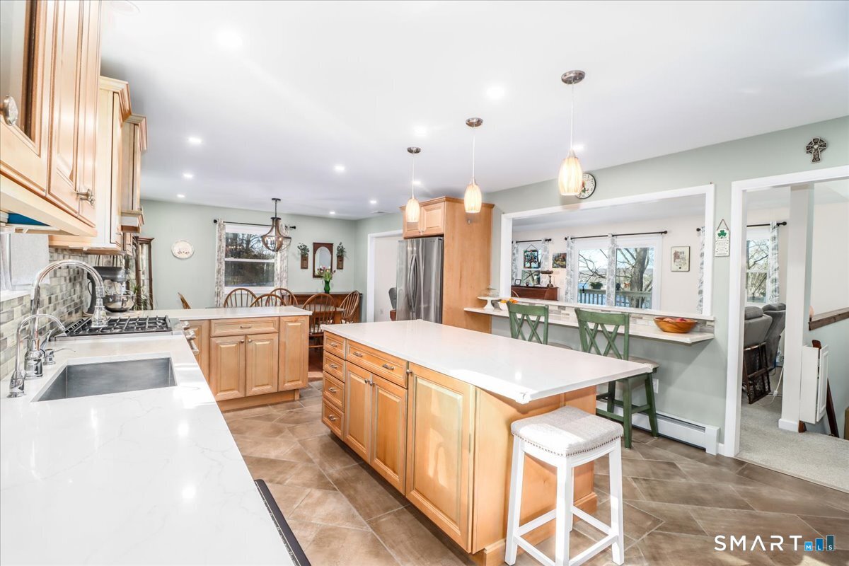 Sitting pretty on a hill this updated raised ranch has views of beautiful Candlewood Lake! With a new roof, new septic system, new AC, new windows, new siding, newly paved driveway, and a completely renovated kitchen, all the hard work has been done so you can simply settle in and make it your own! The main level consists of a vaulted living room with sliders out to the deck - perfect for taking in the lake views; a dining room off the open kitchen with a breakfast bar, new appliances and oversized island for all your meal prep and serving needs; a multipurpose sun room/mud room off the kitchen with washer and dryer and access to the large deck; a primary bedroom with en suite bathroom and two additional bedrooms that share the hallway full bath. The lower level has the fourth bedroom or office, a family room with fireplace, and a half bath. Sit out on the deck with family or friends and enjoy the privacy and nature of the backyard that attracts many birds and friendly woodland animals. Just around the corner is Lattin's Cove where you can launch your boat or head out in your kayak for an adventure on the water. Or drive 5 minutes to the beach access at Candlewood Town Park and spend the day in the sand and picnic at the nearby tables. With transferable warranties on the new roof, siding, and windows, this home offers not only beauty and comfort-but peace of mind! Just in time for summer - your perfect home is ready!