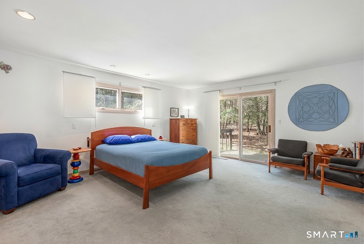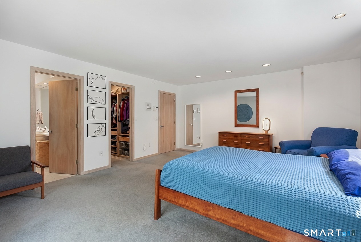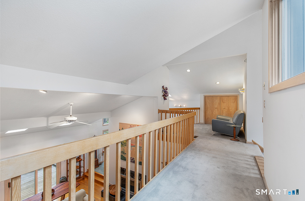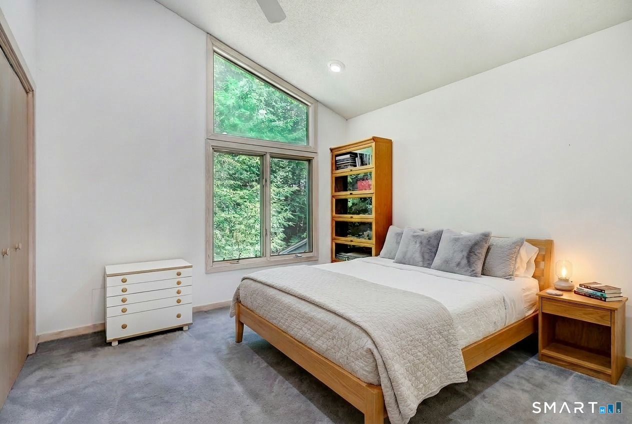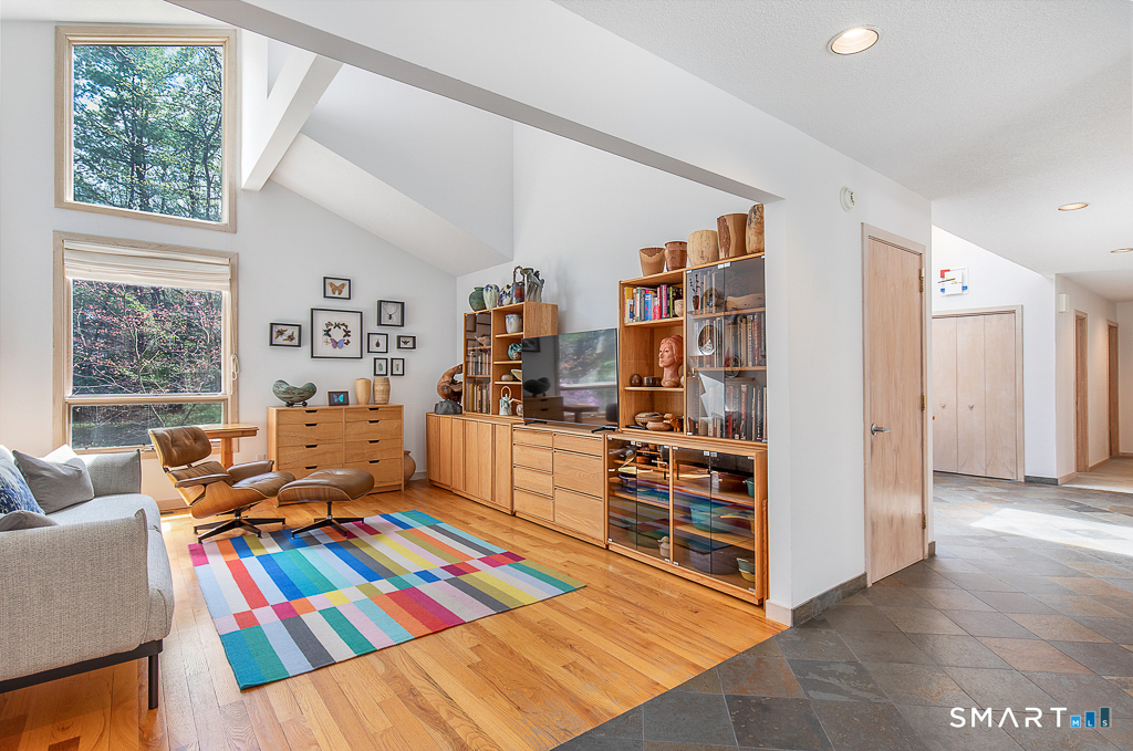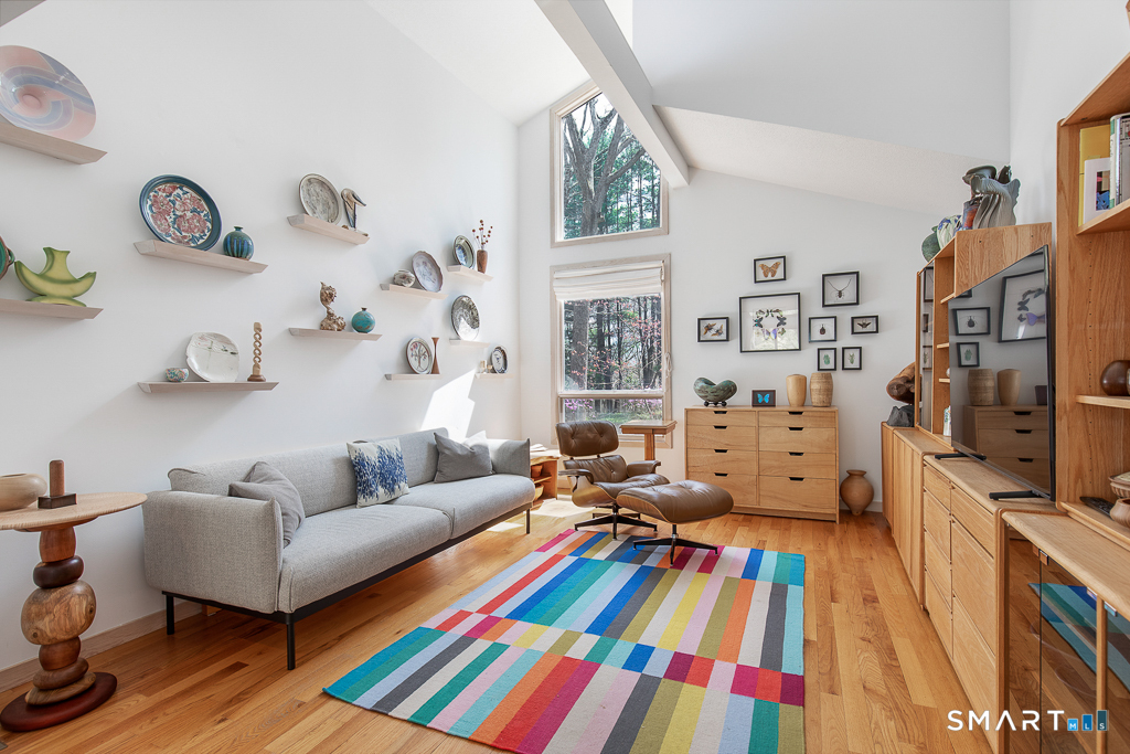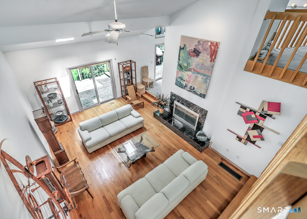 A rare offering from the home's original owners, this custom contemporary is tucked on a tranquil cul-de-sac, bordering the 200-acre Elderslie Preserve to provide preferential privacy. This singular, open-concept showpiece offers 3,346sqft of soaring ceilings paired w/ walls of windows that bathe the home in brilliant light & blur the line between indoors & the lush landscape beyond. A bright, welcoming foyer expands effortlessly into a sunken living room crowned by a striking 2-story ceiling & warmed by a sleek pass-through gas FP shared w/ the formal dining room. Chefs will delight at the generously scaled eat-in kitchen outfitted w/ center island, 2 sinks, & professional-grade appliances, including a Viking dual-fuel range w/ grill & hood. Sliders in the kitchen invite entertaining out on the delightful deck overlooking a private, peaceful yard framed by mature trees & soon-to-bloom plantings. The main-level primary suite is a serene sanctuary w/ its own deck, walk-in closet, & spacious bath. A comfortable family room, versatile 2nd BR/office, & full bath w/ laundry complete the main level. Upstairs, an airy loft & open catwalk lead to 3 voluminous BRs, each w/ vaulted ceilings, plus a shared bath. The full lower level, accessible by 2 stairways, offers abundant storage or future finished potential & connects to a 2-car garage w/ room for a sizable workshop. Lovingly maintained by its first caretakers, this distinctive residence radiates pride, polish, & enduring appeal!
