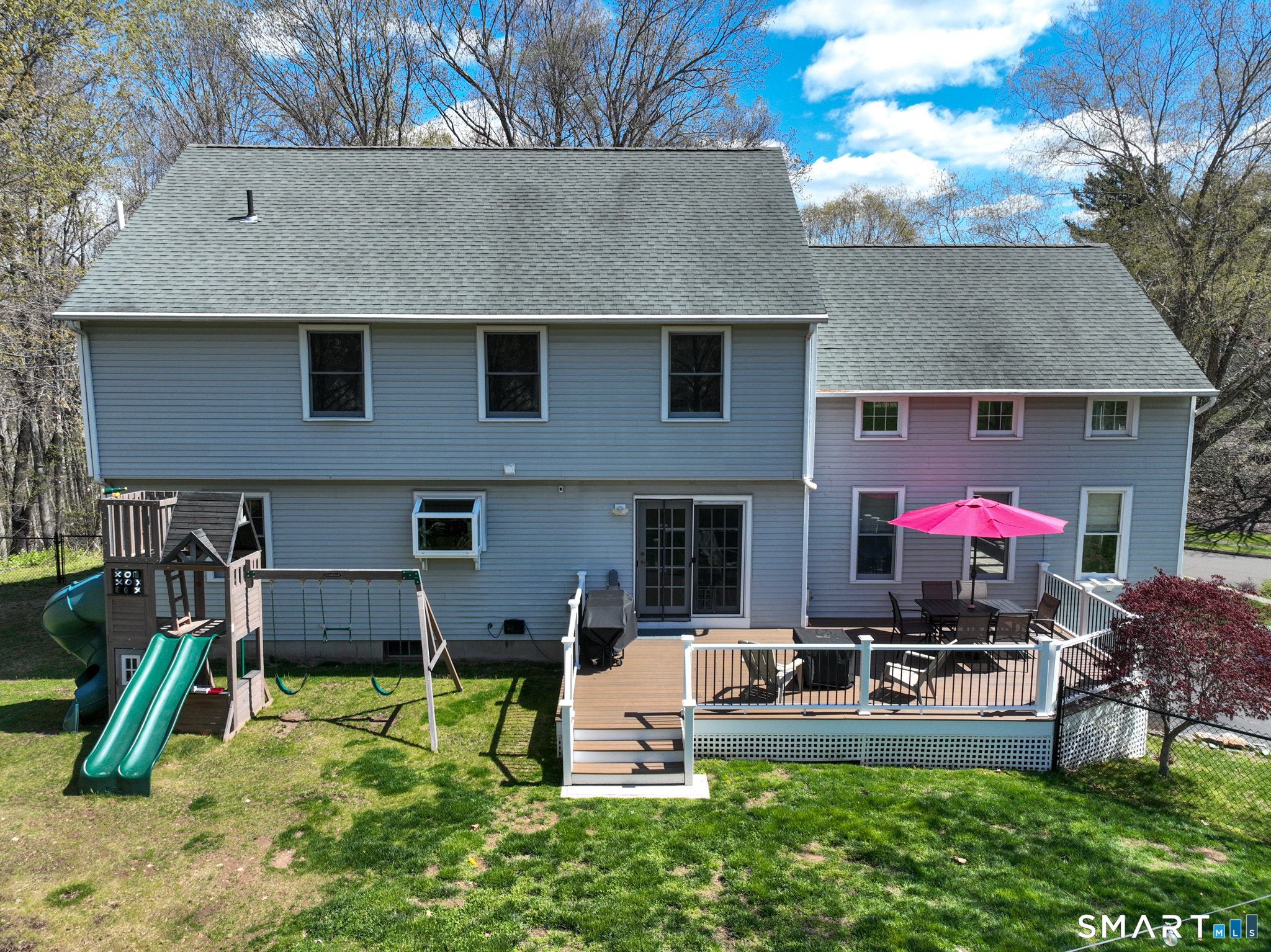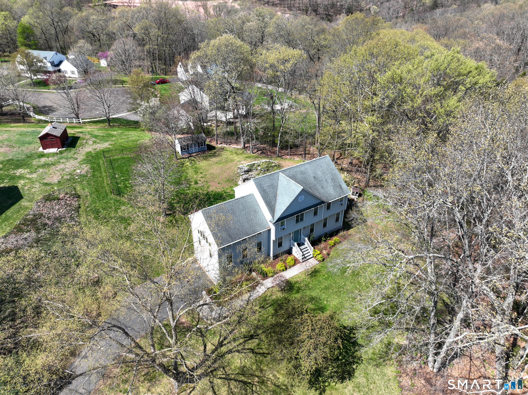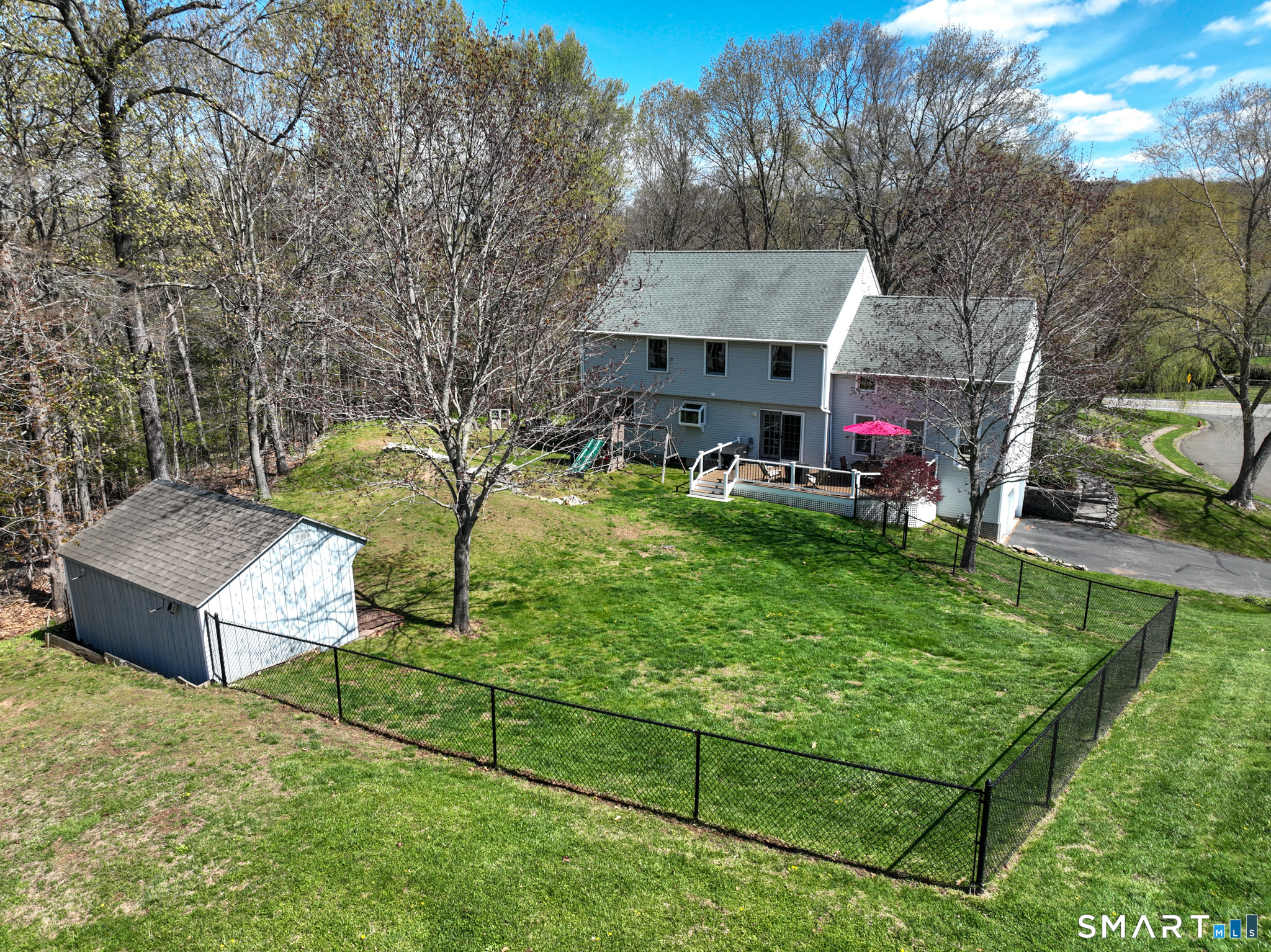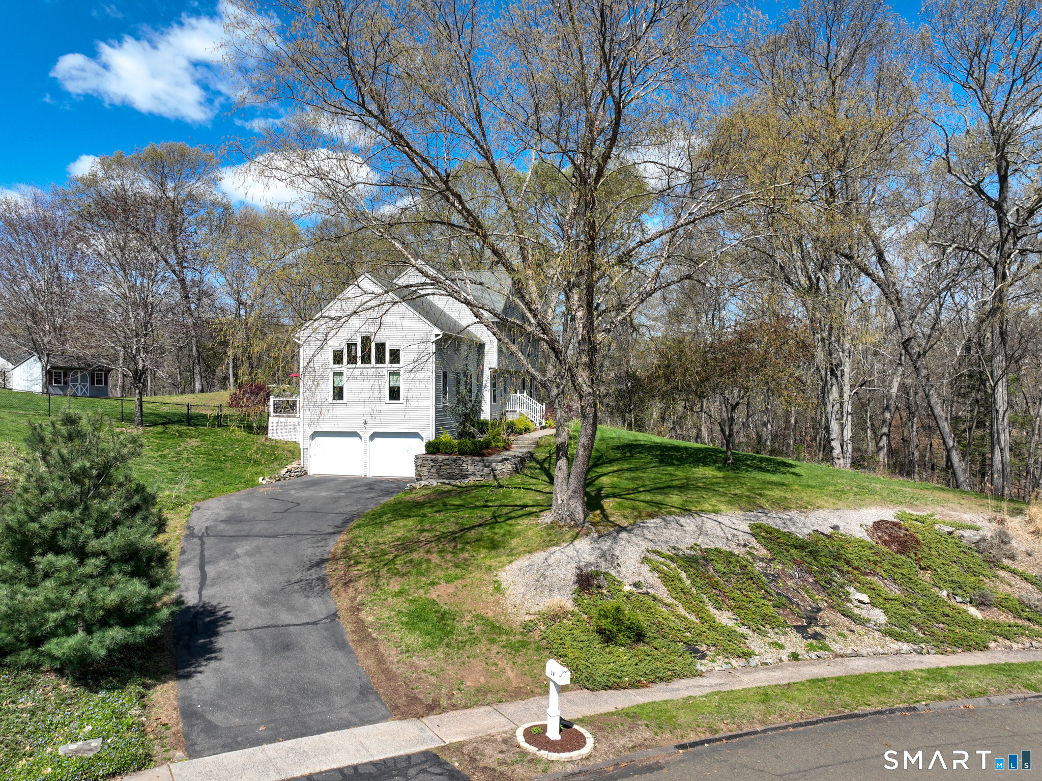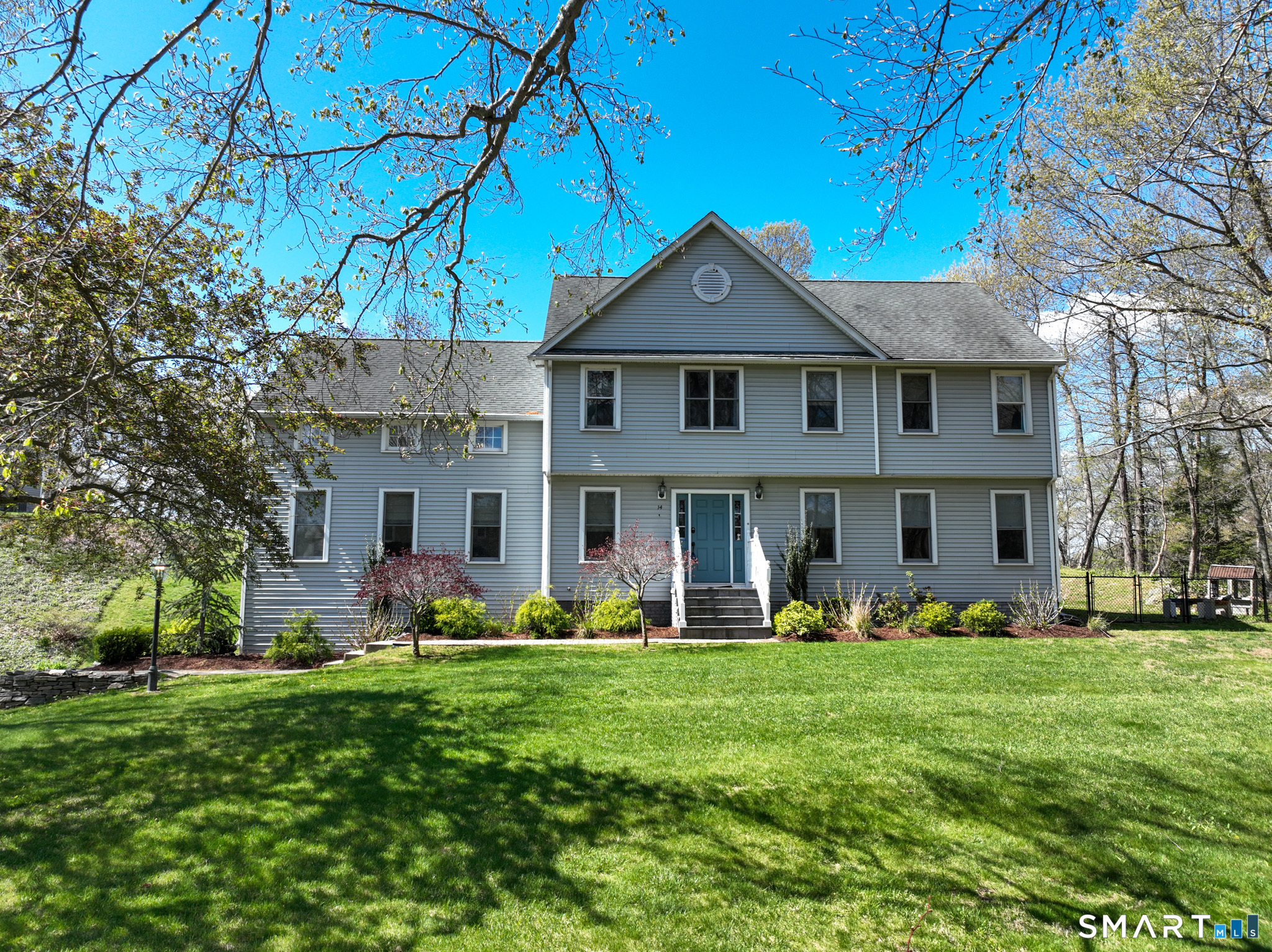 This spacious 3-bedroom, 2.5-bath Colonial offering over 2,600 sq ft of comfortable living is the one you've been waiting for. Set on an elevated lot overlooking the neighborhood entrance, this home combines great layout, everyday functionality and an ideal location. The oversized family room, with vaulted ceilings, radiant heat and tons of light, flows seamlessly into the eat-in kitchen, creating an open, inviting space. French doors lead to a low-maintenance Trex deck and a fenced backyard. Hardwood floors run throughout the formal dining room, living room, second-floor loft, and all bedrooms. Upstairs you'll find 3 generous sized bedrooms and additional flex space with purposes such as a home office, study or den. New garage doors and on demand hot water heater. Newer gas fired Bosch furnace, mudroom entry from the attached 2-car garage, tons of garage and basement storage, a home gym, and a backyard shed. Conveniently located just over the line from South Glastonbury, this home offers easy access to local amenities while maintaining a peaceful neighborhood setting.