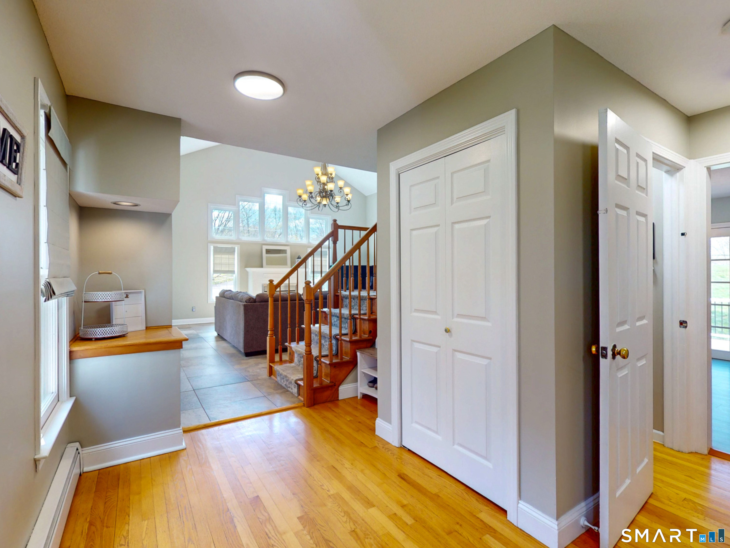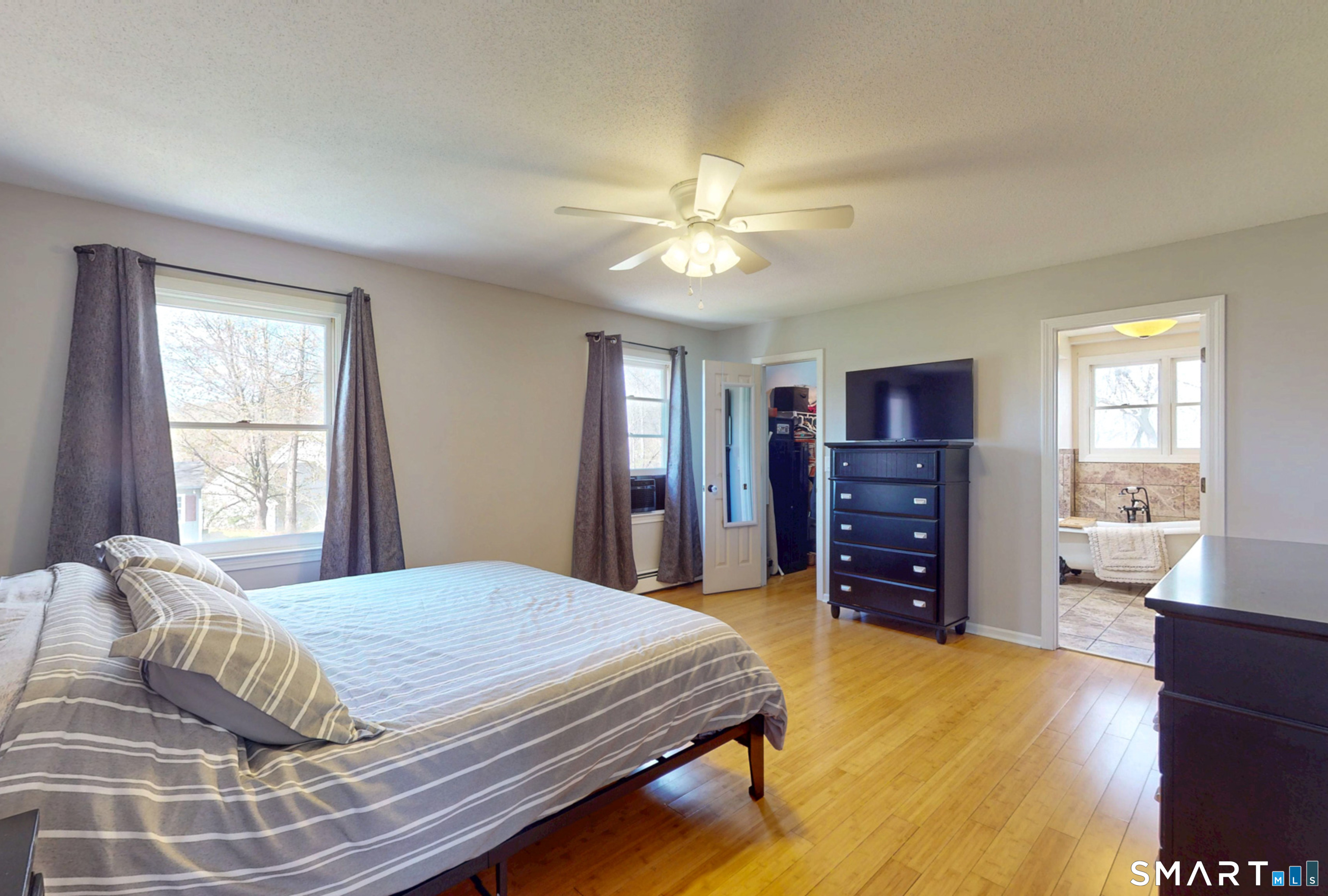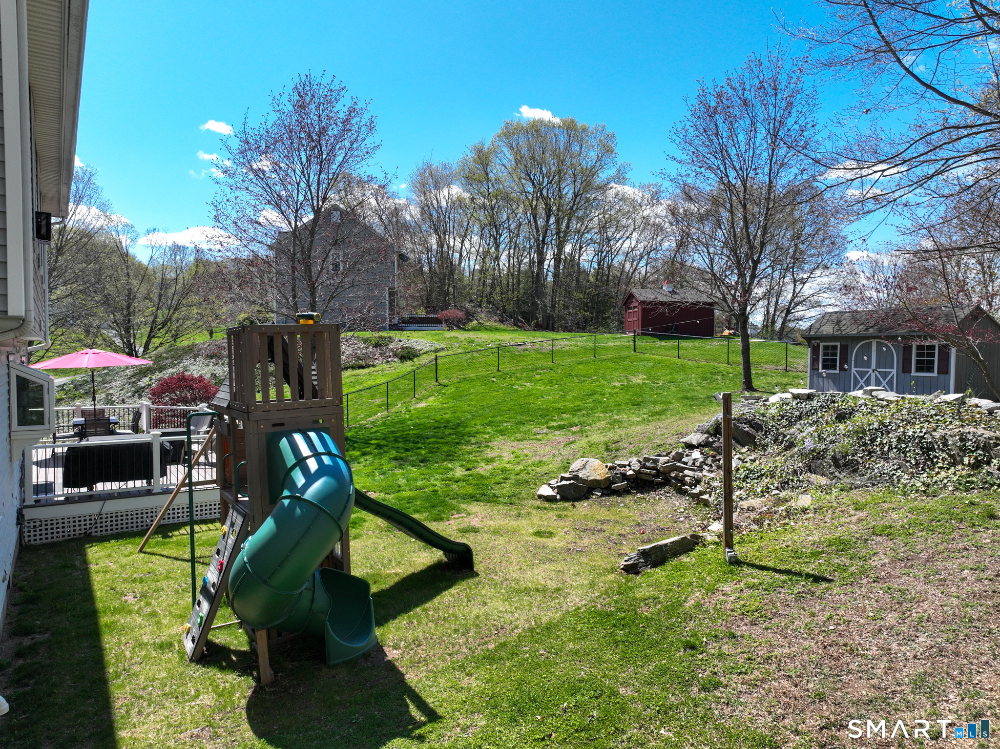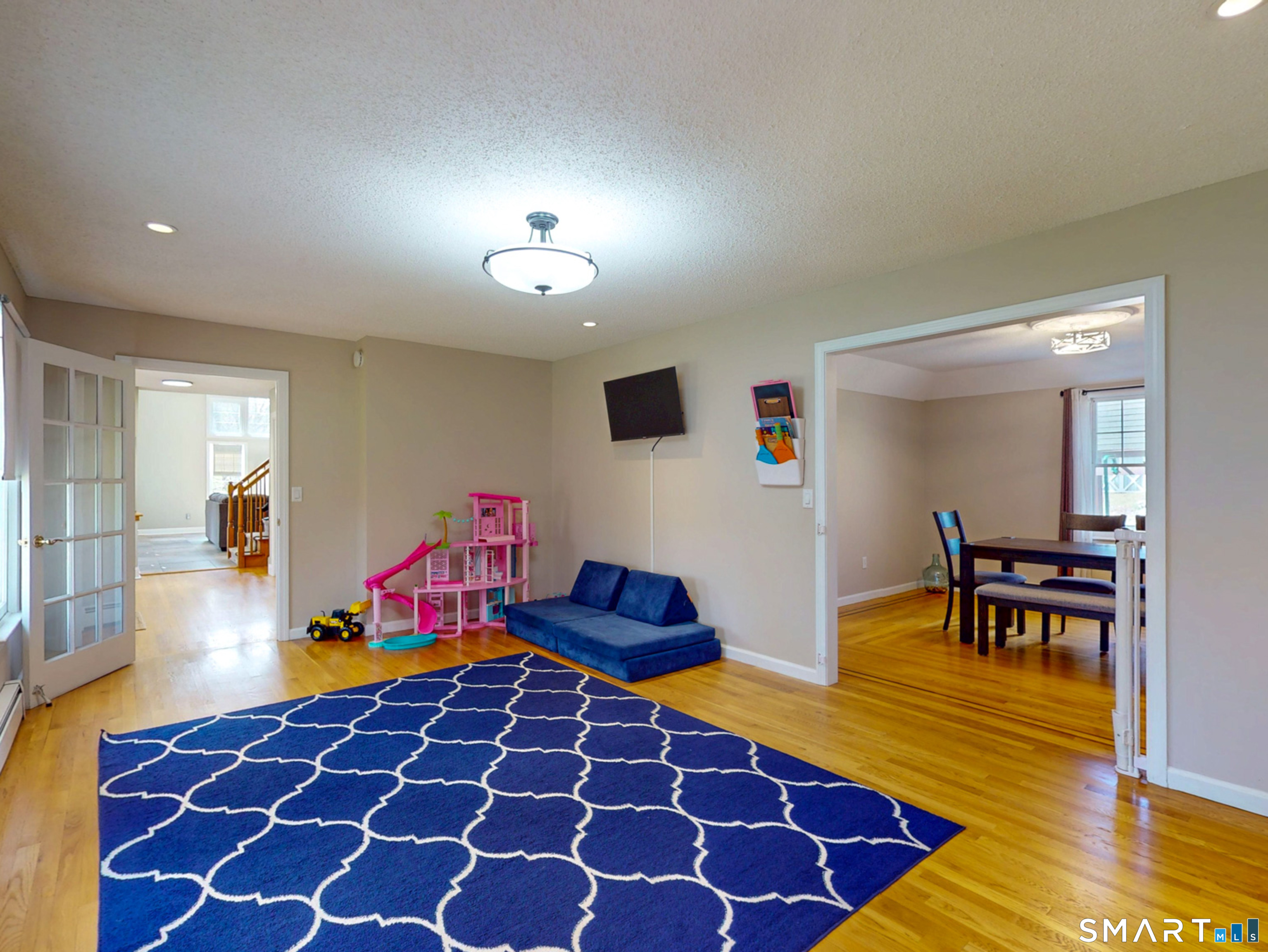 This spacious 3-bedroom, 2.5-bath Colonial offering over 2,600 sq ft of comfortable living is the one you've been waiting for. Set on an elevated lot overlooking the neighborhood entrance, this home combines great layout, everyday functionality and an ideal location. The oversized family room, with vaulted ceilings, radiant heat and tons of light, flows seamlessly into the eat-in kitchen, creating an open, inviting space. French doors lead to a low-maintenance Trex deck and a fenced backyard. Hardwood floors run throughout the formal dining room, living room, second-floor loft, and all bedrooms. Upstairs you'll find 3 generous sized bedrooms and additional flex space with purposes such as a home office, study or den. New garage doors and on demand hot water heater. Newer gas fired Bosch furnace, mudroom entry from the attached 2-car garage, tons of garage and basement storage, a home gym, and a backyard shed. Conveniently located just over the line from South Glastonbury, this home offers easy access to local amenities while maintaining a peaceful neighborhood setting.