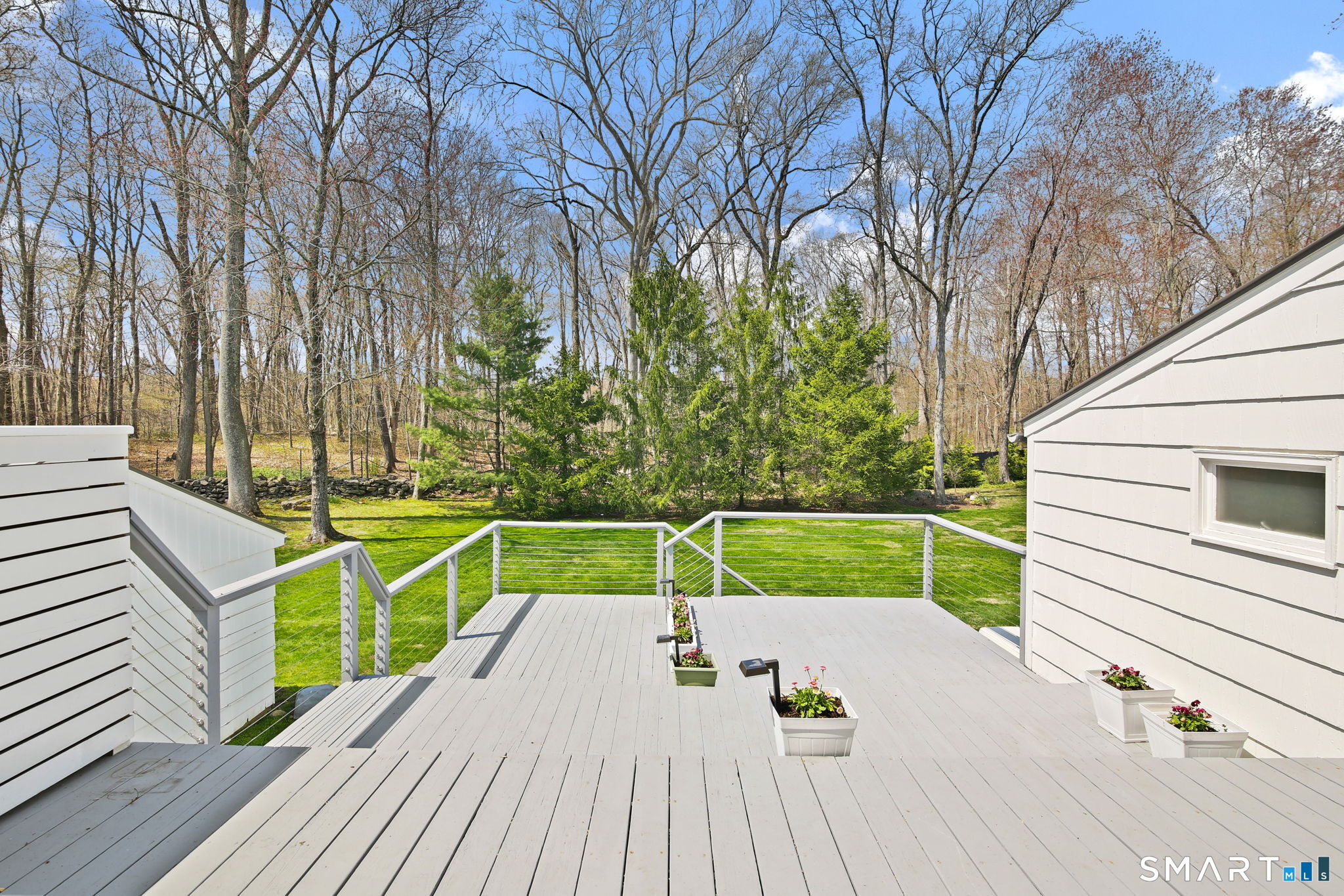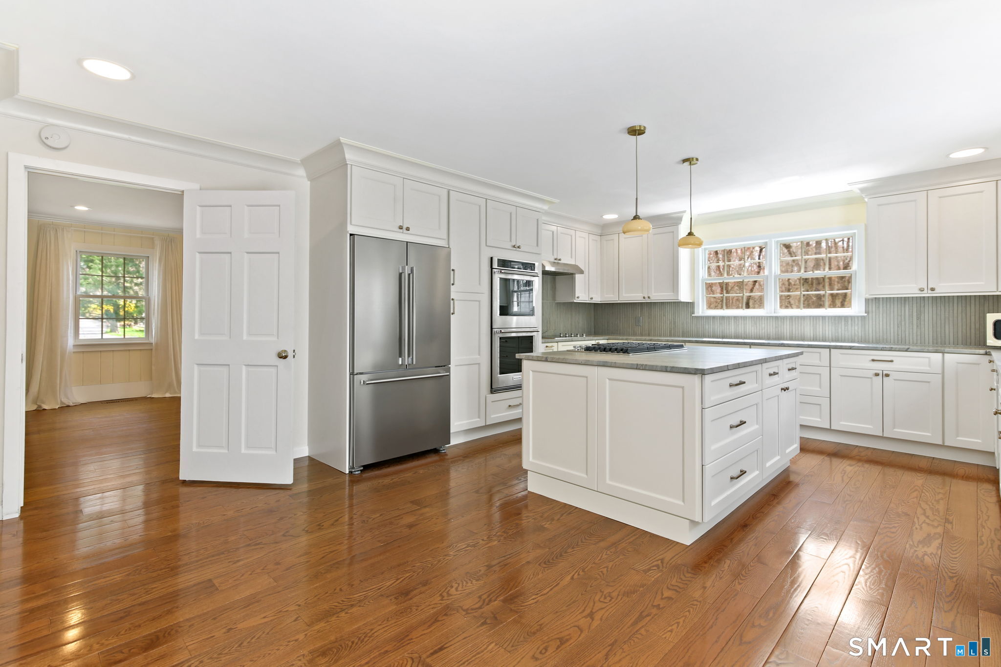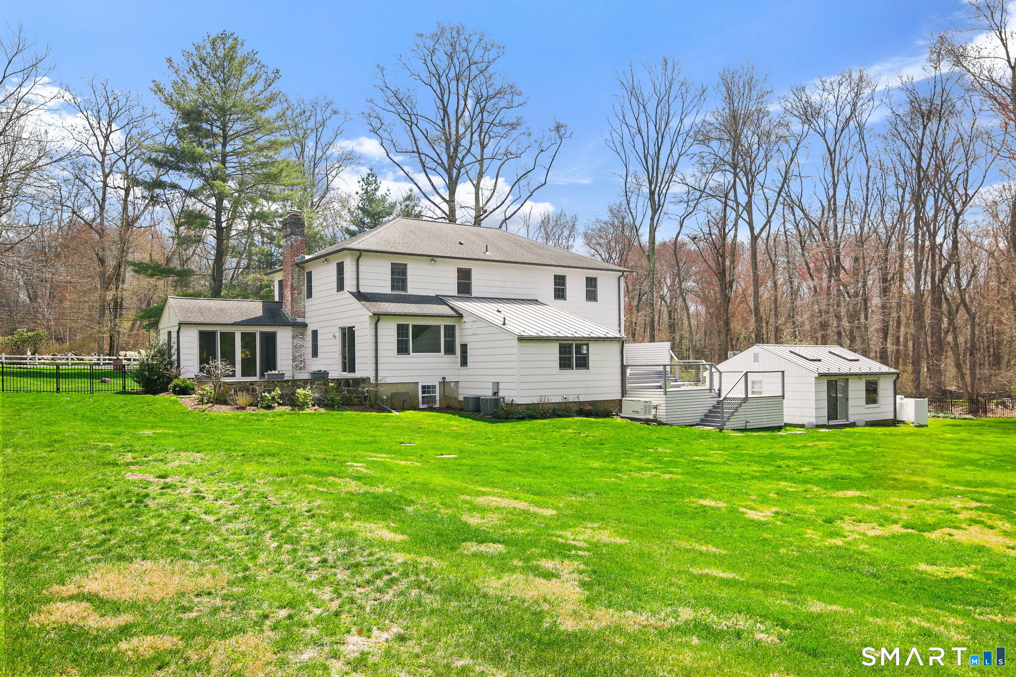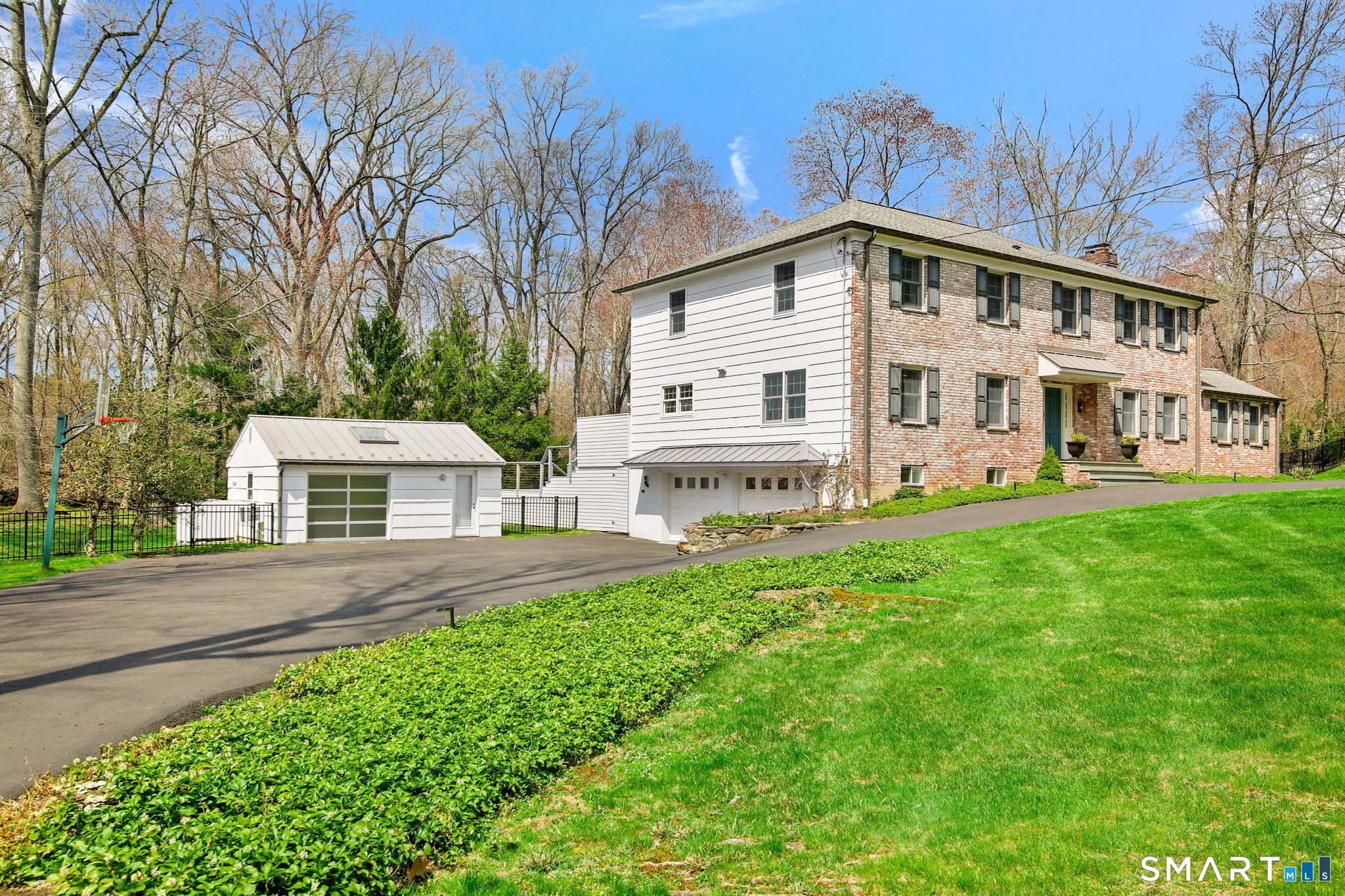 Situated on over two private acres in the highly desirable Mid-Country Greenwich area, this sophisticated 5-bedroom, 3.5-bath brick Colonial is a move-in-ready home designed for comfortable living and effortless entertaining. A welcoming foyer introduces the home's spacious layout, leading to both the living and family rooms. The generous family room, featuring a fireplace, flows seamlessly into the formal dining room. The updated, oversized eat-in kitchen opens to a large deck, creating an ideal setting for indoor-outdoor gatherings. A flexible bonus room-perfect as a sunroom, den, or home office-offers sliding doors that open to the expansive, private backyard. The home includes two primary bedroom suites - one on the main level and another upstairs -offering versatility for guests, multi-generational living, or an au pair. Bright, sun-filled interiors, hardwood floors throughout, and a fully finished basement add to the home's comfort and appeal. Additional features include a three-car garage, beautifully updated bathrooms, a whole-house generator, and a fully fenced backyard. Just minutes from the amenities of Greenwich, this exceptional property offers a rare blend of privacy and convenience.