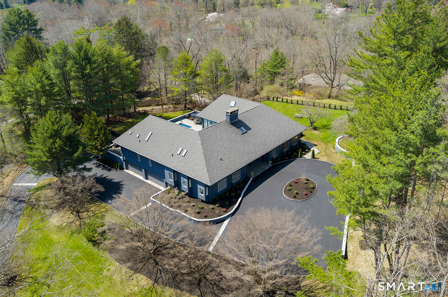Greenwich address, Stamford taxes & schools. Behind a private, tree-lined driveway on 2 beautifully landscaped acres, this exceptional backcountry compound offers approx 6,300 SF of sun-filled, single-level living at a scale rarely achieved in today's market, centered around a resort-scale gunite pool, spa, & sweeping bluestone terrace designed for seamless indoor-outdoor living. Walls of glass, skylights, & soaring cathedral ceilings create a sanctuary of proportion rarely found in single-level homes. Comprehensively renovated in 2026, the home features a custom rift-cut white oak kitchen anchored by a dramatic 6' x 12' island, complemented by designer baths, new flooring, roof, driveway, stonework, & curated landscaping throughout. The approximately 1,200 SF primary suite opens directly to the pool & offers a spa-inspired bath, infrared sauna, & steam shower. 2 additional en-suite bedrooms anchor the main residence. A fully self-contained residence within the home-featuring 2 bedrooms, full bath, living room, dining area, kitchenette, separate entrance, & independent HVAC & security-offers exceptional flexibility for extended family, live-in staff, or long-term guests. 5 bedrooms & 4.5 baths. Additional highlights incl 3 fireplaces, wet bar, 5-zone integrated surround sound, whole-house generator, & oversized 4-car garage. An additional 5,400+ SF lower level with fireplace & wine storage offers exceptional potential for future build-out.