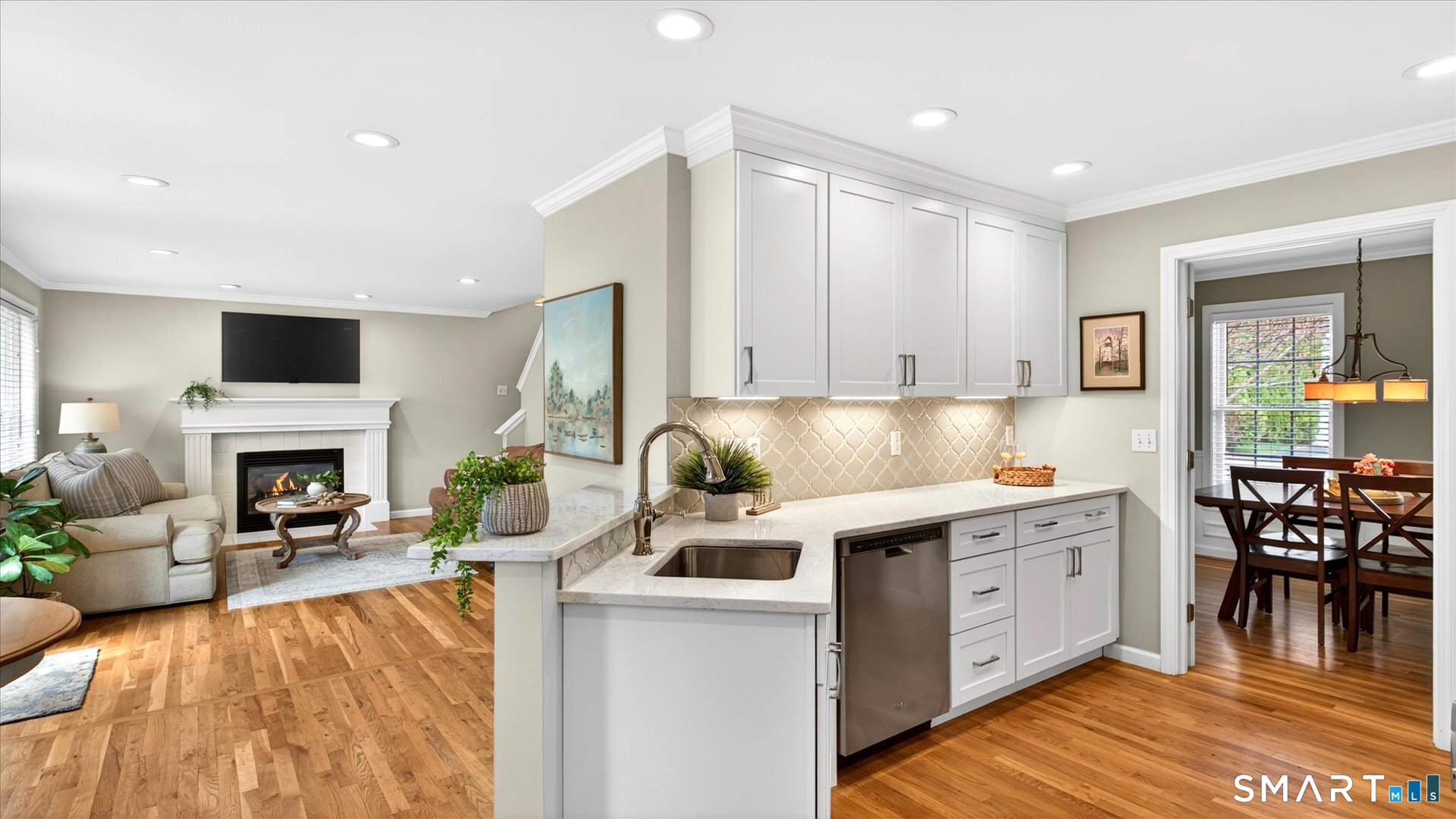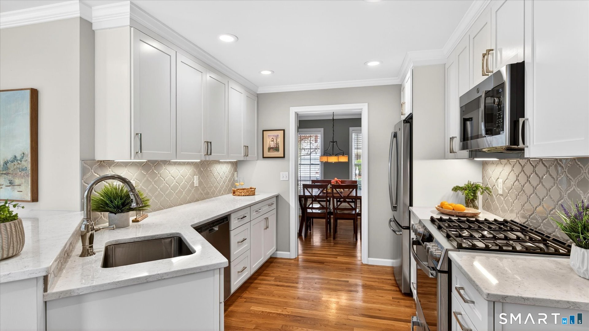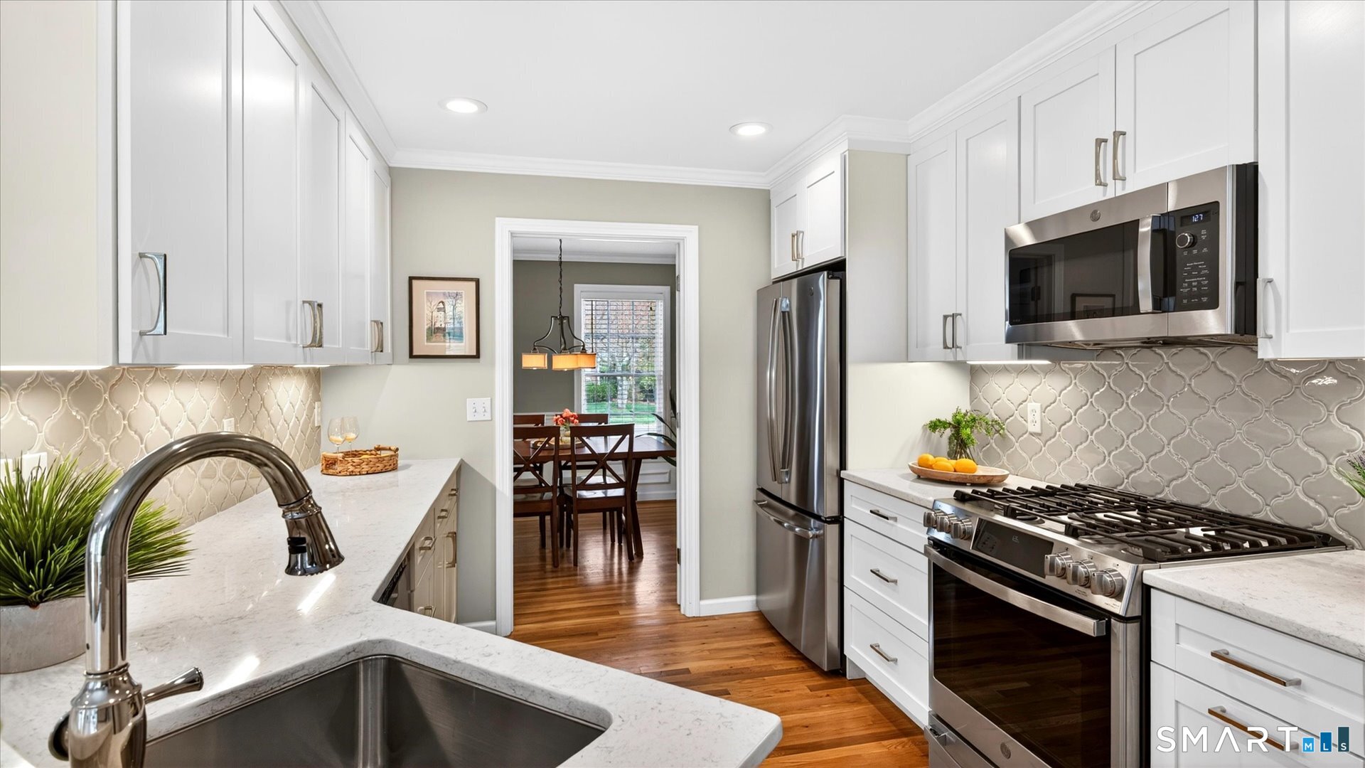Renovated and Resplendent Like the buds on the crab apple tree, portending a giant bouquet of color and fragrance, this home charms with sensory delight. Elegant, subdued colors, thoughtful mill work, polished hardwood floors, soaring windows, and inspired selections of quartz, tile, and marble orchestrate a beautiful living space. The white kitchen gleams with undercabinet lighting, bar seating, a casual dining area, and chef-level appliances. The adjacent family room is anchored by a handsome fireplace with views of the sturdy pines. Double glass French doors, offer transparent privacy in the study, while the dining room is a lovely backdrop for intimate dinners or important occasions. Upstairs, the landing area is suitable for a reading nook, with light pouring from a second story window. The primary suite is a sanctuary with a ceiling fan and gorgeously designed spa bath. All baths are renovated. The two bedrooms are well-sized with good light and closets. The lower level is suitable for a playroom, or home gym. Outside, the back patio opens to a lush, flat lawn bordered by towering pines. With a 2-car garage, a neighborhood bordered by sidewalks, and serenaded by birdsong, the bustle of nearby Rt 44 is handy but surprisingly mute. Great schools and town amenities round out this exceptional home. Improvements include: New Roof (2019);Recently renovated Kitchen and baths; replaced front pavers; replaced garage door openers.