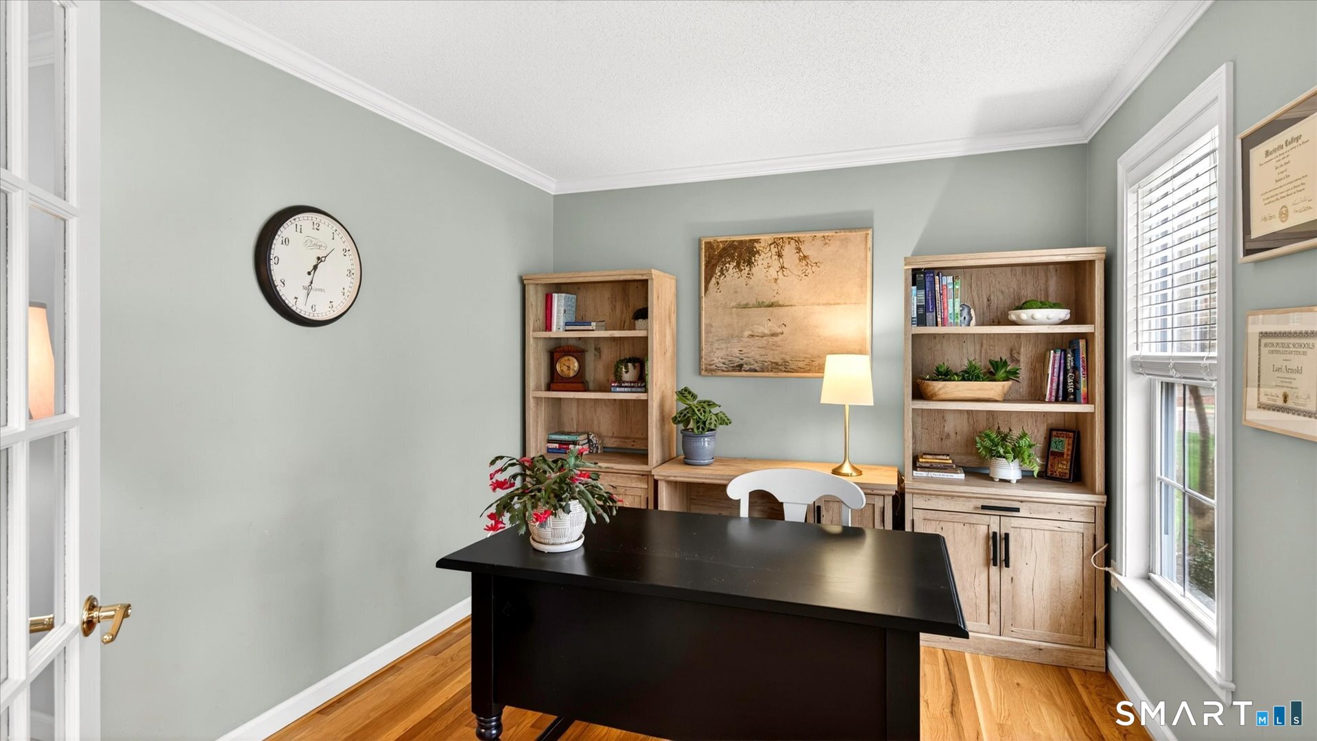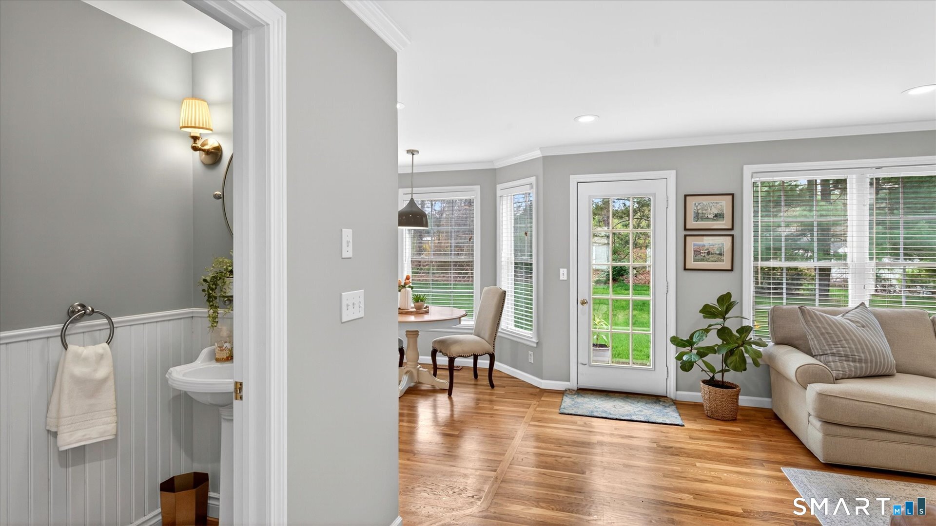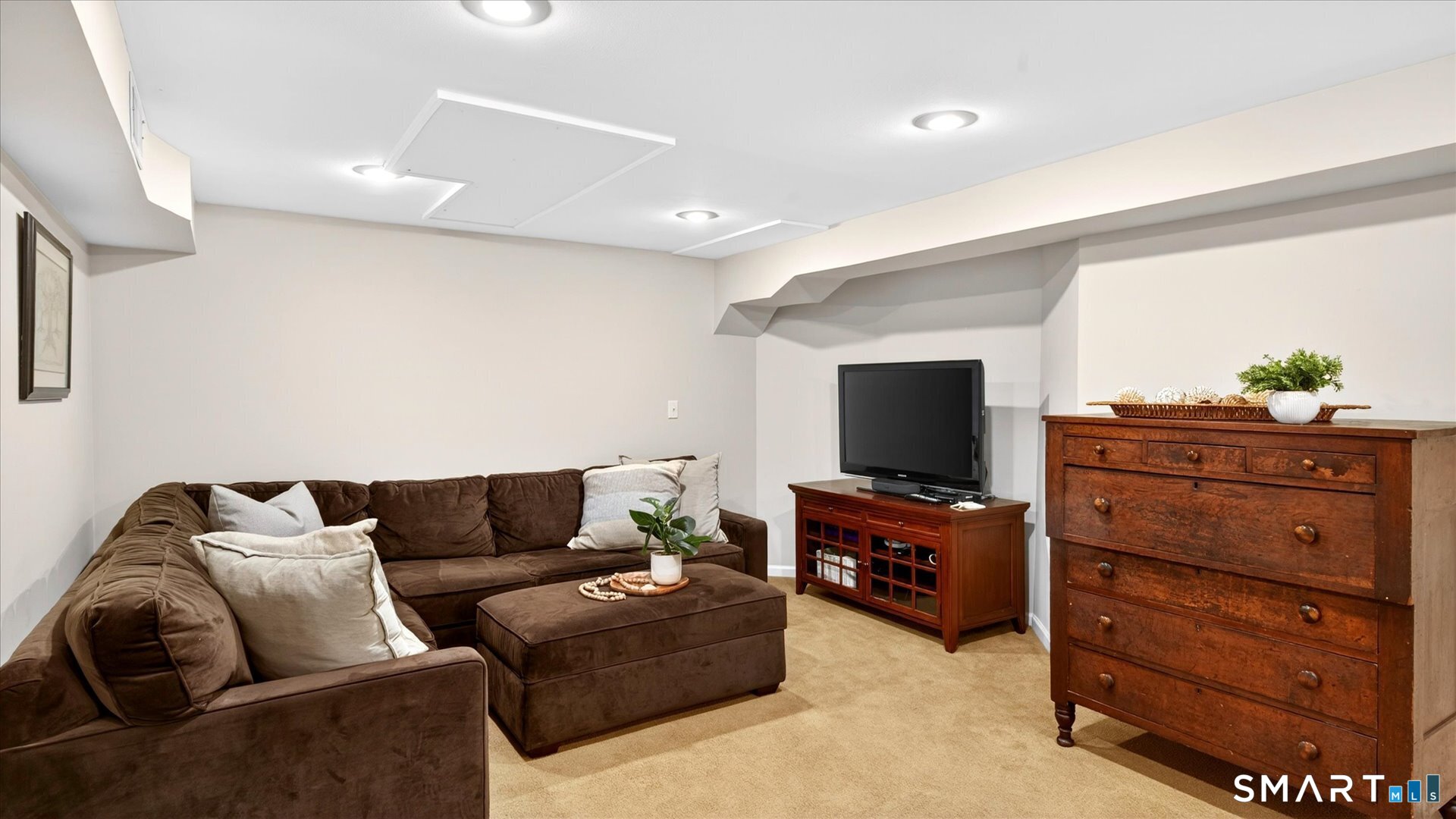 Renovated and Resplendent Like the buds on the crab apple tree, portending a giant bouquet of color and fragrance, this home charms with sensory delight. Elegant, subdued colors, thoughtful mill work, polished hardwood floors, soaring windows, and inspired selections of quartz, tile, and marble orchestrate a beautiful living space. The white kitchen gleams with undercabinet lighting, bar seating, a casual dining area, and chef-level appliances. The adjacent family room is anchored by a handsome fireplace with views of the sturdy pines. Double glass French doors, offer transparent privacy in the study, while the dining room is a lovely backdrop for intimate dinners or important occasions. Upstairs, the landing area is suitable for a reading nook, with light pouring from a second story window. The primary suite is a sanctuary with a ceiling fan and gorgeously designed spa bath. All baths are renovated. The two bedrooms are well-sized with good light and closets. The lower level is suitable for a playroom, or home gym. Outside, the back patio opens to a lush, flat lawn bordered by towering pines. With a 2-car garage, a neighborhood bordered by sidewalks, and serenaded by birdsong, the bustle of nearby Rt 44 is handy but surprisingly mute. Great schools and town amenities round out this exceptional home. Improvements include: New Roof (2019);Recently renovated Kitchen and baths; replaced front pavers; replaced garage door openers.