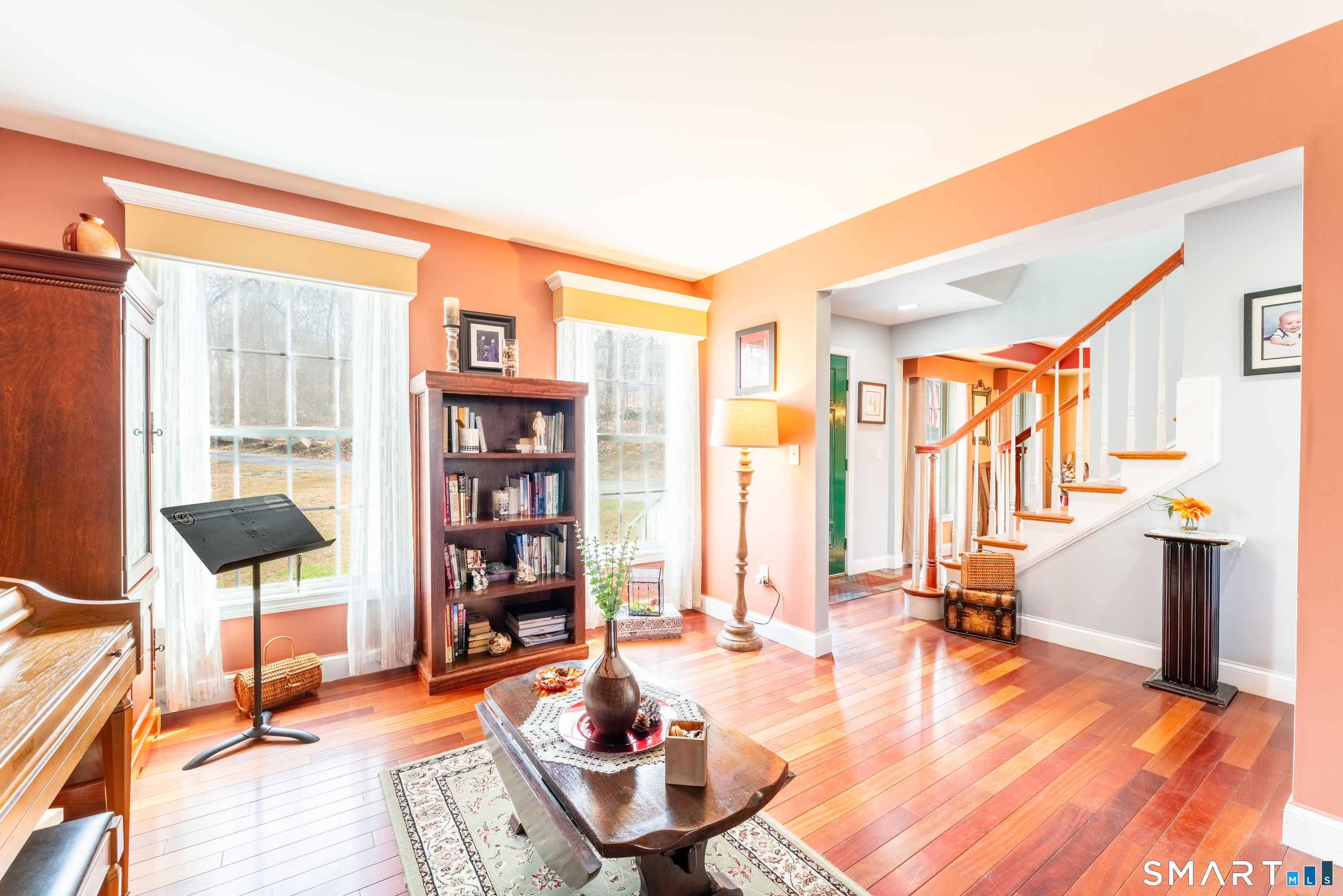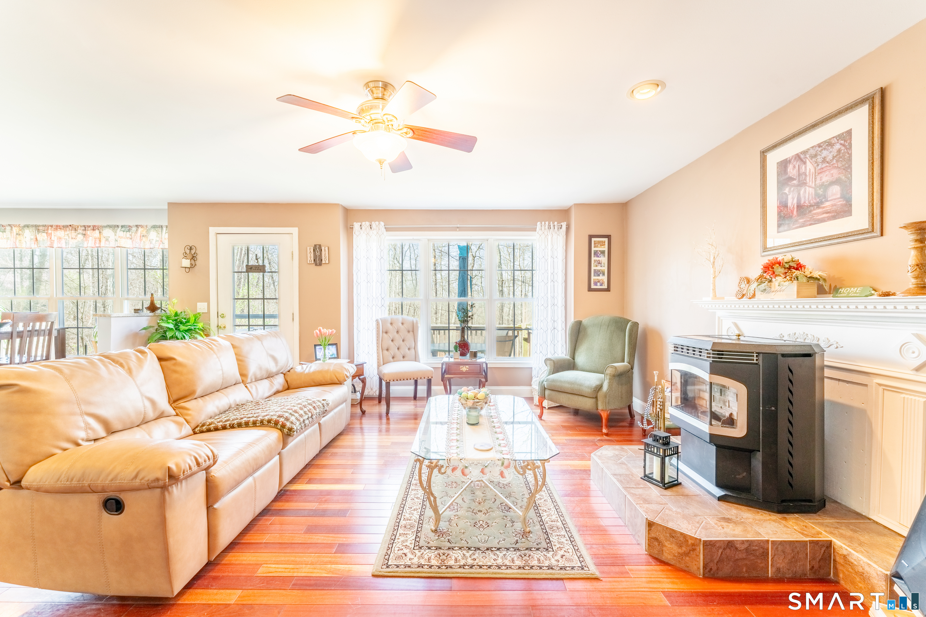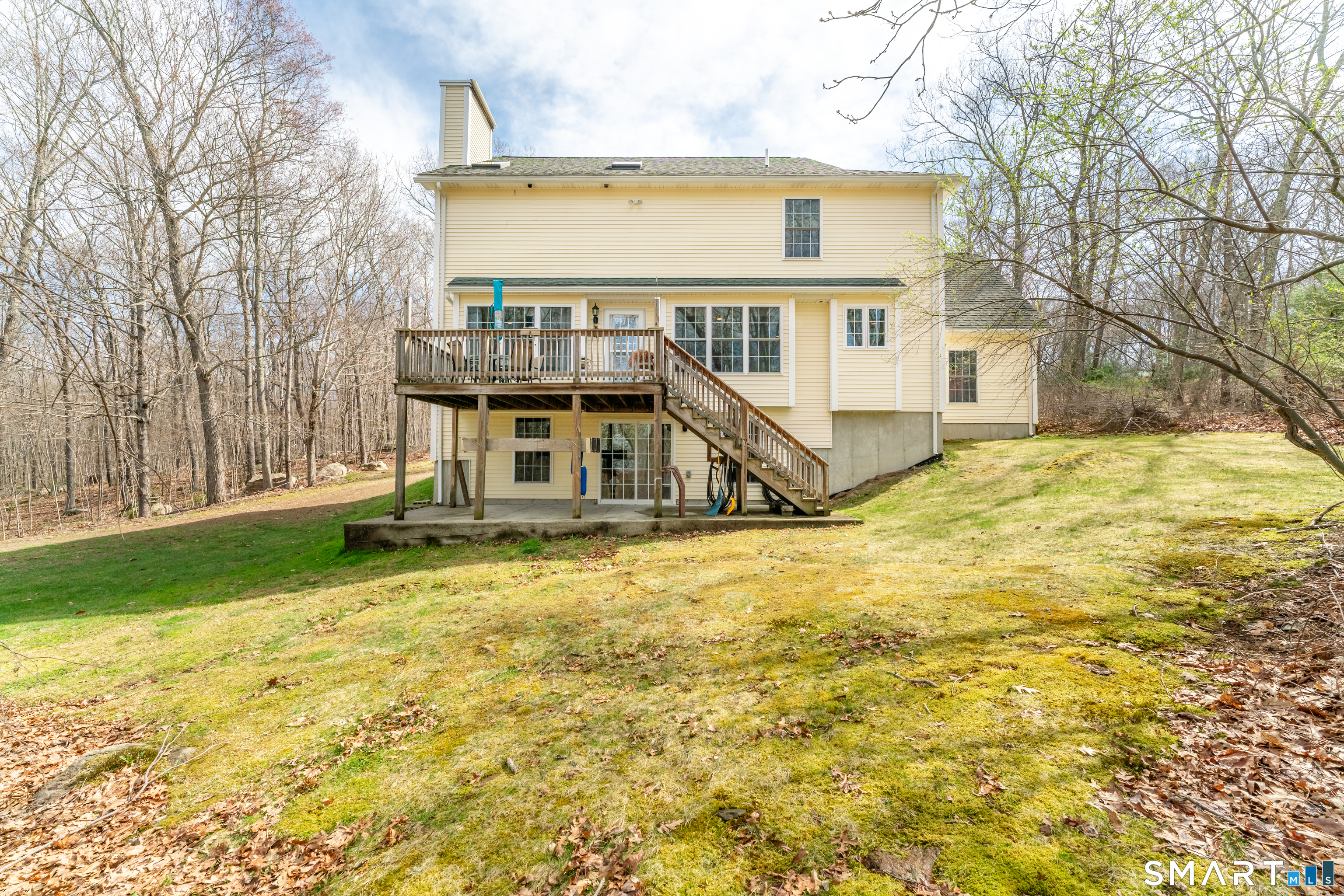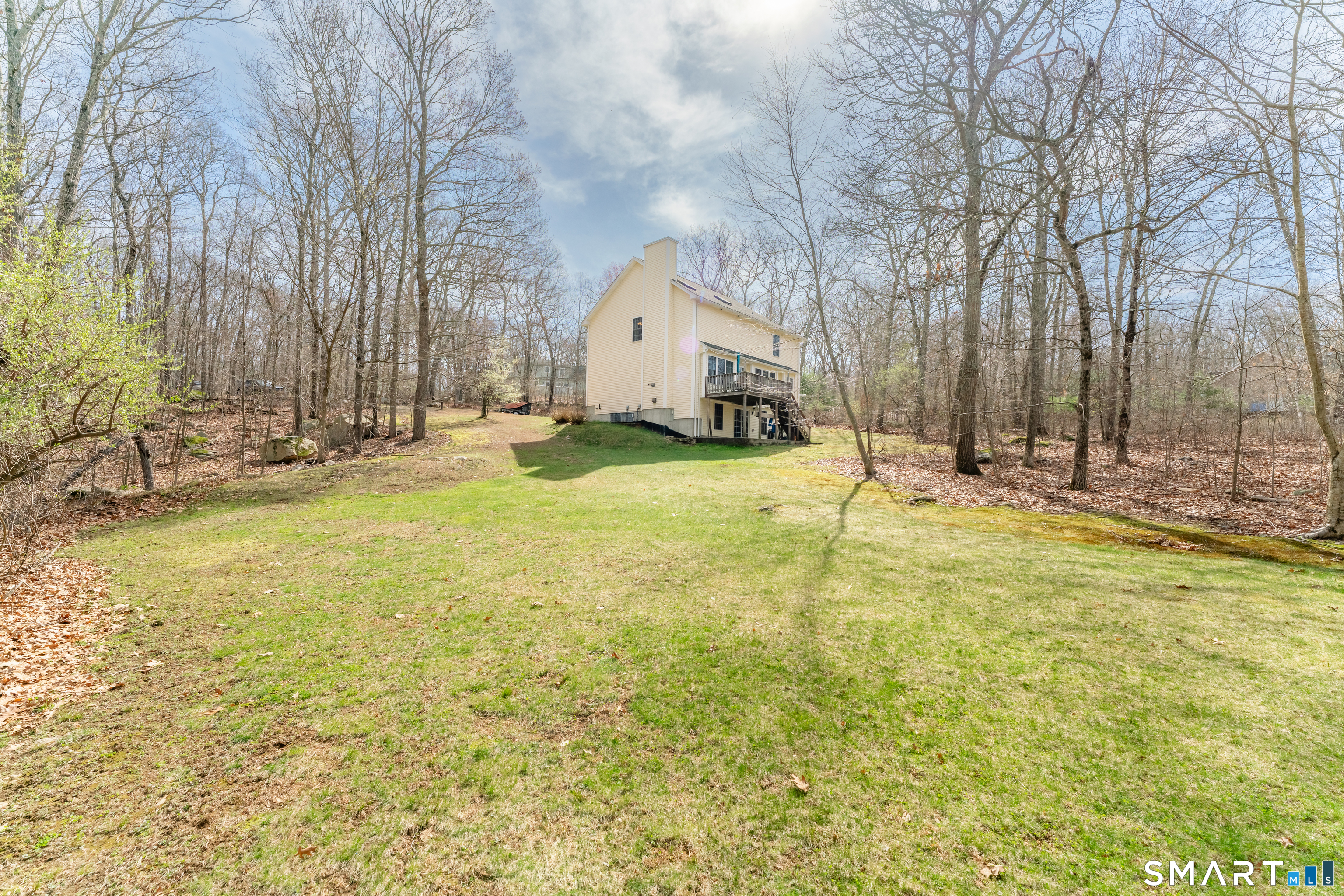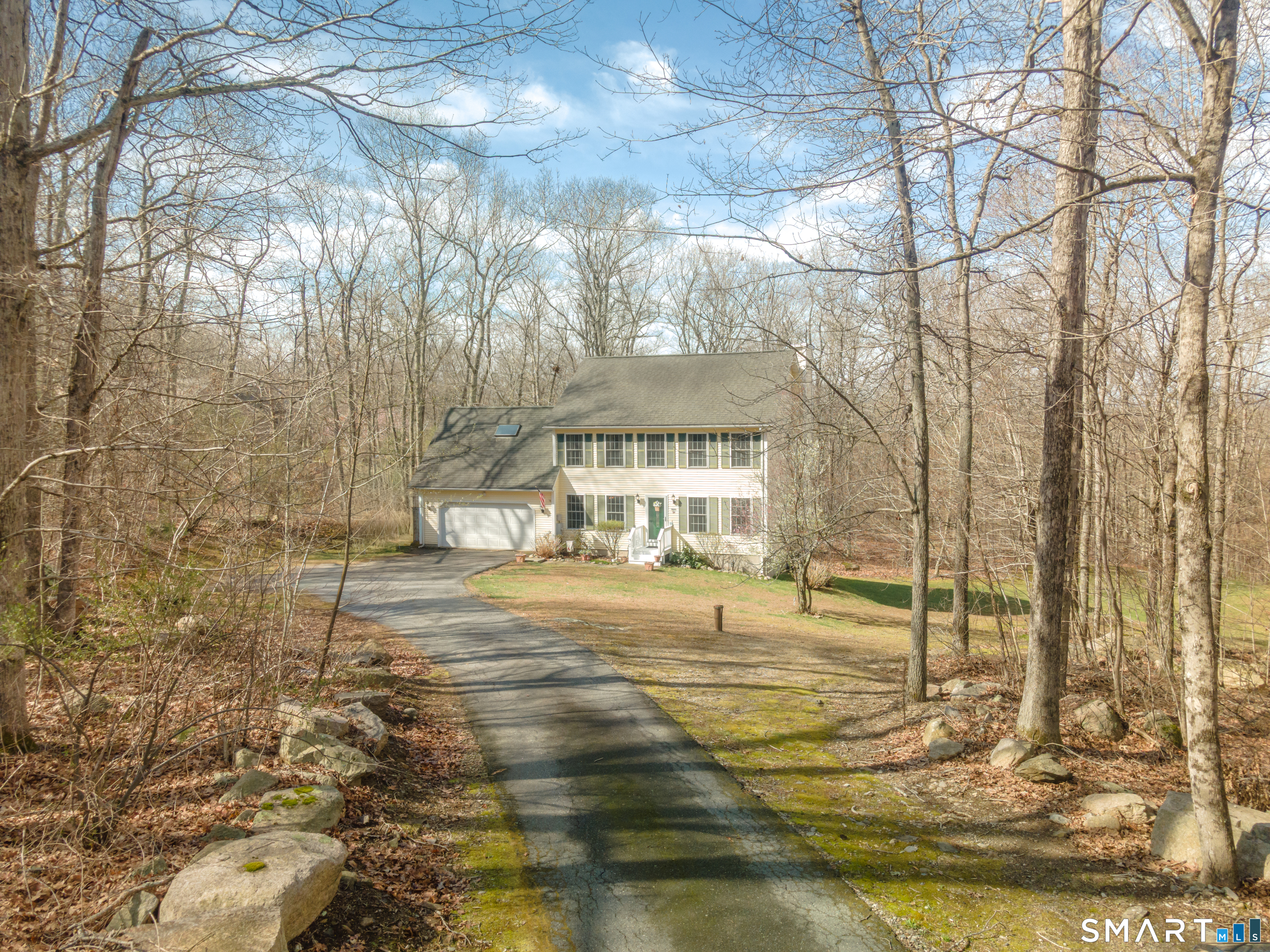 Warm, welcoming, and clearly loved, this 4-bedroom, 2.5-bath home offers comfort and privacy that instantly makes you feel at home. From the moment you step inside, gleaming hardwood floors, crown molding, and tray ceilings add character and warmth throughout the living spaces. The bright kitchen features granite countertops, stainless appliances, and abundant cabinetry, opening to a large living room with a cozy pellet stove, perfect for gathering with family and friends. Just off the living room is a cozy music den, ideal for a reading nook or office. The formal dining room with tray ceiling provides an elegant setting for entertaining. Upstairs, the spacious primary suite with tray ceiling, walk-in closet, and private bath offers a peaceful retreat. Three additional bedrooms provide plenty of room for family or guests, and second-floor laundry adds everyday convenience. The walk-out basement offers great storage or the opportunity to finish for additional living space. Additional highlights include central air, generator hookup, and a two-car garage. Situated on just over 5 private acres, this property offers room to relax and enjoy nature while still being conveniently located near I-395 with easy commutes to Hartford, Rhode Island, and Massachusetts.