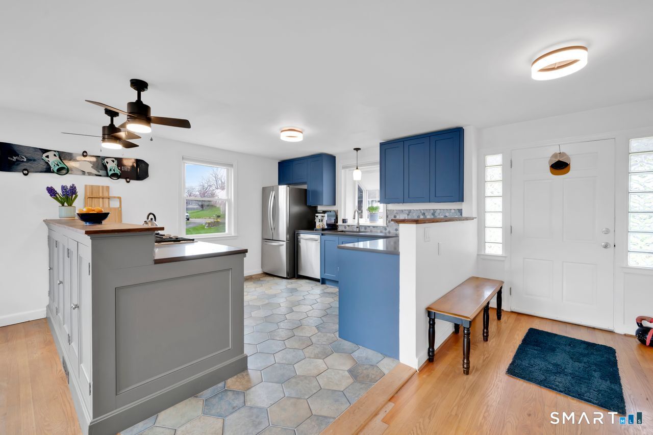 Charming and thoughtfully updated ranch offering easy, single-level living with standout features throughout. The open-concept living area is bright and inviting, complemented by hardwood floors and a beautifully updated kitchen featuring stone countertops, inset, soft close cabinetry and a premium Wolf gas cooktop. A raised breakfast counter crafted from 100 year old reclaimed wood adds warmth, character and unique talking point in the kitchen. A true highlight for any home chef. Step outside to a spacious backyard designed for enjoyment, complete with a newer pressure treated deck, fruit tree and a large shed for added storage. Unwind in the gazebo beside the effortless glow of the gas fire pit, where quiet evenings settle in with warmth and ease. The gazebo is wired for electric and has a new fan. Whether entertaining or relaxing, this outdoor space delivers. The walkout lower level provides clean, versatile space for storage, hobbies, or future expansion. Additional features include a garage, carport, Solar panels for long-term energy savings and efficiency. Central air conditioning just in time for summer! A well-maintained and move-in ready home that lives larger than its footprint. Offering comfort, updates, and value at an approachable price point. OFFERS DUE SATURDAY 4/25
