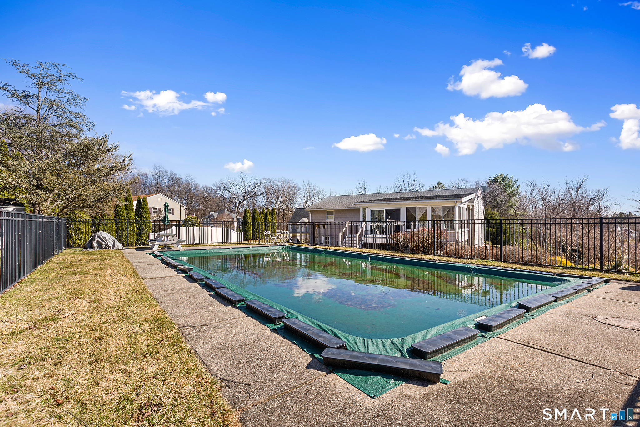 Something special awaits in Wolcott! Tucked away in a quiet suburban enclave, 1 Deer Run Rd sits on a sprawling corner lot with beautiful grounds & a stunning in-ground pool. Step inside to a sun-drenched floor plan boasting gleaming hardwood floors, updated lighting, & surprisingly generous proportions. Oversized windows & a cozy gas fireplace anchor the expansive living area, flowing seamlessly into a well-sized dining space. The kitchen features stainless steel appliances, granite counters, & a handsome tile backsplash. The massive heated sunroom is a true game-changer. Serving as a versatile flex space, it effortlessly levels up your daily life & hosting capabilities. Walls of windows overlook your rolling lawn & the star of the show: a fully fenced pool with all-new mechanicals! Your dream outdoor entertaining setup continues with a separate paver patio, fire pit, flat side yard, & lovely garden beds. Back inside, 3 cheery bedrooms share a fully tiled hall bath with convenient main-level laundry. The daylit lower level features a 2nd gas fireplace & serves as the ultimate hangout space, with the versatility for a media room, playroom, or guest quarters, complete with an adjacent 2nd full bath. Attached 2-car garage with extra hobby space rounds out 1st fl. Newer mini-splits provide efficient heating & cooling. This property offers a complete lifestyle upgrade! It's not just the perfect house for you; it's the one your friends & family will want you to buy!