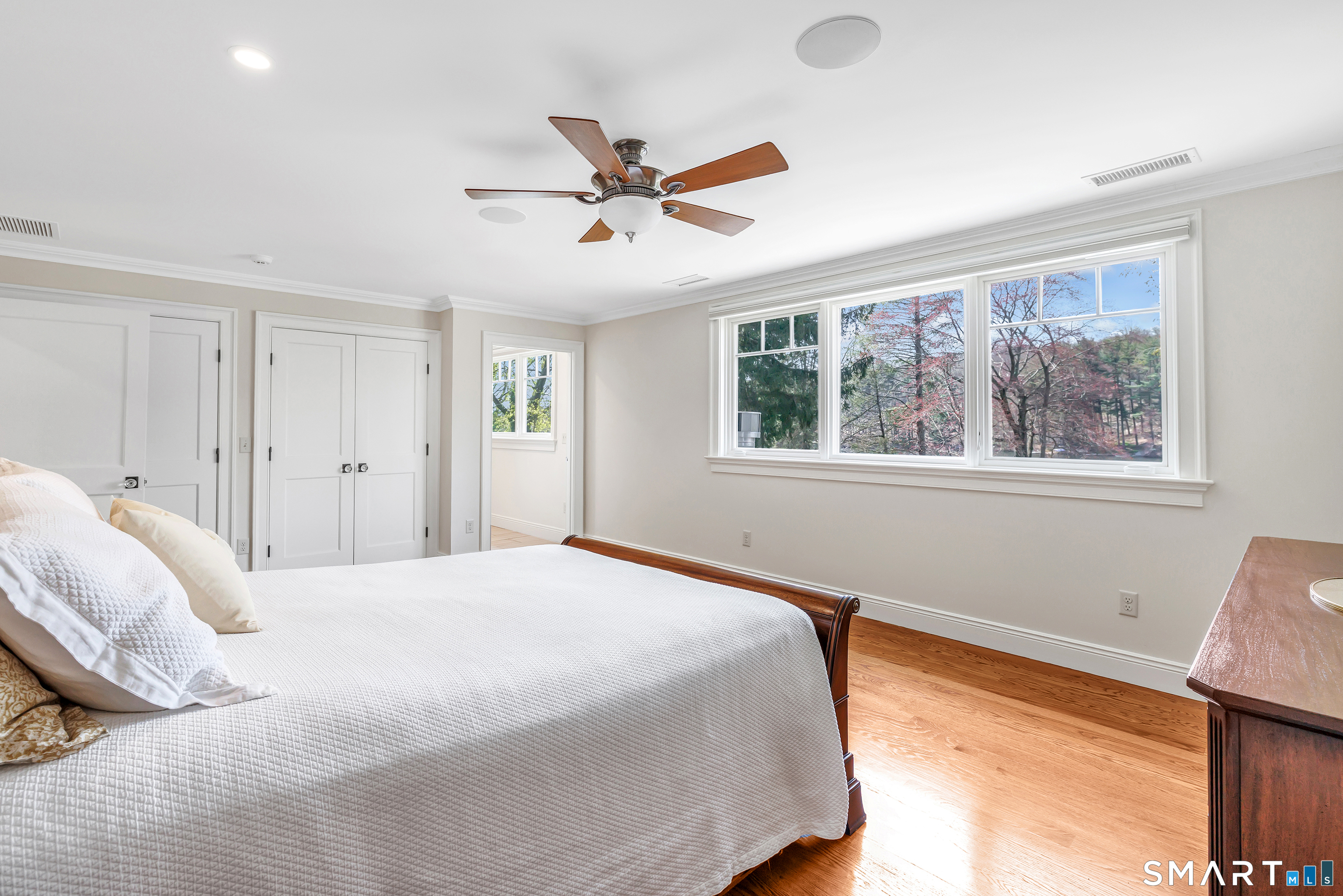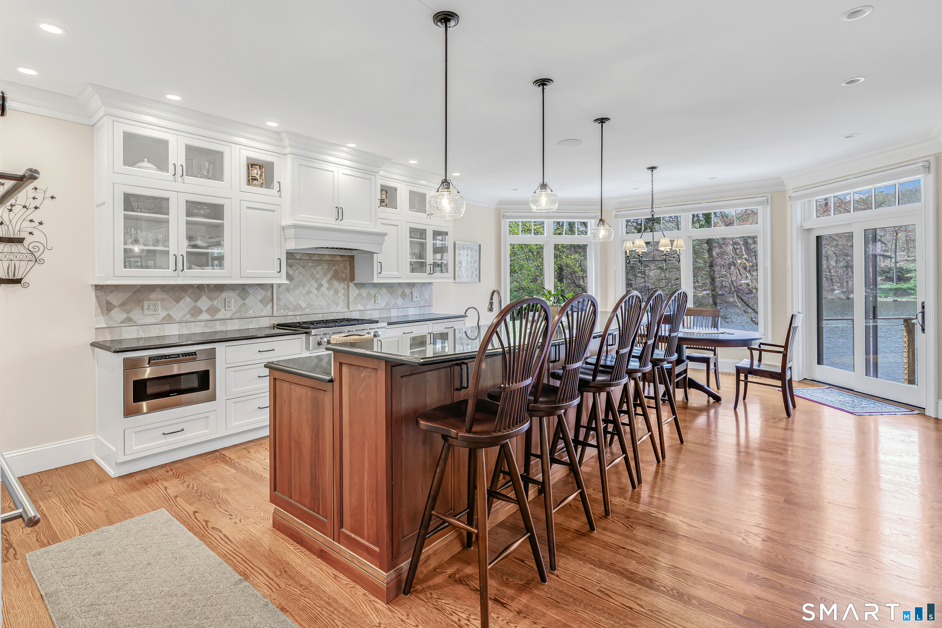 Welcome to 161 Pinewood Trail, a beautifully crafted 2017 Colonial offering over 7,000 square feet of thoughtfully designed living space across 3 finished levels, with stunning lake views & over 80 feet of private frontage. The open-concept main level features a grand two-story foyer and spacious great room with coffered ceiling and double-sided gas fireplace shared with the formal dining room, plus a chef's kitchen with Sub-Zero refrigerator, Wolf six-burner cooktop and hood, GE Monogram double wall oven, Bosch dishwasher, and large island with seating for 5, with 4 sets of French doors opening to a rear deck & bluestone patio for effortless indoor-outdoor entertaining. Upstairs, the primary suite offers multiple closets and a spa-style bath with Bain Ultra air jet tub, large tiled shower, dual vanity, & serene lake views, complemented by 2 additional bedrooms, an additional full bath & a dedicated laundry room with sink. The finished walkout lower level adds the 4th bedroom, full bath, family room w/ kitchenette, sunroom w/wall of windows overlooking the water, dedicated gym w/rubber flooring, all opening to the rear patio within easy reach of the water's edge. Designed for every chapter of life, this home provides rare luxury and accessibility with an elevator serving all three levels, wide hallways and doorways for wheelchair access, first-floor roll-in shower, safety handrails, step-free heated front entrance, and a fully accessible pathway from the house to the wate