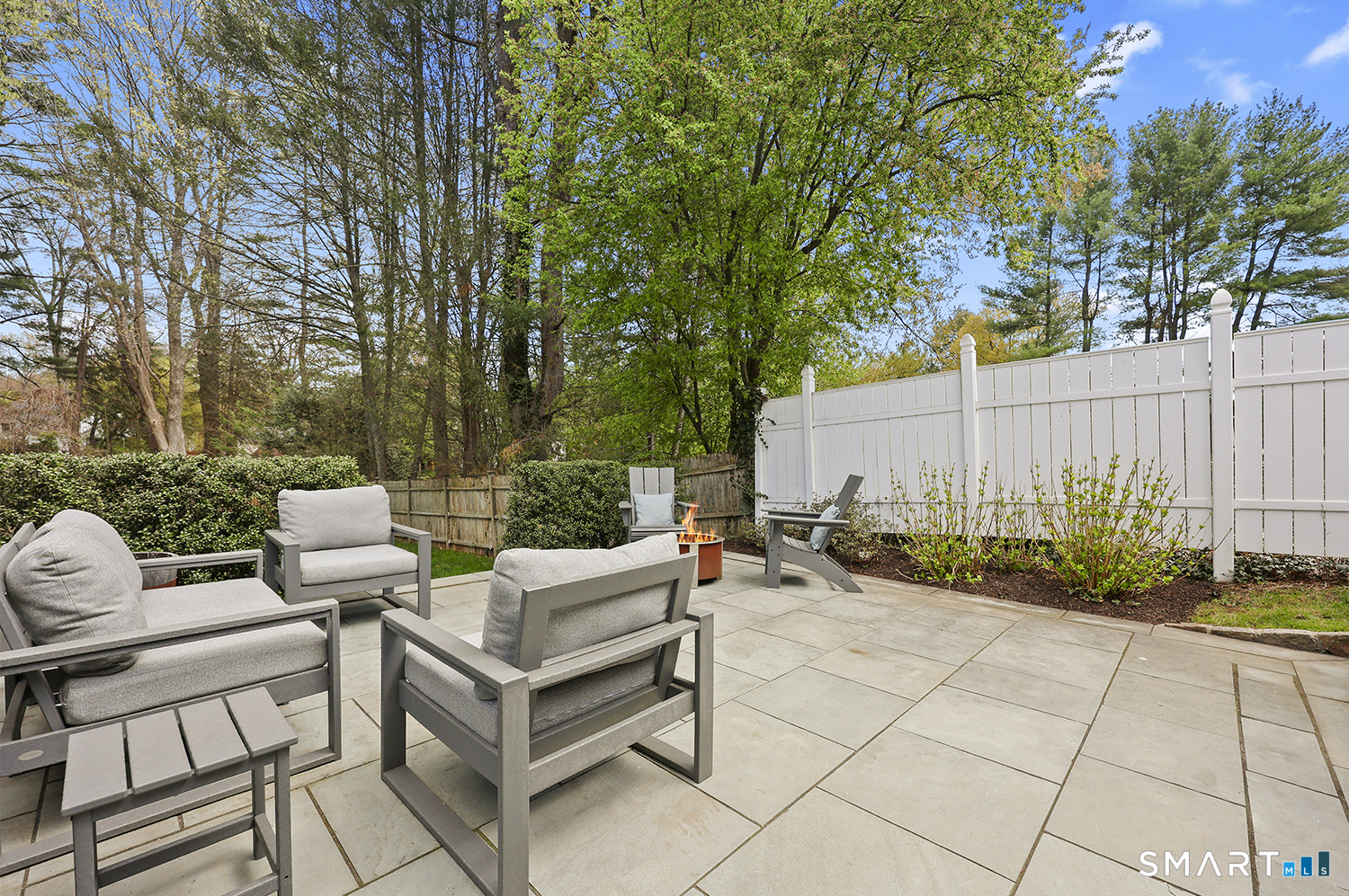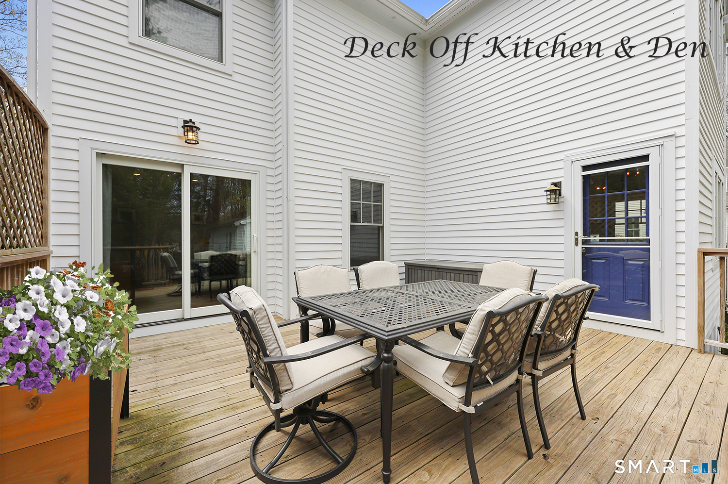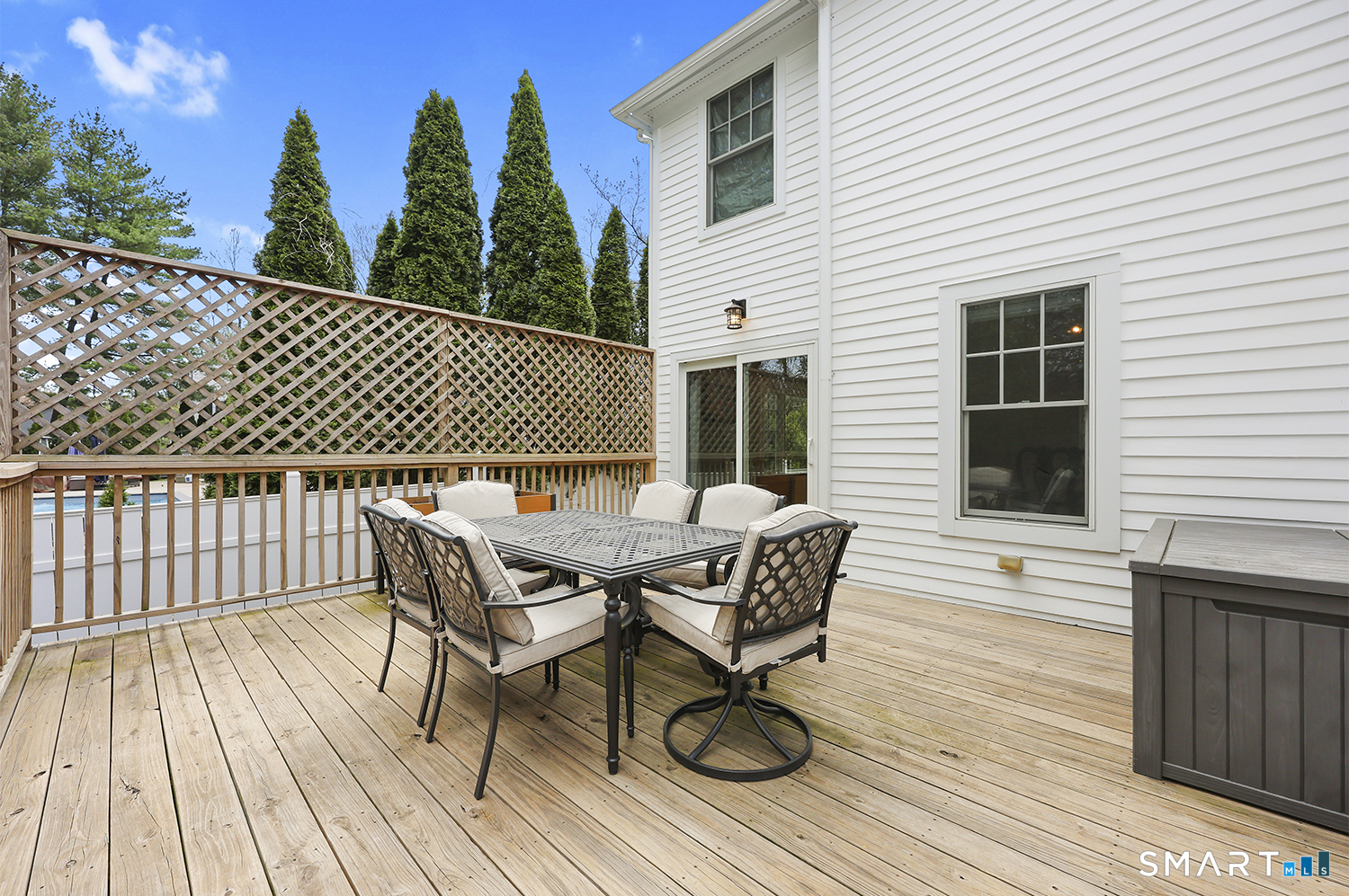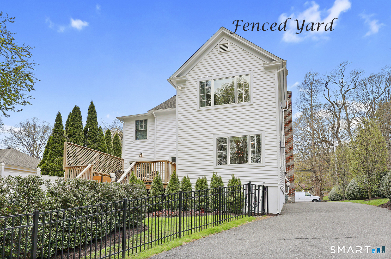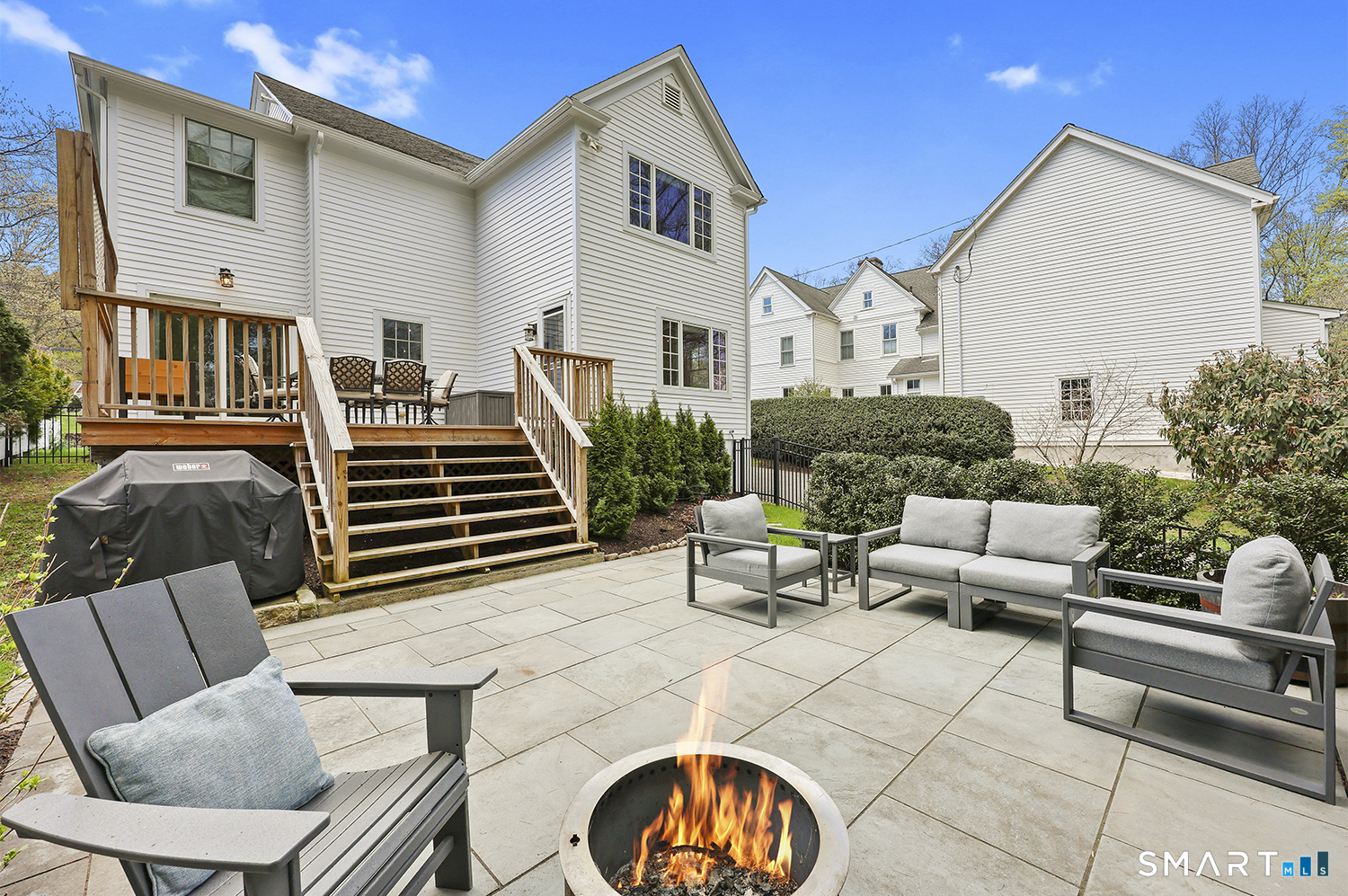 This sweet home is located on a desirable, convenient street nestled between Southport and Greenfield Hill. Enjoy an open first floor with a chef's kitchen featuring premium stainless-steel appliances, a waterfall quartz countertop, and a spacious eat-in area. A separate den/flex space behind a half wall provides a perfect spot for work or play, distinct from the living area. The first floor also includes a large dining area, cozy seating, and a gas fireplace. Two access points lead to an expansive deck and patio, ideal for outdoor entertaining. Upstairs, there are four bedrooms (one without a closet, so the tax card lists it as a three-bed), all with hardwood floors. The primary bedroom boasts a vaulted ceiling, a large picture window, a walk-in closet with custom built-ins, and a spa-like bath with a whirlpool tub and separate shower. The other bedrooms share an updated full bath. The finished third level offers versatile space for a workout room or office. The lower level houses the laundry and ample storage. An unfinished area above the two-car garage could become an art studio or guest suite. The private, level yard includes an irrigation system and a peaceful brook behind the fence. Conveniently located near shopping, schools, and commuting routes. Great walking options including an arboretum steps away. New assessment/taxes not reflected until July 2026.