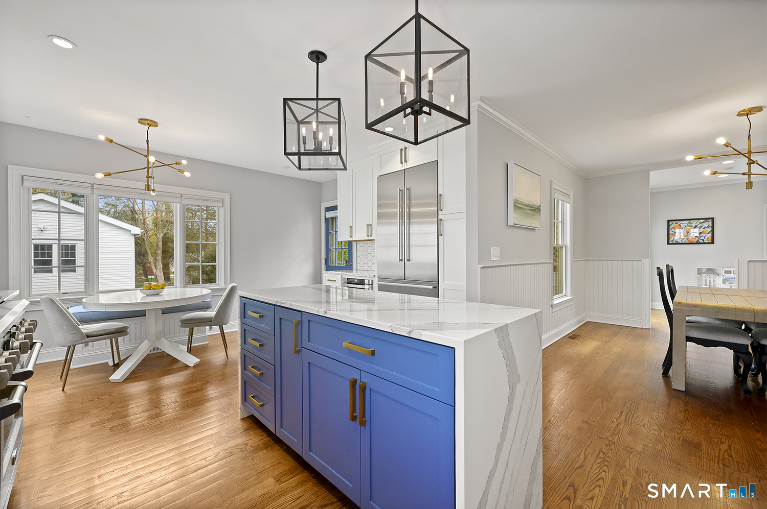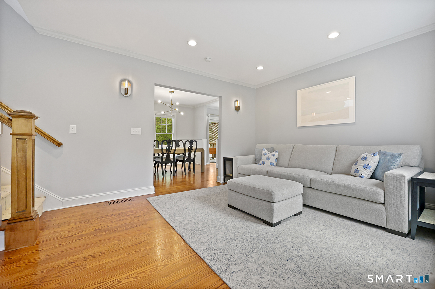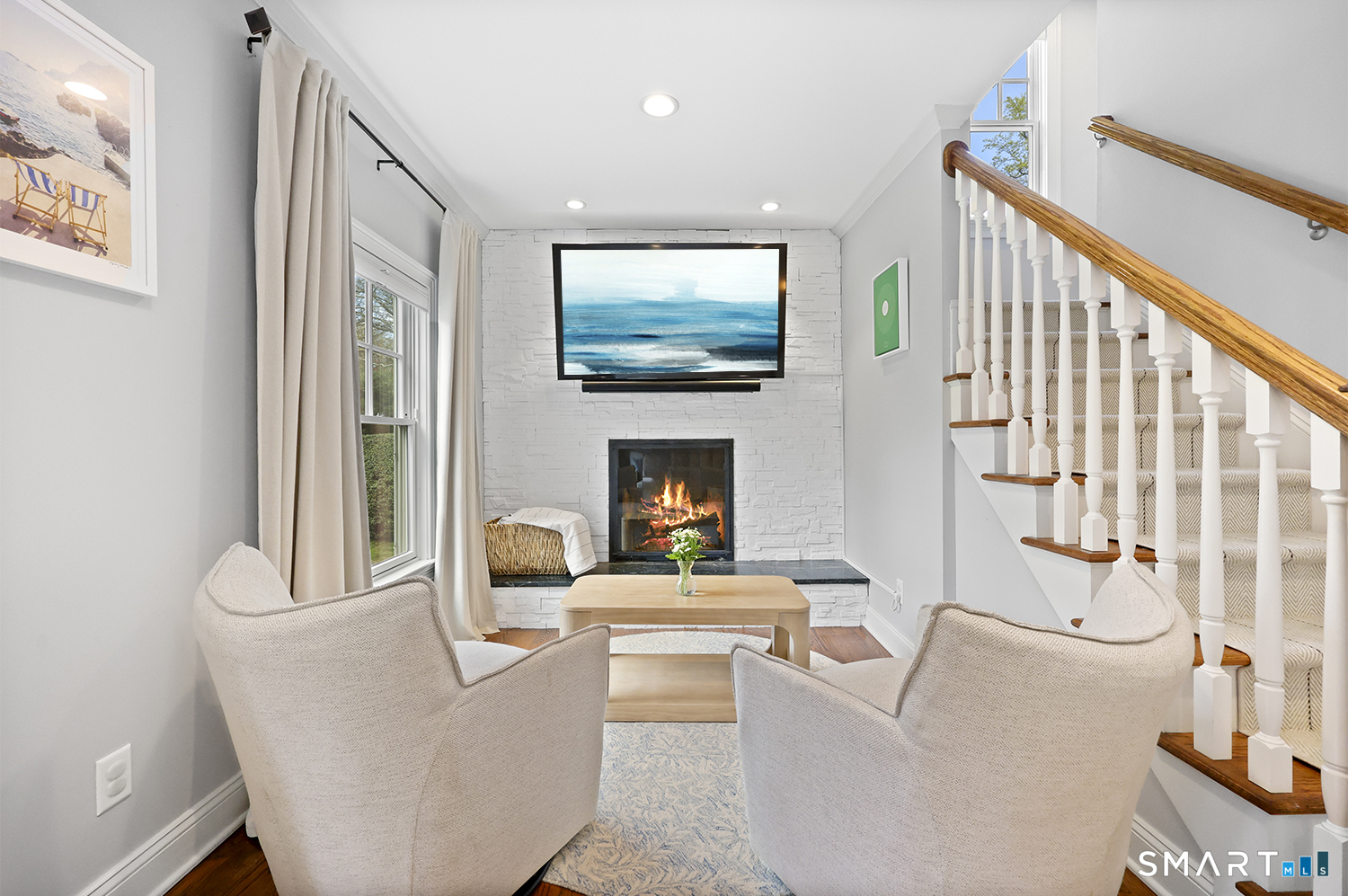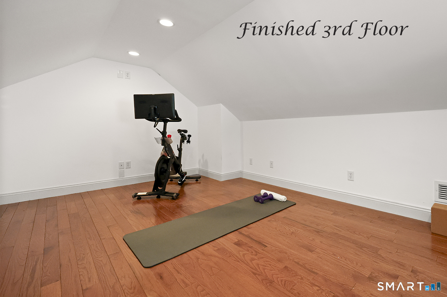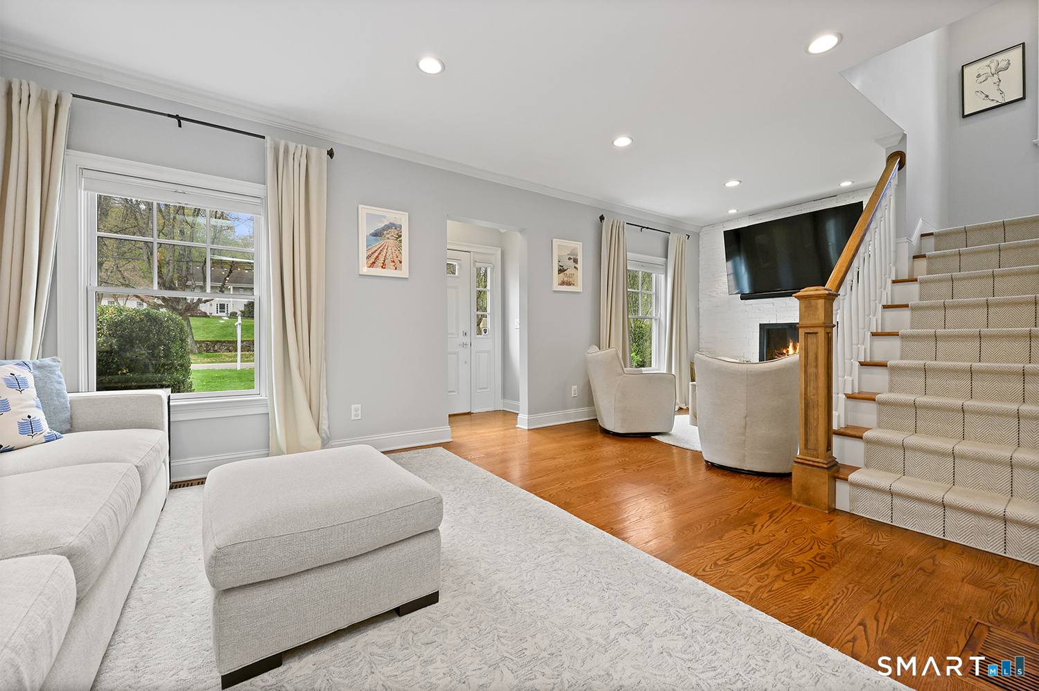 This sweet home is located on a desirable, convenient street nestled between Southport and Greenfield Hill. Enjoy an open first floor with a chef's kitchen featuring premium stainless-steel appliances, a waterfall quartz countertop, and a spacious eat-in area. A separate den/flex space behind a half wall provides a perfect spot for work or play, distinct from the living area. The first floor also includes a large dining area, cozy seating, and a gas fireplace. Two access points lead to an expansive deck and patio, ideal for outdoor entertaining. Upstairs, there are four bedrooms (one without a closet, so the tax card lists it as a three-bed), all with hardwood floors. The primary bedroom boasts a vaulted ceiling, a large picture window, a walk-in closet with custom built-ins, and a spa-like bath with a whirlpool tub and separate shower. The other bedrooms share an updated full bath. The finished third level offers versatile space for a workout room or office. The lower level houses the laundry and ample storage. An unfinished area above the two-car garage could become an art studio or guest suite. The private, level yard includes an irrigation system and a peaceful brook behind the fence. Conveniently located near shopping, schools, and commuting routes. Great walking options including an arboretum steps away. New assessment/taxes not reflected until July 2026.