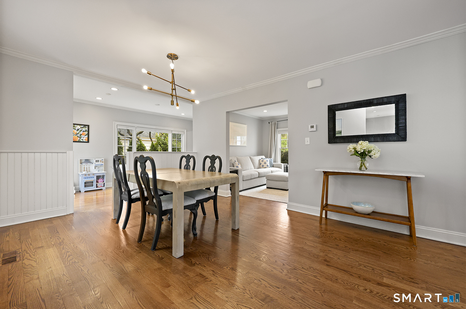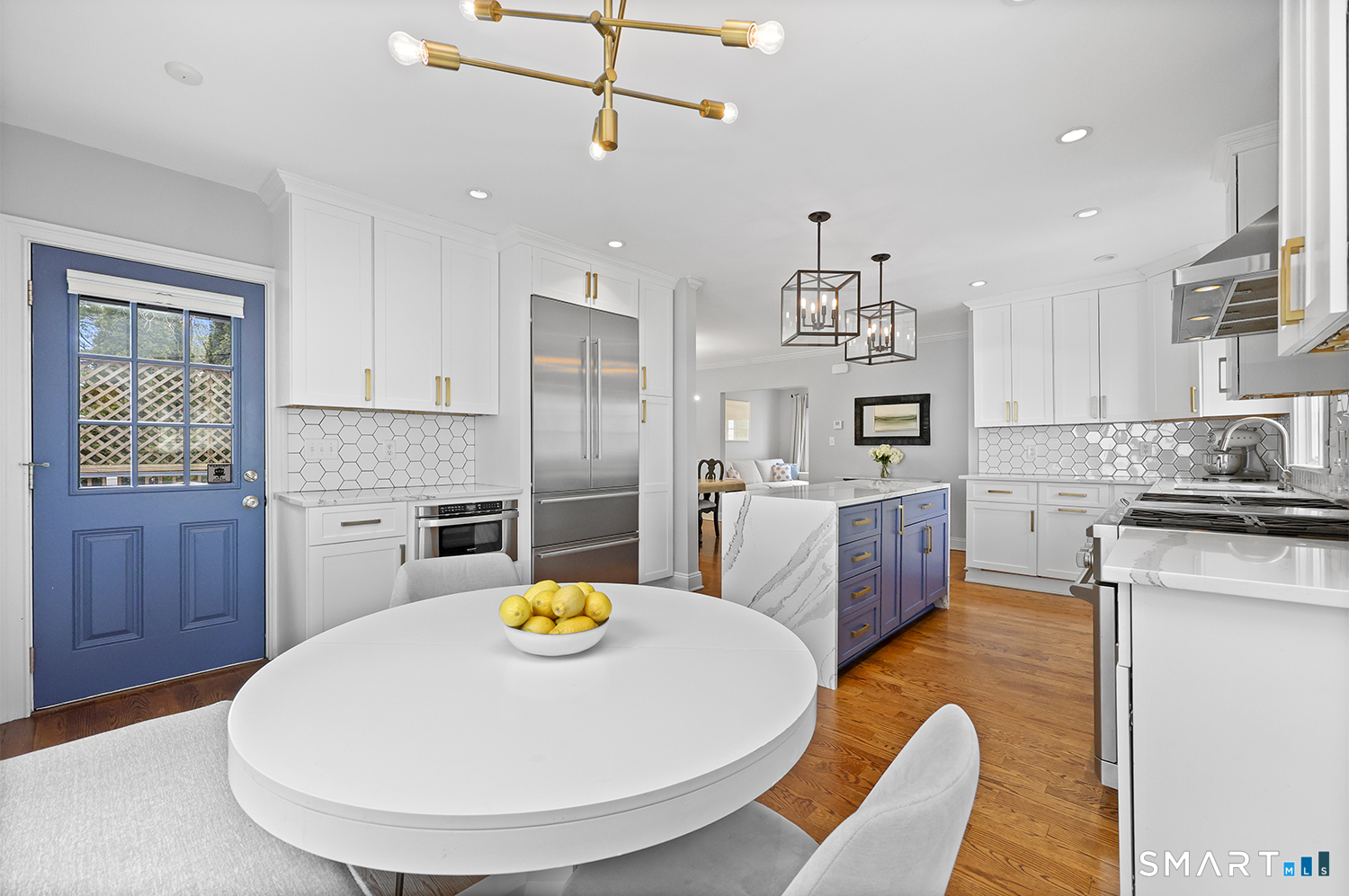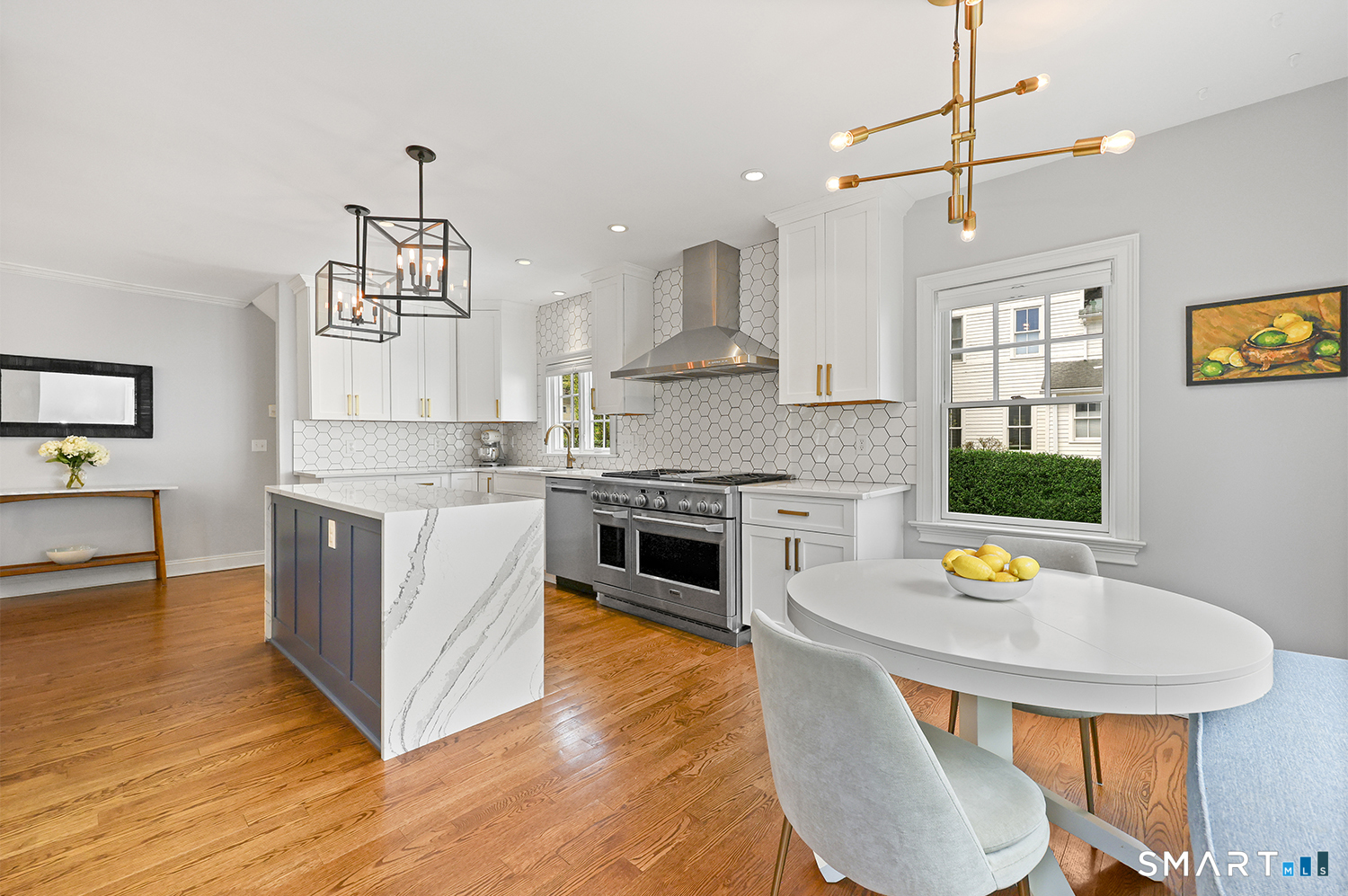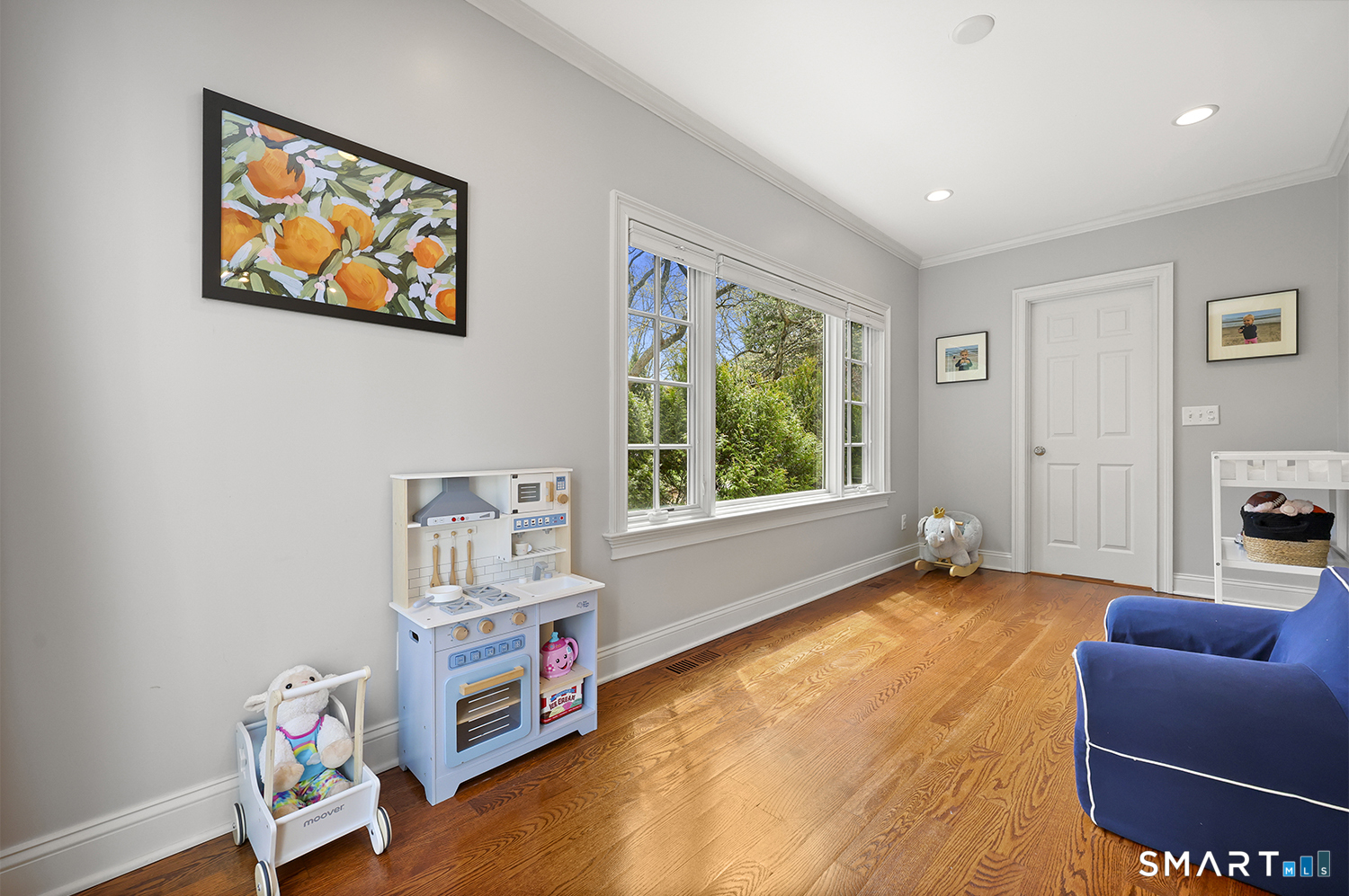 This sweet home is located on a desirable, convenient street nestled between Southport and Greenfield Hill. Enjoy an open first floor with a chef's kitchen featuring premium stainless-steel appliances, a waterfall quartz countertop, and a spacious eat-in area. A separate den/flex space behind a half wall provides a perfect spot for work or play, distinct from the living area. The first floor also includes a large dining area, cozy seating, and a gas fireplace. Two access points lead to an expansive deck and patio, ideal for outdoor entertaining. Upstairs, there are four bedrooms (one without a closet, so the tax card lists it as a three-bed), all with hardwood floors. The primary bedroom boasts a vaulted ceiling, a large picture window, a walk-in closet with custom built-ins, and a spa-like bath with a whirlpool tub and separate shower. The other bedrooms share an updated full bath. The finished third level offers versatile space for a workout room or office. The lower level houses the laundry and ample storage. An unfinished area above the two-car garage could become an art studio or guest suite. The private, level yard includes an irrigation system and a peaceful brook behind the fence. Conveniently located near shopping, schools, and commuting routes. Great walking options including an arboretum steps away. New assessment/taxes not reflected until July 2026.