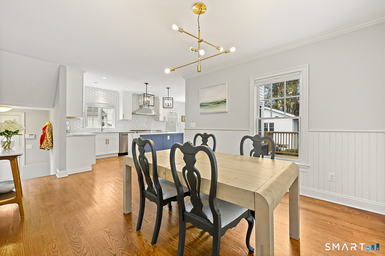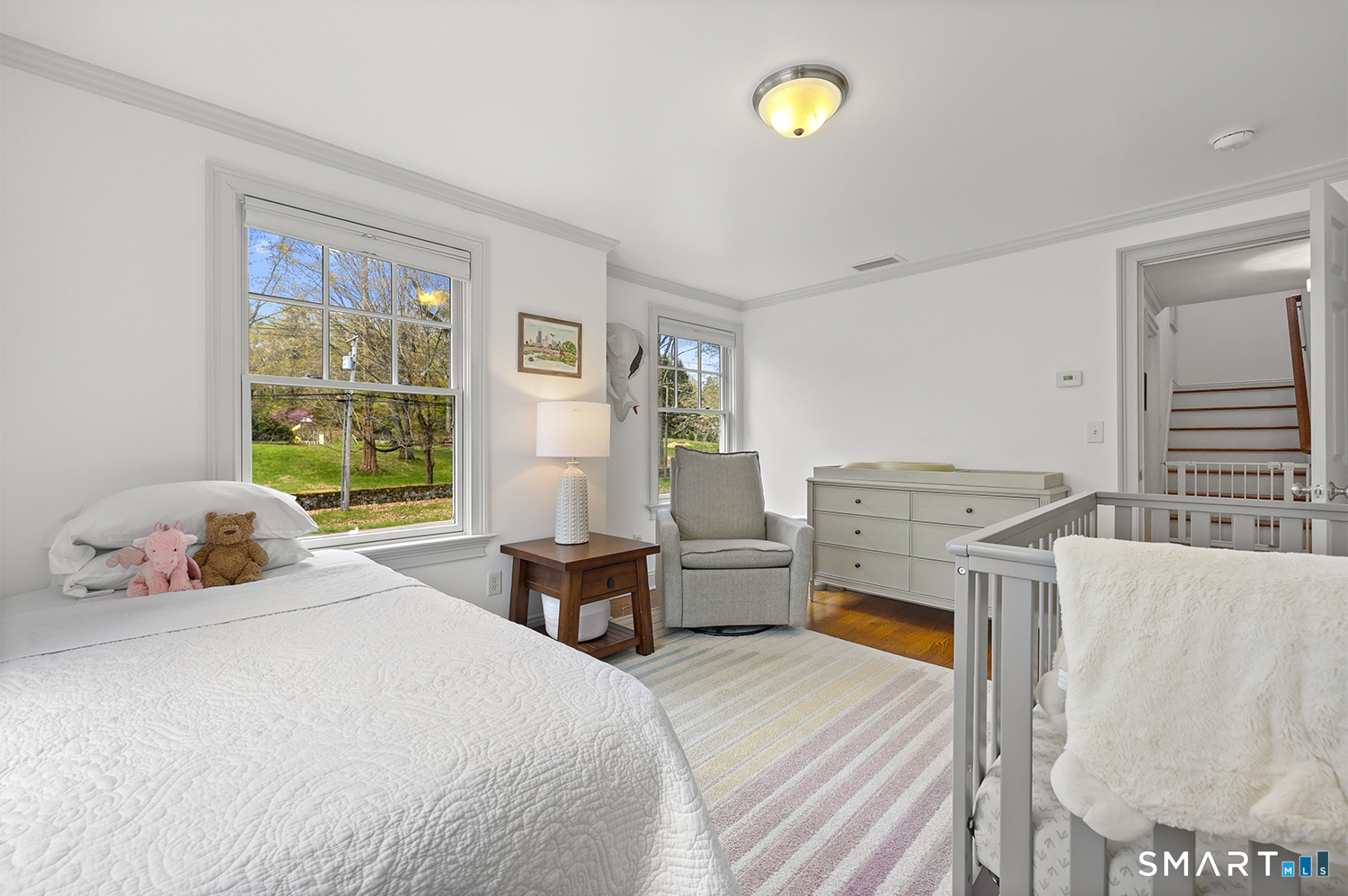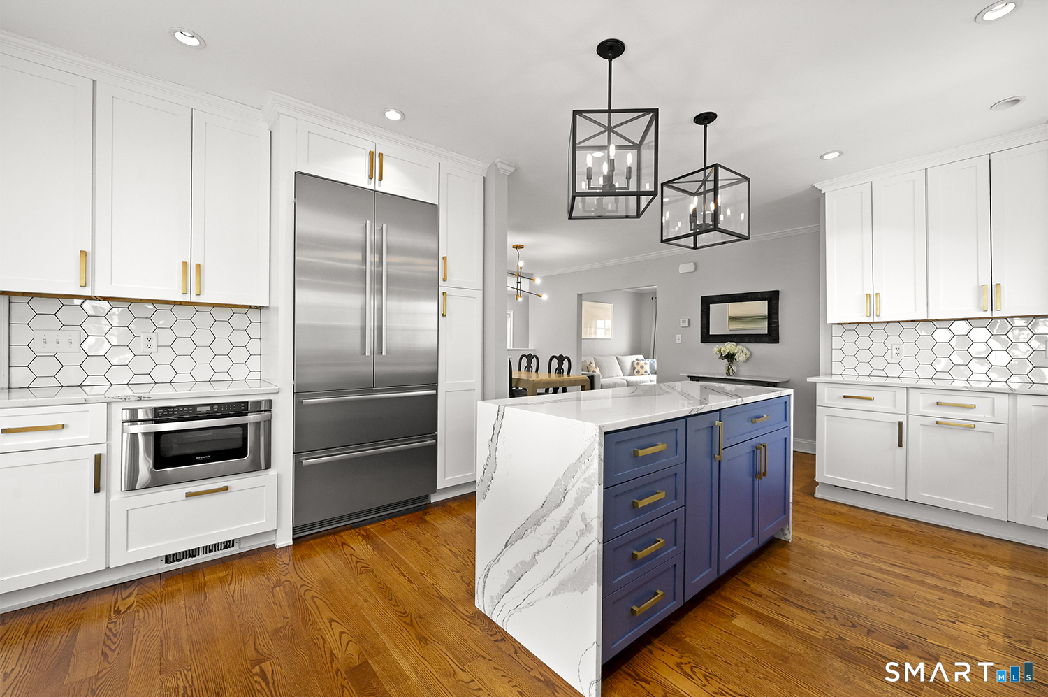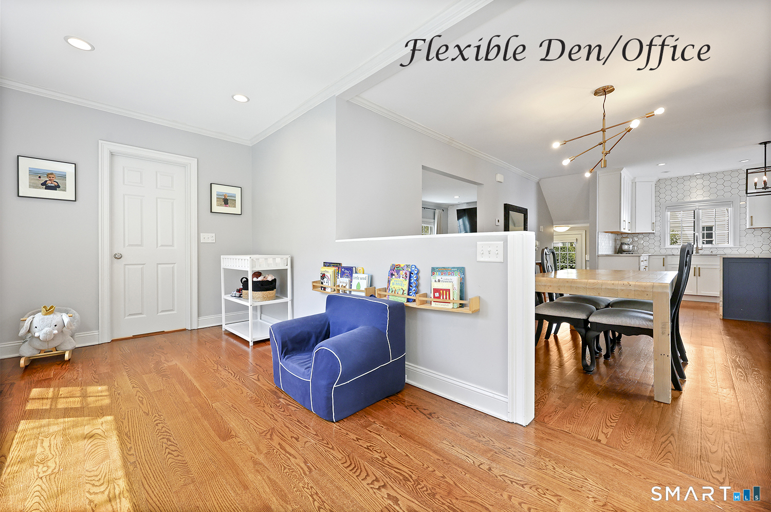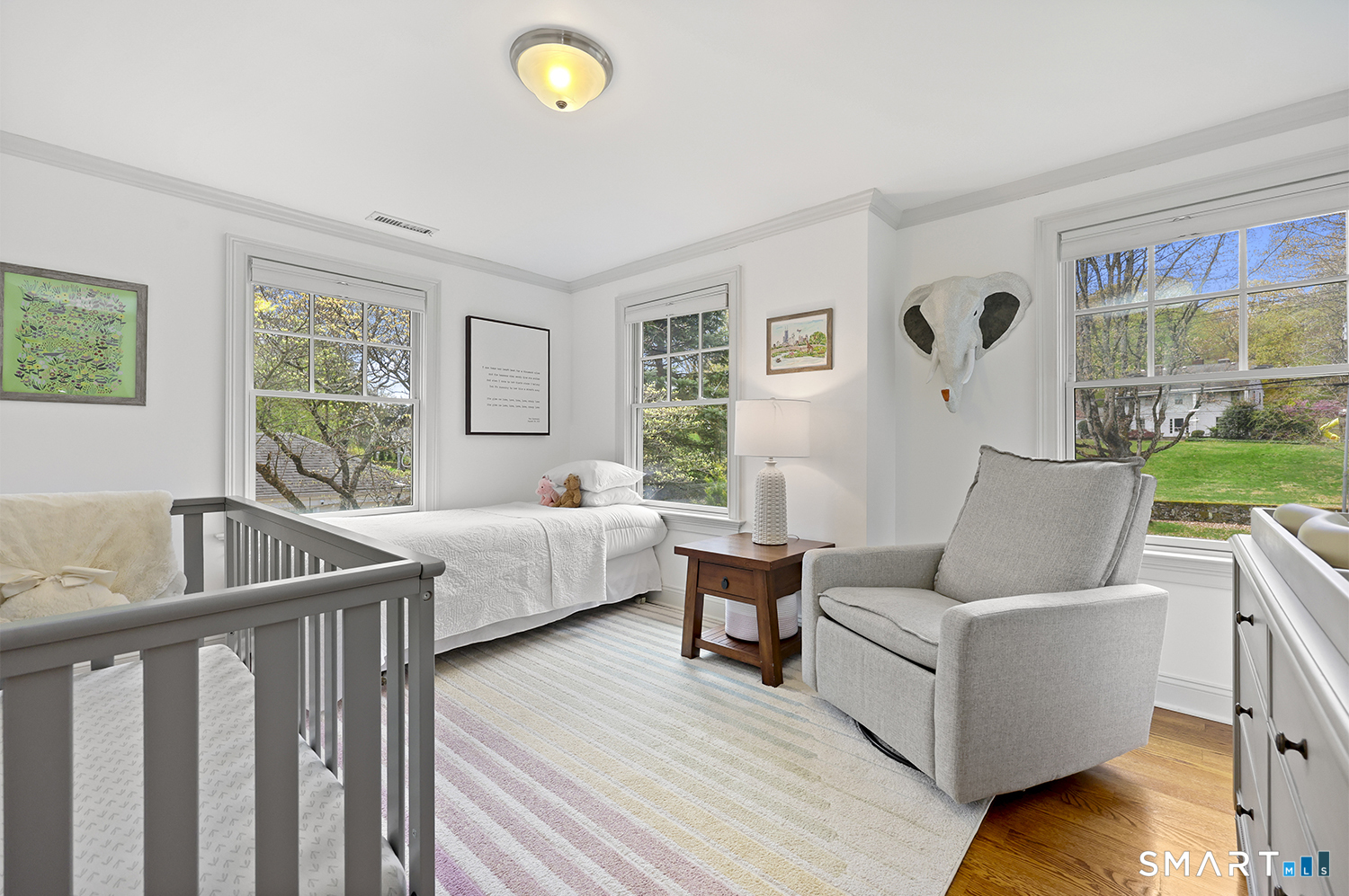 This sweet home is located on a desirable, convenient street nestled between Southport and Greenfield Hill. Enjoy an open first floor with a chef's kitchen featuring premium stainless-steel appliances, a waterfall quartz countertop, and a spacious eat-in area. A separate den/flex space behind a half wall provides a perfect spot for work or play, distinct from the living area. The first floor also includes a large dining area, cozy seating, and a gas fireplace. Two access points lead to an expansive deck and patio, ideal for outdoor entertaining. Upstairs, there are four bedrooms (one without a closet, so the tax card lists it as a three-bed), all with hardwood floors. The primary bedroom boasts a vaulted ceiling, a large picture window, a walk-in closet with custom built-ins, and a spa-like bath with a whirlpool tub and separate shower. The other bedrooms share an updated full bath. The finished third level offers versatile space for a workout room or office. The lower level houses the laundry and ample storage. An unfinished area above the two-car garage could become an art studio or guest suite. The private, level yard includes an irrigation system and a peaceful brook behind the fence. Conveniently located near shopping, schools, and commuting routes. Great walking options including an arboretum steps away. New assessment/taxes not reflected until July 2026.