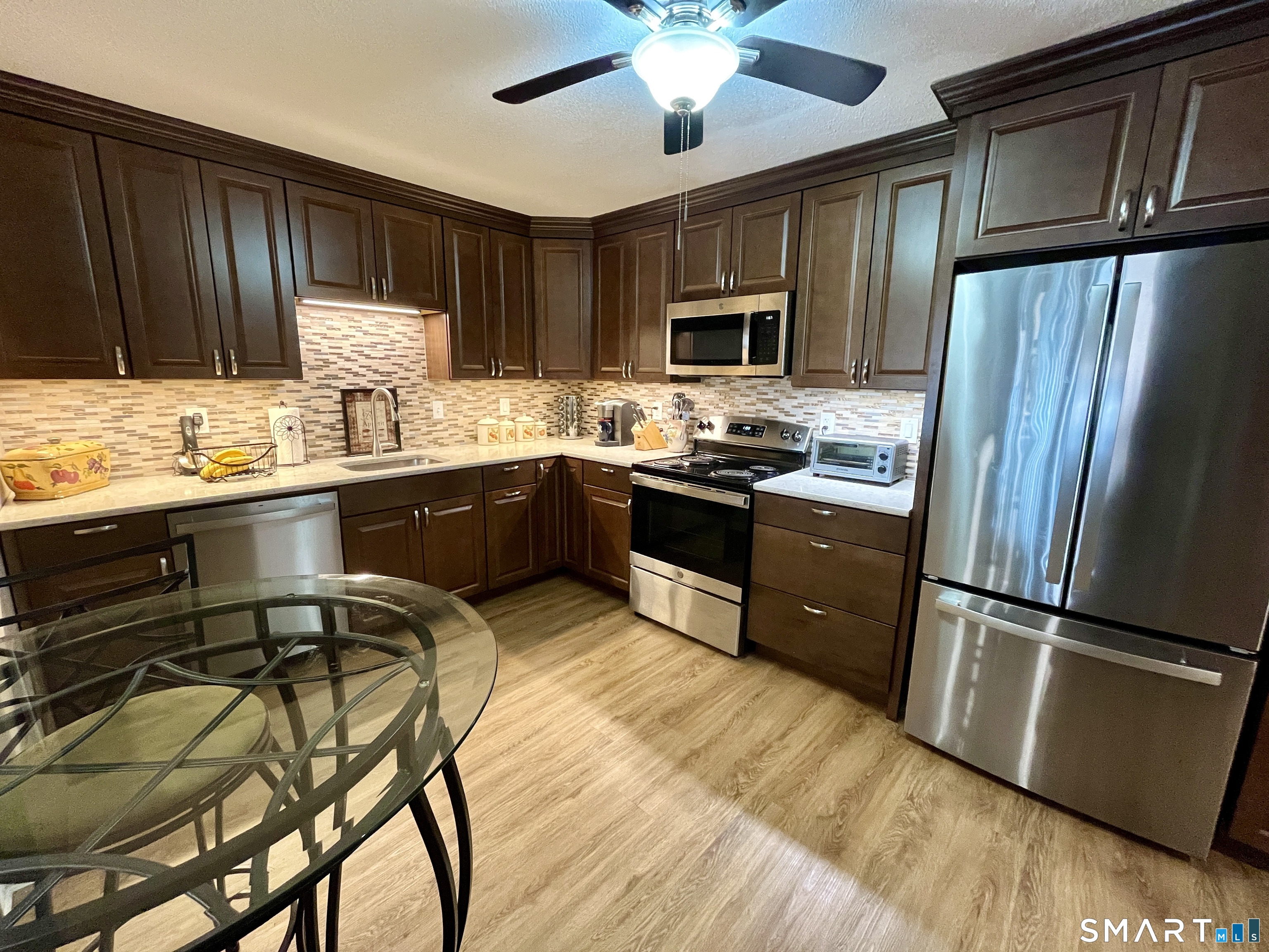 Enjoy the best of coastal Connecticut in this beautifully remodeled 1-bedroom, 1-bath ranch-style unit in Tide Harbor, a condominium complex perfectly situated along the scenic Housatonic River. This delightful home offers an open-concept living & dining room combination with sliders leading to a private balcony showcasing peaceful water views ideal for both relaxing and entertaining. The striking new eat-in kitchen boasts handsome maple cabinetry, granite countertops, soft-close drawers, a lazy susan, pull-out garbage, garbage disposal, tile backsplash, breakfast bar, & newer GE appliances in 2022 combining style & functionality. A spacious primary bedroom with walk-in closet & a full bath with double sinks and bathtub complete the thoughtfully designed layout. Additional highlights include striking and easy to maintain luxury vinyl flooring, a welcoming foyer with double entry closet, generous room sizes, an abundance of new recessed lighting, new energy-efficient TP windows and sliders in 2022, & a new Rheem water heater. Residents enjoy the convenience of a common laundry on each floor, shared basement storage, & one assigned parking space along with ample parking for guests. Close to shopping, restaurants, the train station & major commuting routes offering comfort and convenience to its residents. Just minutes away is the charming Lordship area known for its beautiful coastline, scenic seawall, golf course, & nearby beaches perfect or morning walks & sunset views.