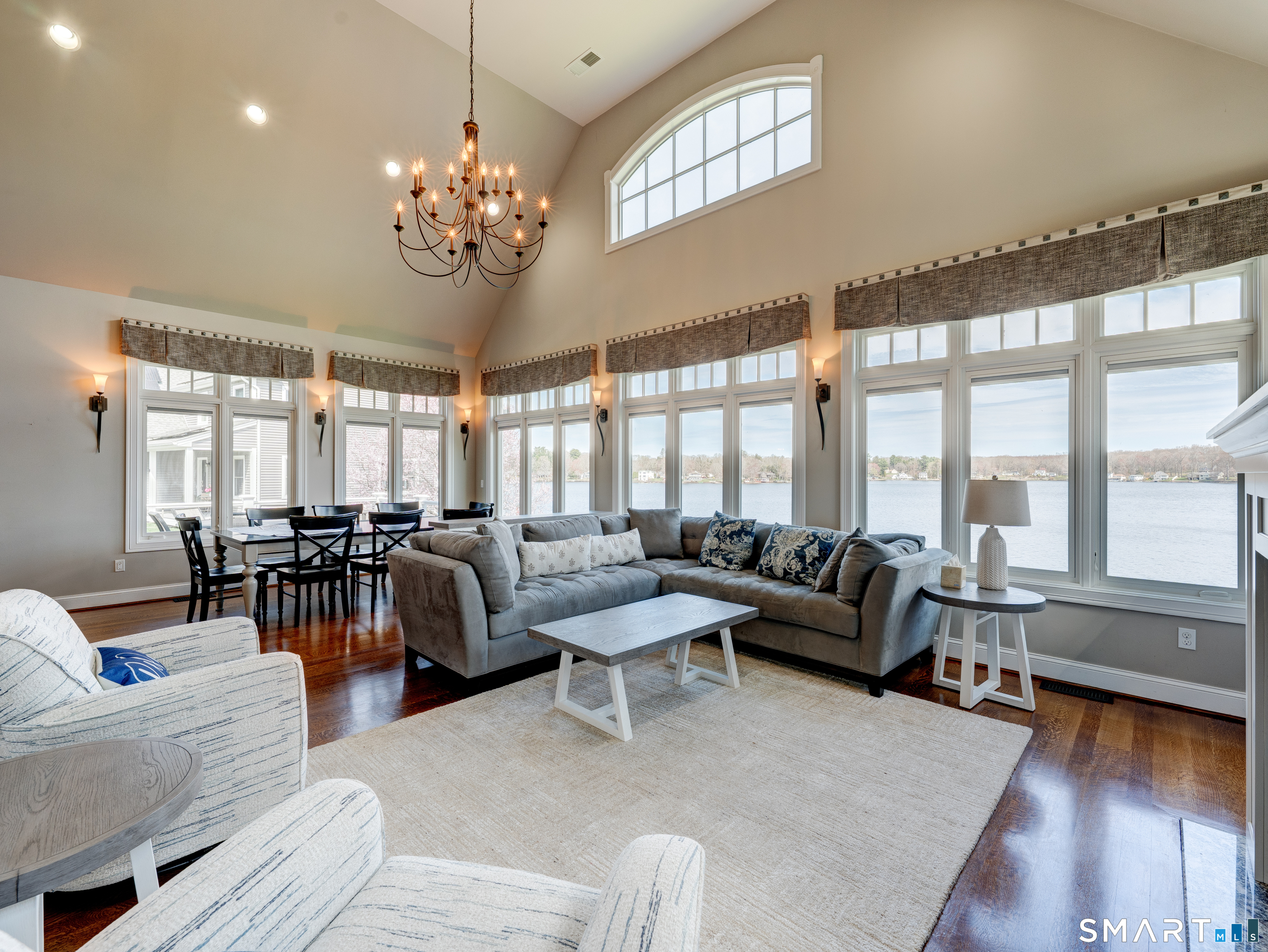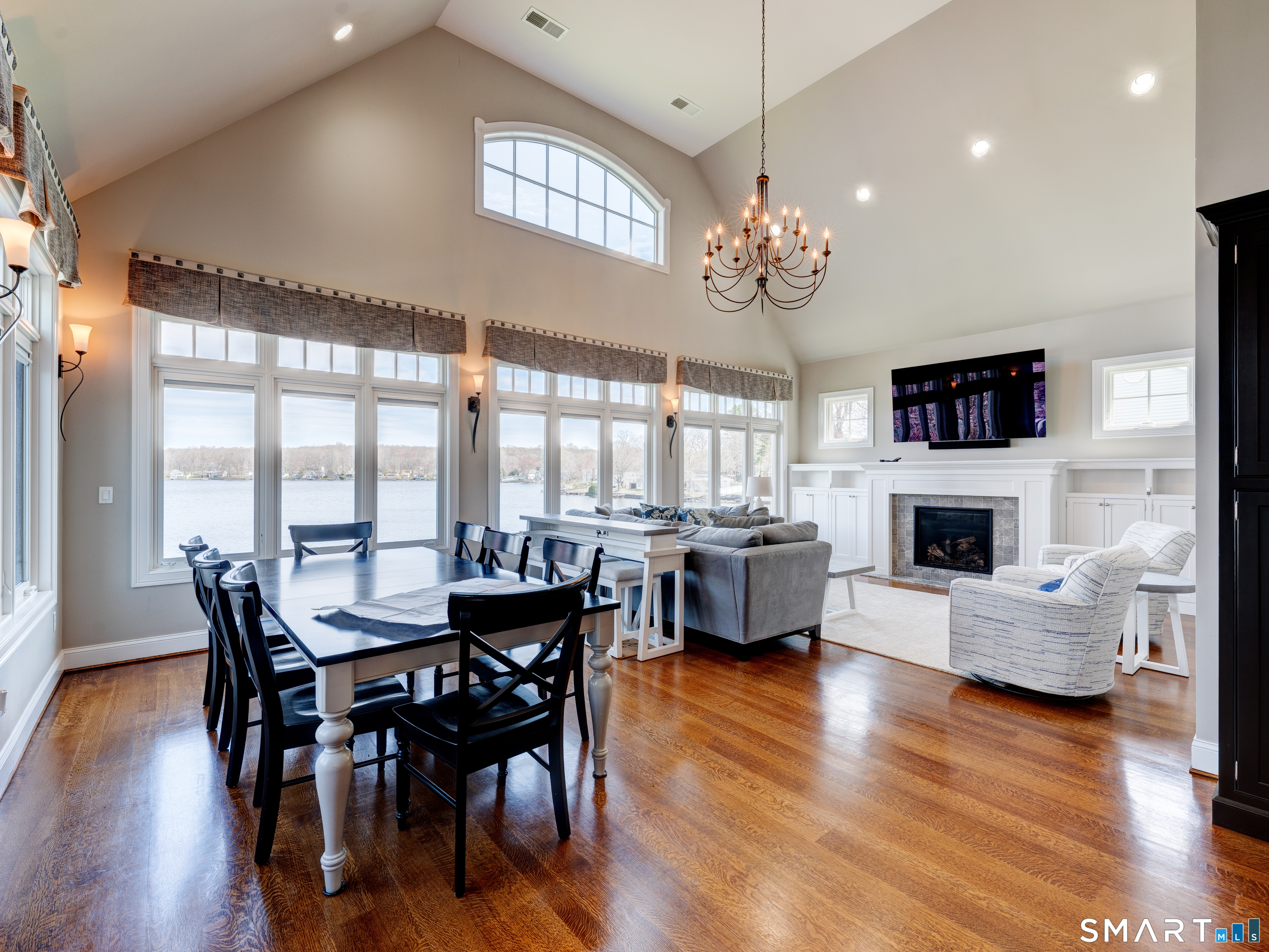 Stunning Custom Waterfront Home on Columbia Lake Experience exceptional lakefront living in this custom-crafted, beautifully constructed home set on the shores of Columbia Lake. Built in 2015 by Mike Dion Construction, this remarkable property offers 116 feet of direct waterfront, complete with a lakeside stone wall, private dock, expansive patio, and professionally landscaped grounds. Designed to capture breathtaking water views from nearly every angle, the home features an open floor plan with cathedral ceilings, two-story windows, and exquisite architectural detailing throughout. The living area is anchored by a gas fireplace with custom tile and cabinetry, while Marvin windows and quartersawn oak flooring enhance both beauty and quality. The chef's kitchen is a true centerpiece, showcasing custom Dean Cabinetry with inset doors, a large center island, premium appliances, and a built-in bar area with dual beverage refrigerators and glass display cabinetry. A spacious walk-in pantry offers exceptional storage with built-in shelving, cabinets, and drawers. Elegant Hubbardton Forge sconces provide ambient lighting while preserving uninterrupted lake views. The main-level primary suite is a serene retreat with stunning water views, a walk-in closet with custom built-ins, and a luxurious en-suite bath featuring a double vanity, oversized tiled shower, and radiant heated floors.
