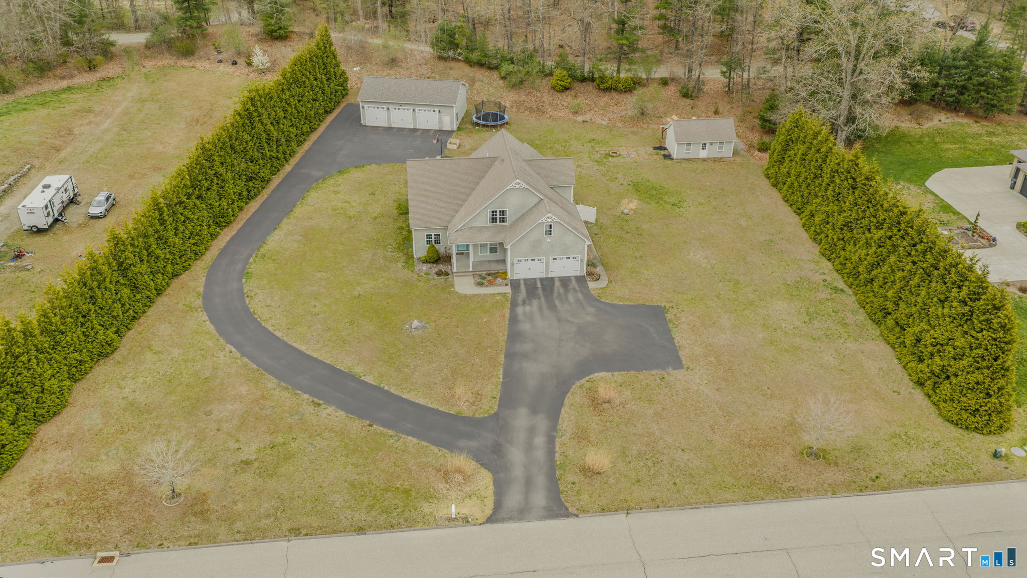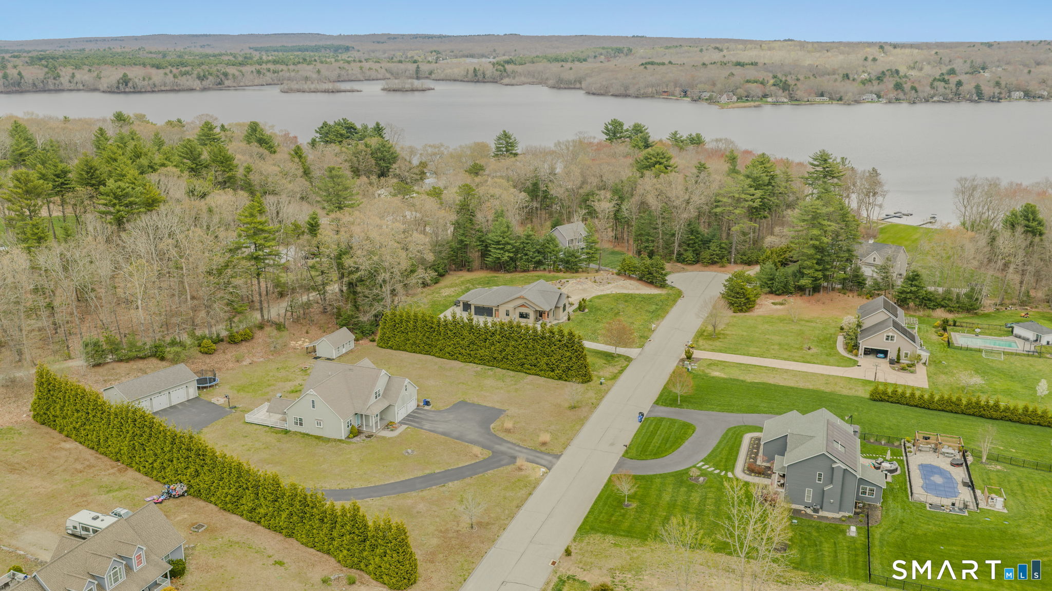 Experience the best of country living-deeded access to Pachaug Pond in private 8-home cul-de-sac community-perfect for boating enthusiasts & those seeking a peaceful setting. Enjoy a short walk to the assoc. beach & dock, offering easy access to one of the area's most desirable recreational ponds.This Contemporary Cape features an open floor plan with 5 bedrooms, 2.5 baths with highly sought-after first-floor primary suite ideal for one-level living. A second main-level bedroom, currently used as an office, and a convenient first-floor laundry room add to the home's functionality. The eat-in kitchen with center island flows to a spacious deck partially covered, partially open overlooking a level backyard, perfect for outdoor enjoyment. The living room offers a cathedral ceiling and gas fireplace creating a warm & inviting space.Upstairs, you'll find 3 generously sized bedrooms, full bath & walk-in attic storage. Car enthusiasts, hobbyist or those needing serious workspace will appreciate the oversized detached 3-car garage ideal for working on vehicles, storing boats or accommodating multiple projects while attached 2-car gar. provides direct access to the home for everyday convenience. Addit'l heated space off the attached garage w/water & electricity offers endless possibilities for home business, workshop, gym or studio. Rare opportunity combining country charm, one level living option, exceptional garage & access to Pachaug Pond for boating, fishing & outdoor enjoyment.