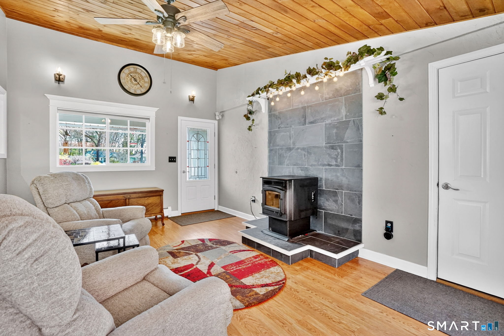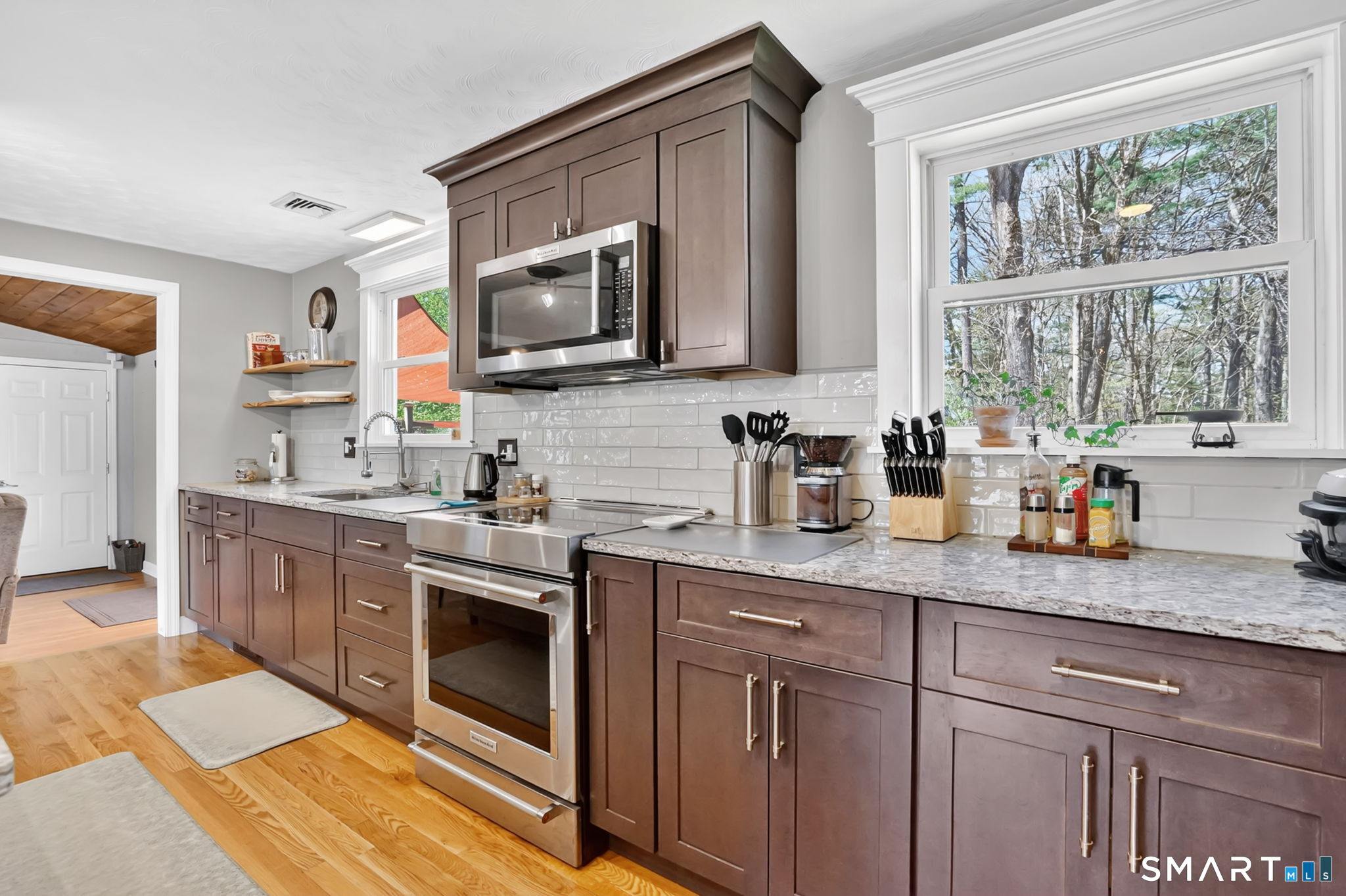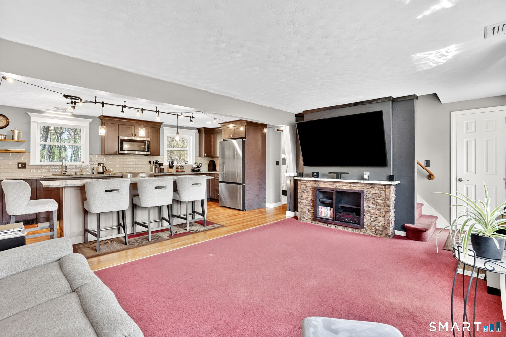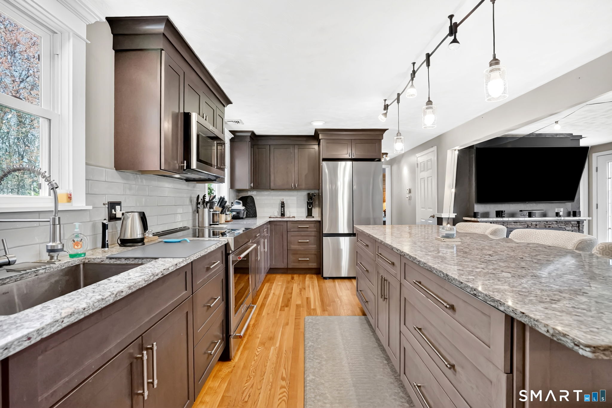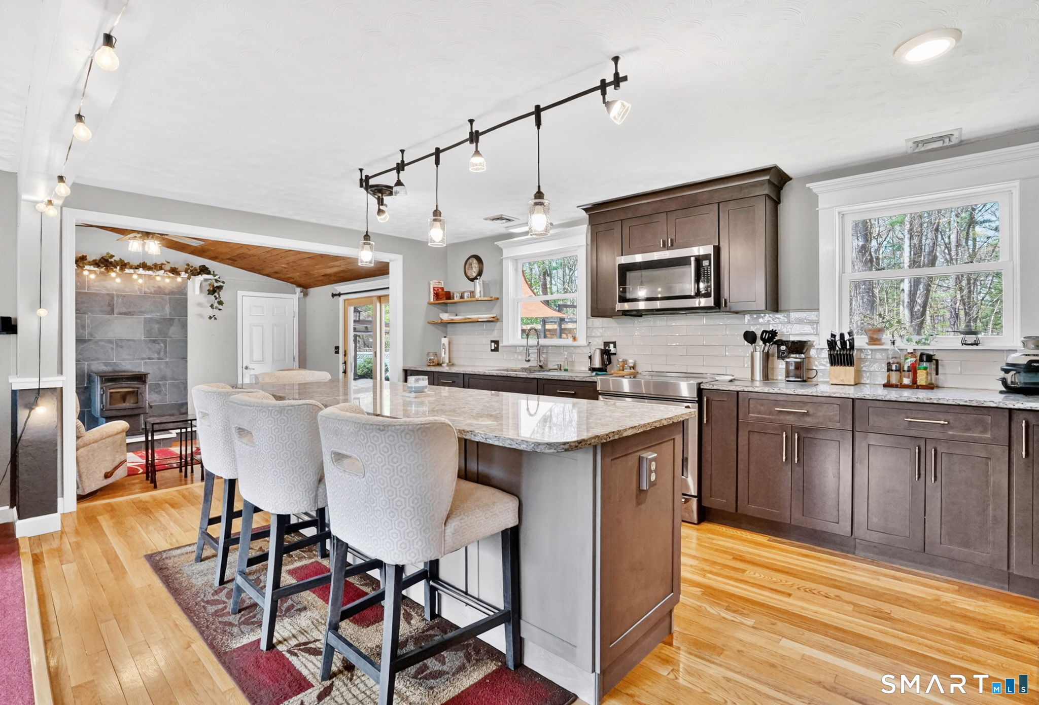 Welcome home to 34 Wagon Rd in Enfield, CT! This beautifully updated 3-4 bedroom Cape offers over 1,500 sq ft of versatile, move-in-ready living space-perfect for first-time buyers or those seeking convenient single-level living. Enter through the side driveway into a spacious family room featuring a vaulted ceiling, cozy pellet stove, and direct access to a stamped concrete patio and backyard retreat. The fully remodeled kitchen is truly the heart of the home, showcasing a stunning 9-foot granite island with seating for four, dark cabinetry, a light gray tiled backsplash, and newer stainless steel KitchenAid induction range, microwave hood, and Samsung refrigerator. The open-concept layout seamlessly connects the kitchen to both the living and family rooms, making it ideal for entertaining. Down the hall, you'll find a fully renovated bathroom with a sleek sliding frosted glass door, Corian-topped vanity, and beautifully tiled shower surround. The main level also features a spacious primary bedroom with stylish wood accent walls. Upstairs offers two additional well-sized bedrooms.Step outside through the double sliders to your private backyard oasis-thoughtfully designed with four distinct spaces, including a cabana hot tub ready, a fully equipped and covered grilling station, and two entertainment decks with arbor/shade. Surround sound indoors and outdoors enhances the experience, while white vinyl fencing and professional landscaping provide both privacy and charm.