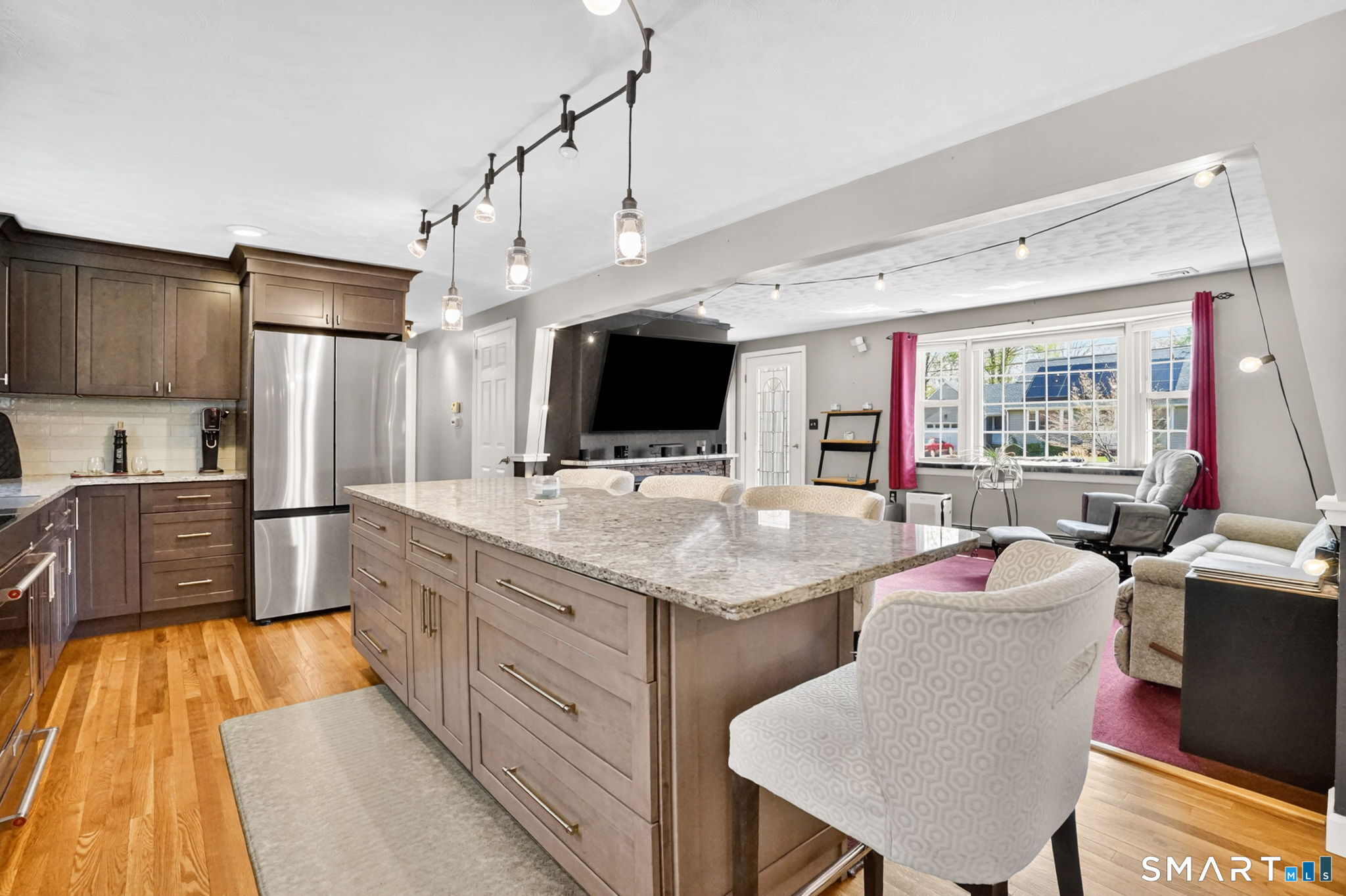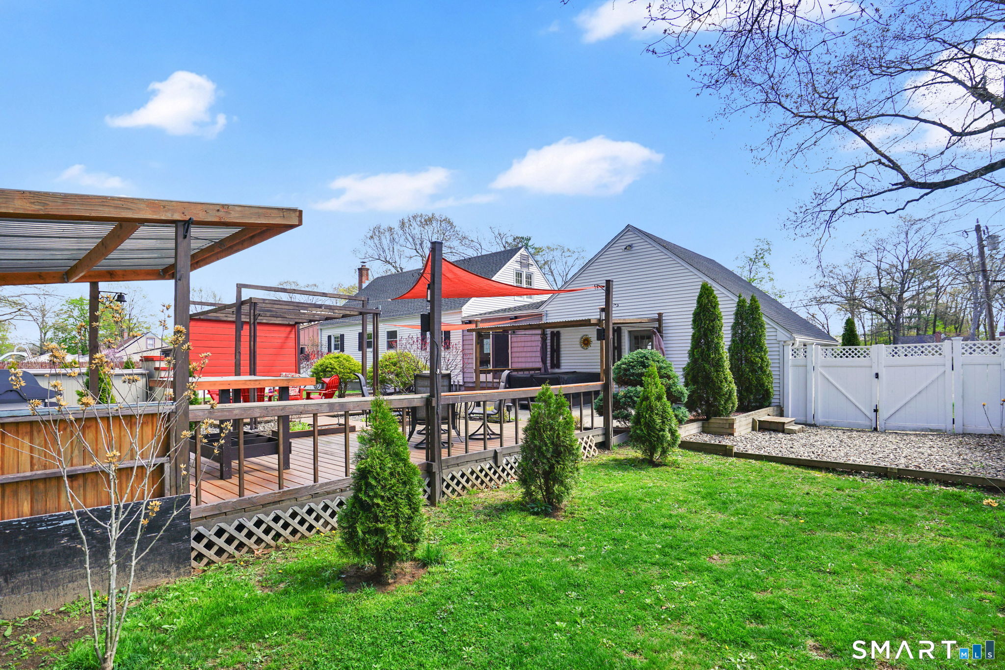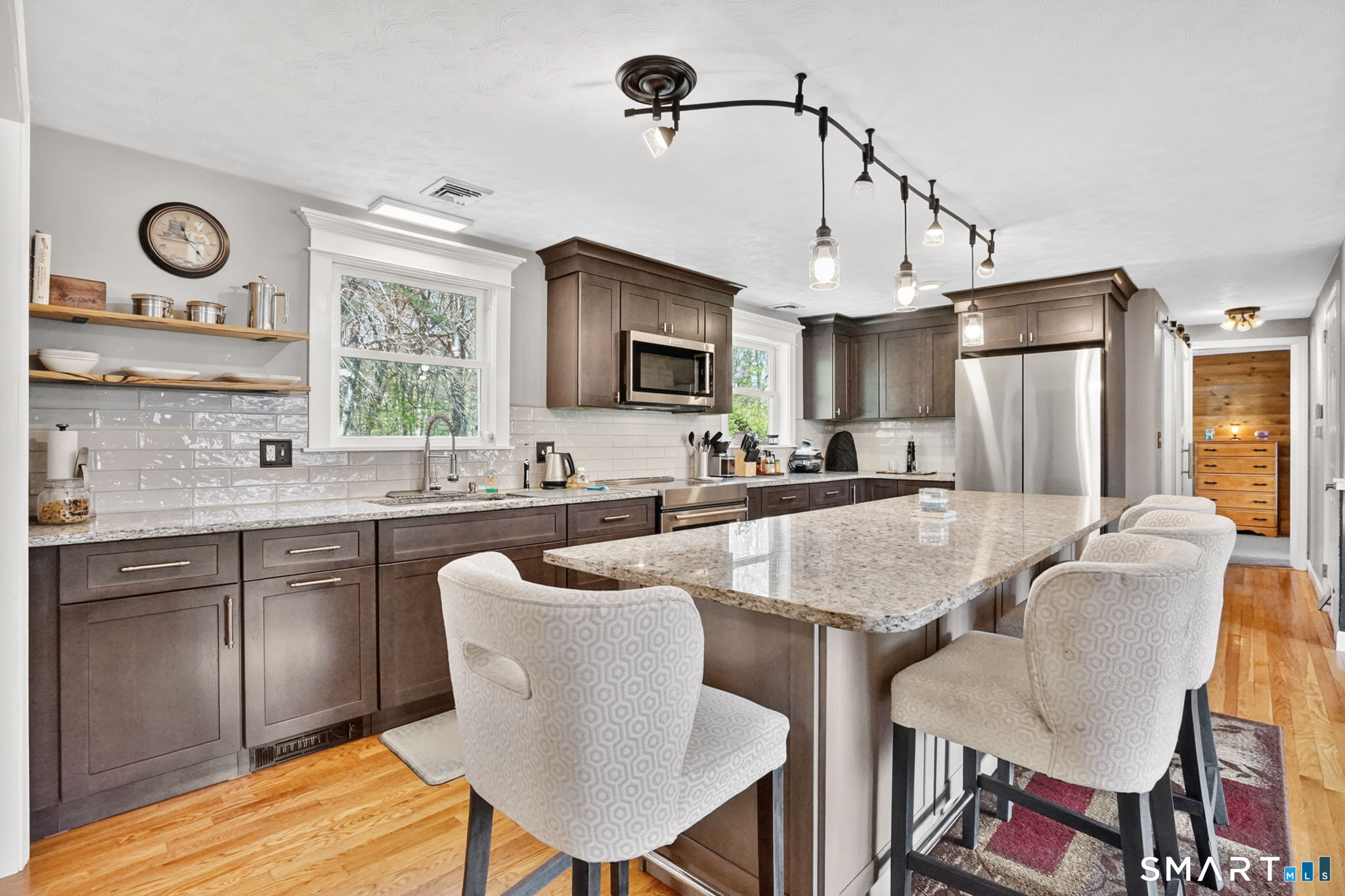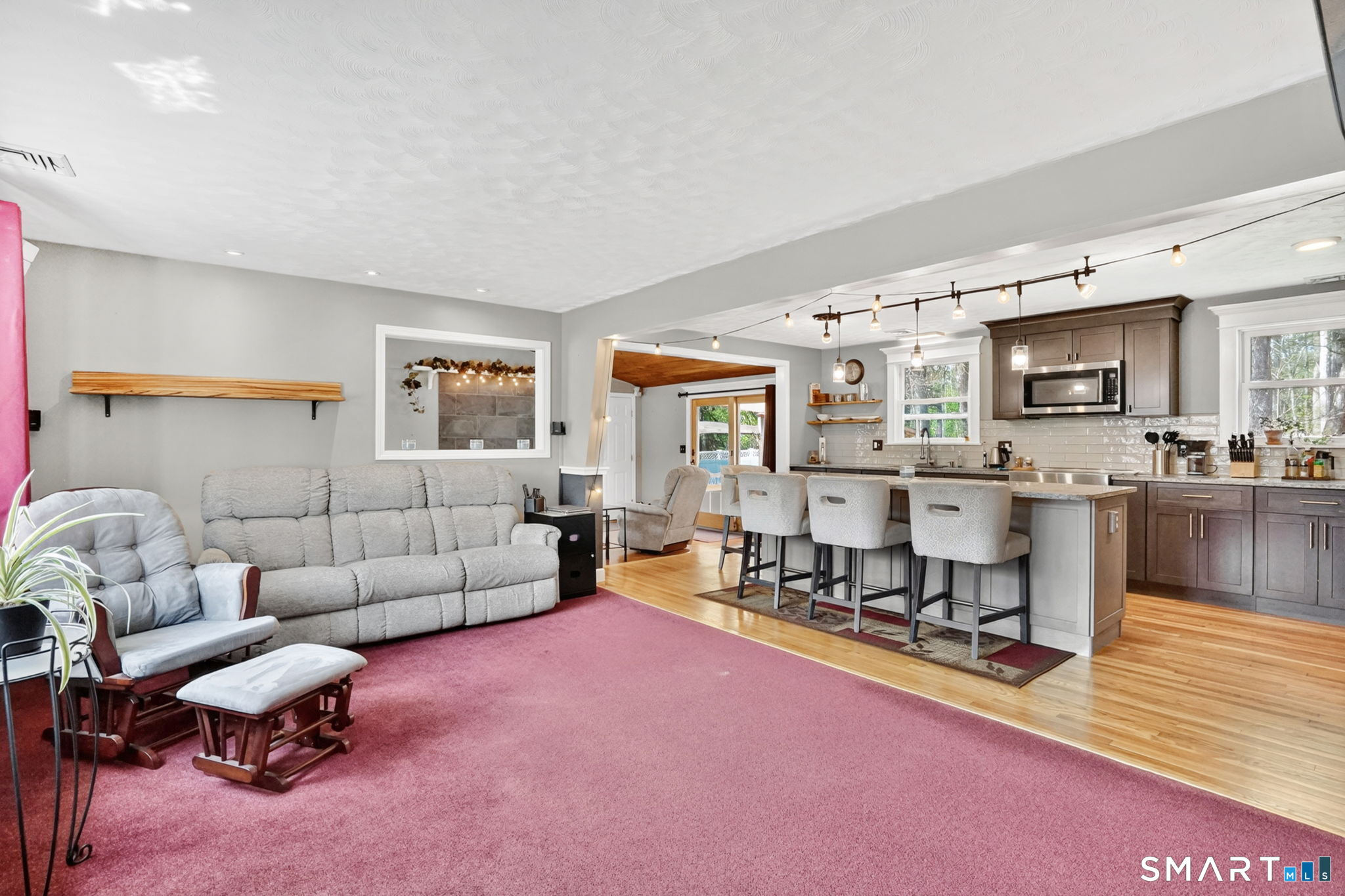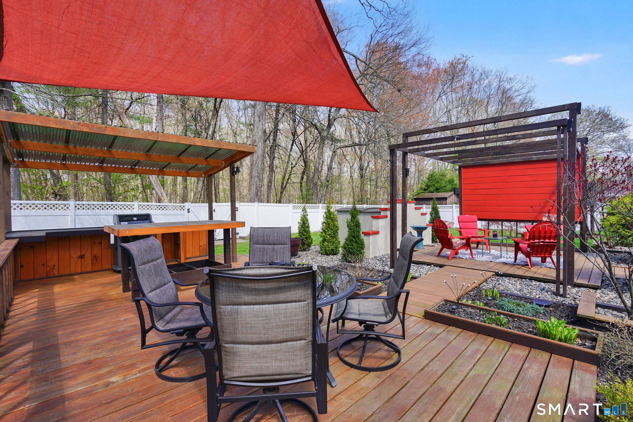 Welcome home to 34 Wagon Rd in Enfield, CT! This beautifully updated 3-4 bedroom Cape offers over 1,500 sq ft of versatile, move-in-ready living space-perfect for first-time buyers or those seeking convenient single-level living. Enter through the side driveway into a spacious family room featuring a vaulted ceiling, cozy pellet stove, and direct access to a stamped concrete patio and backyard retreat. The fully remodeled kitchen is truly the heart of the home, showcasing a stunning 9-foot granite island with seating for four, dark cabinetry, a light gray tiled backsplash, and newer stainless steel KitchenAid induction range, microwave hood, and Samsung refrigerator. The open-concept layout seamlessly connects the kitchen to both the living and family rooms, making it ideal for entertaining. Down the hall, you'll find a fully renovated bathroom with a sleek sliding frosted glass door, Corian-topped vanity, and beautifully tiled shower surround. The main level also features a spacious primary bedroom with stylish wood accent walls. Upstairs offers two additional well-sized bedrooms.Step outside through the double sliders to your private backyard oasis-thoughtfully designed with four distinct spaces, including a cabana hot tub ready, a fully equipped and covered grilling station, and two entertainment decks with arbor/shade. Surround sound indoors and outdoors enhances the experience, while white vinyl fencing and professional landscaping provide both privacy and charm.