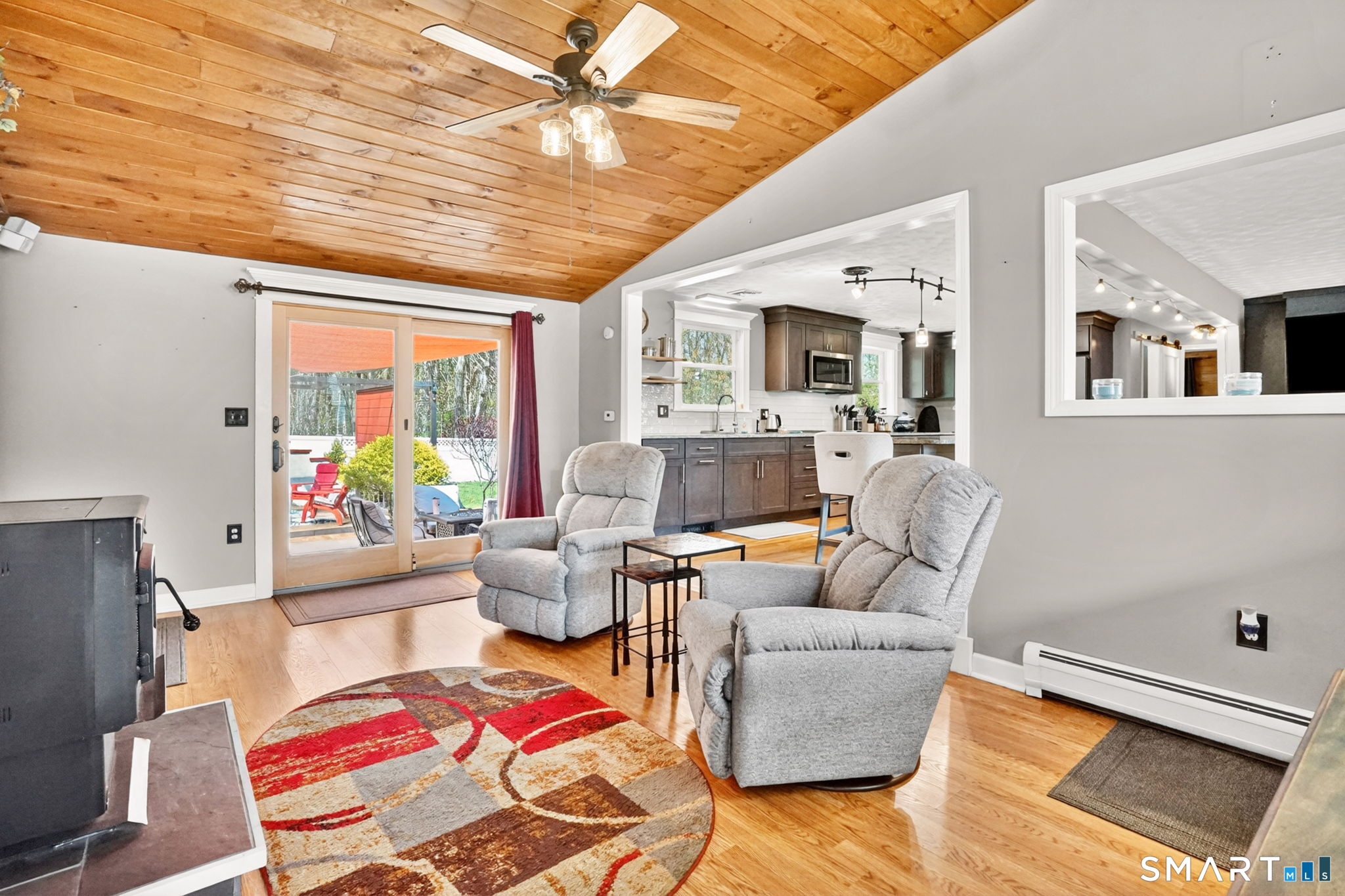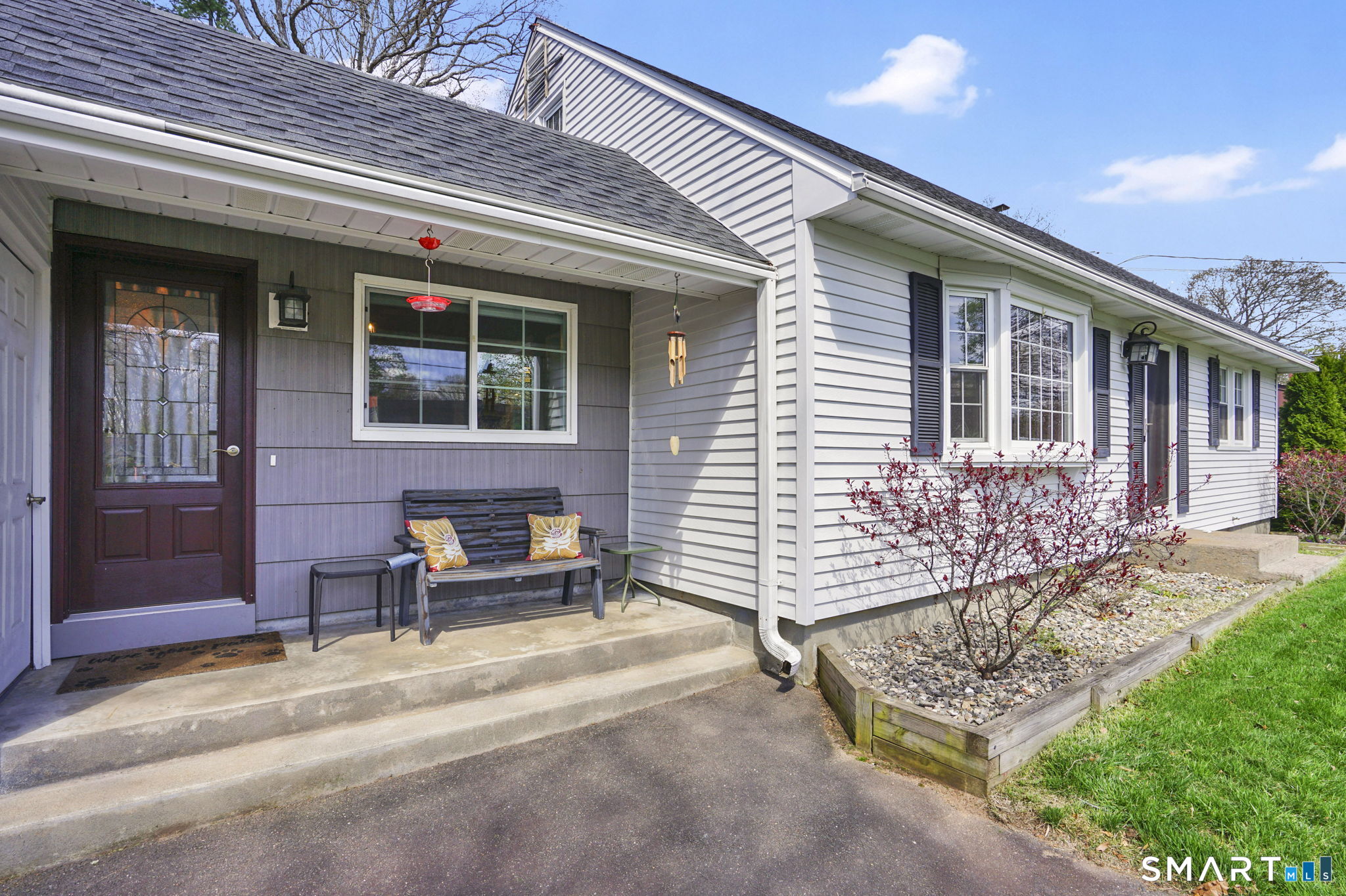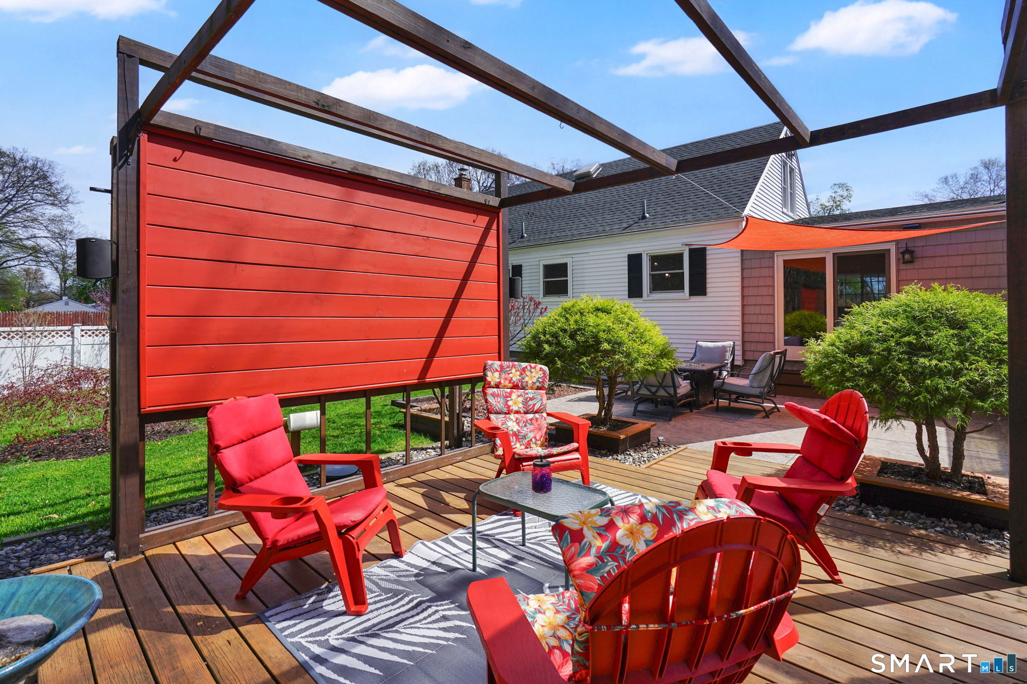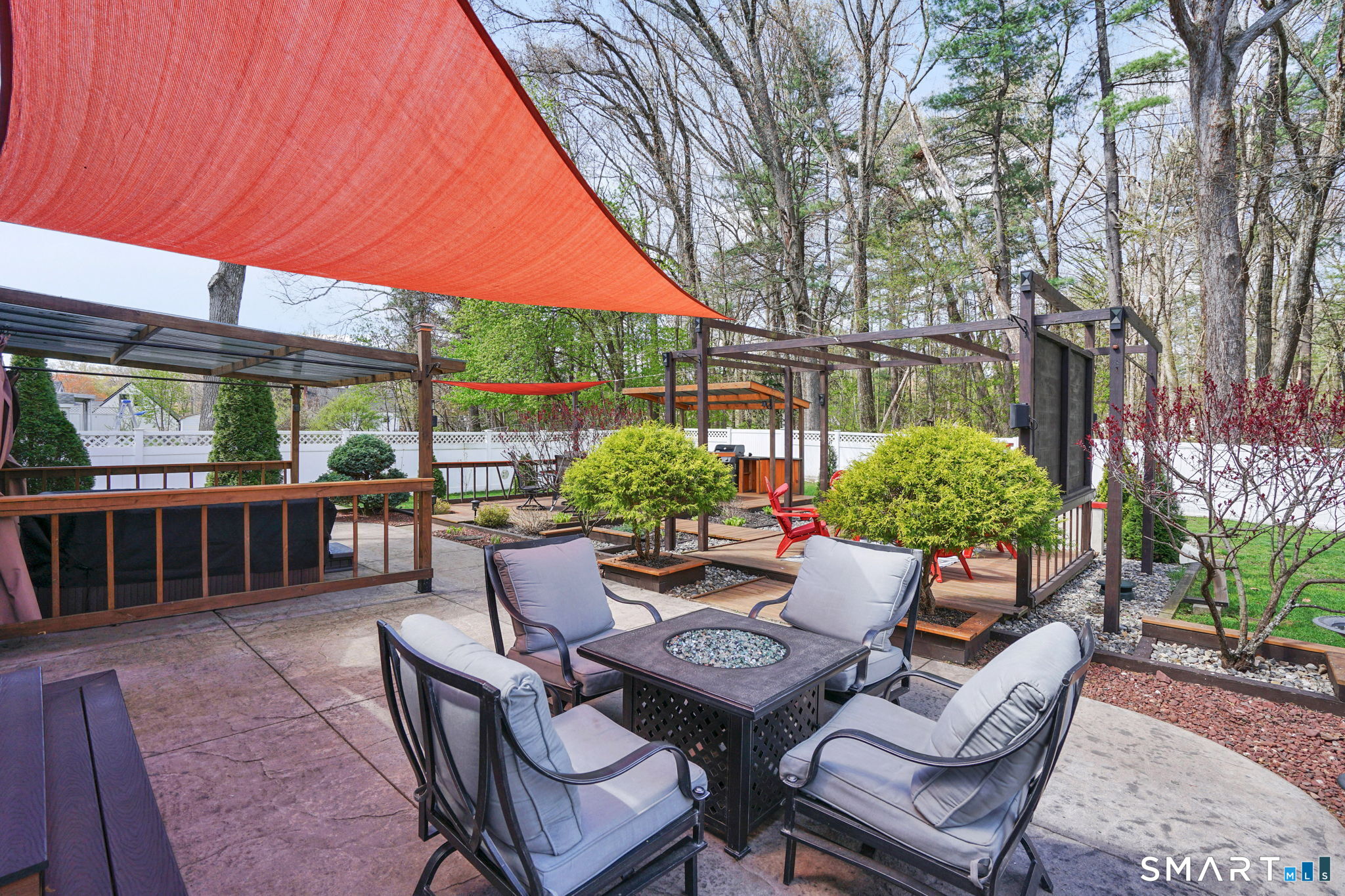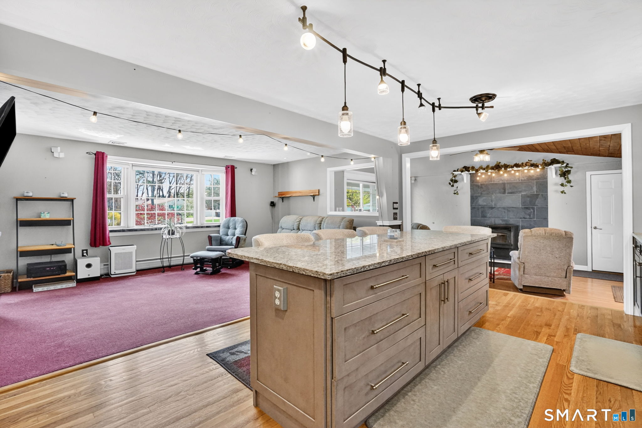 Welcome home to 34 Wagon Rd in Enfield, CT! This beautifully updated 3-4 bedroom Cape offers over 1,500 sq ft of versatile, move-in-ready living space-perfect for first-time buyers or those seeking convenient single-level living. Enter through the side driveway into a spacious family room featuring a vaulted ceiling, cozy pellet stove, and direct access to a stamped concrete patio and backyard retreat. The fully remodeled kitchen is truly the heart of the home, showcasing a stunning 9-foot granite island with seating for four, dark cabinetry, a light gray tiled backsplash, and newer stainless steel KitchenAid induction range, microwave hood, and Samsung refrigerator. The open-concept layout seamlessly connects the kitchen to both the living and family rooms, making it ideal for entertaining. Down the hall, you'll find a fully renovated bathroom with a sleek sliding frosted glass door, Corian-topped vanity, and beautifully tiled shower surround. The main level also features a spacious primary bedroom with stylish wood accent walls. Upstairs offers two additional well-sized bedrooms.Step outside through the double sliders to your private backyard oasis-thoughtfully designed with four distinct spaces, including a cabana hot tub ready, a fully equipped and covered grilling station, and two entertainment decks with arbor/shade. Surround sound indoors and outdoors enhances the experience, while white vinyl fencing and professional landscaping provide both privacy and charm.