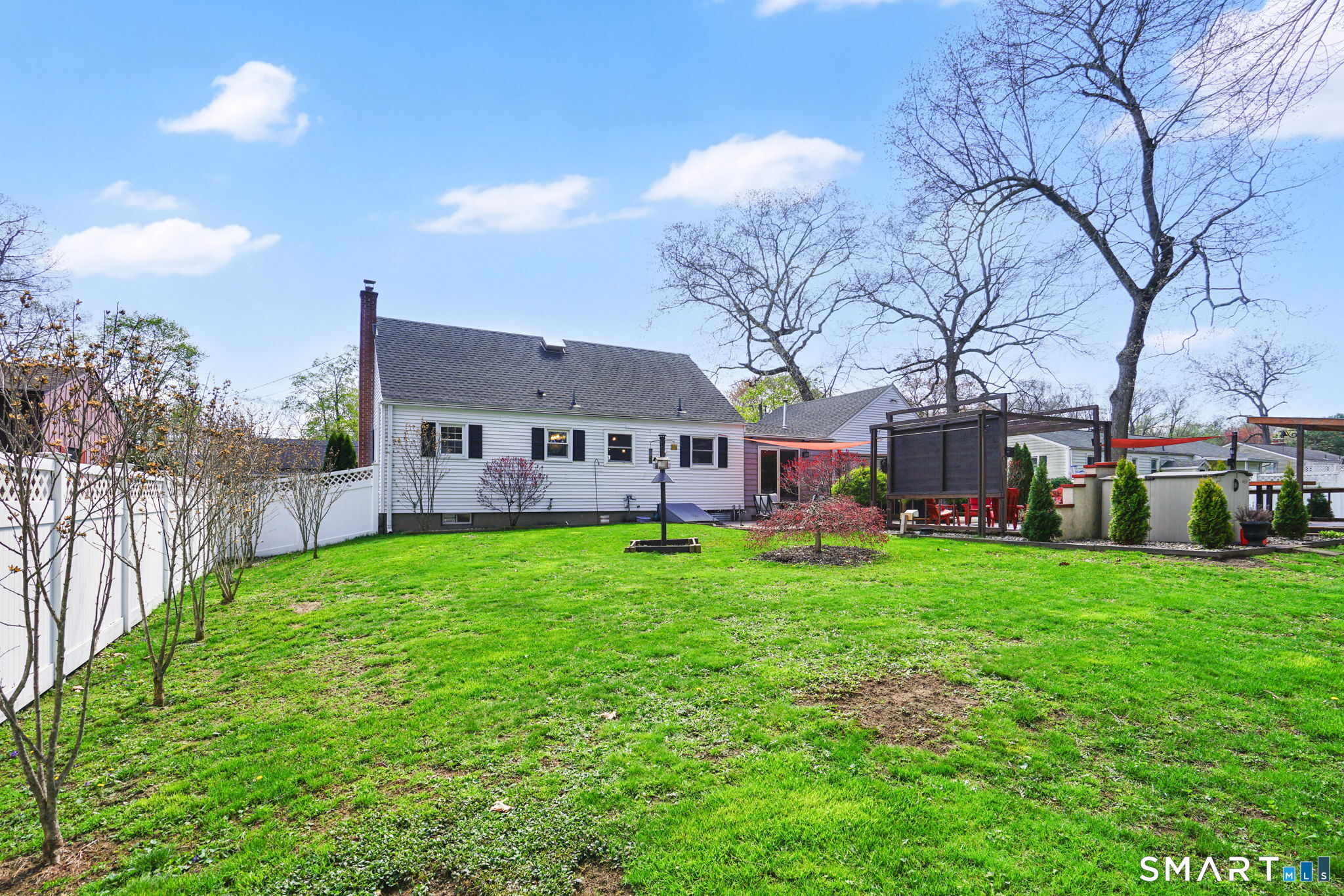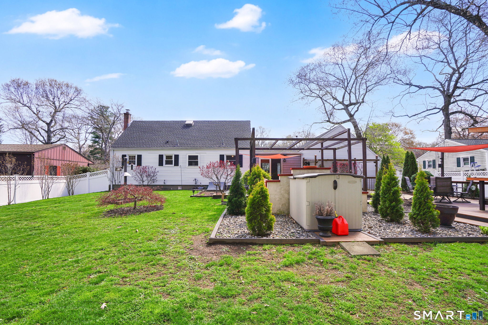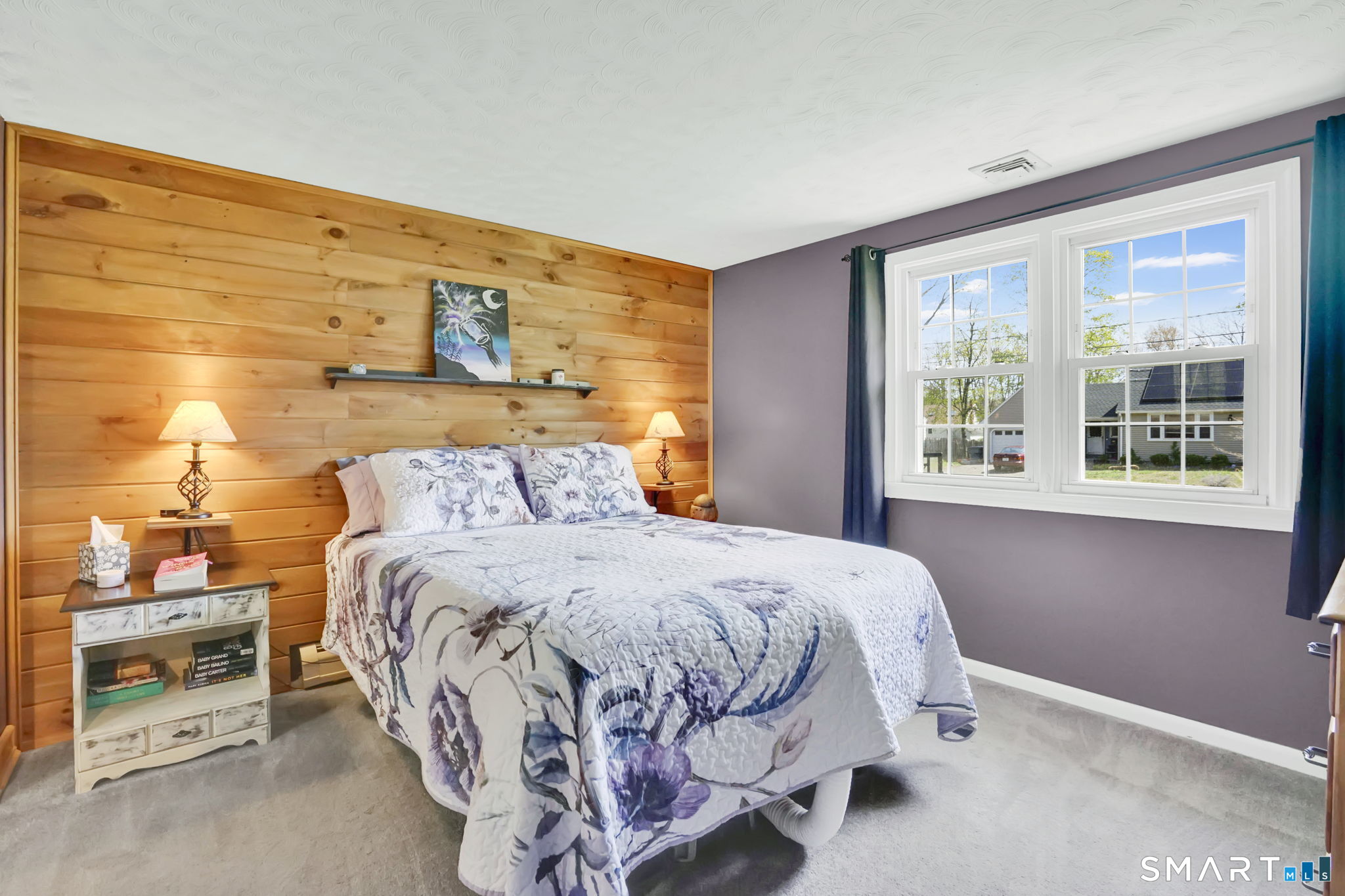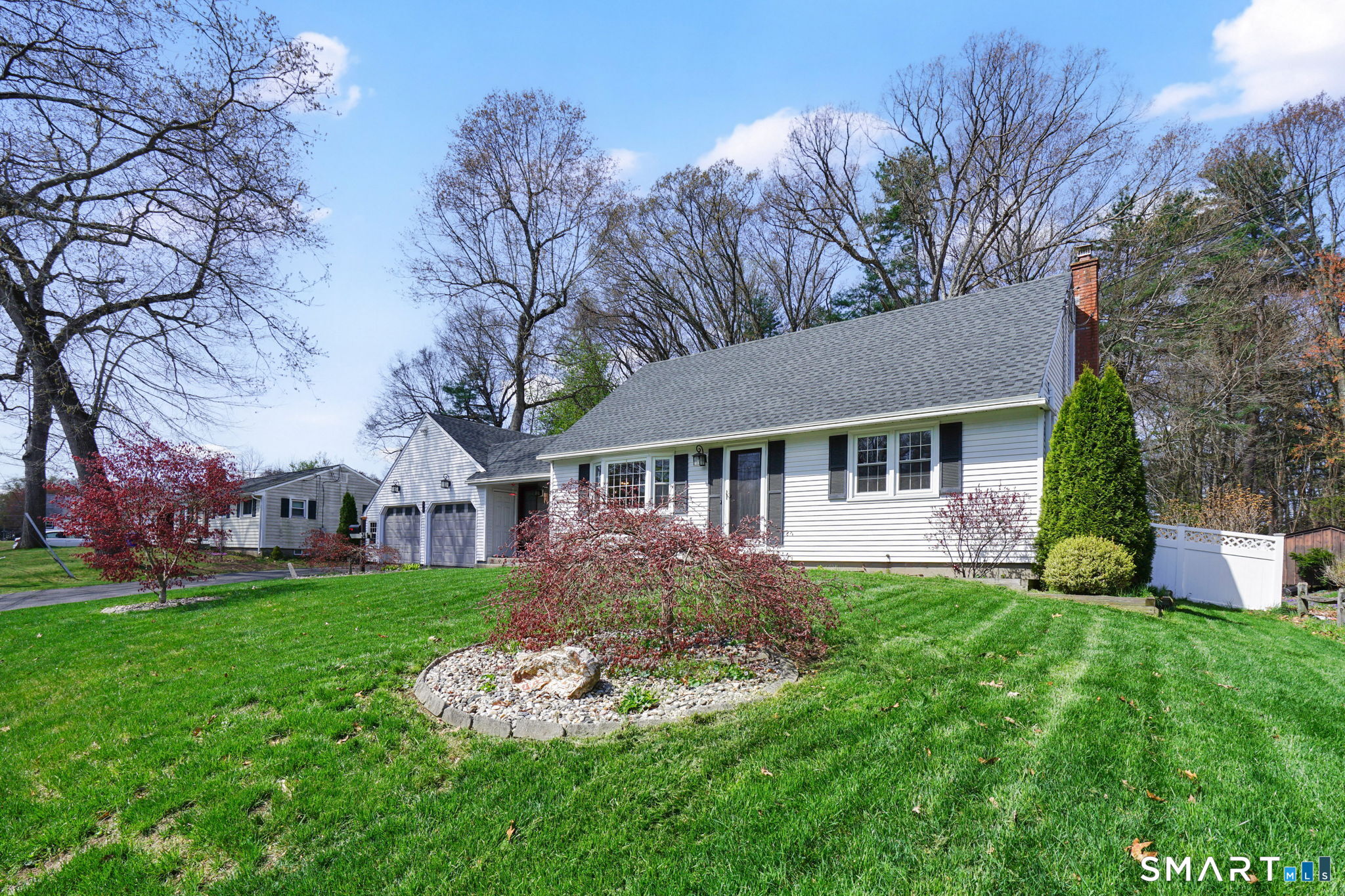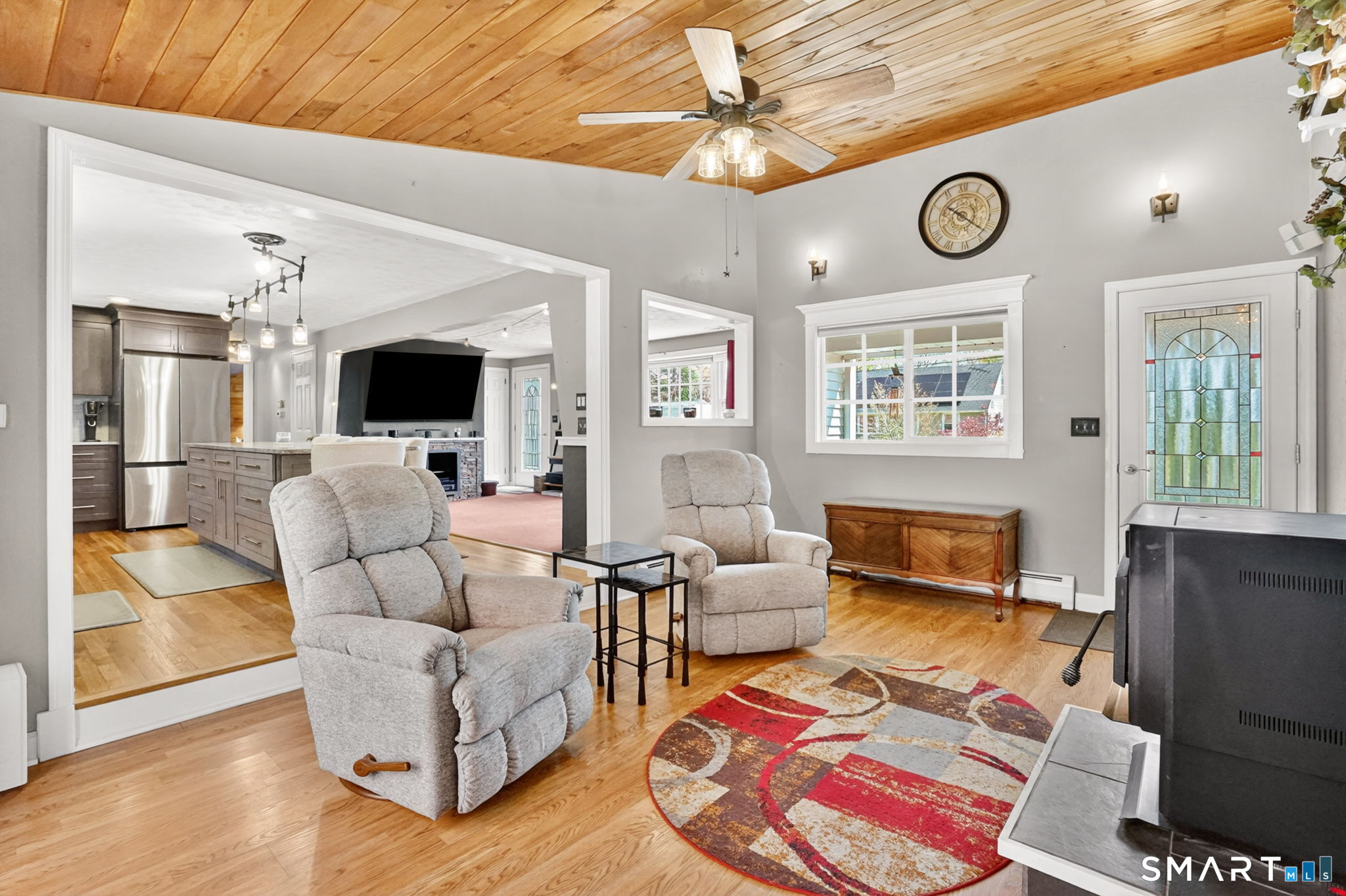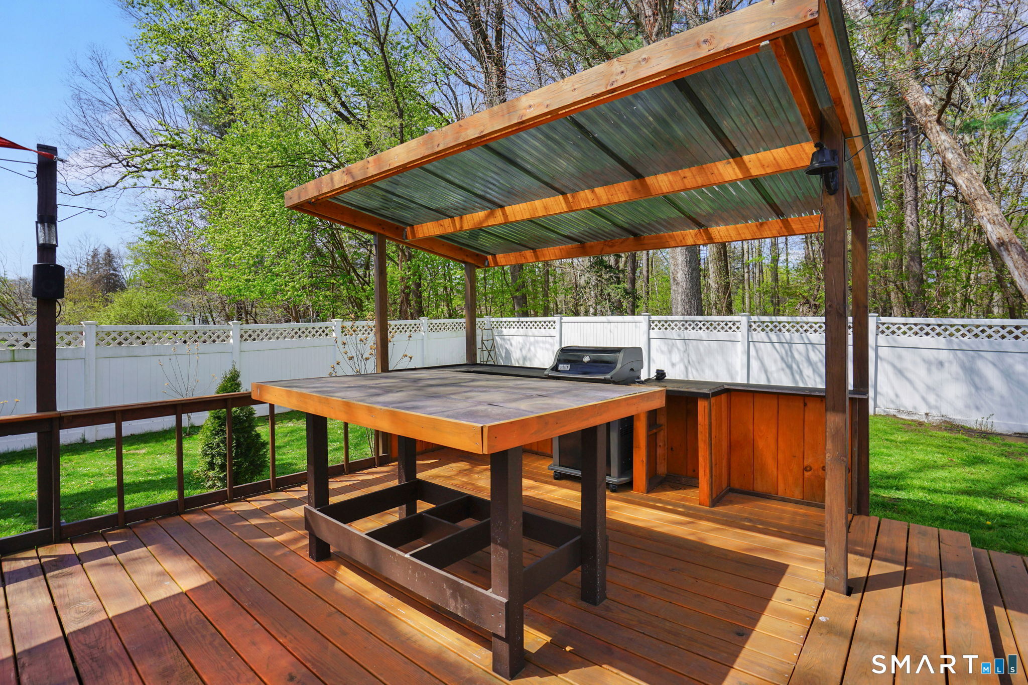 Welcome home to 34 Wagon Rd in Enfield, CT! This beautifully updated 3-4 bedroom Cape offers over 1,500 sq ft of versatile, move-in-ready living space-perfect for first-time buyers or those seeking convenient single-level living. Enter through the side driveway into a spacious family room featuring a vaulted ceiling, cozy pellet stove, and direct access to a stamped concrete patio and backyard retreat. The fully remodeled kitchen is truly the heart of the home, showcasing a stunning 9-foot granite island with seating for four, dark cabinetry, a light gray tiled backsplash, and newer stainless steel KitchenAid induction range, microwave hood, and Samsung refrigerator. The open-concept layout seamlessly connects the kitchen to both the living and family rooms, making it ideal for entertaining. Down the hall, you'll find a fully renovated bathroom with a sleek sliding frosted glass door, Corian-topped vanity, and beautifully tiled shower surround. The main level also features a spacious primary bedroom with stylish wood accent walls. Upstairs offers two additional well-sized bedrooms.Step outside through the double sliders to your private backyard oasis-thoughtfully designed with four distinct spaces, including a cabana hot tub ready, a fully equipped and covered grilling station, and two entertainment decks with arbor/shade. Surround sound indoors and outdoors enhances the experience, while white vinyl fencing and professional landscaping provide both privacy and charm.