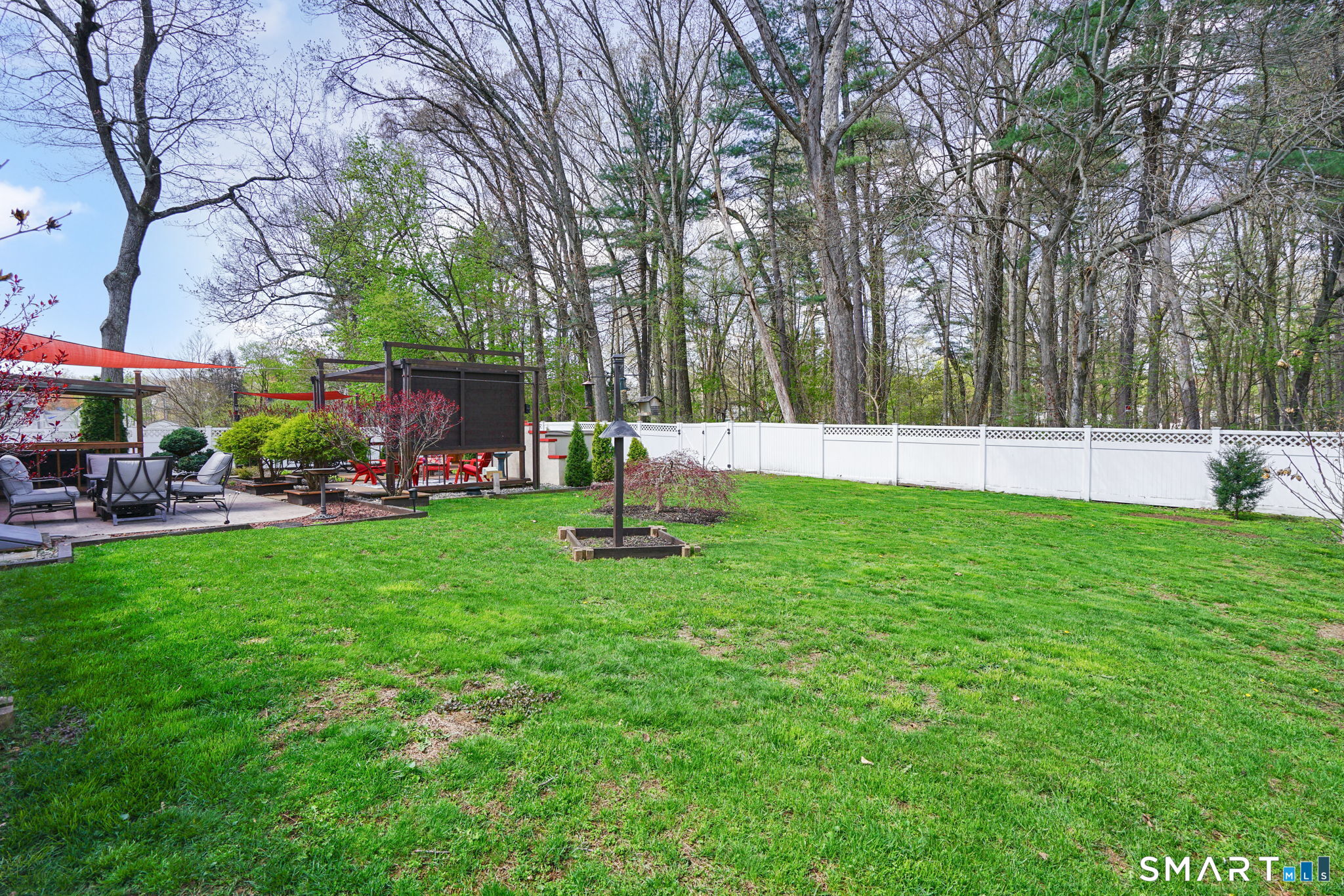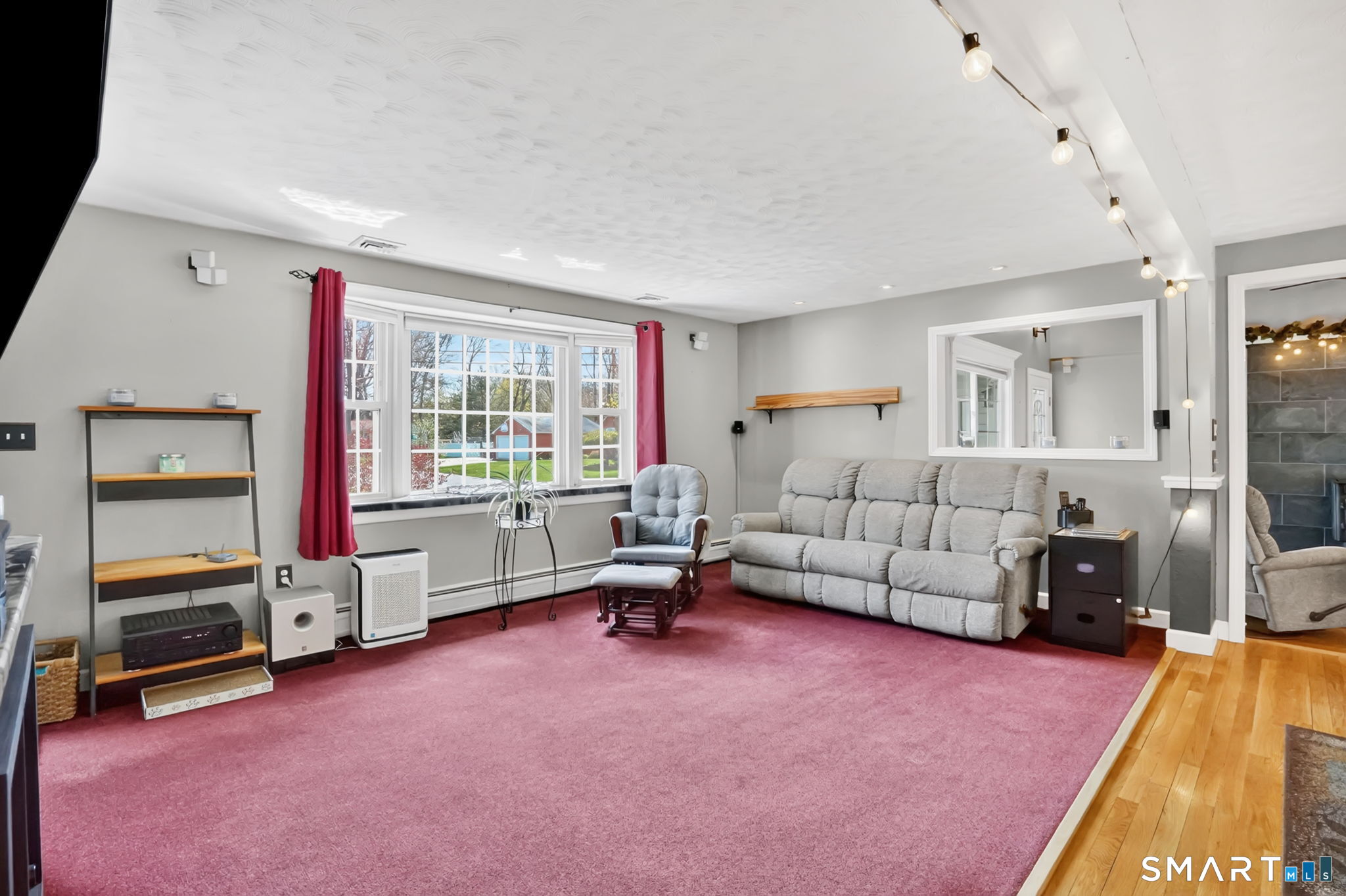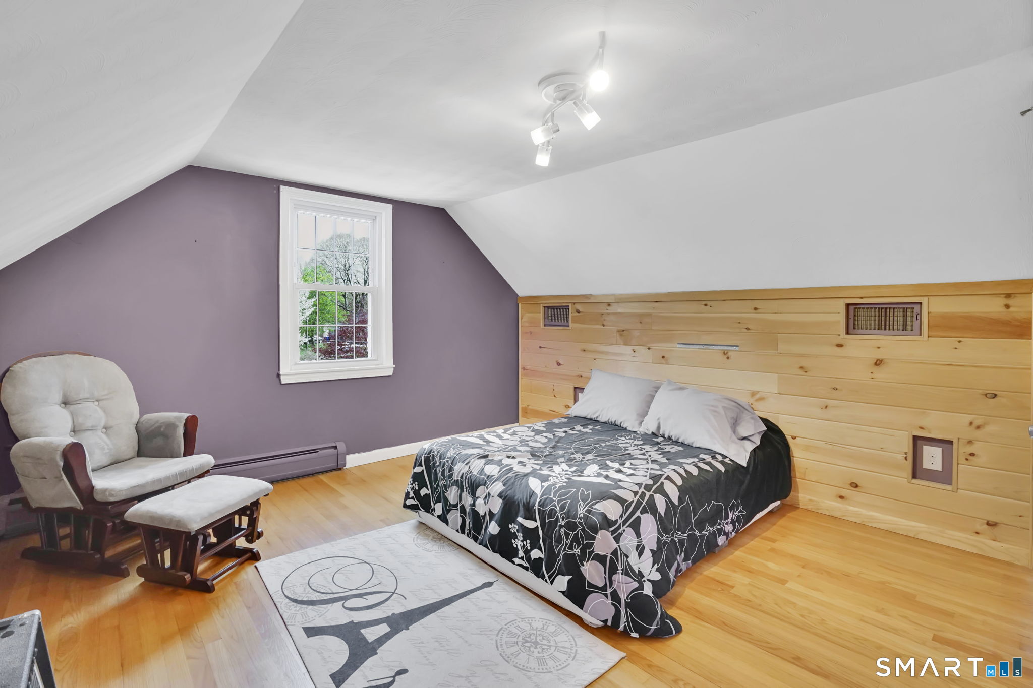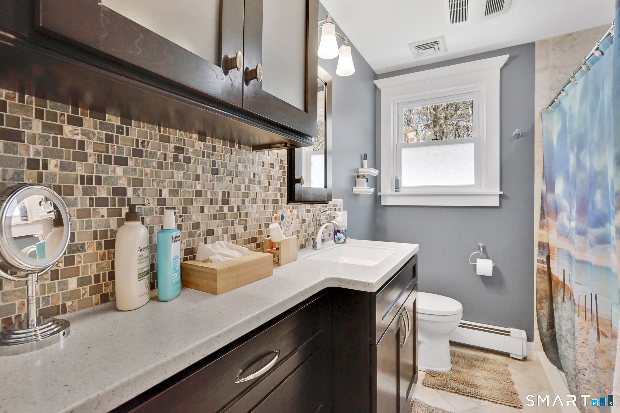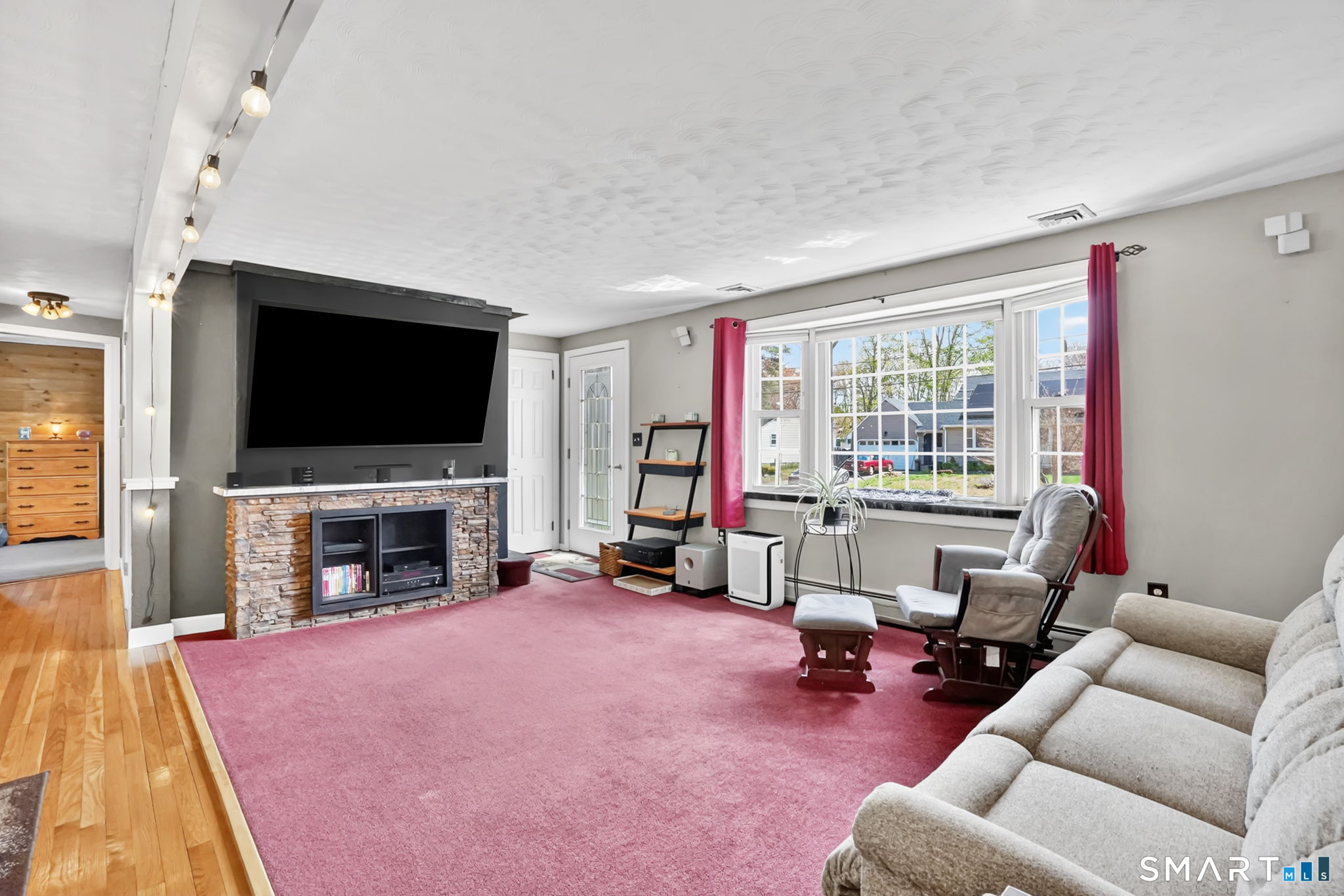 Welcome home to 34 Wagon Rd in Enfield, CT! This beautifully updated 3-4 bedroom Cape offers over 1,500 sq ft of versatile, move-in-ready living space-perfect for first-time buyers or those seeking convenient single-level living. Enter through the side driveway into a spacious family room featuring a vaulted ceiling, cozy pellet stove, and direct access to a stamped concrete patio and backyard retreat. The fully remodeled kitchen is truly the heart of the home, showcasing a stunning 9-foot granite island with seating for four, dark cabinetry, a light gray tiled backsplash, and newer stainless steel KitchenAid induction range, microwave hood, and Samsung refrigerator. The open-concept layout seamlessly connects the kitchen to both the living and family rooms, making it ideal for entertaining. Down the hall, you'll find a fully renovated bathroom with a sleek sliding frosted glass door, Corian-topped vanity, and beautifully tiled shower surround. The main level also features a spacious primary bedroom with stylish wood accent walls. Upstairs offers two additional well-sized bedrooms.Step outside through the double sliders to your private backyard oasis-thoughtfully designed with four distinct spaces, including a cabana hot tub ready, a fully equipped and covered grilling station, and two entertainment decks with arbor/shade. Surround sound indoors and outdoors enhances the experience, while white vinyl fencing and professional landscaping provide both privacy and charm.